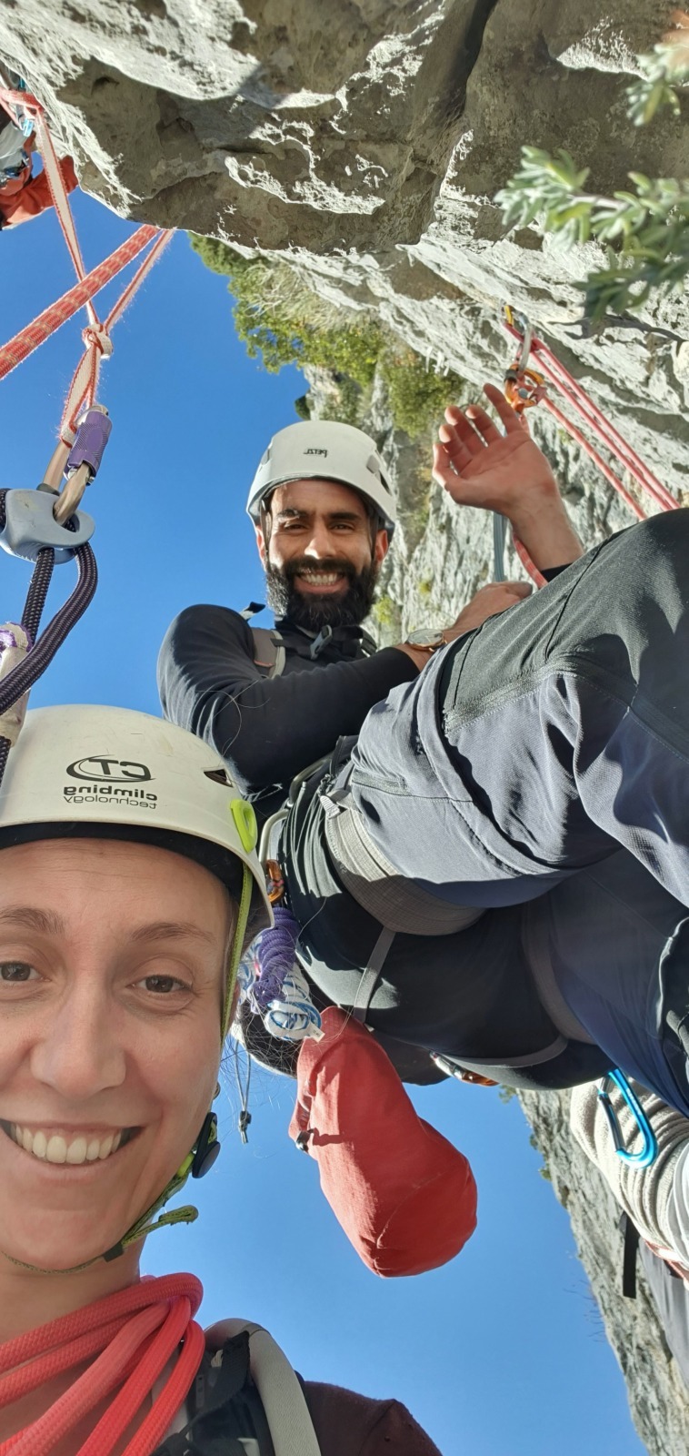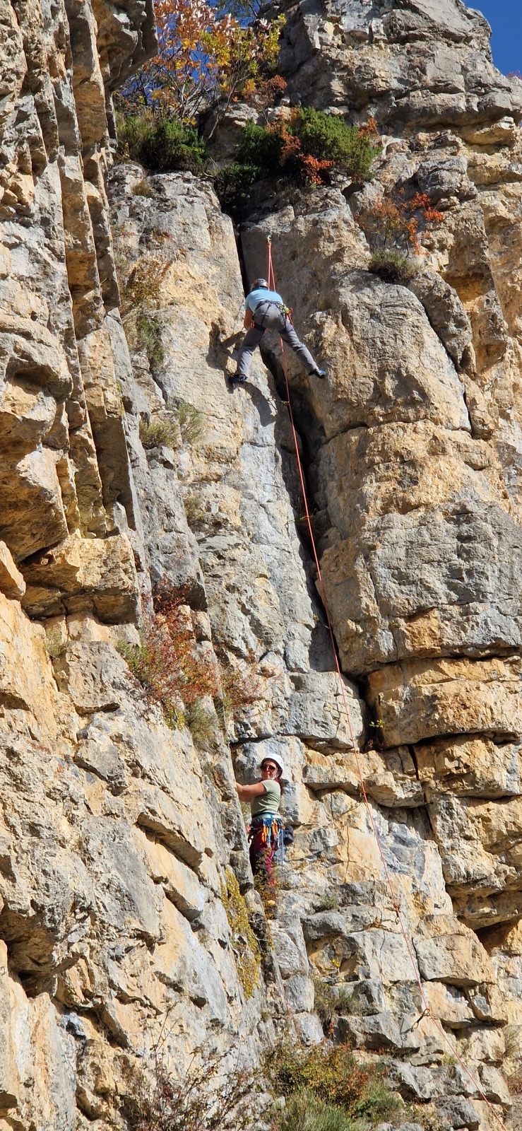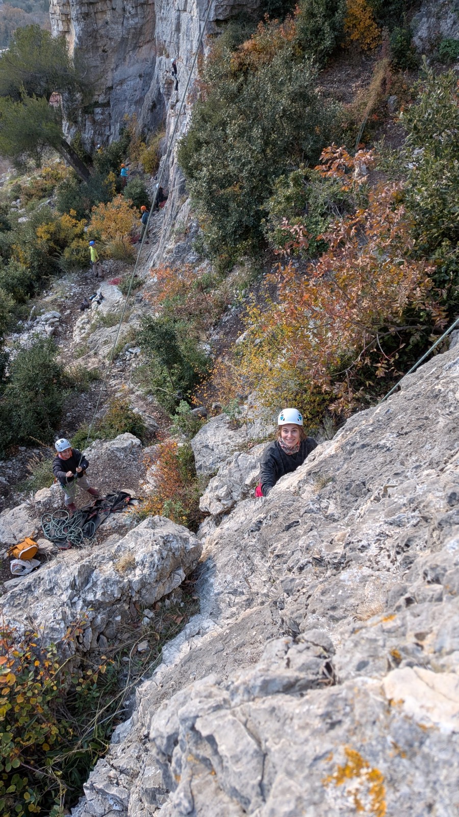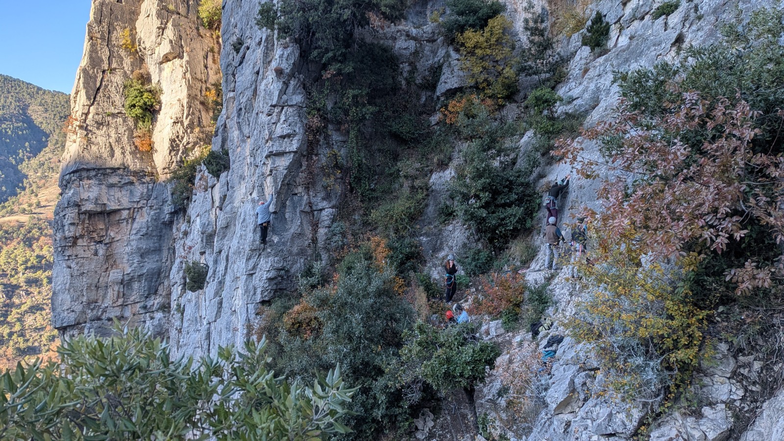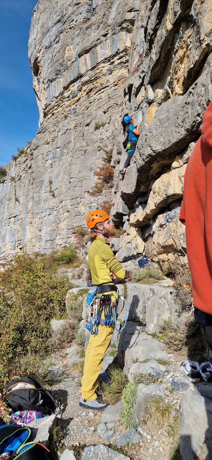 A notre gauche, Julien s’occupe de guide les cordées. Il enchaîne les deux premières longueurs (5c puis 6a) laissant la place à Roxane qui se perd un peu dans la longueur en 5c suivante malgré les indications claires « Vraiment à gauche ! » et oblige ses compagnons de cordée à traverser quelques buissons. Elle conserve le lead sur la longueur suivante et utilise ses compétences en TA pour improviser un relais mixte arbre/plaquette.