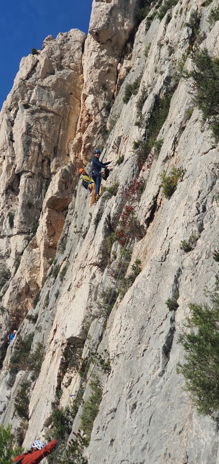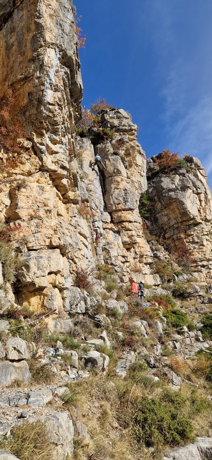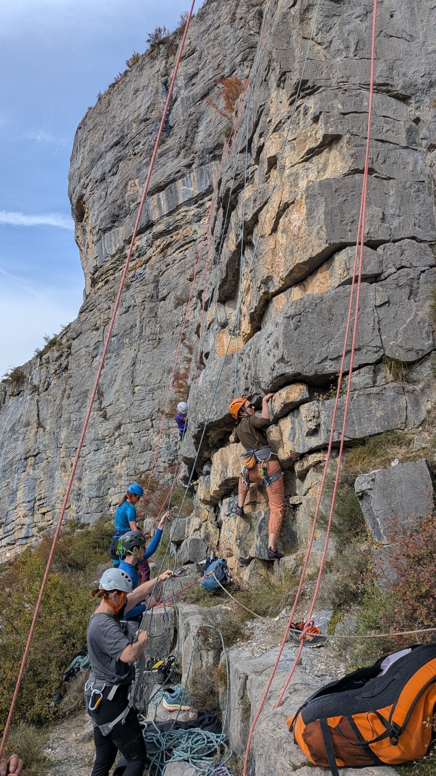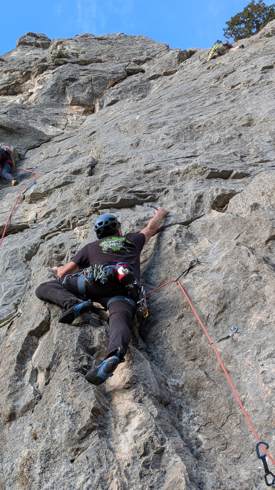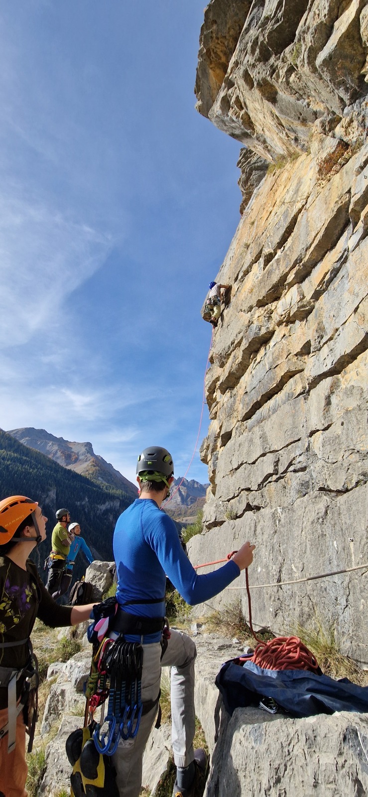 A notre gauche, Julien s’occupe de guide les cordées. Il enchaîne les deux premières longueurs (5c puis 6a) laissant la place à Roxane qui se perd un peu dans la longueur en 5c suivante malgré les indications claires « Vraiment à gauche ! » et oblige ses compagnons de cordée à traverser quelques buissons. Elle conserve le lead sur la longueur suivante et utilise ses compétences en TA pour improviser un relais mixte arbre/plaquette.