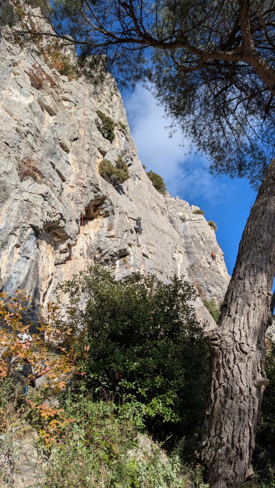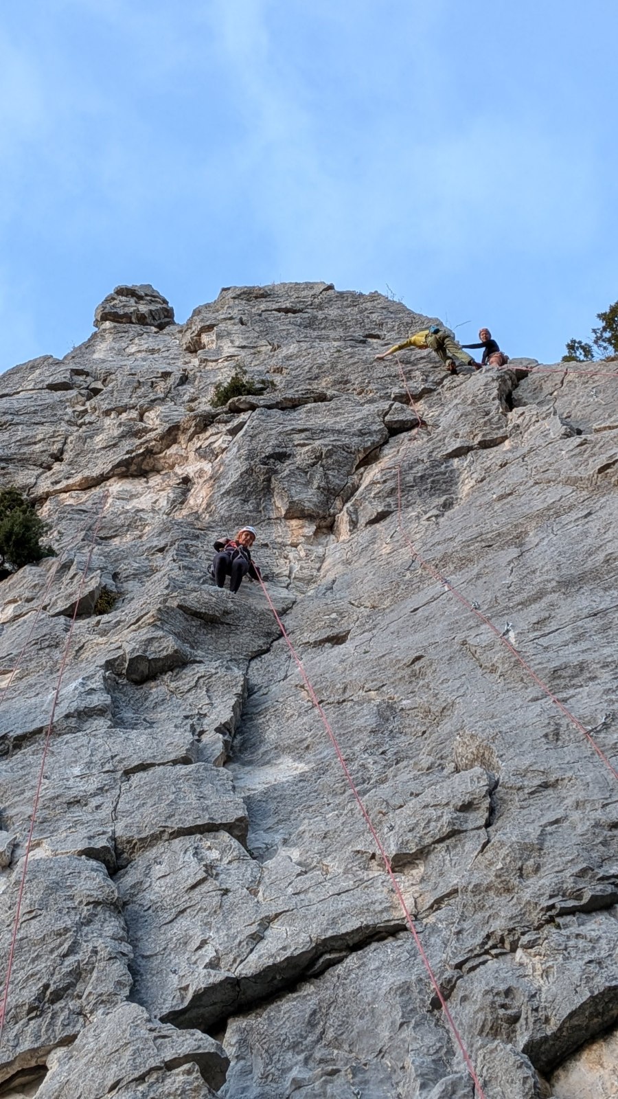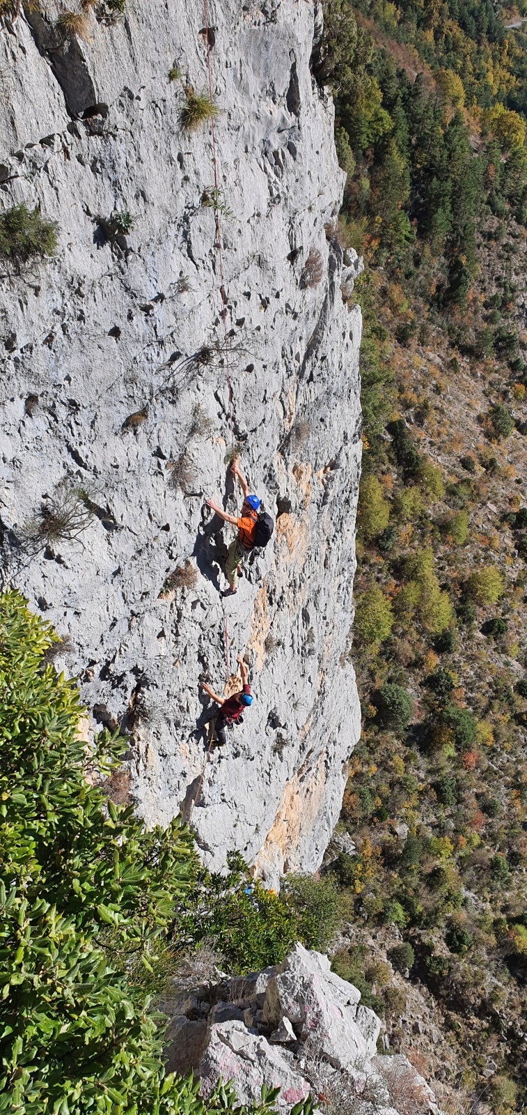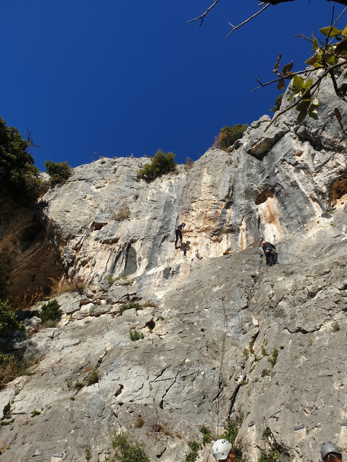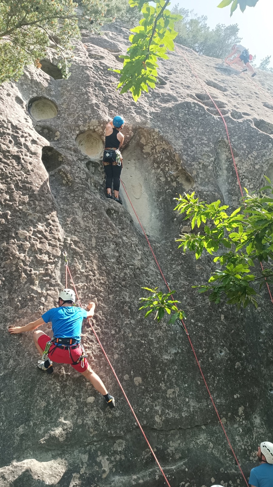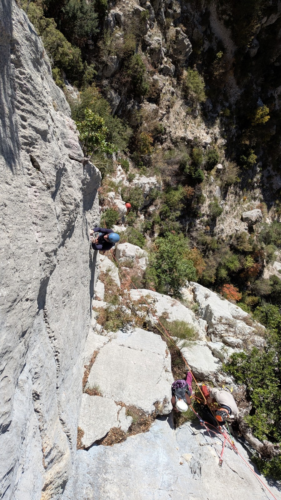 A notre gauche, Julien s’occupe de guide les cordées. Il enchaîne les deux premières longueurs (5c puis 6a) laissant la place à Roxane qui se perd un peu dans la longueur en 5c suivante malgré les indications claires « Vraiment à gauche ! » et oblige ses compagnons de cordée à traverser quelques buissons. Elle conserve le lead sur la longueur suivante et utilise ses compétences en TA pour improviser un relais mixte arbre/plaquette.