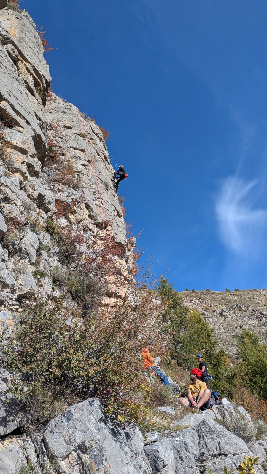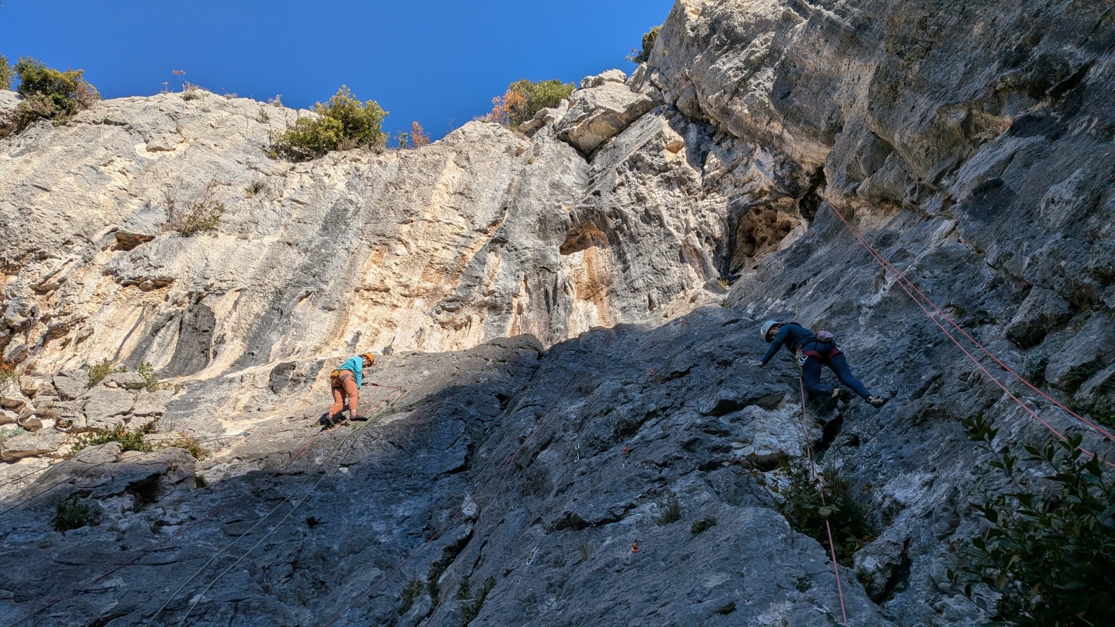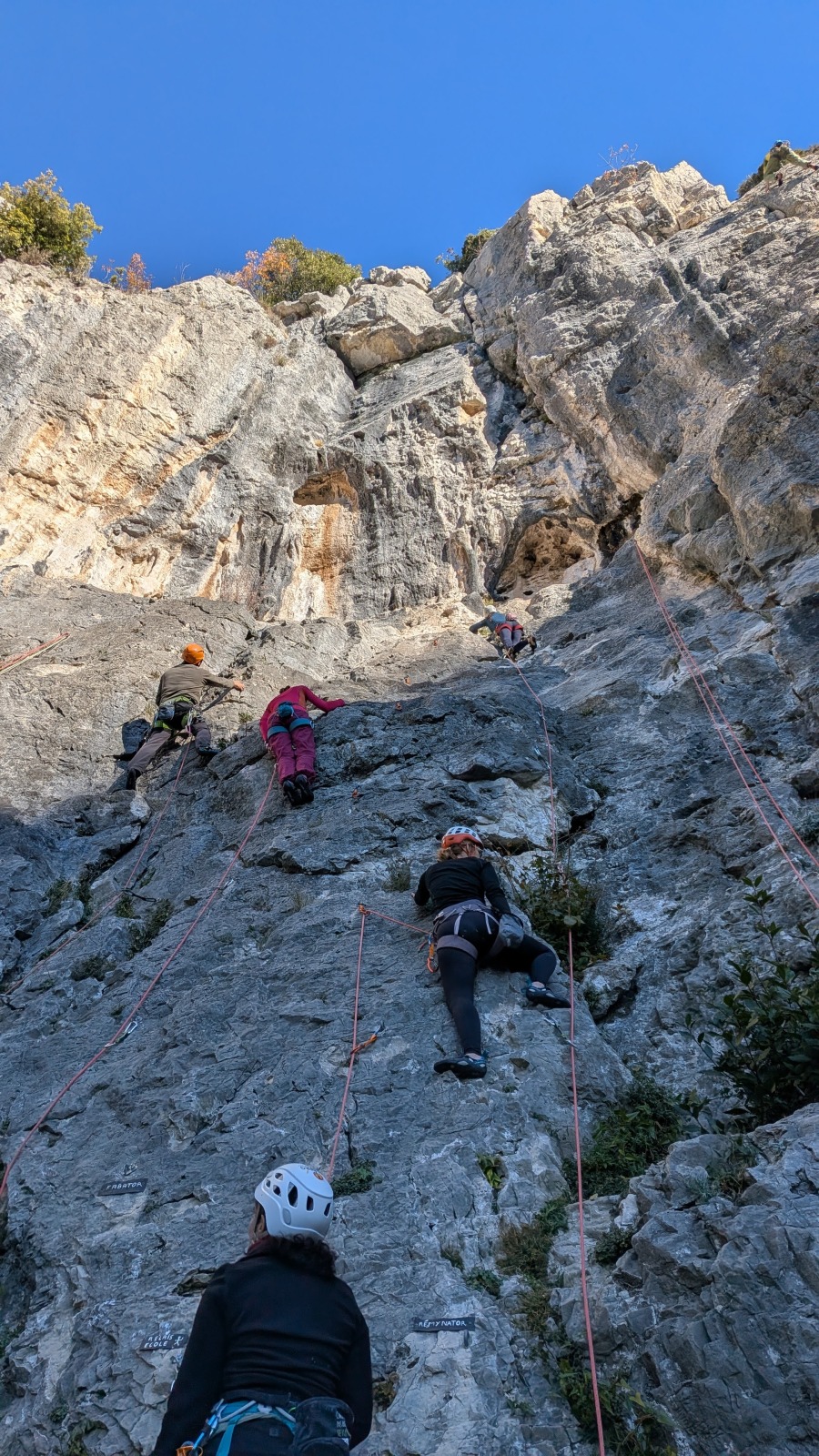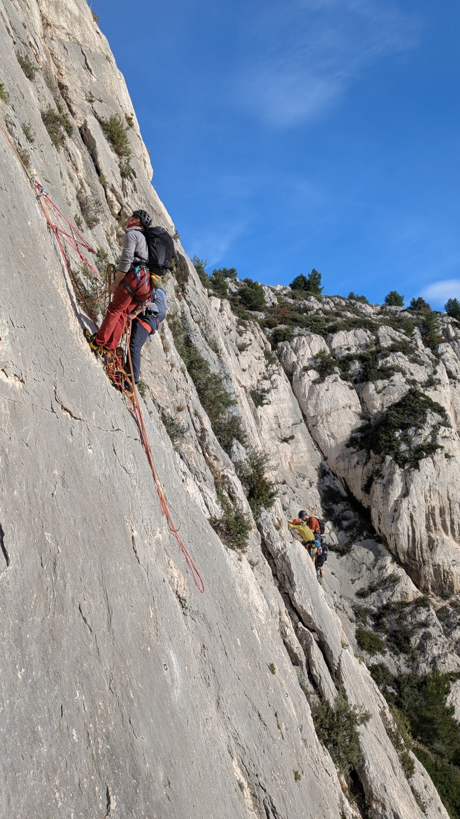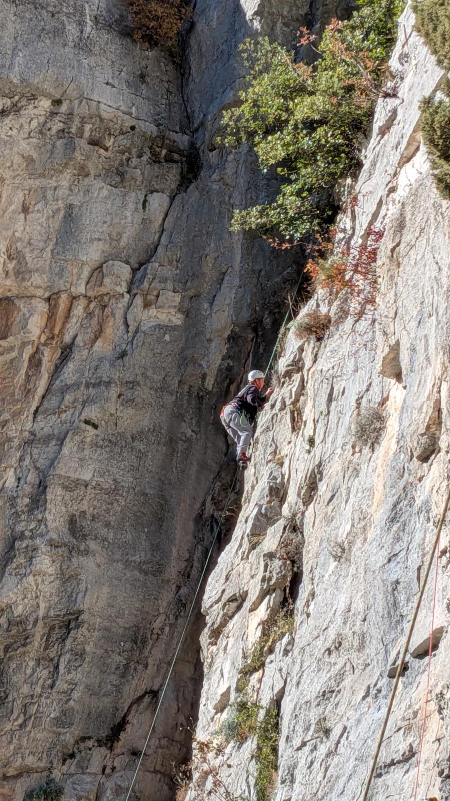 A notre gauche, Julien s’occupe de guide les cordées. Il enchaîne les deux premières longueurs (5c puis 6a) laissant la place à Roxane qui se perd un peu dans la longueur en 5c suivante malgré les indications claires « Vraiment à gauche ! » et oblige ses compagnons de cordée à traverser quelques buissons. Elle conserve le lead sur la longueur suivante et utilise ses compétences en TA pour improviser un relais mixte arbre/plaquette.