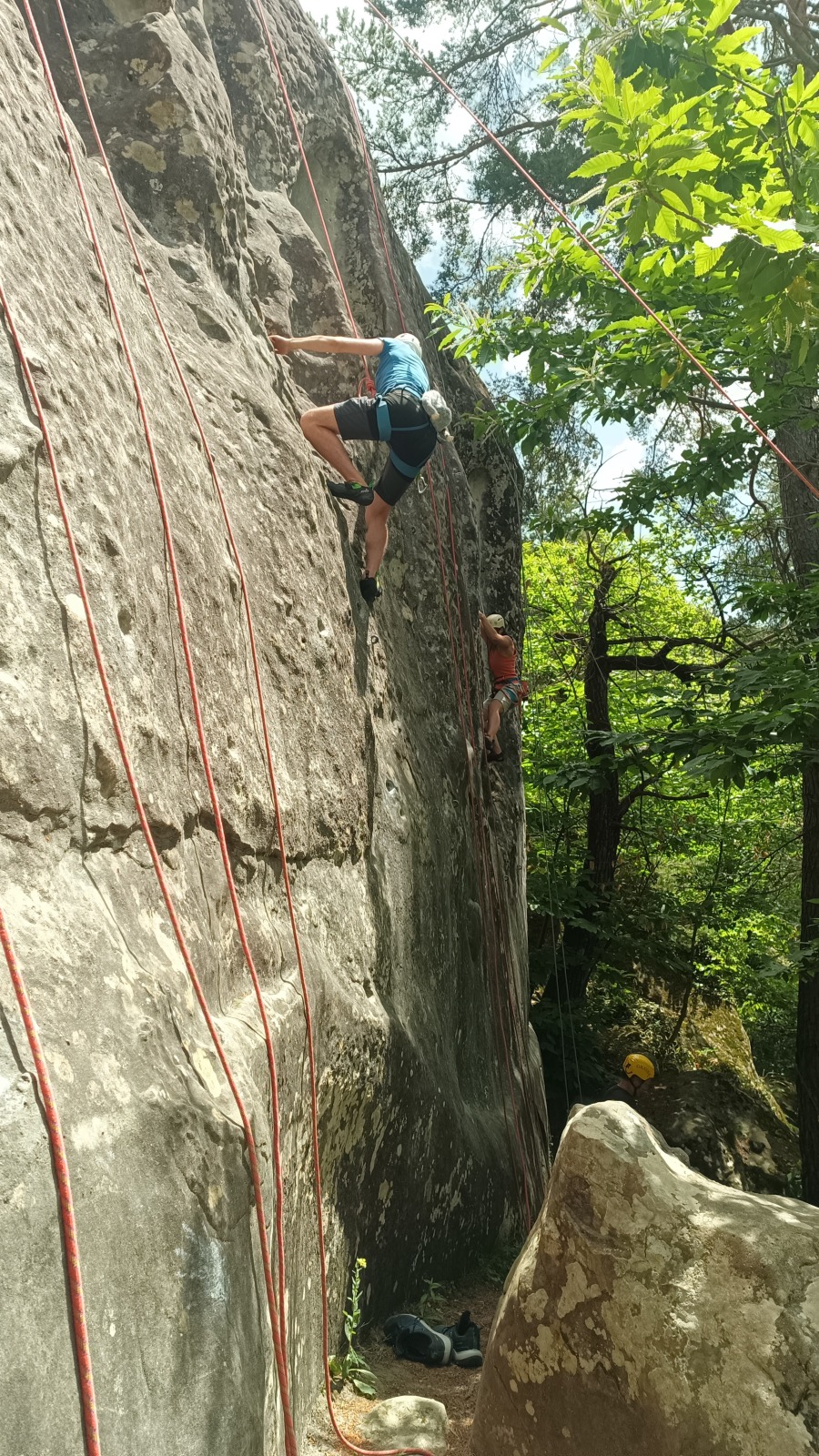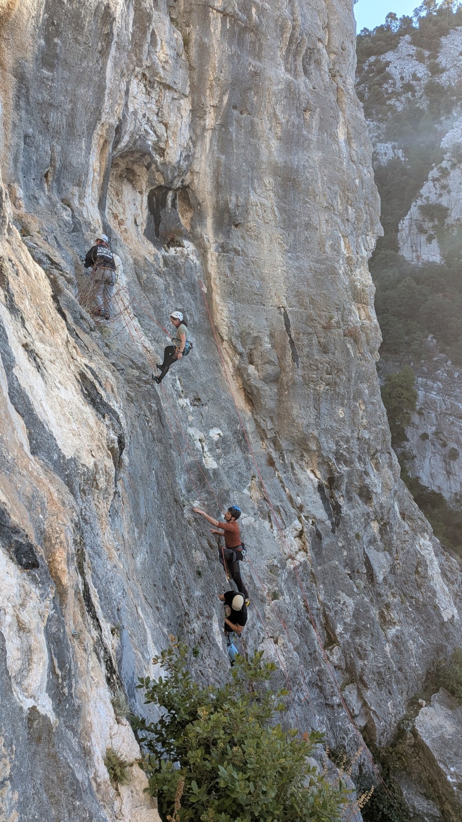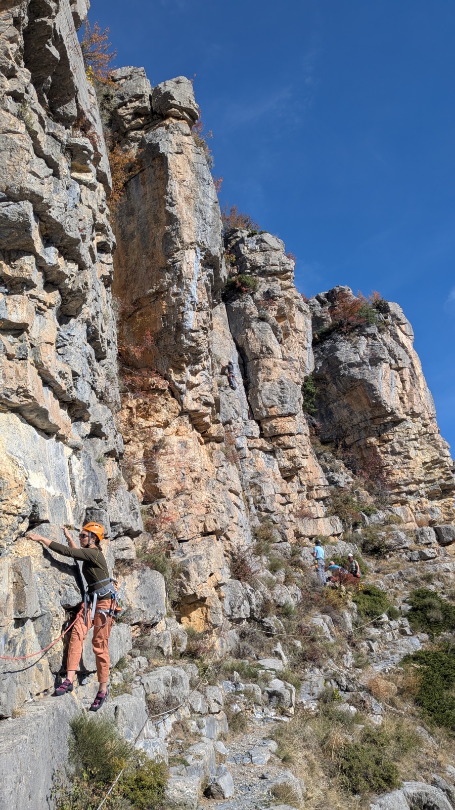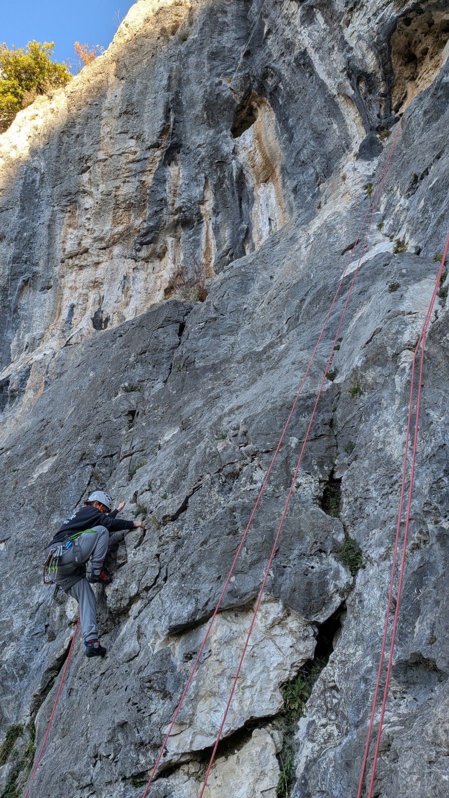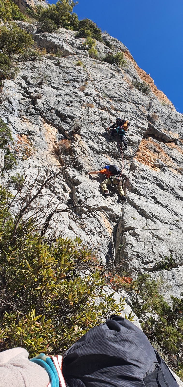 A notre gauche, Julien s’occupe de guide les cordées. Il enchaîne les deux premières longueurs (5c puis 6a) laissant la place à Roxane qui se perd un peu dans la longueur en 5c suivante malgré les indications claires « Vraiment à gauche ! » et oblige ses compagnons de cordée à traverser quelques buissons. Elle conserve le lead sur la longueur suivante et utilise ses compétences en TA pour improviser un relais mixte arbre/plaquette.