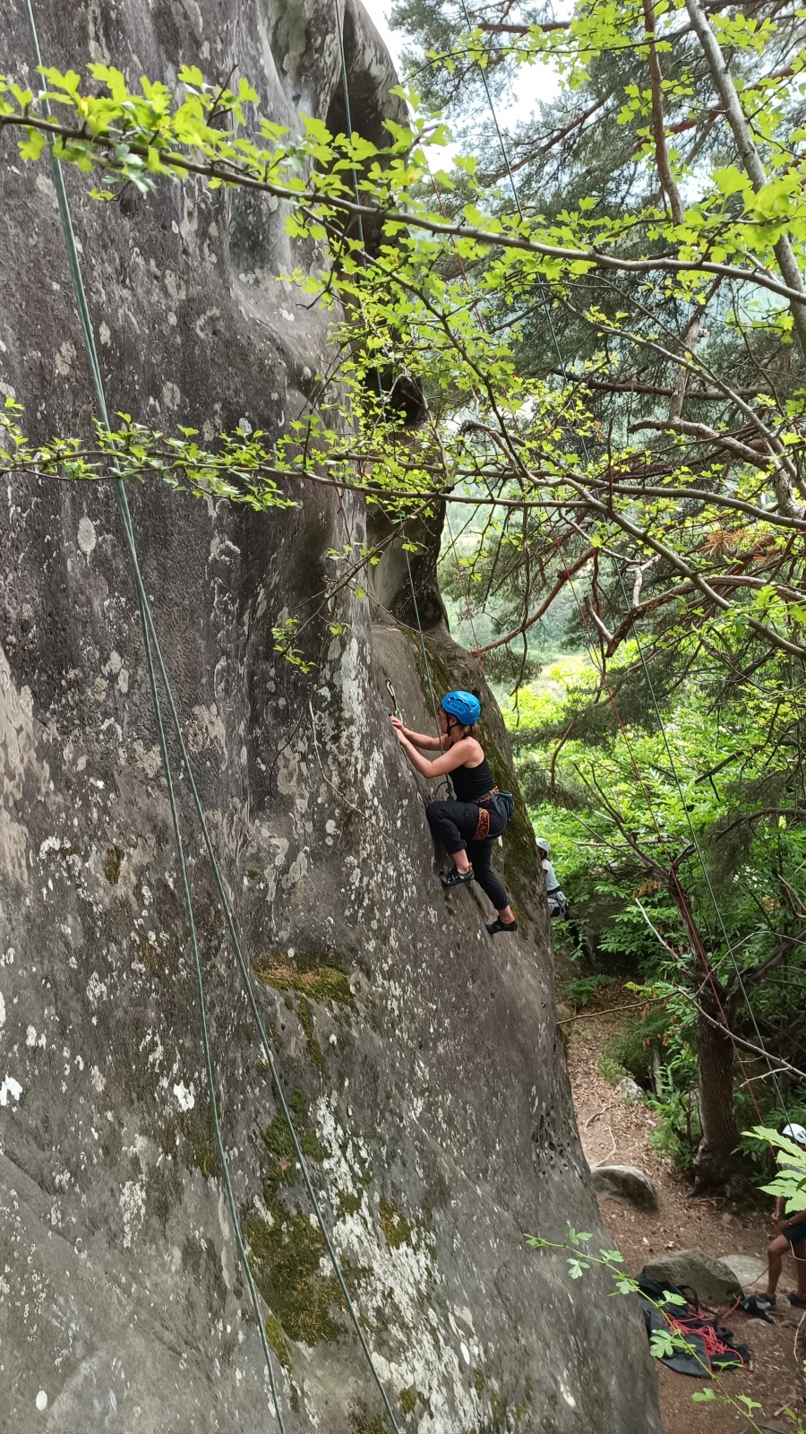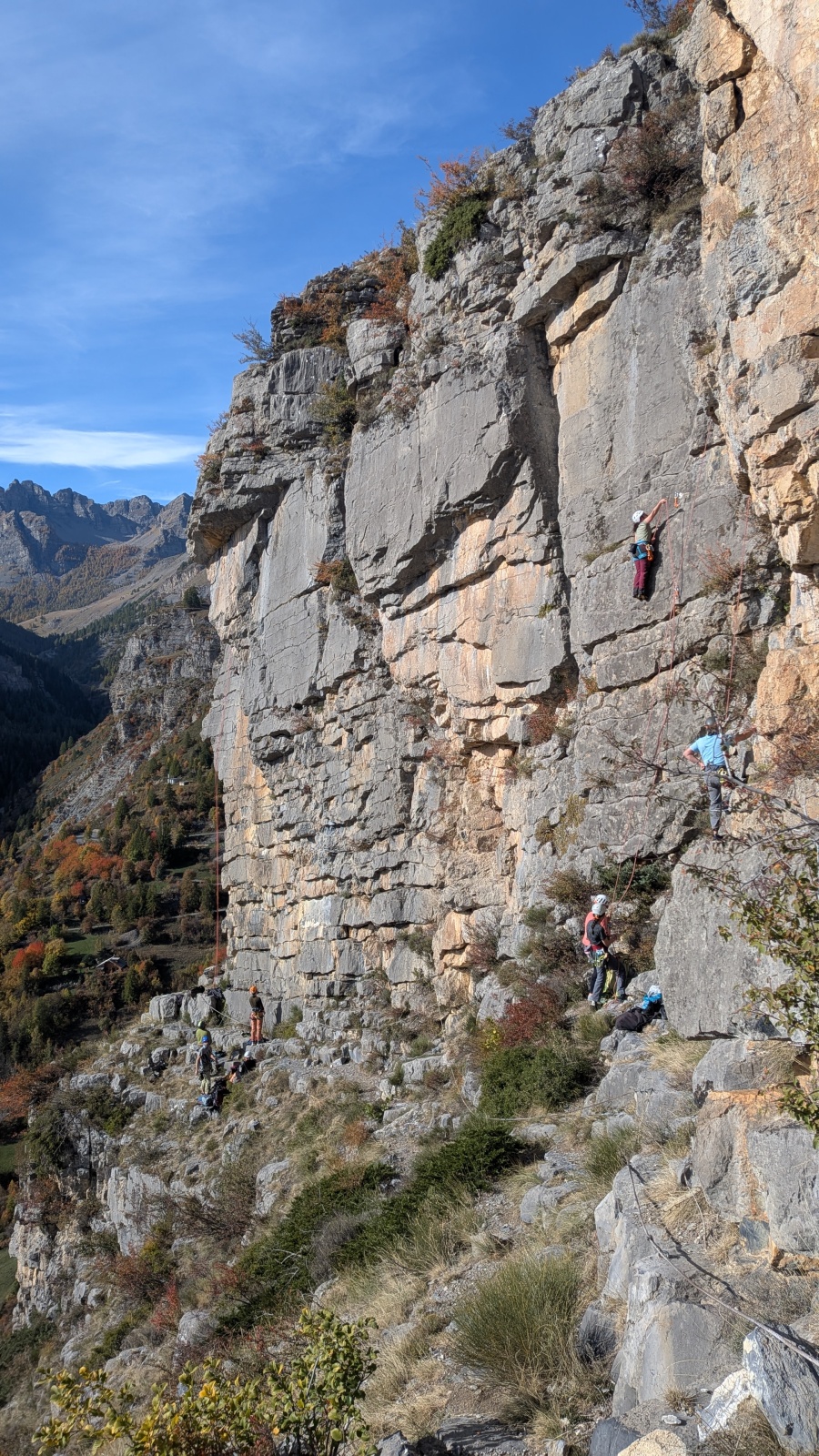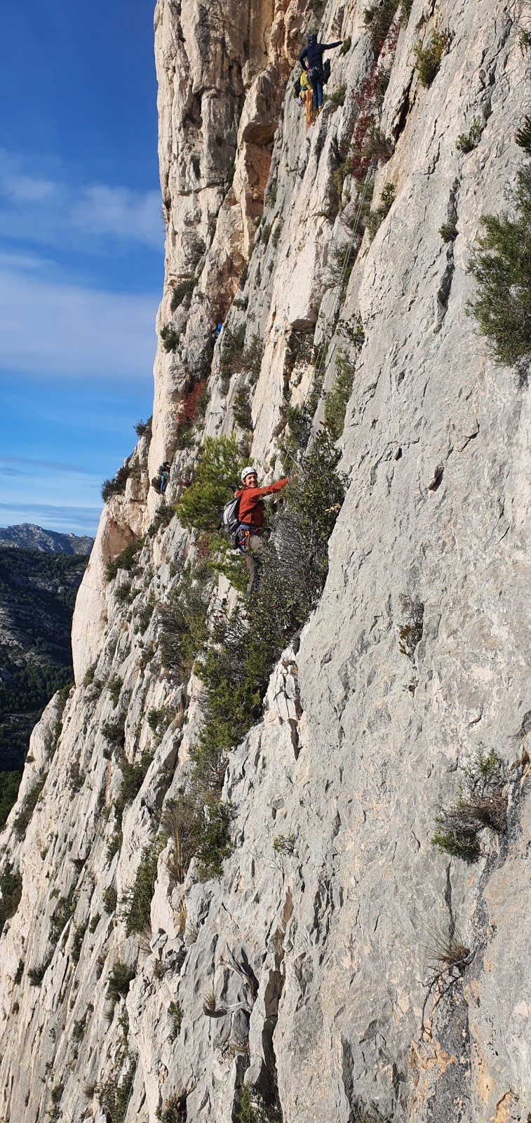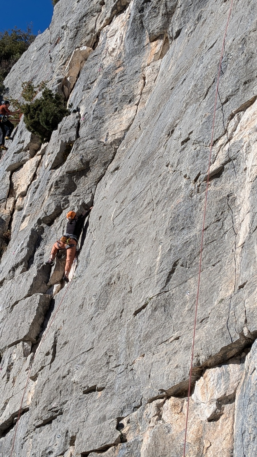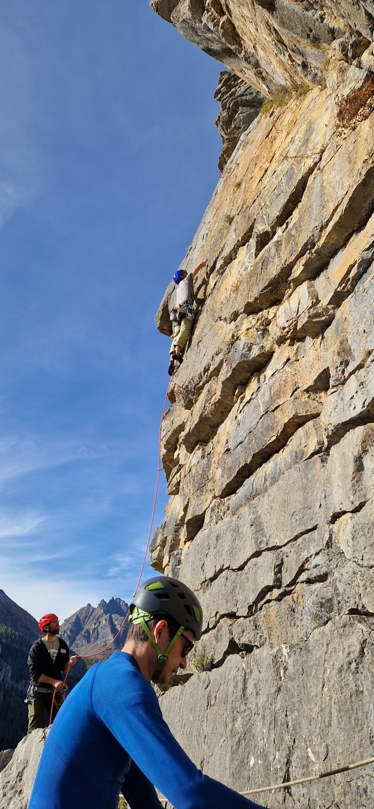 A notre gauche, Julien s’occupe de guide les cordées. Il enchaîne les deux premières longueurs (5c puis 6a) laissant la place à Roxane qui se perd un peu dans la longueur en 5c suivante malgré les indications claires « Vraiment à gauche ! » et oblige ses compagnons de cordée à traverser quelques buissons. Elle conserve le lead sur la longueur suivante et utilise ses compétences en TA pour improviser un relais mixte arbre/plaquette.