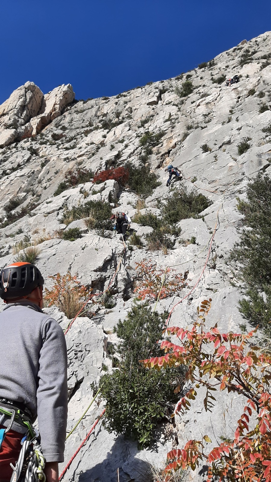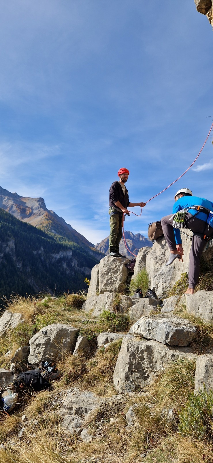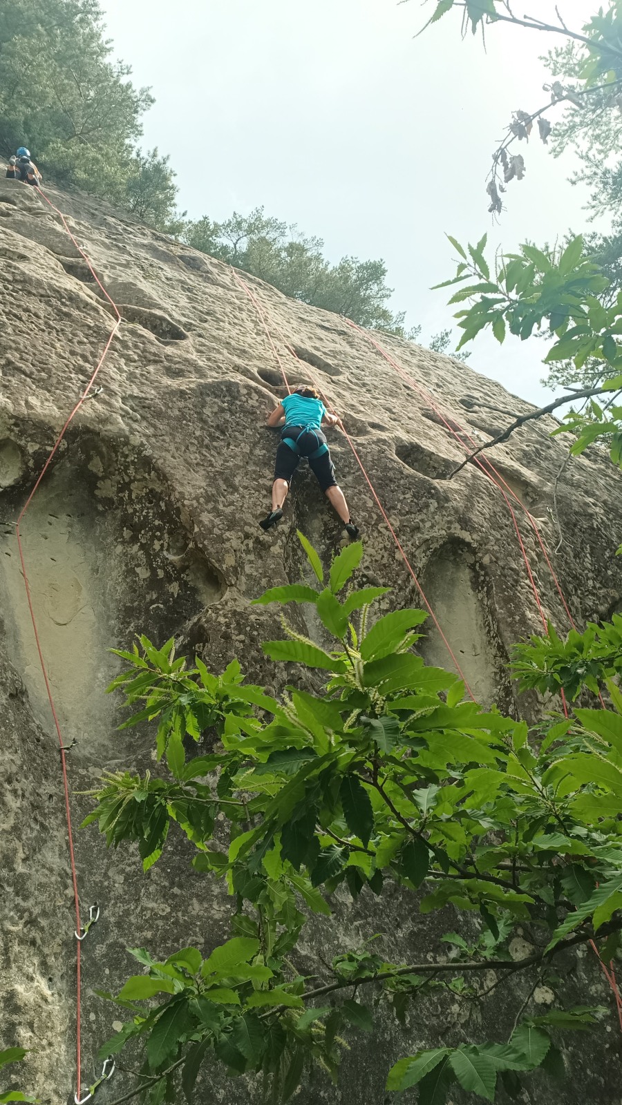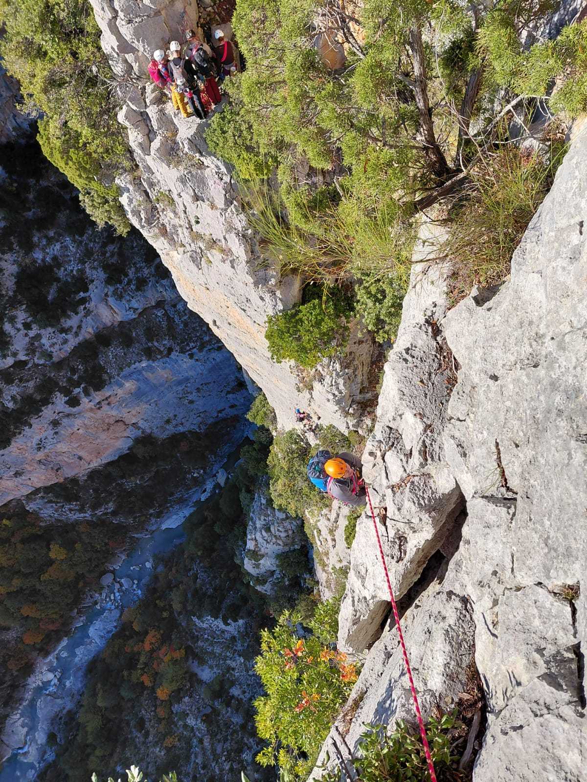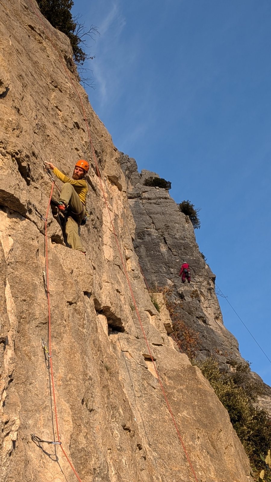A notre gauche, Julien s’occupe de guide les cordées. Il enchaîne les deux premières longueurs (5c puis 6a) laissant la place à Roxane qui se perd un peu dans la longueur en 5c suivante malgré les indications claires « Vraiment à gauche ! » et oblige ses compagnons de cordée à traverser quelques buissons. Elle conserve le lead sur la longueur suivante et utilise ses compétences en TA pour improviser un relais mixte arbre/plaquette.