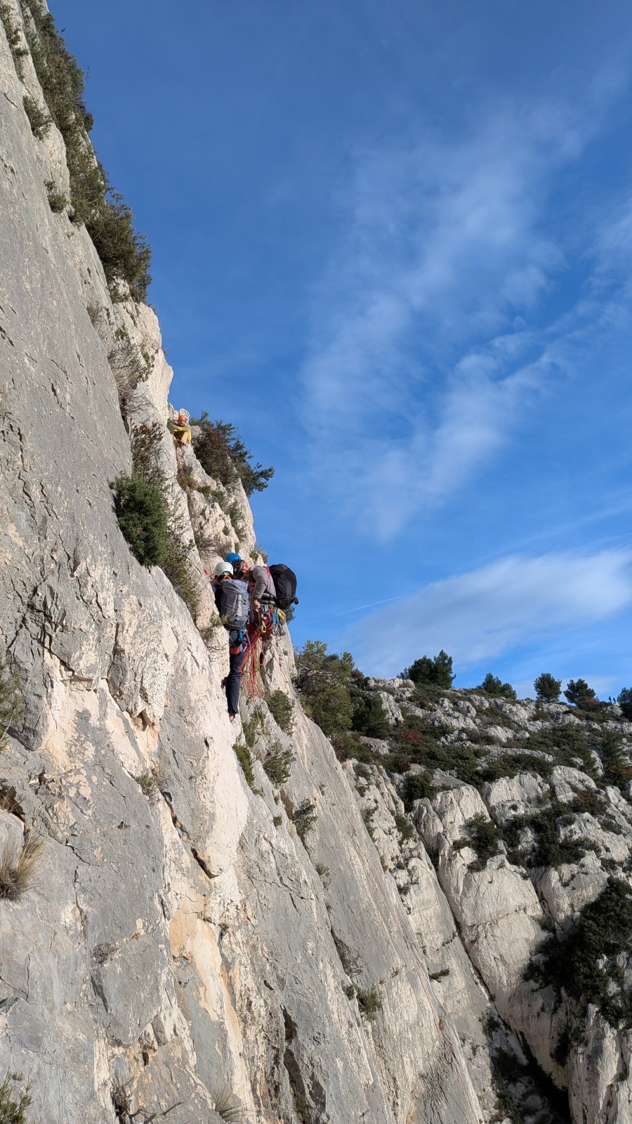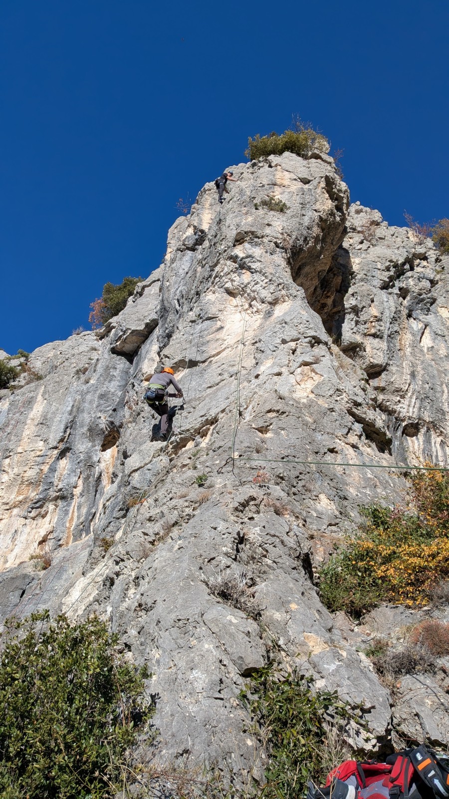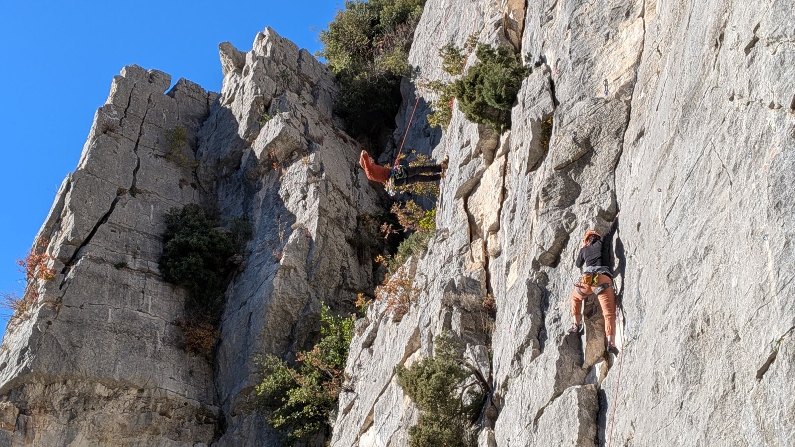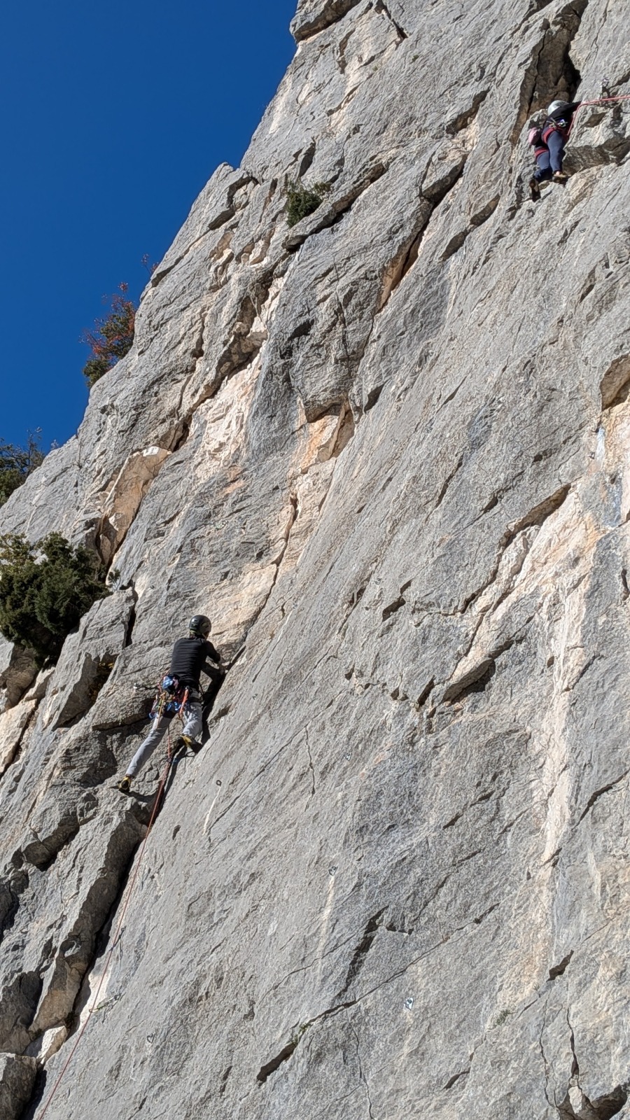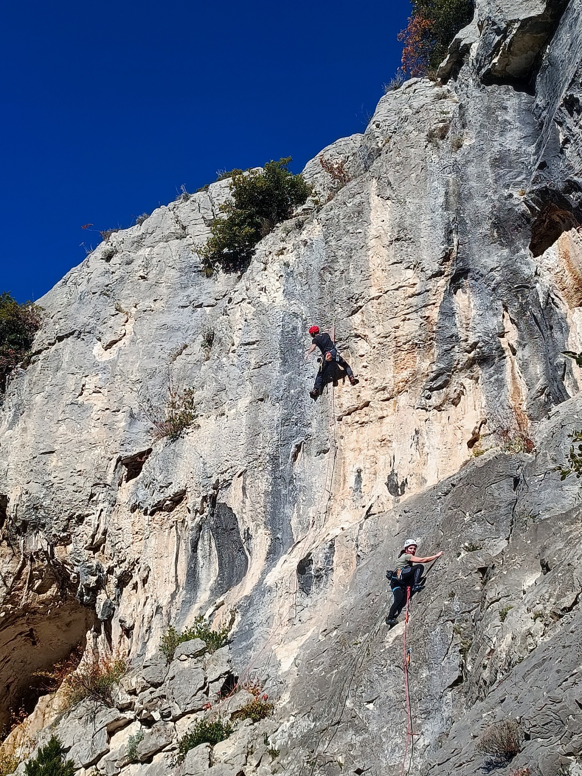 A notre gauche, Julien s’occupe de guide les cordées. Il enchaîne les deux premières longueurs (5c puis 6a) laissant la place à Roxane qui se perd un peu dans la longueur en 5c suivante malgré les indications claires « Vraiment à gauche ! » et oblige ses compagnons de cordée à traverser quelques buissons. Elle conserve le lead sur la longueur suivante et utilise ses compétences en TA pour improviser un relais mixte arbre/plaquette.