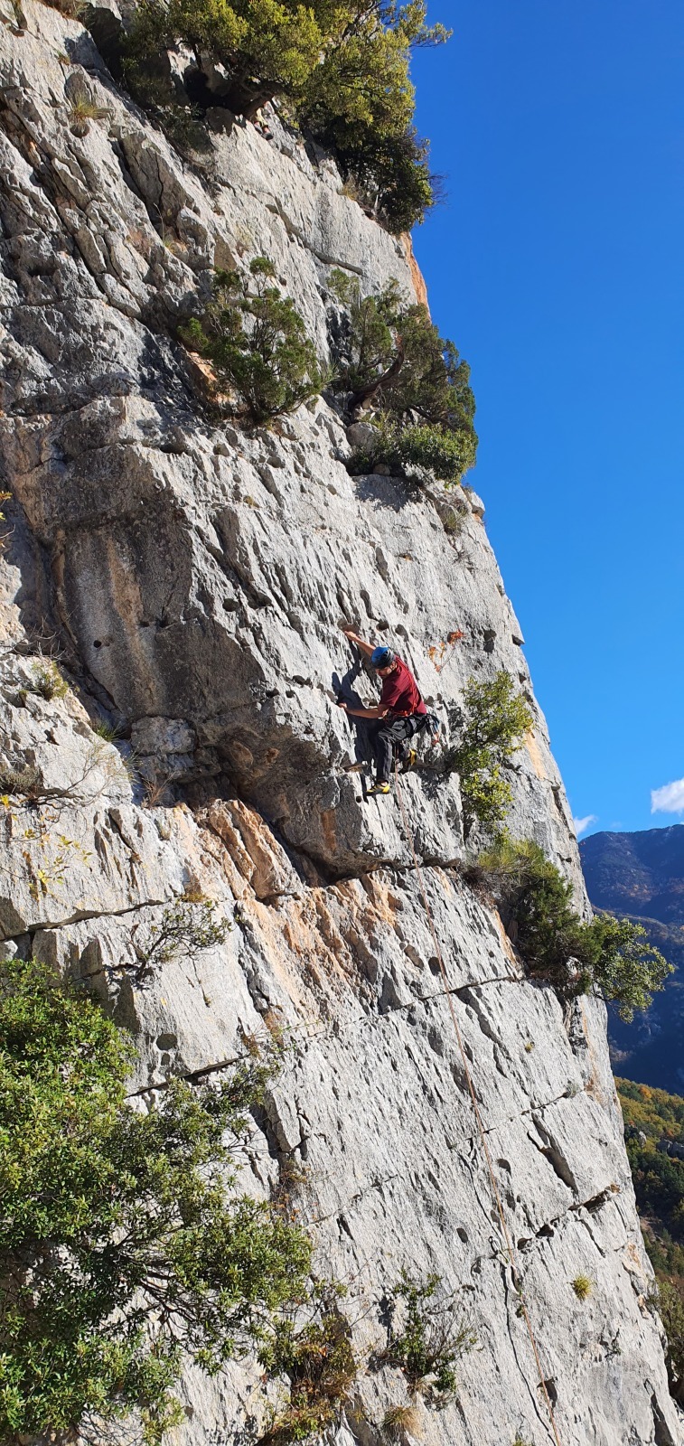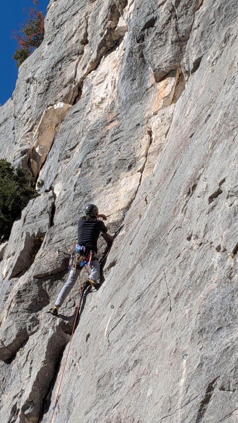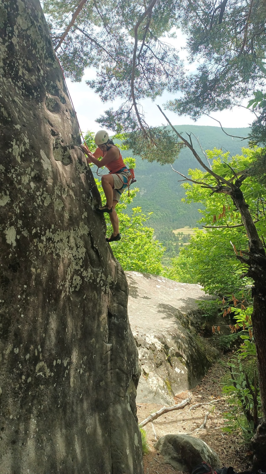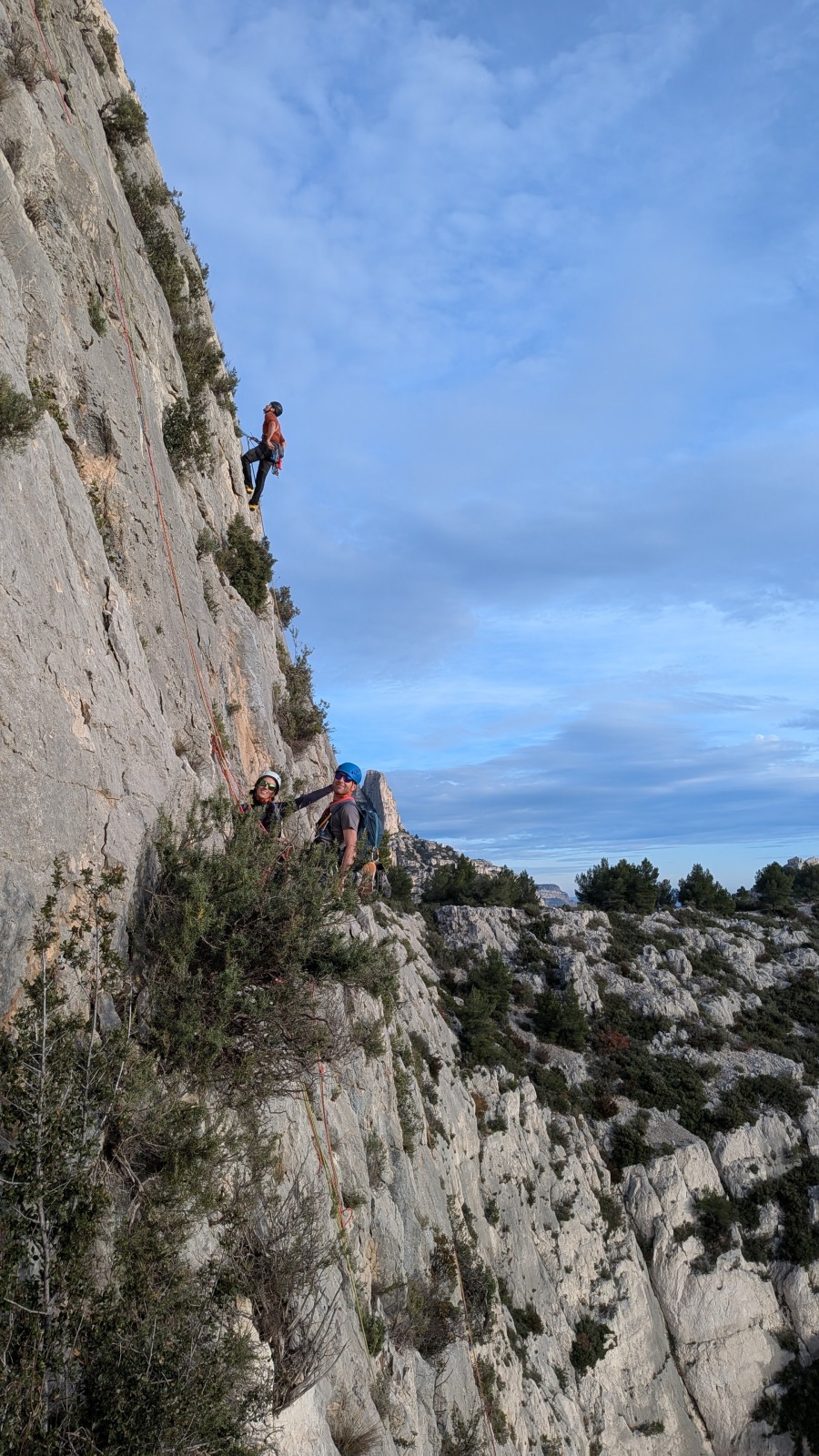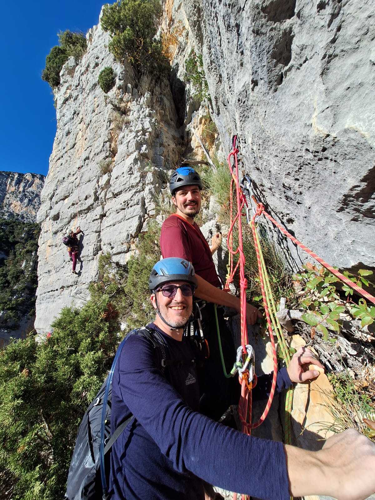 A notre gauche, Julien s’occupe de guide les cordées. Il enchaîne les deux premières longueurs (5c puis 6a) laissant la place à Roxane qui se perd un peu dans la longueur en 5c suivante malgré les indications claires « Vraiment à gauche ! » et oblige ses compagnons de cordée à traverser quelques buissons. Elle conserve le lead sur la longueur suivante et utilise ses compétences en TA pour improviser un relais mixte arbre/plaquette.