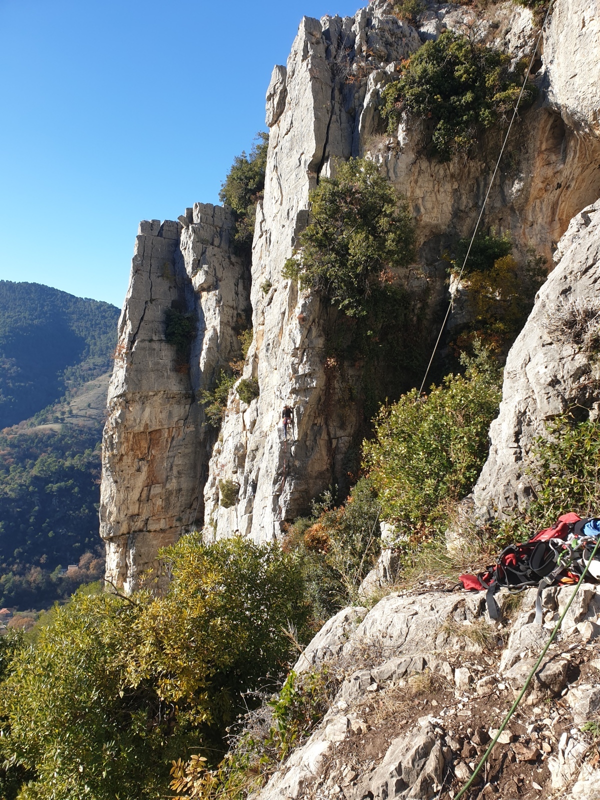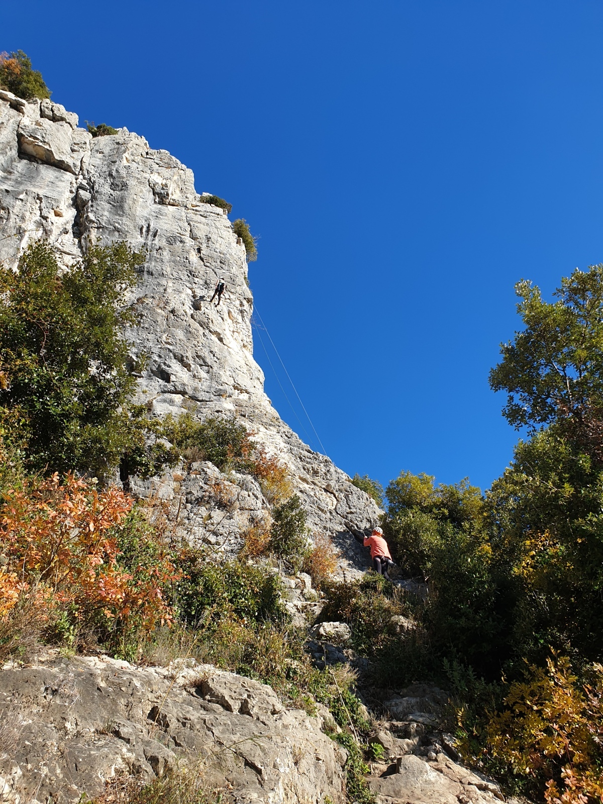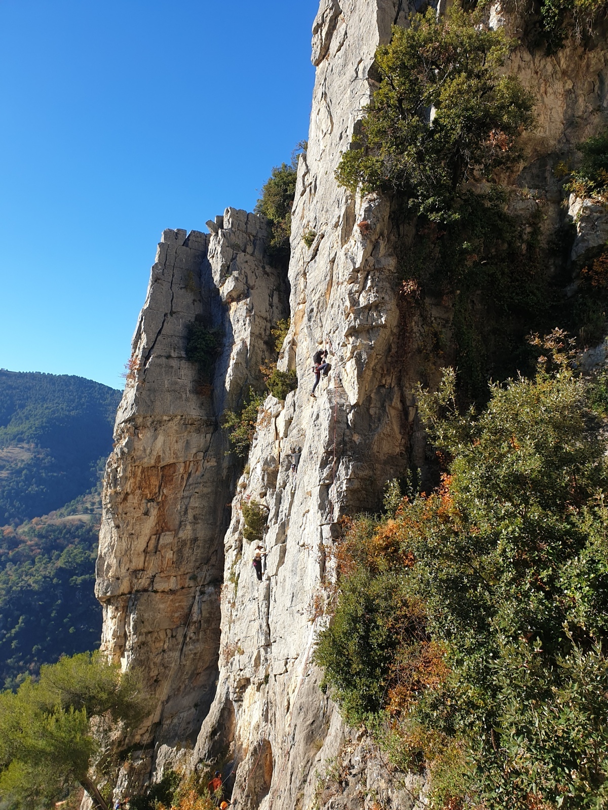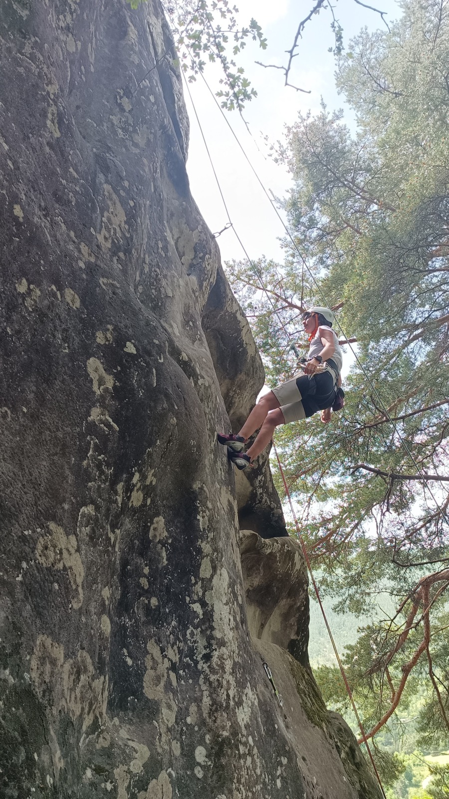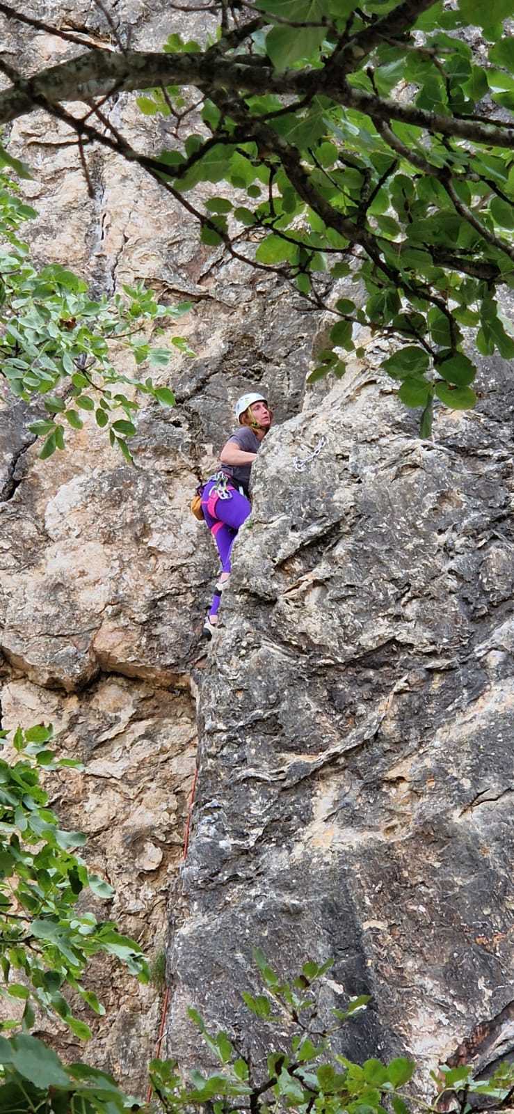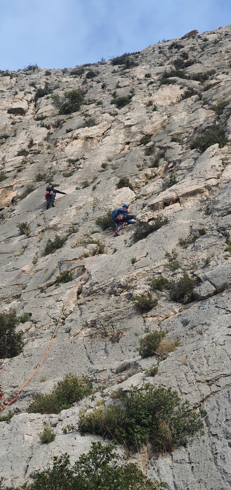 A notre gauche, Julien s’occupe de guide les cordées. Il enchaîne les deux premières longueurs (5c puis 6a) laissant la place à Roxane qui se perd un peu dans la longueur en 5c suivante malgré les indications claires « Vraiment à gauche ! » et oblige ses compagnons de cordée à traverser quelques buissons. Elle conserve le lead sur la longueur suivante et utilise ses compétences en TA pour improviser un relais mixte arbre/plaquette.