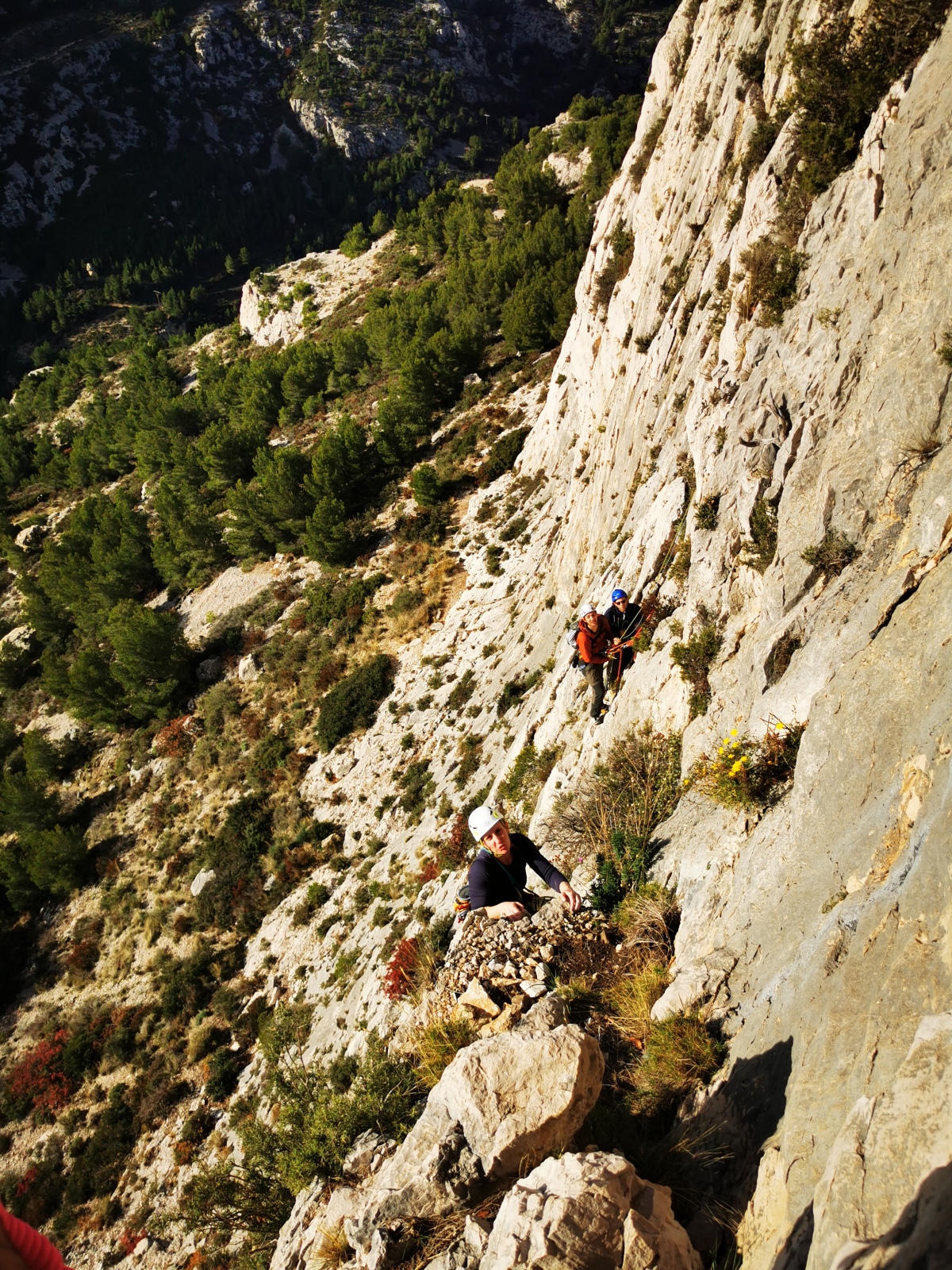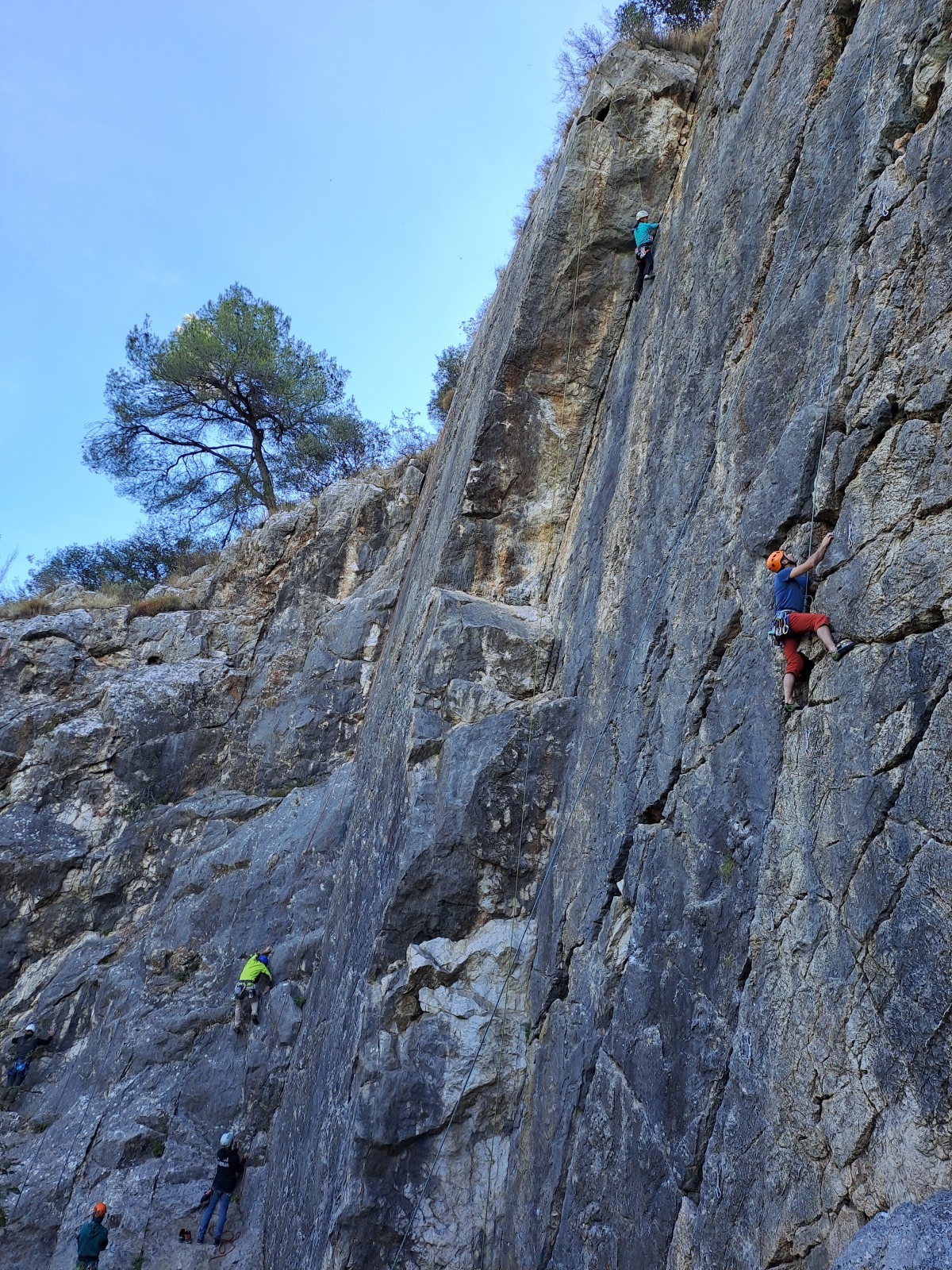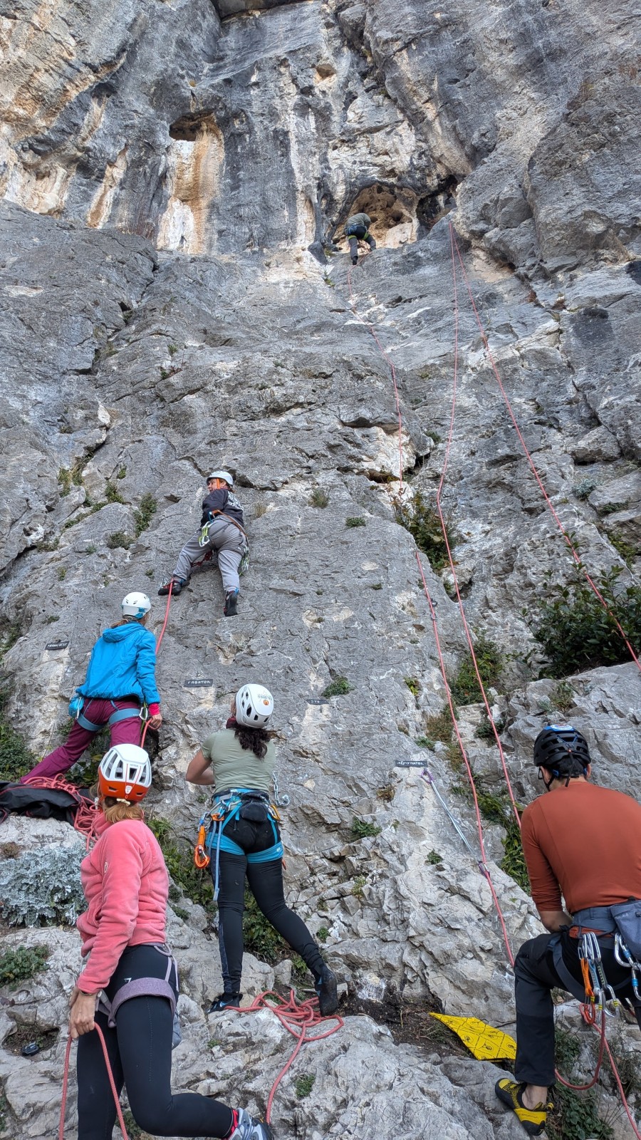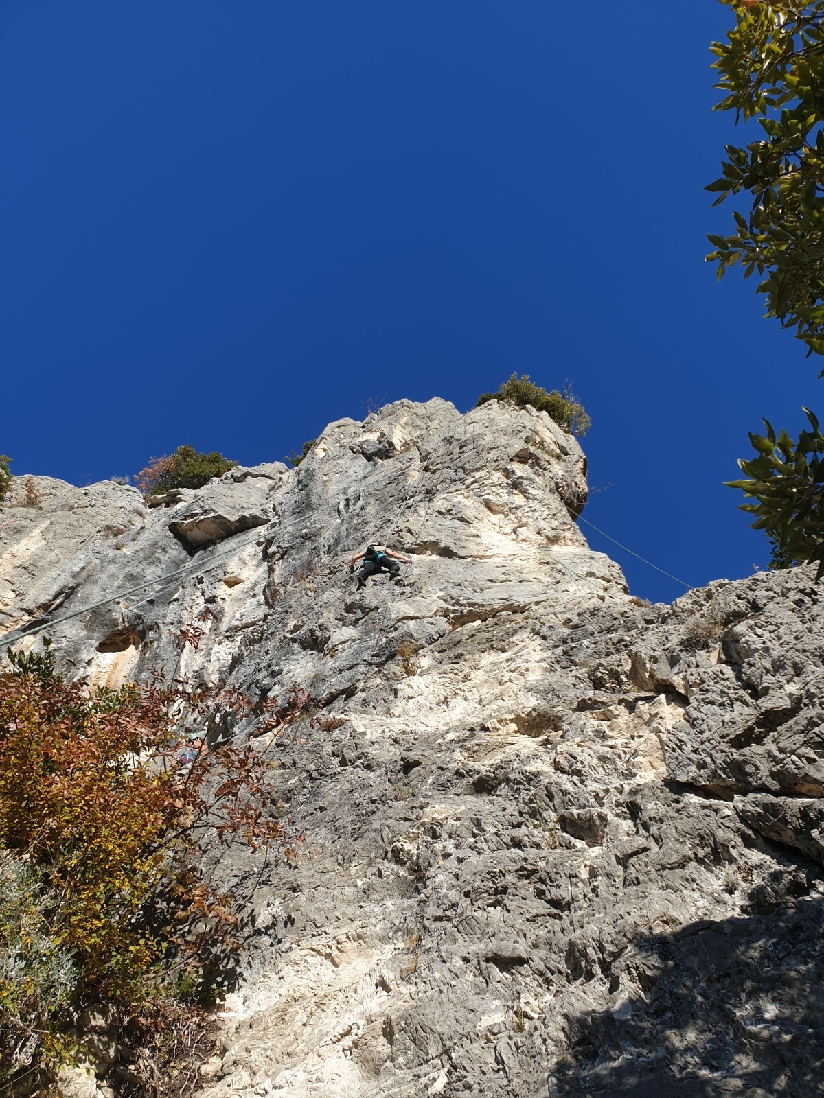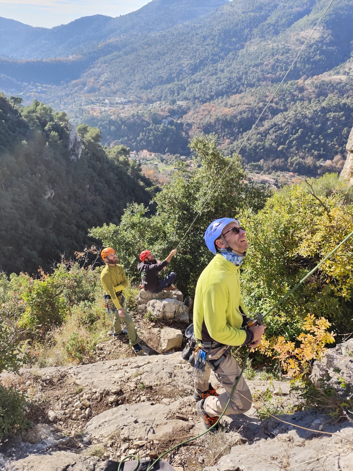 A notre gauche, Julien s’occupe de guide les cordées. Il enchaîne les deux premières longueurs (5c puis 6a) laissant la place à Roxane qui se perd un peu dans la longueur en 5c suivante malgré les indications claires « Vraiment à gauche ! » et oblige ses compagnons de cordée à traverser quelques buissons. Elle conserve le lead sur la longueur suivante et utilise ses compétences en TA pour improviser un relais mixte arbre/plaquette.