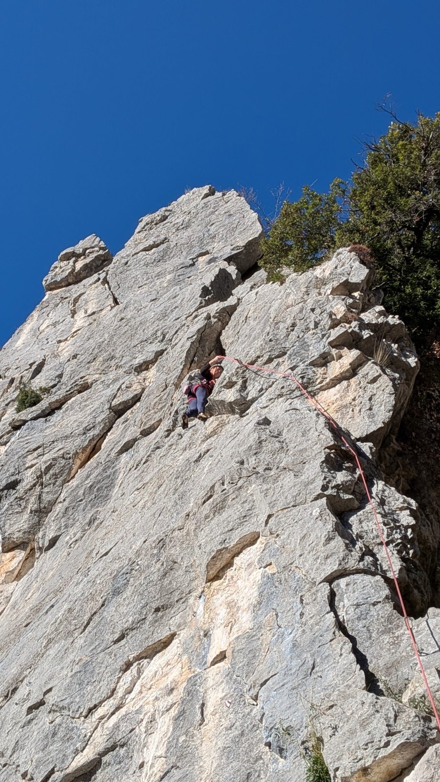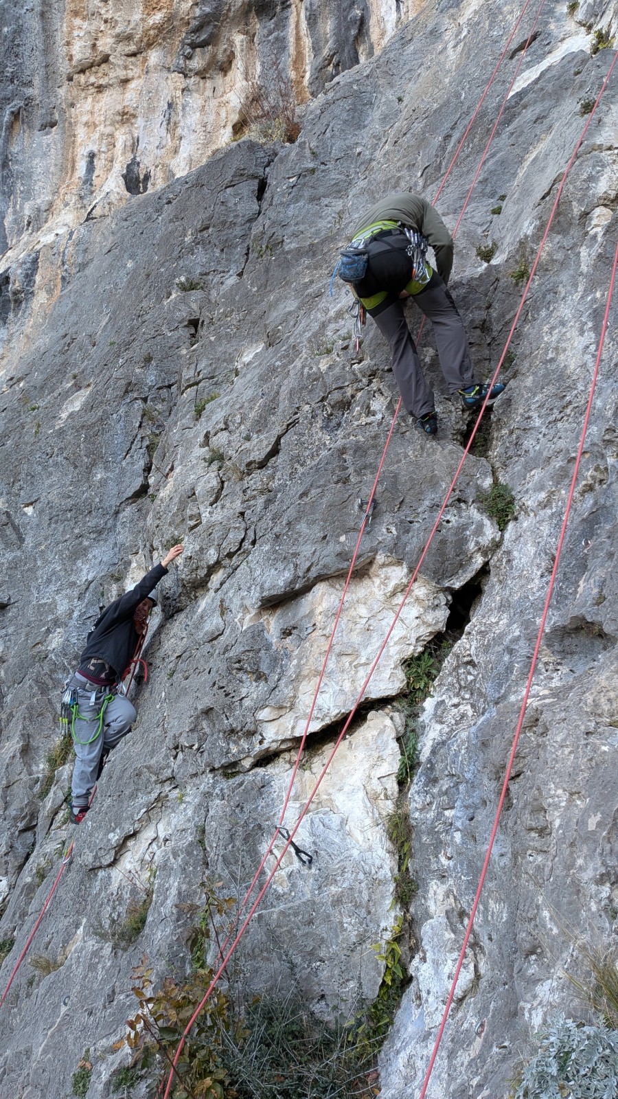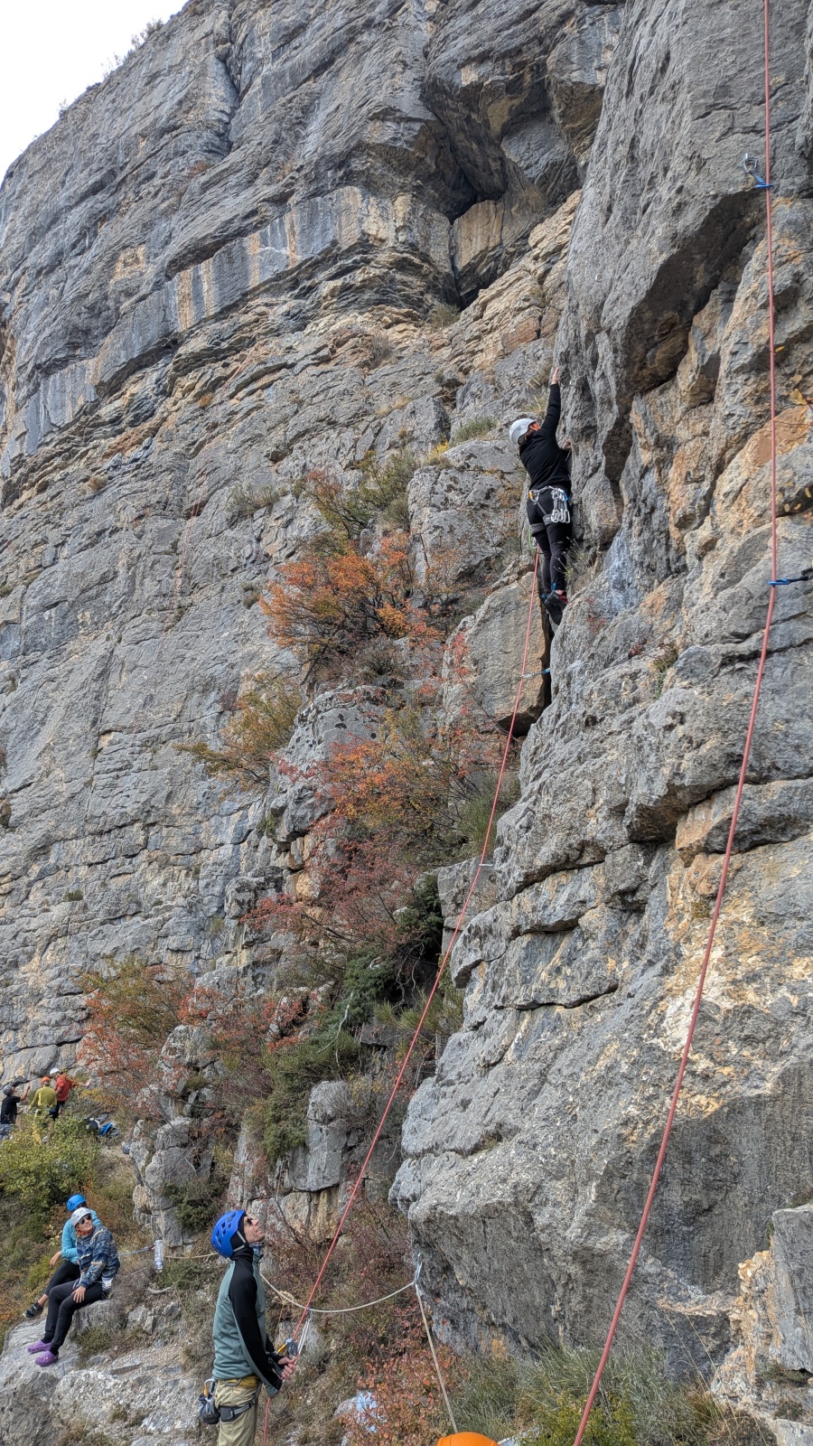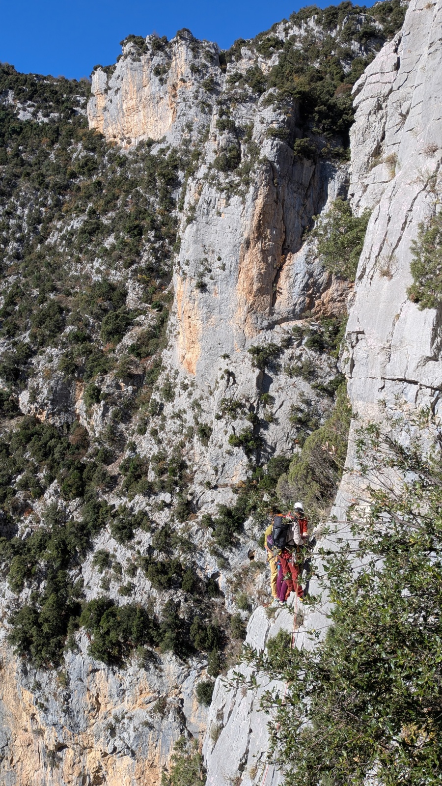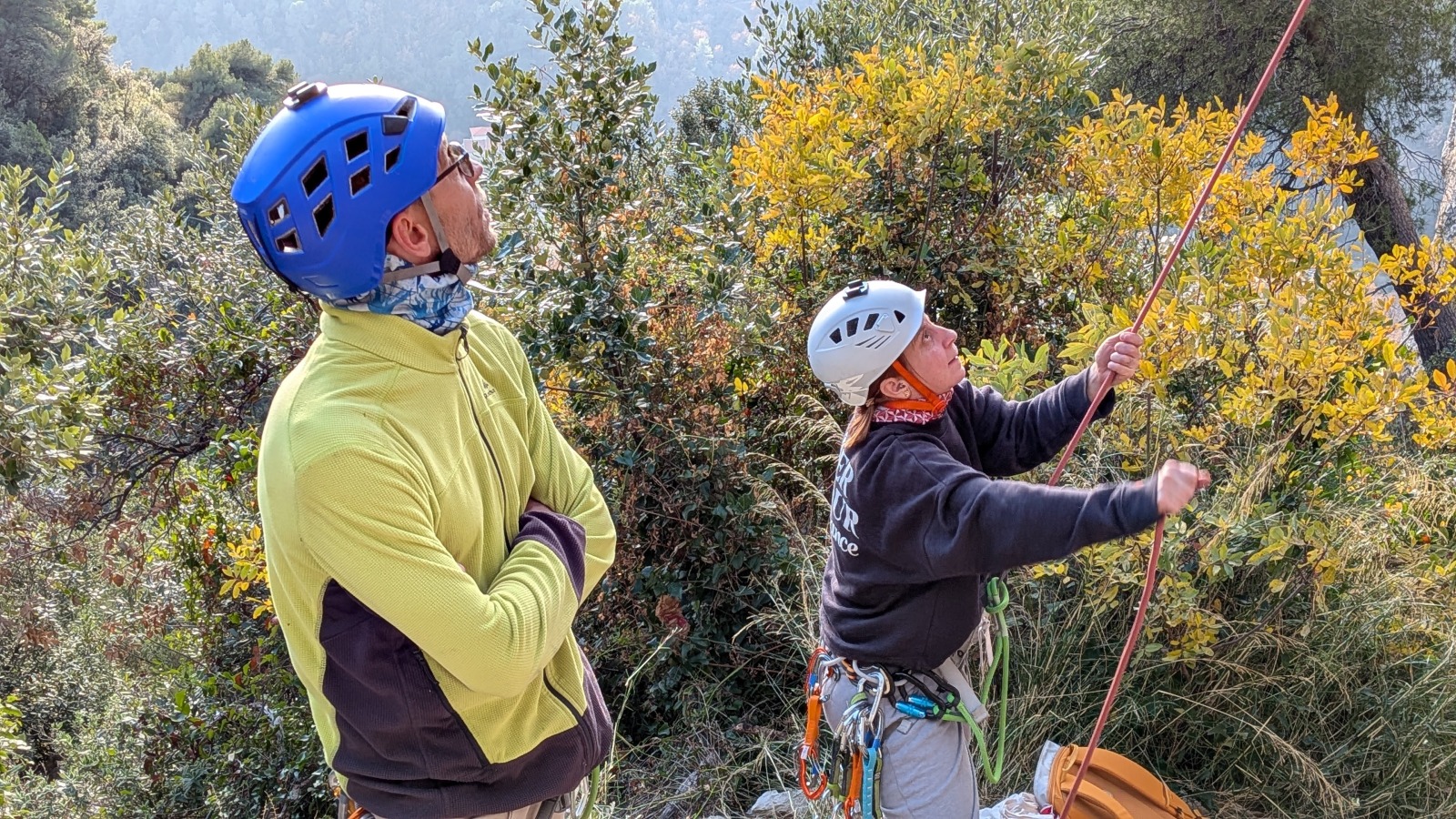 A notre gauche, Julien s’occupe de guide les cordées. Il enchaîne les deux premières longueurs (5c puis 6a) laissant la place à Roxane qui se perd un peu dans la longueur en 5c suivante malgré les indications claires « Vraiment à gauche ! » et oblige ses compagnons de cordée à traverser quelques buissons. Elle conserve le lead sur la longueur suivante et utilise ses compétences en TA pour improviser un relais mixte arbre/plaquette.