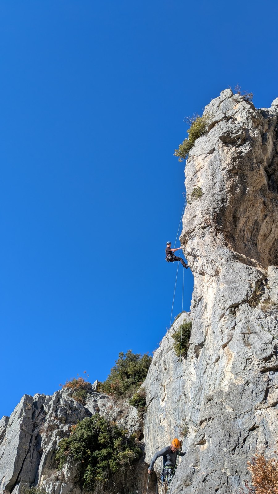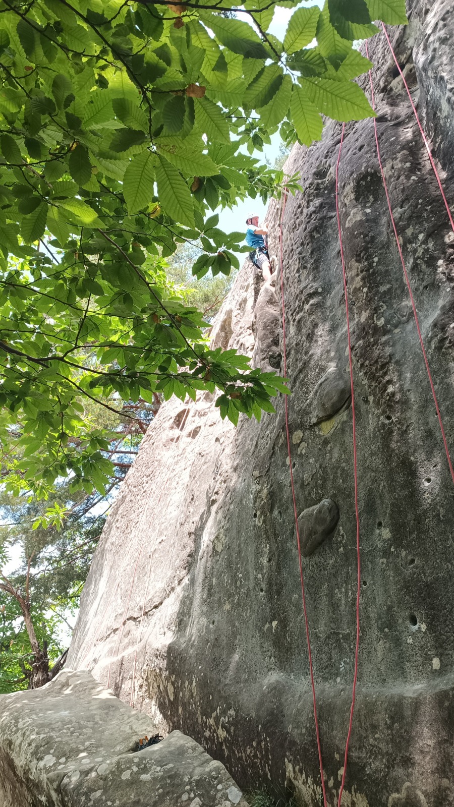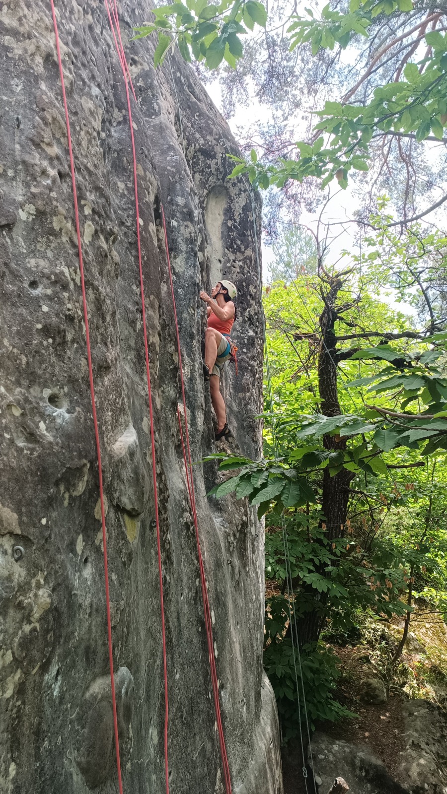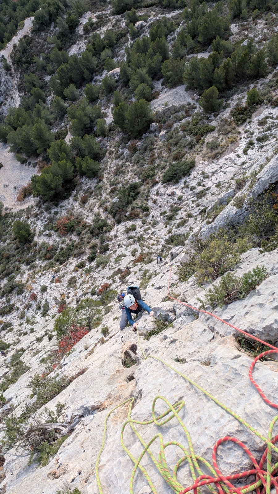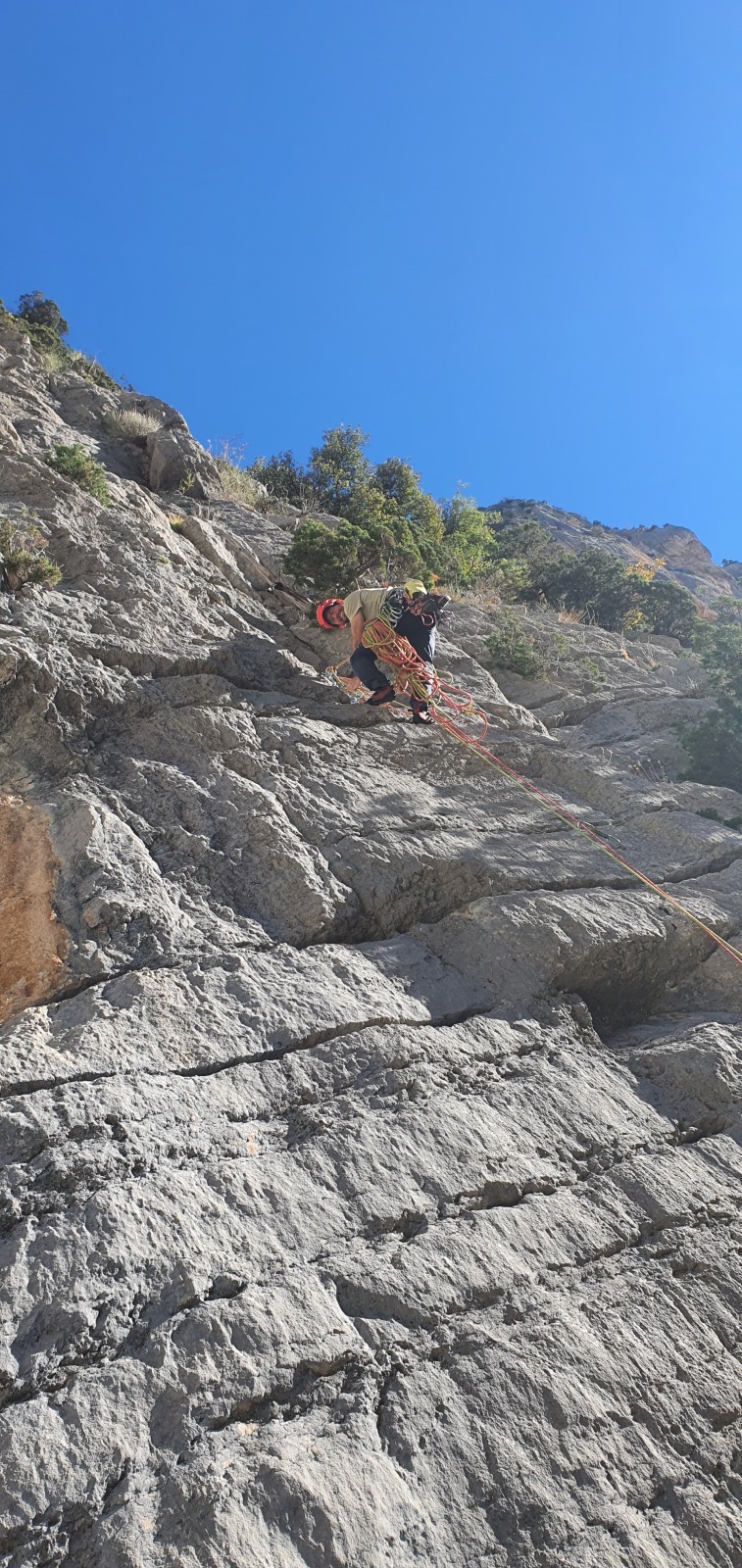 A notre gauche, Julien s’occupe de guide les cordées. Il enchaîne les deux premières longueurs (5c puis 6a) laissant la place à Roxane qui se perd un peu dans la longueur en 5c suivante malgré les indications claires « Vraiment à gauche ! » et oblige ses compagnons de cordée à traverser quelques buissons. Elle conserve le lead sur la longueur suivante et utilise ses compétences en TA pour improviser un relais mixte arbre/plaquette.