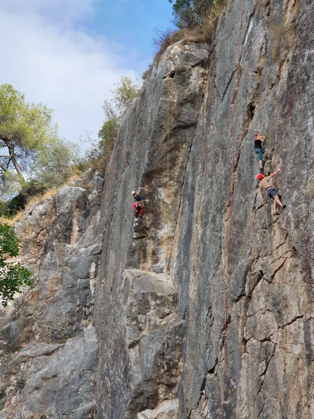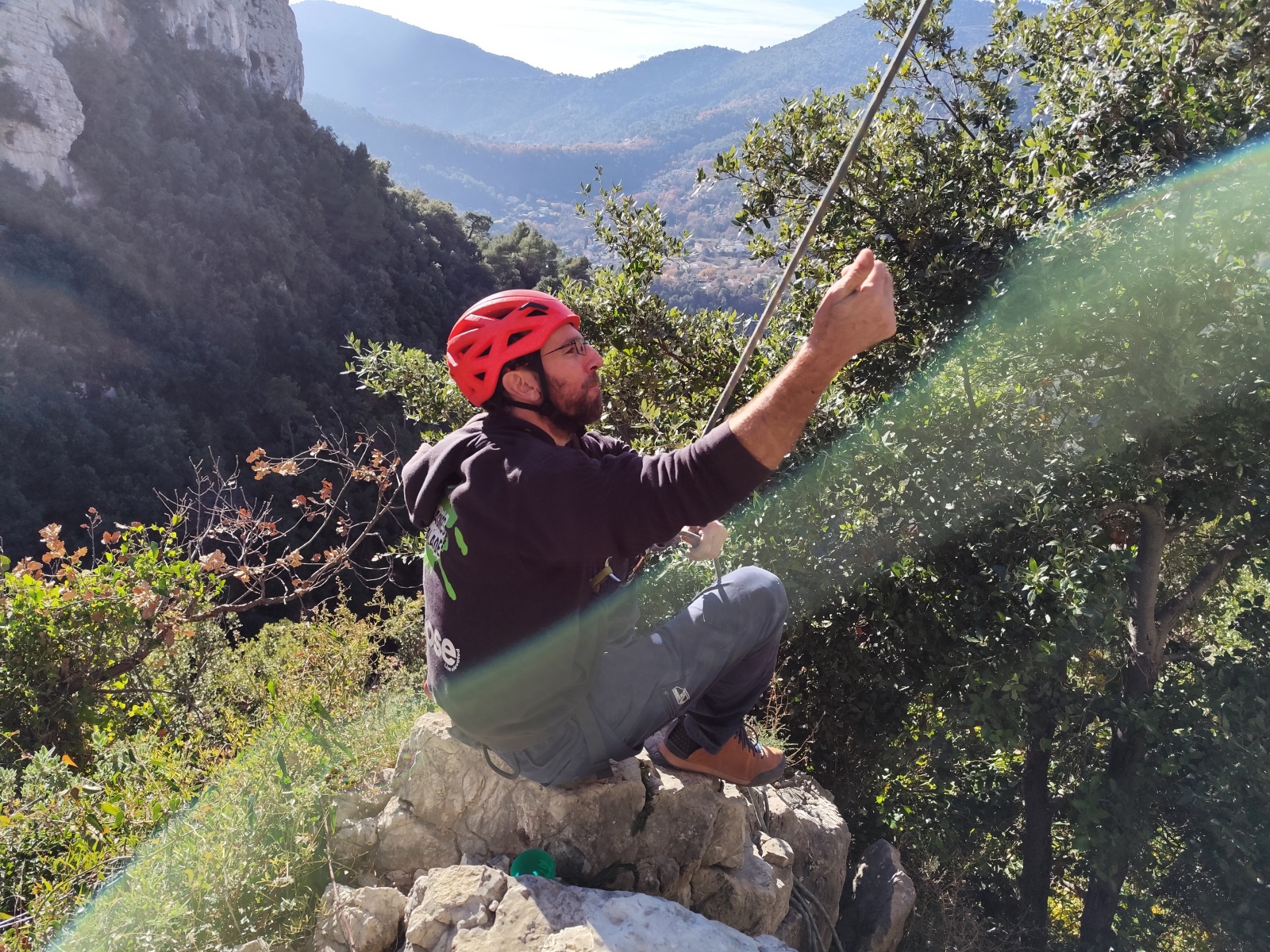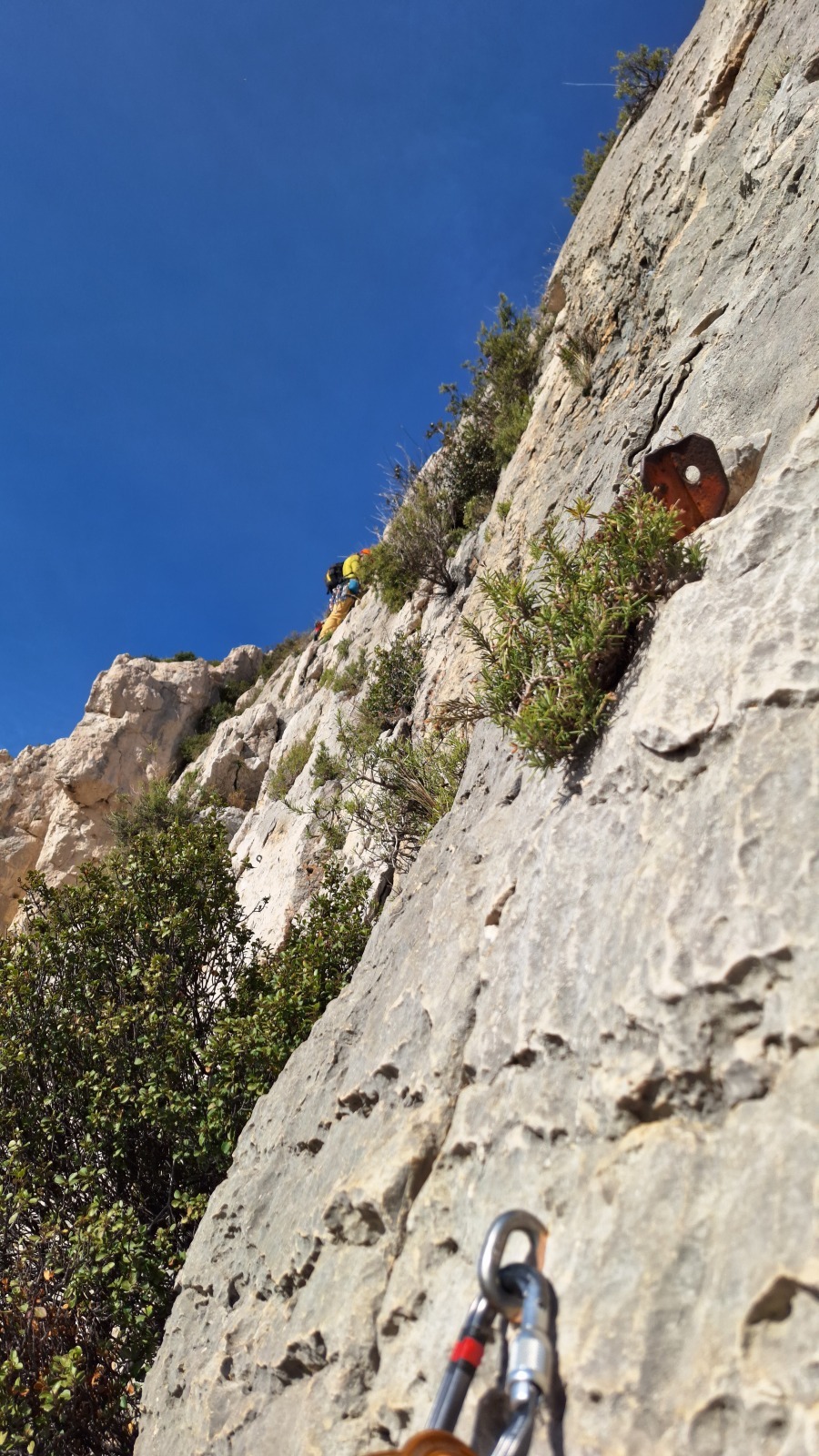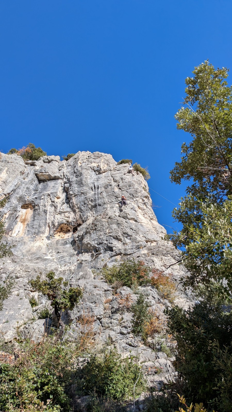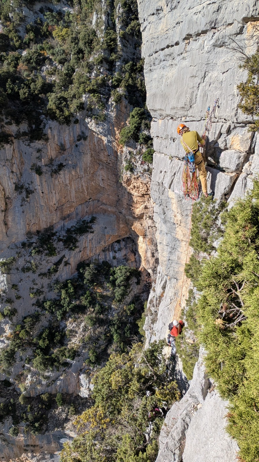 A notre gauche, Julien s’occupe de guide les cordées. Il enchaîne les deux premières longueurs (5c puis 6a) laissant la place à Roxane qui se perd un peu dans la longueur en 5c suivante malgré les indications claires « Vraiment à gauche ! » et oblige ses compagnons de cordée à traverser quelques buissons. Elle conserve le lead sur la longueur suivante et utilise ses compétences en TA pour improviser un relais mixte arbre/plaquette.