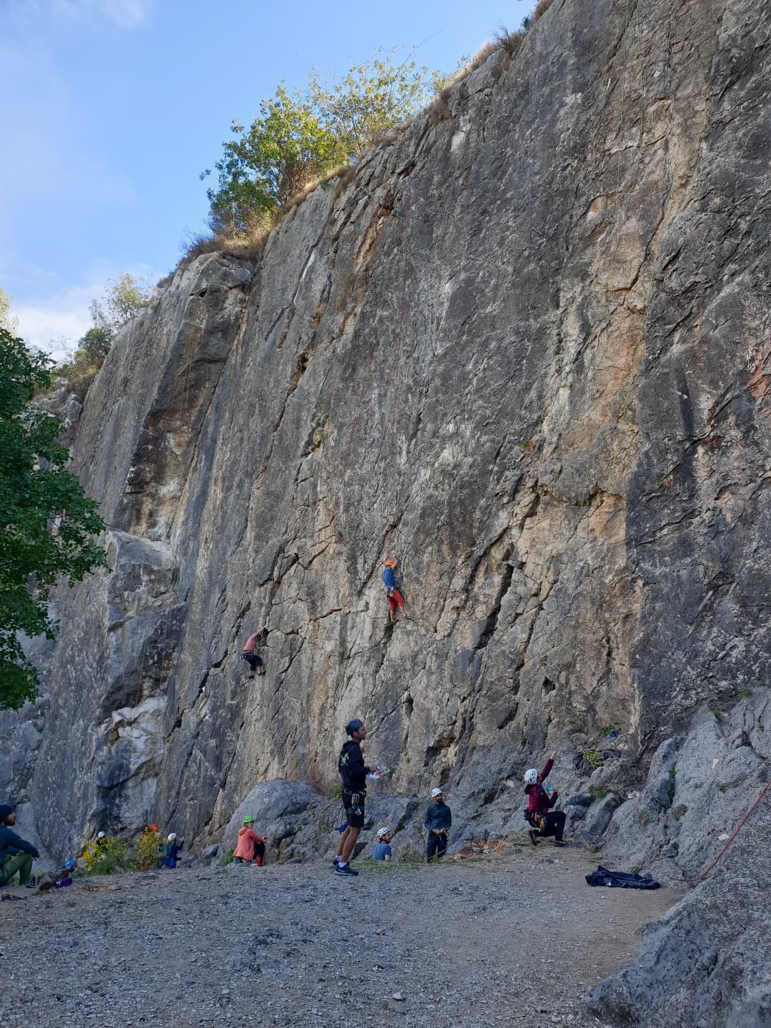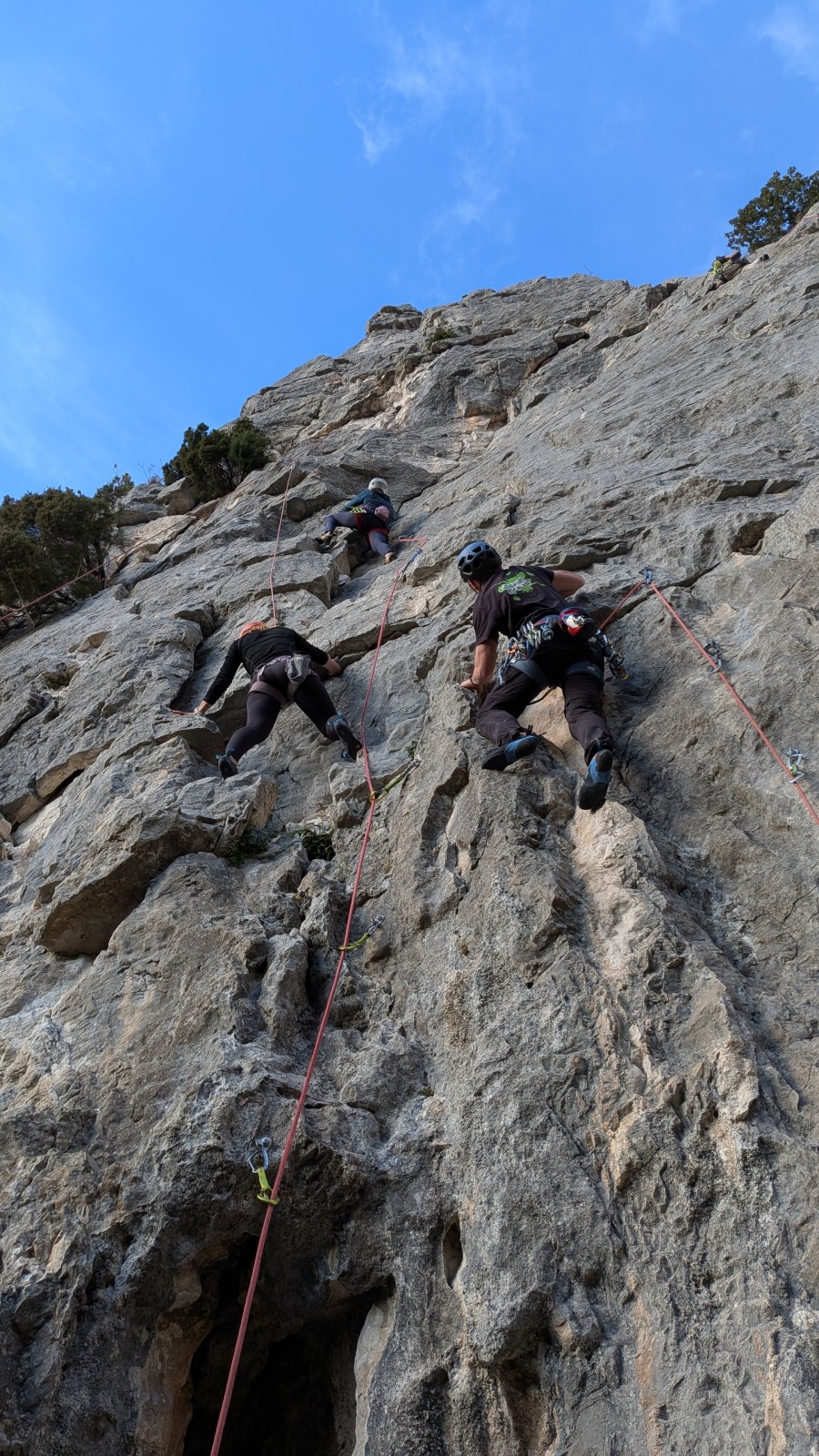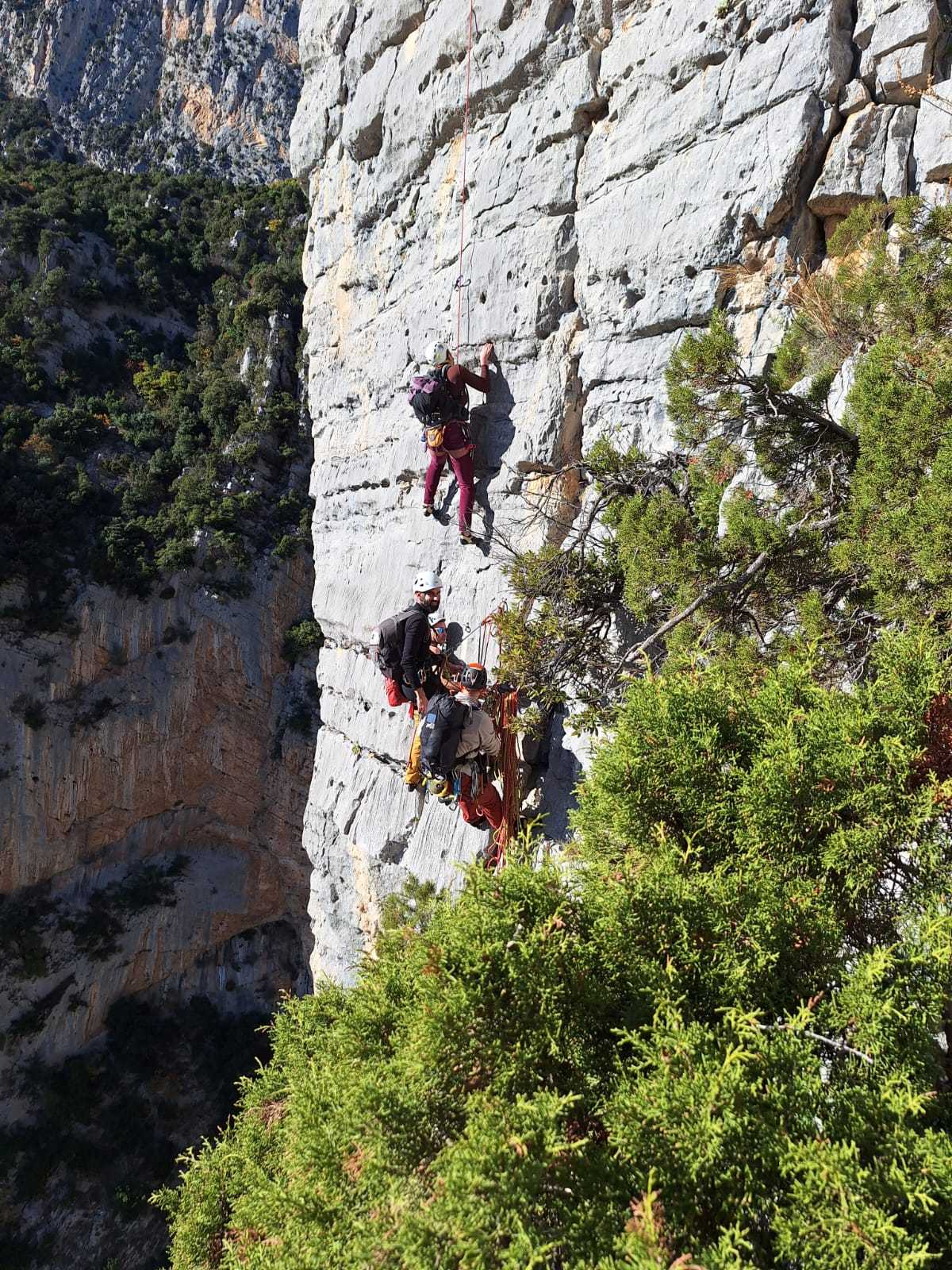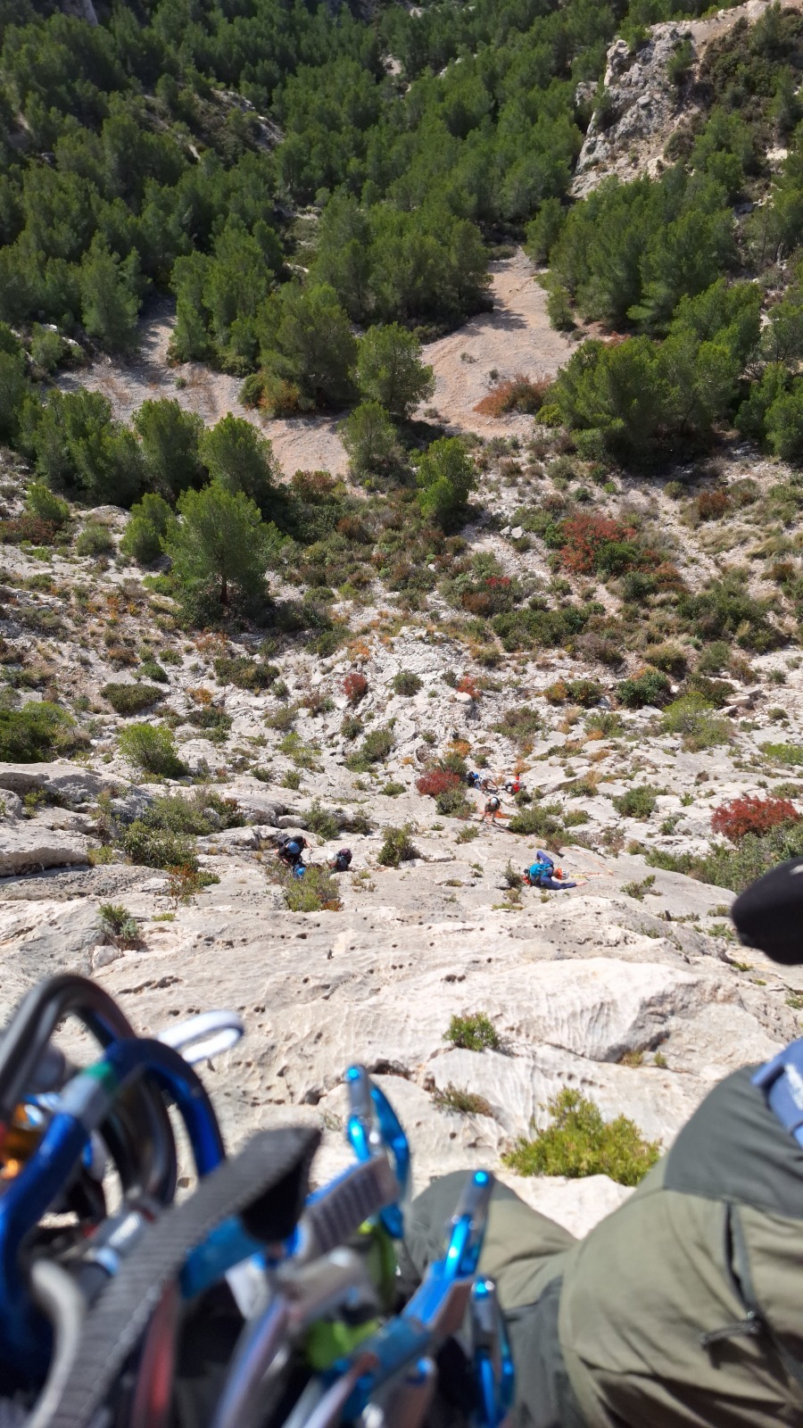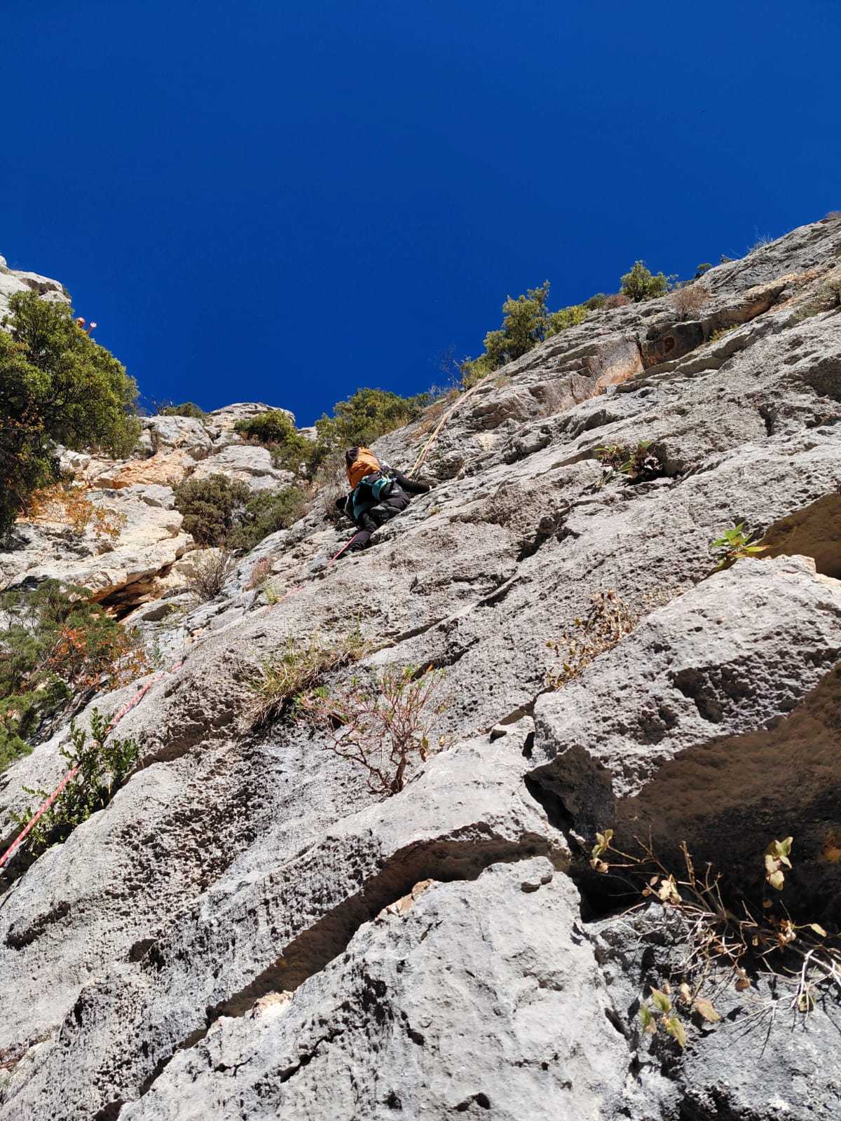 A notre gauche, Julien s’occupe de guide les cordées. Il enchaîne les deux premières longueurs (5c puis 6a) laissant la place à Roxane qui se perd un peu dans la longueur en 5c suivante malgré les indications claires « Vraiment à gauche ! » et oblige ses compagnons de cordée à traverser quelques buissons. Elle conserve le lead sur la longueur suivante et utilise ses compétences en TA pour improviser un relais mixte arbre/plaquette.