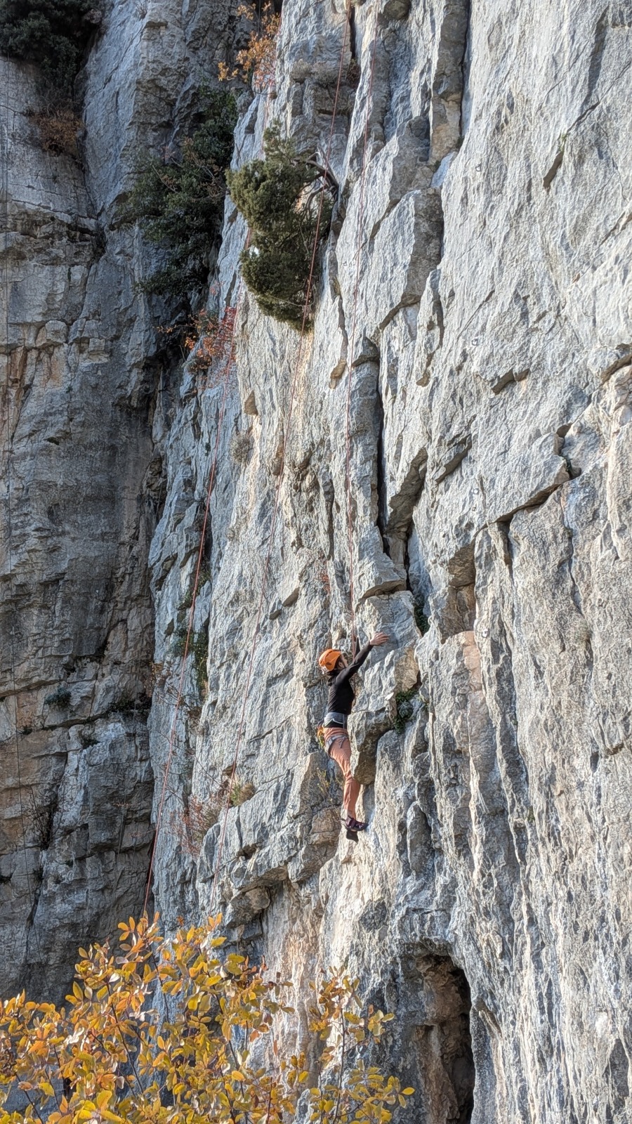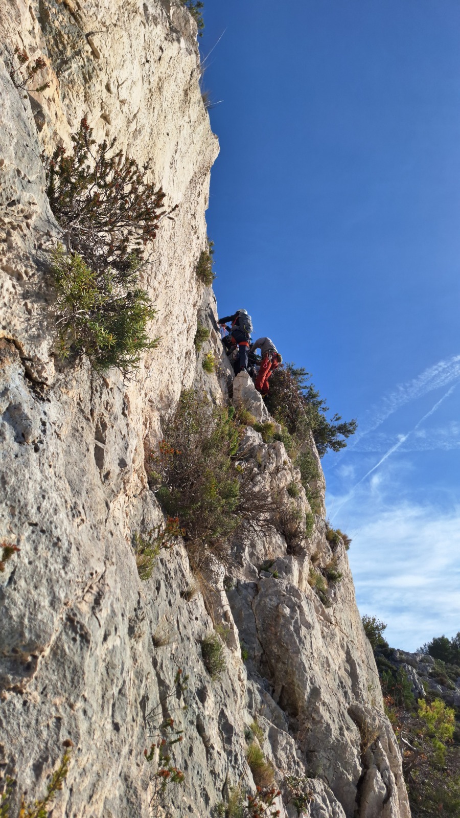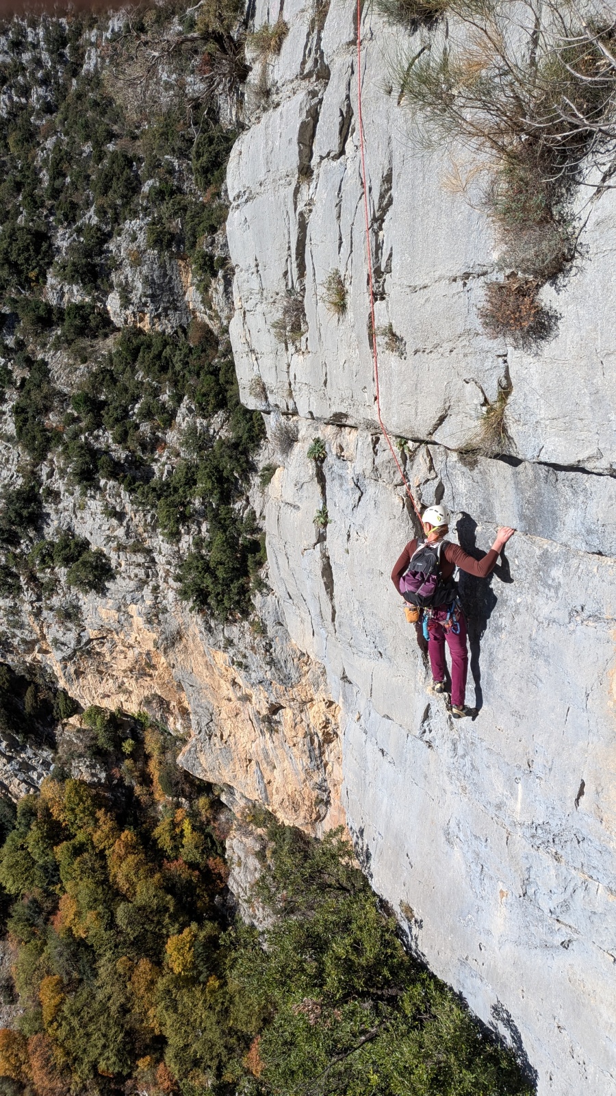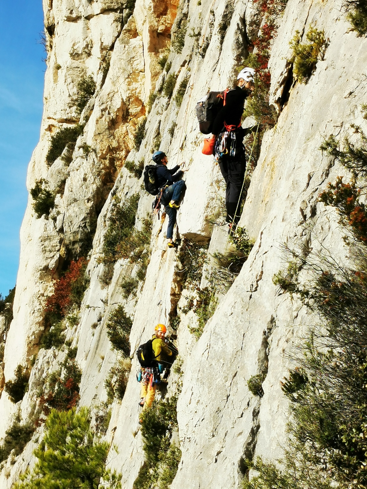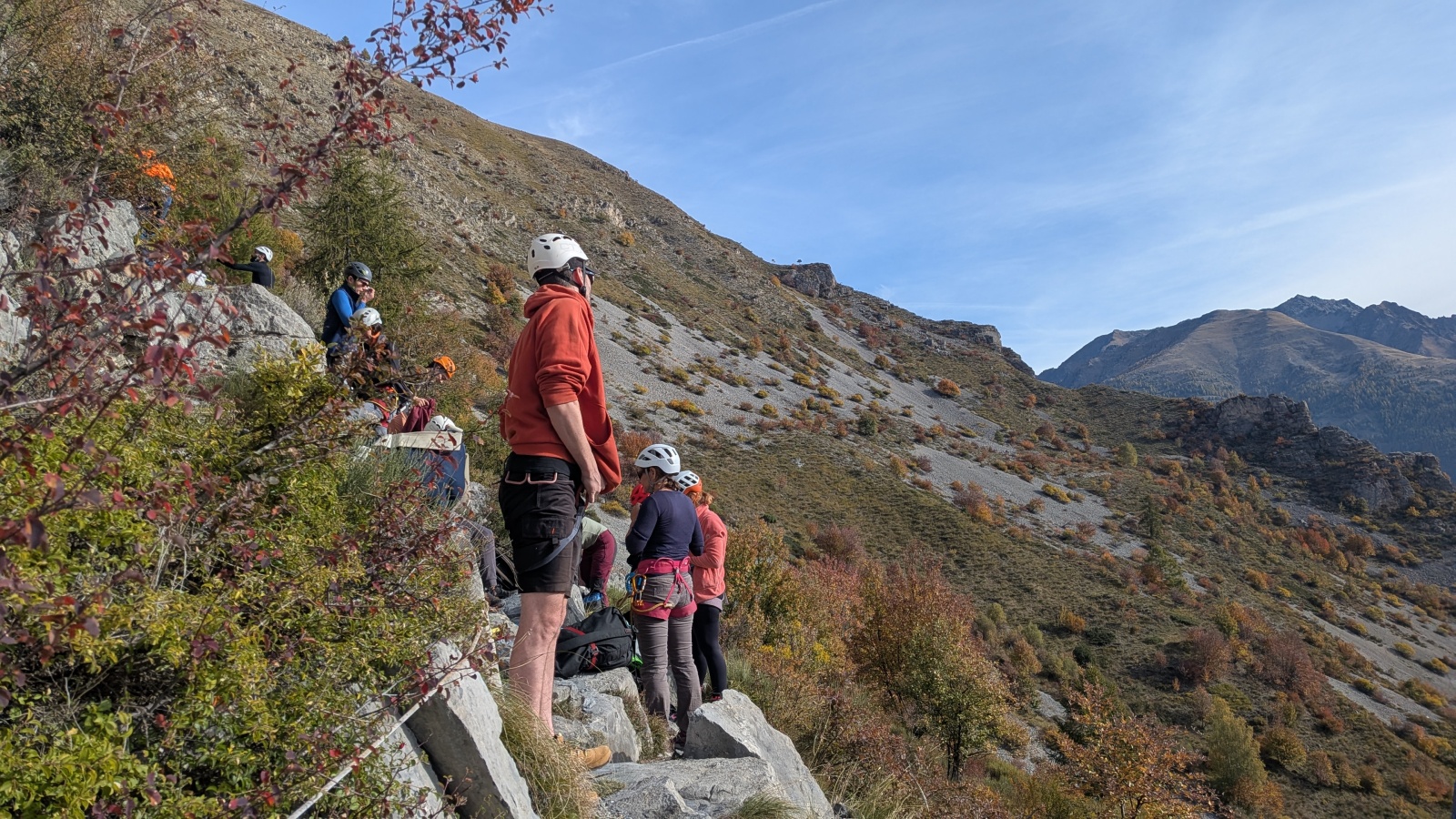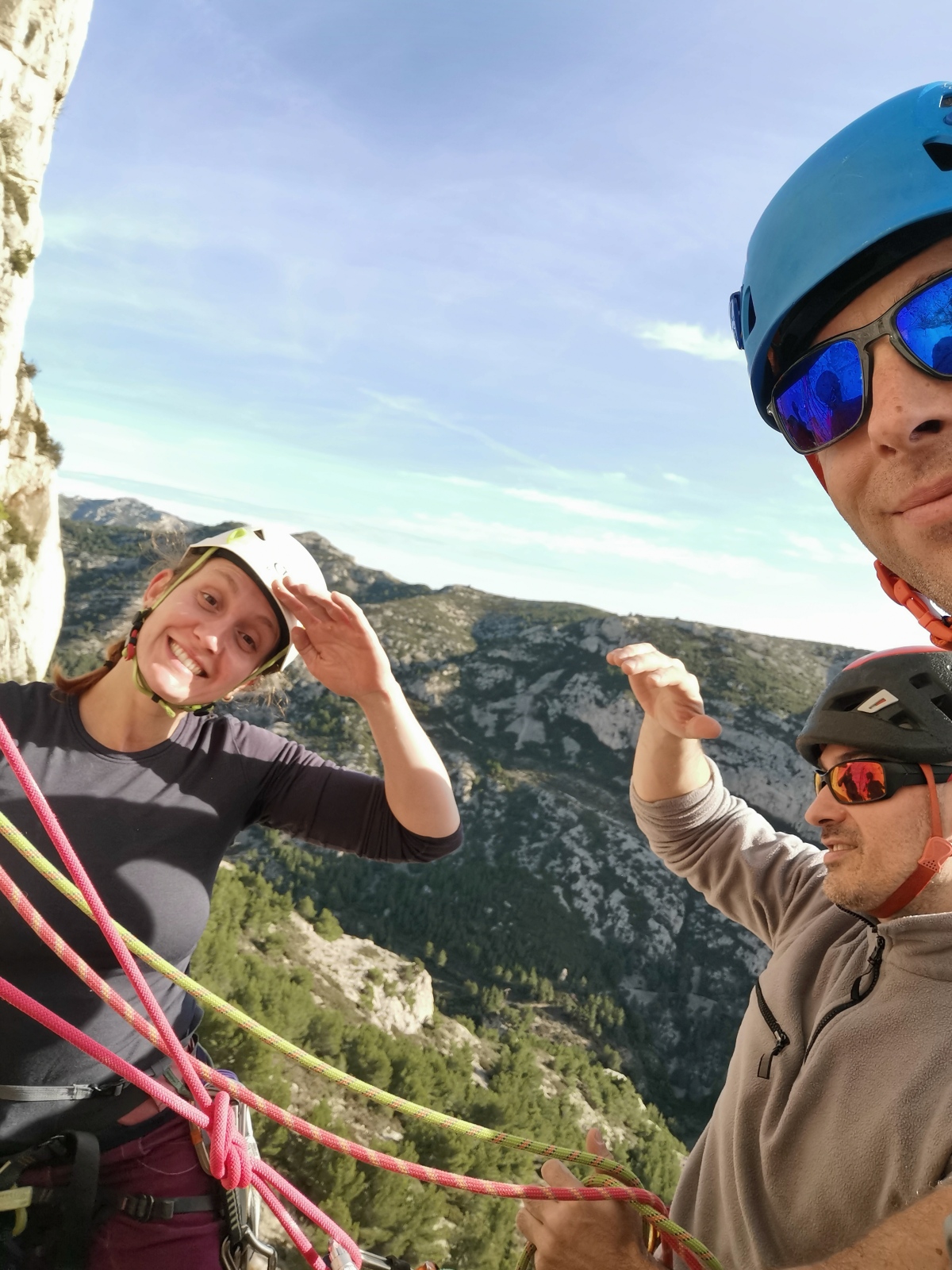 A notre gauche, Julien s’occupe de guide les cordées. Il enchaîne les deux premières longueurs (5c puis 6a) laissant la place à Roxane qui se perd un peu dans la longueur en 5c suivante malgré les indications claires « Vraiment à gauche ! » et oblige ses compagnons de cordée à traverser quelques buissons. Elle conserve le lead sur la longueur suivante et utilise ses compétences en TA pour improviser un relais mixte arbre/plaquette.