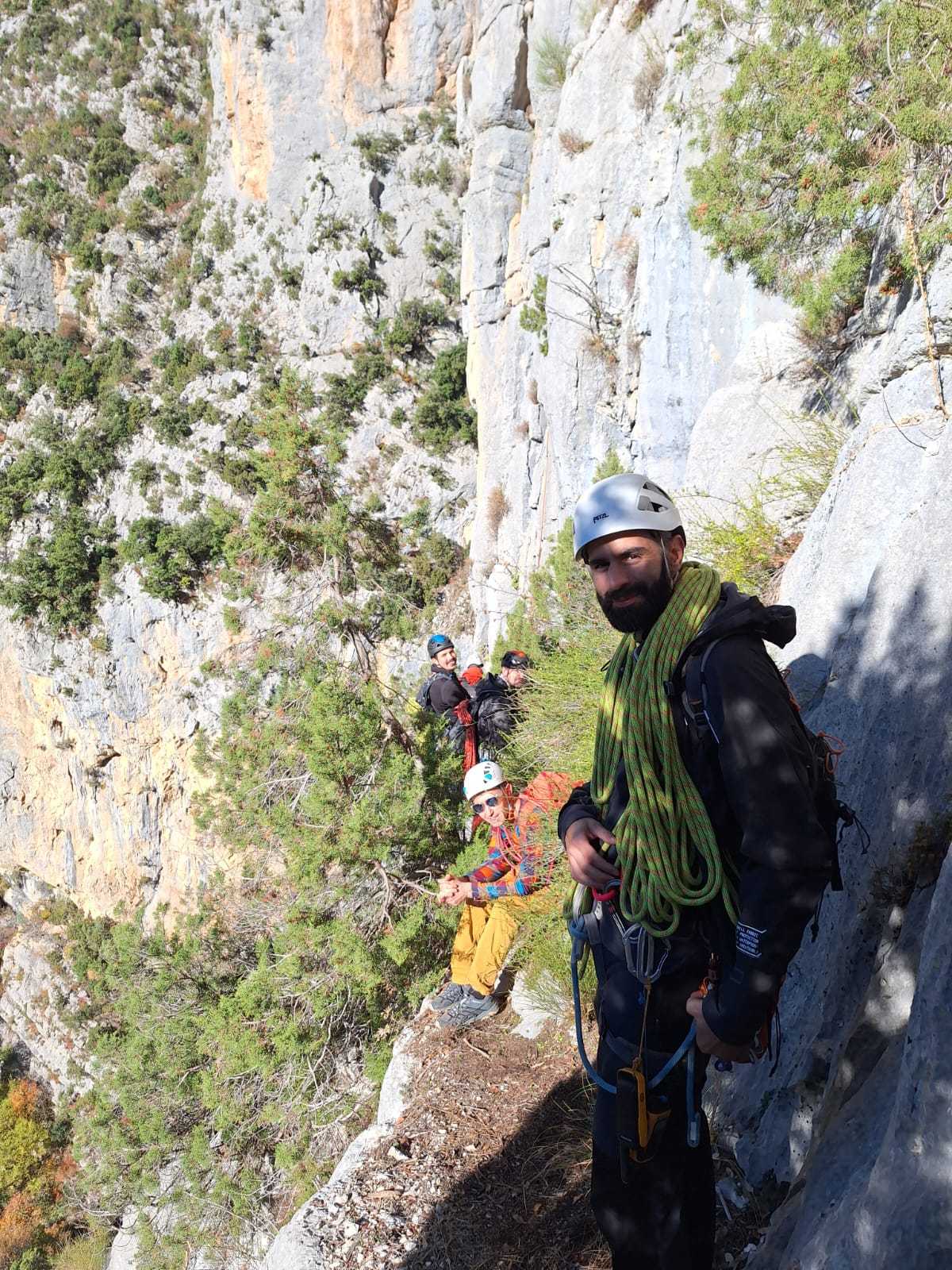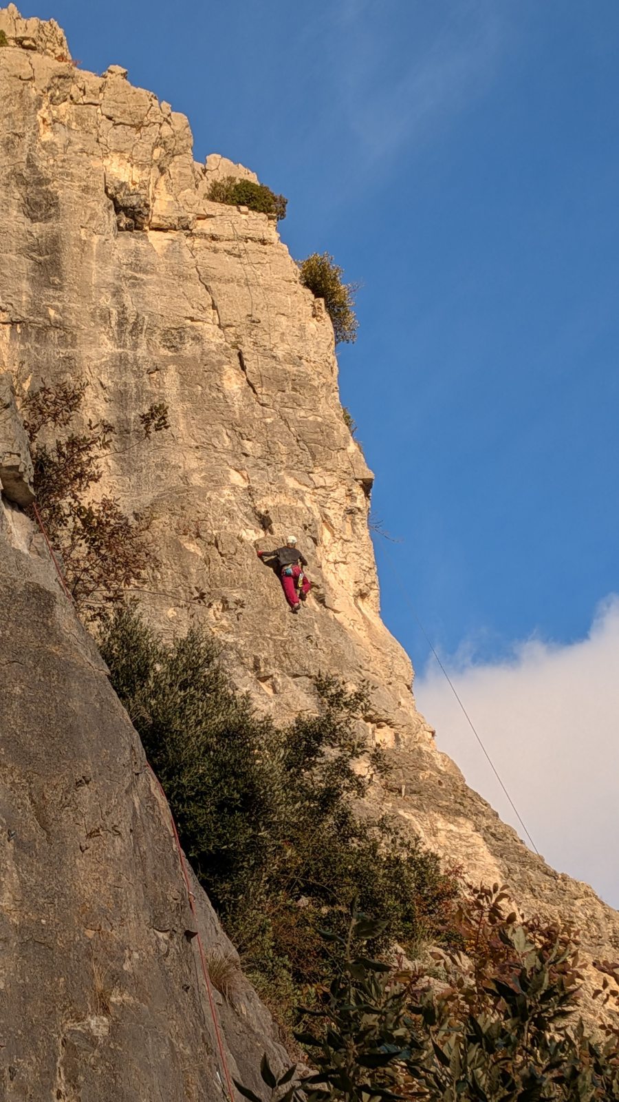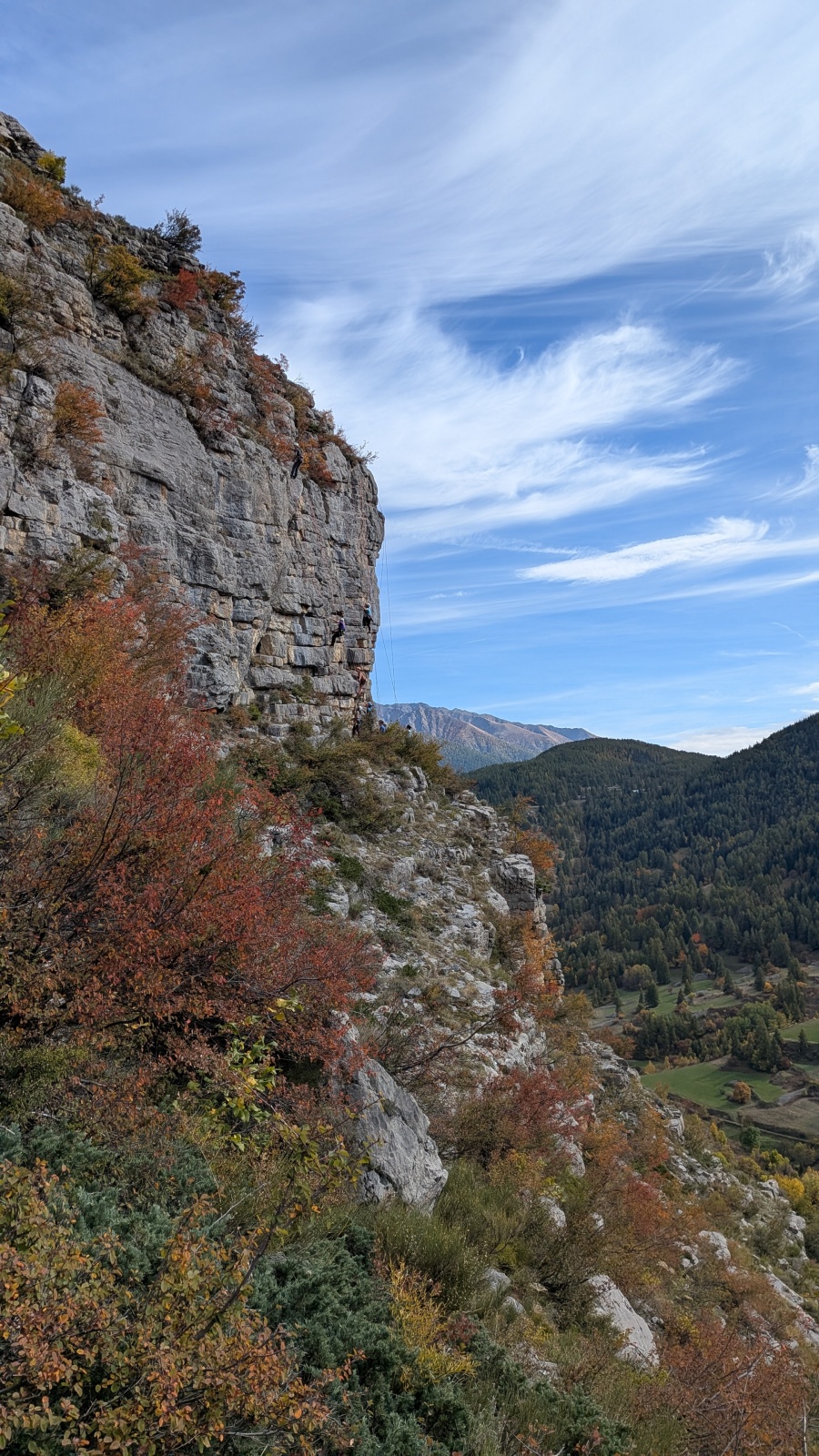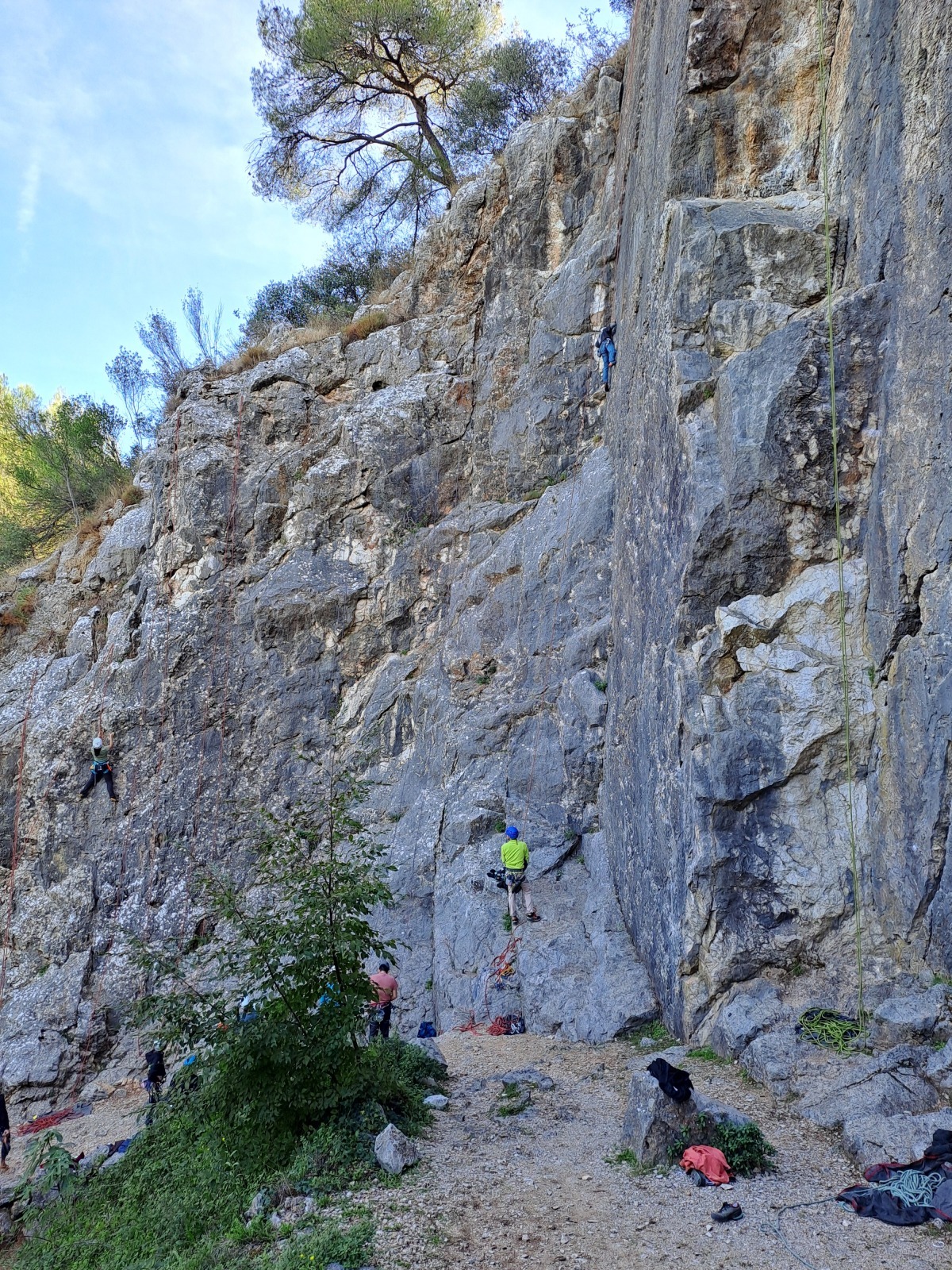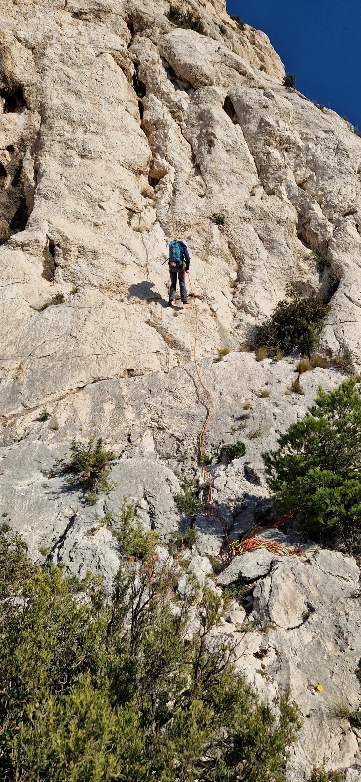 A notre gauche, Julien s’occupe de guide les cordées. Il enchaîne les deux premières longueurs (5c puis 6a) laissant la place à Roxane qui se perd un peu dans la longueur en 5c suivante malgré les indications claires « Vraiment à gauche ! » et oblige ses compagnons de cordée à traverser quelques buissons. Elle conserve le lead sur la longueur suivante et utilise ses compétences en TA pour improviser un relais mixte arbre/plaquette.