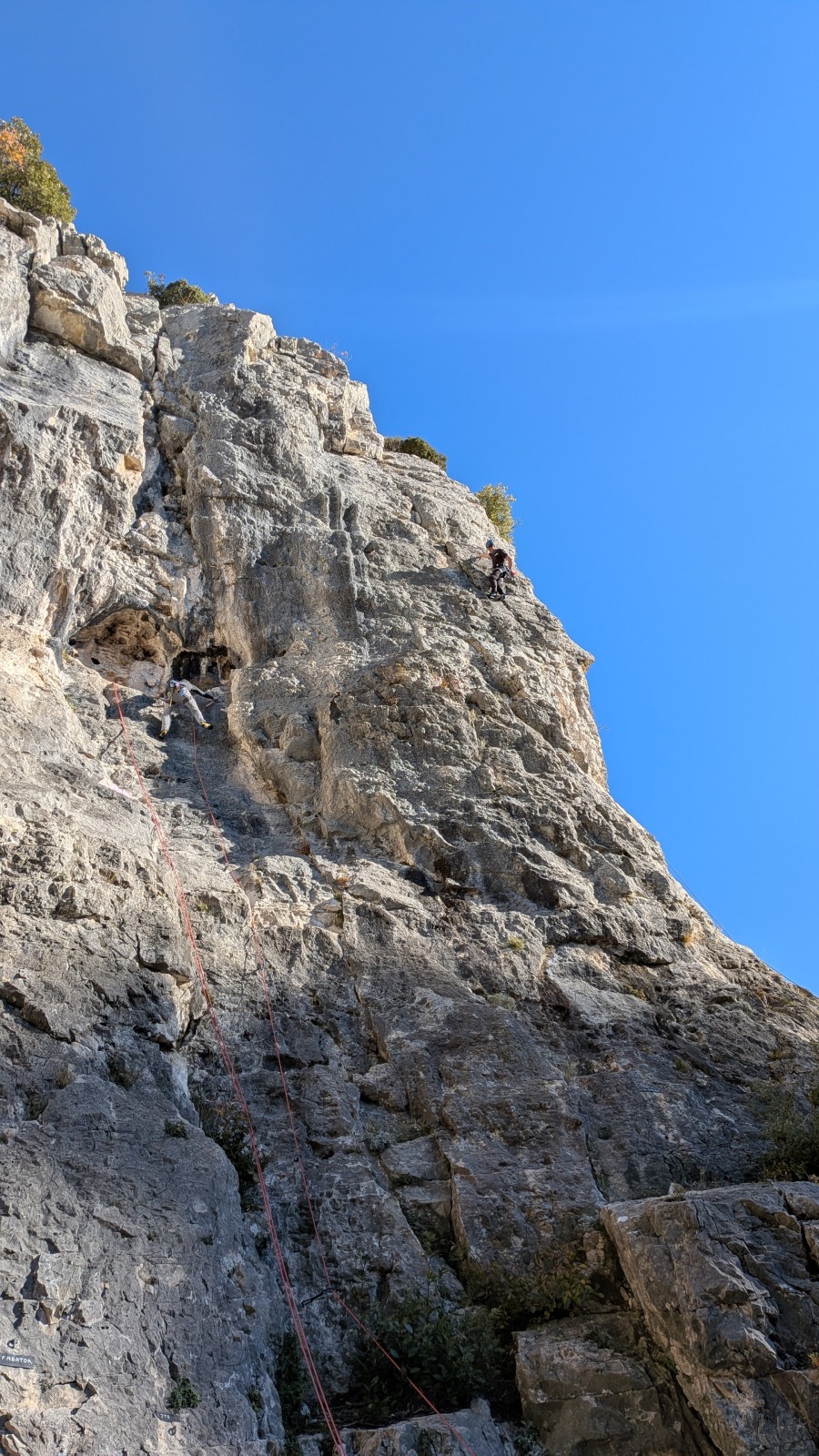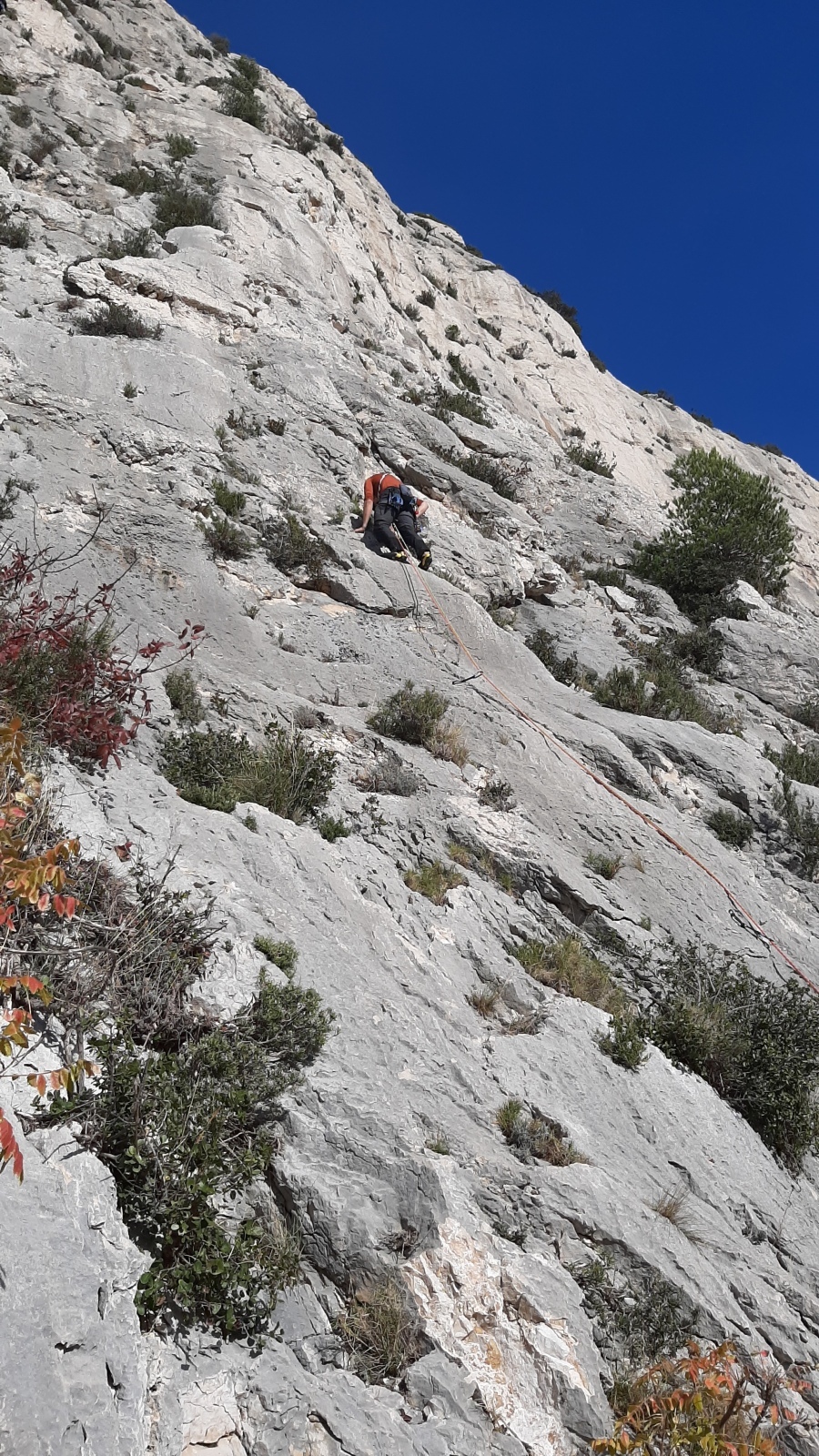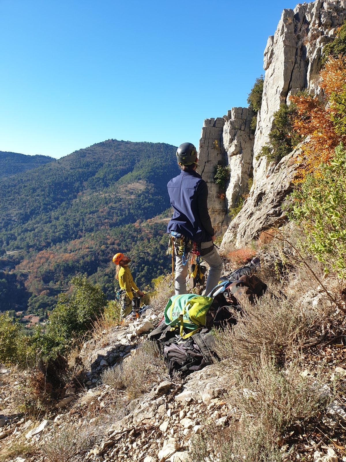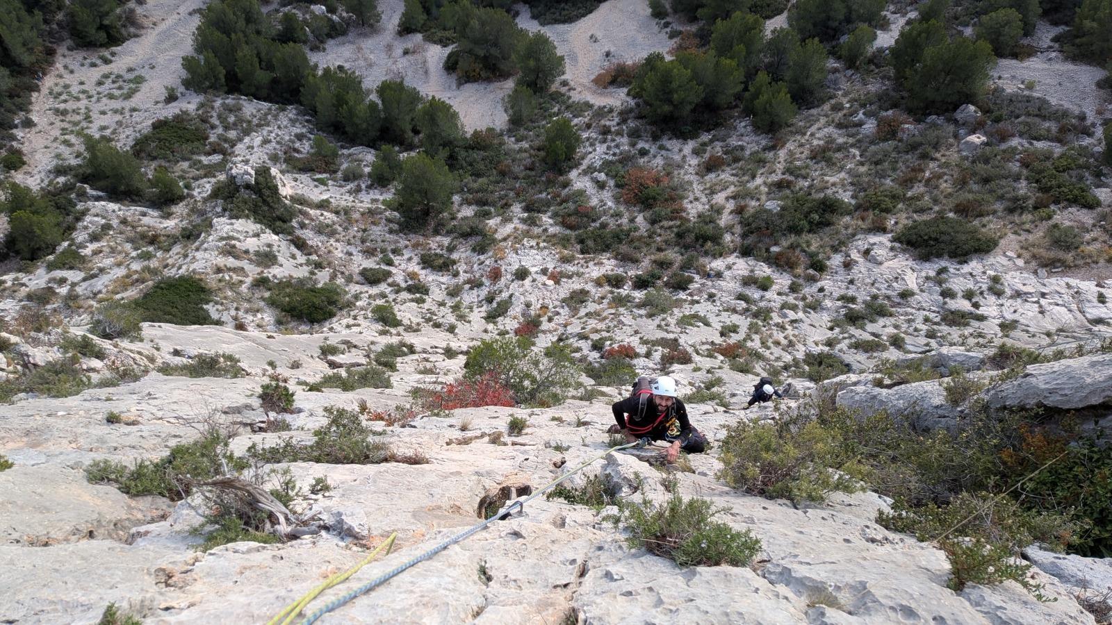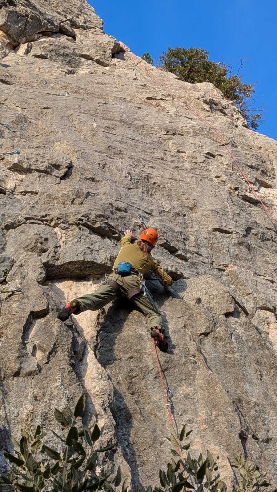 A notre gauche, Julien s’occupe de guide les cordées. Il enchaîne les deux premières longueurs (5c puis 6a) laissant la place à Roxane qui se perd un peu dans la longueur en 5c suivante malgré les indications claires « Vraiment à gauche ! » et oblige ses compagnons de cordée à traverser quelques buissons. Elle conserve le lead sur la longueur suivante et utilise ses compétences en TA pour improviser un relais mixte arbre/plaquette.