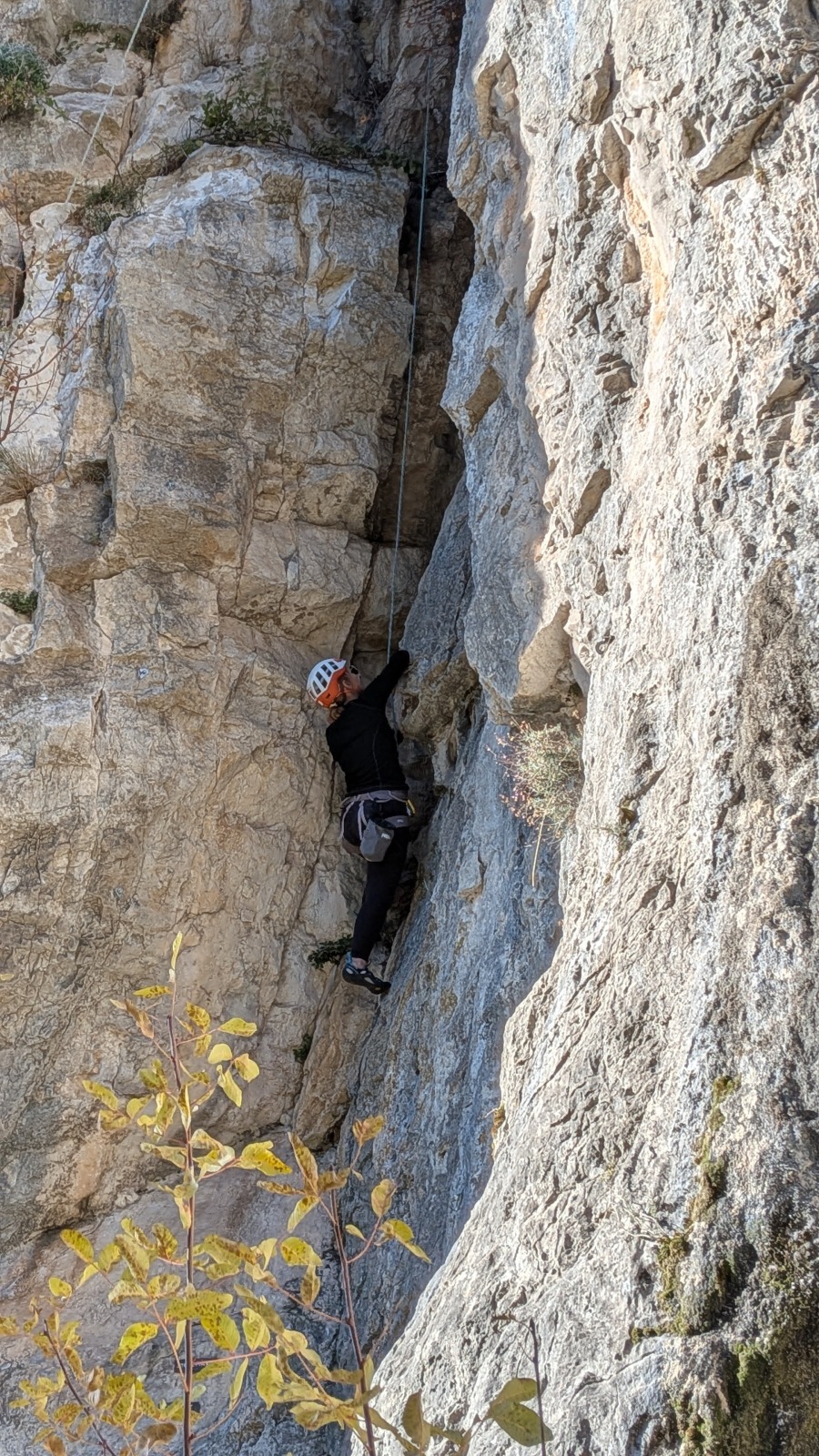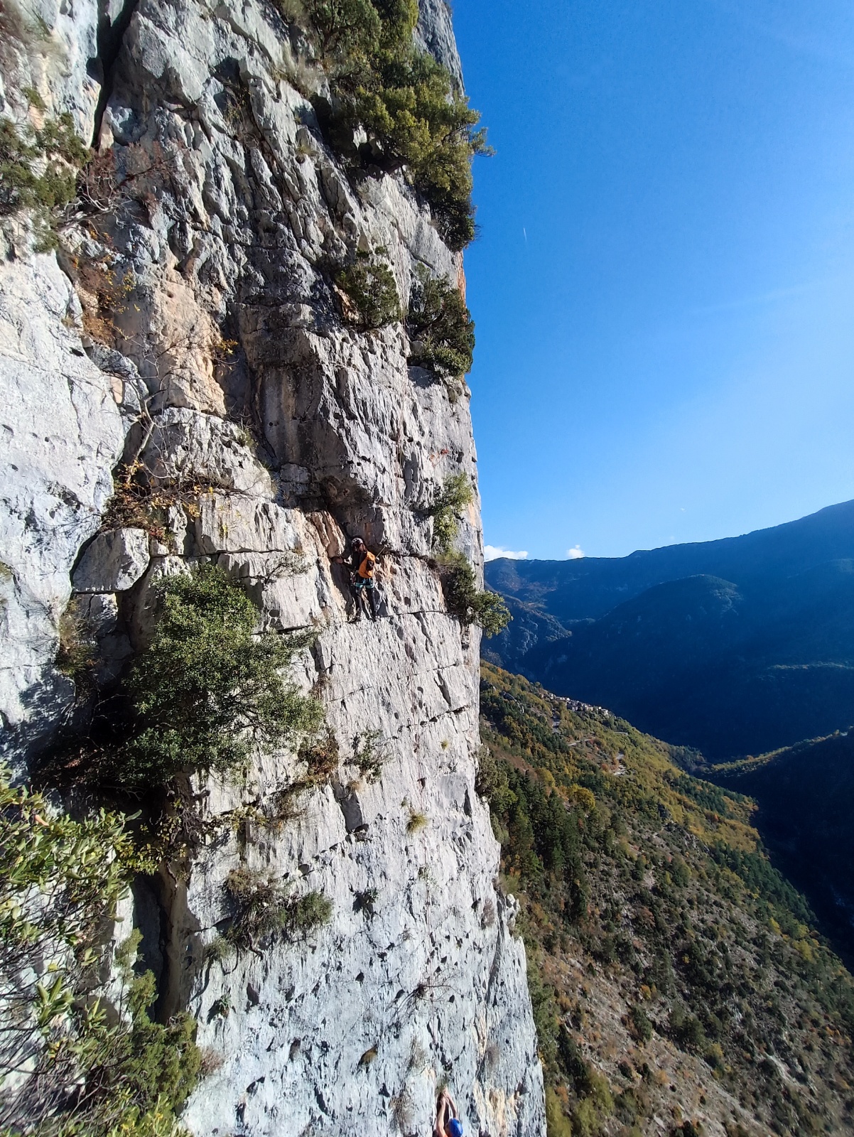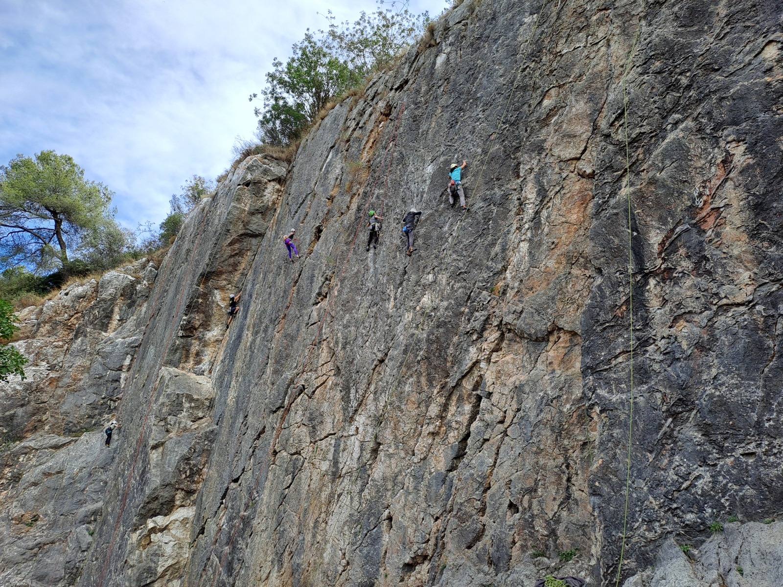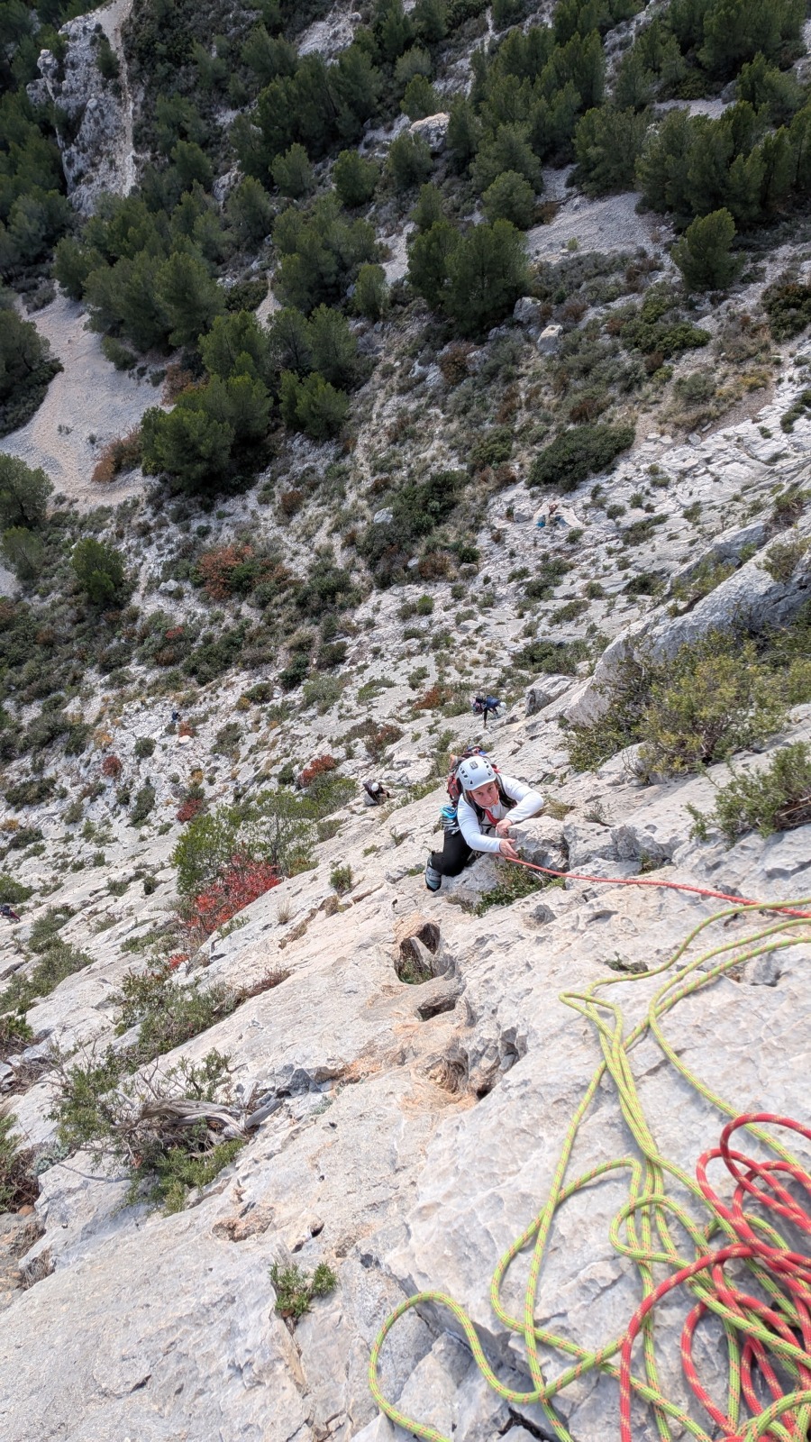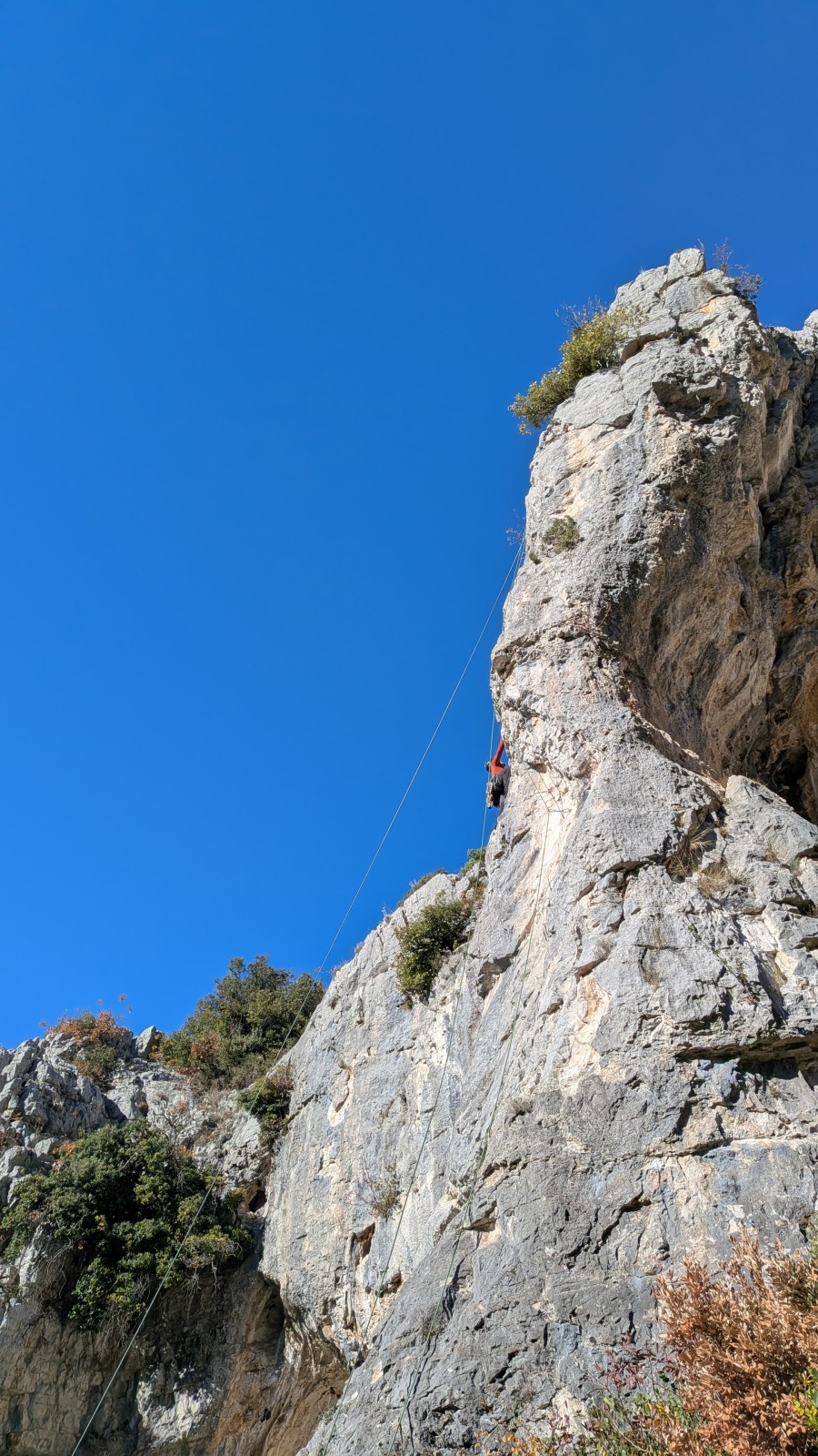 A notre gauche, Julien s’occupe de guide les cordées. Il enchaîne les deux premières longueurs (5c puis 6a) laissant la place à Roxane qui se perd un peu dans la longueur en 5c suivante malgré les indications claires « Vraiment à gauche ! » et oblige ses compagnons de cordée à traverser quelques buissons. Elle conserve le lead sur la longueur suivante et utilise ses compétences en TA pour improviser un relais mixte arbre/plaquette.