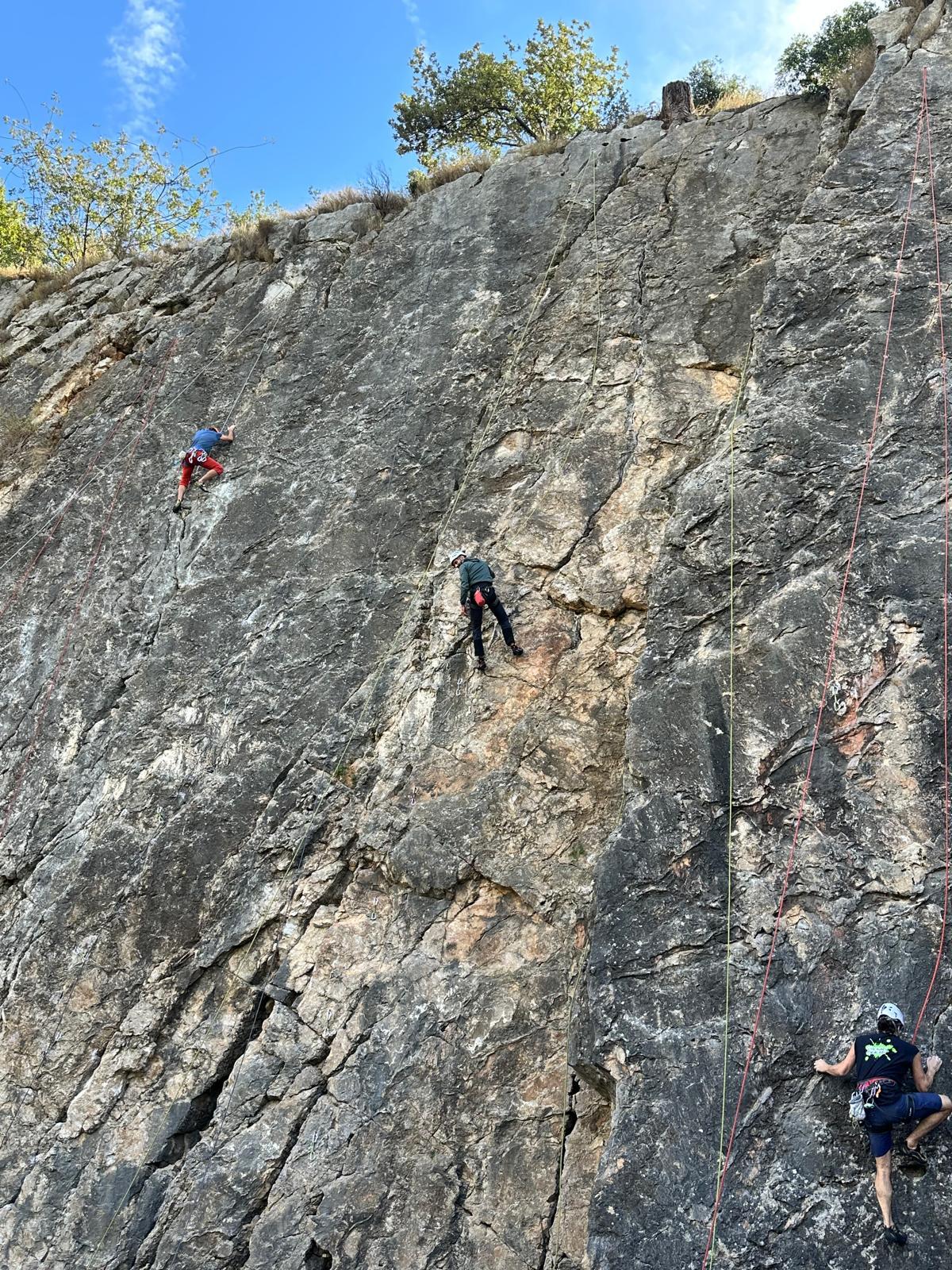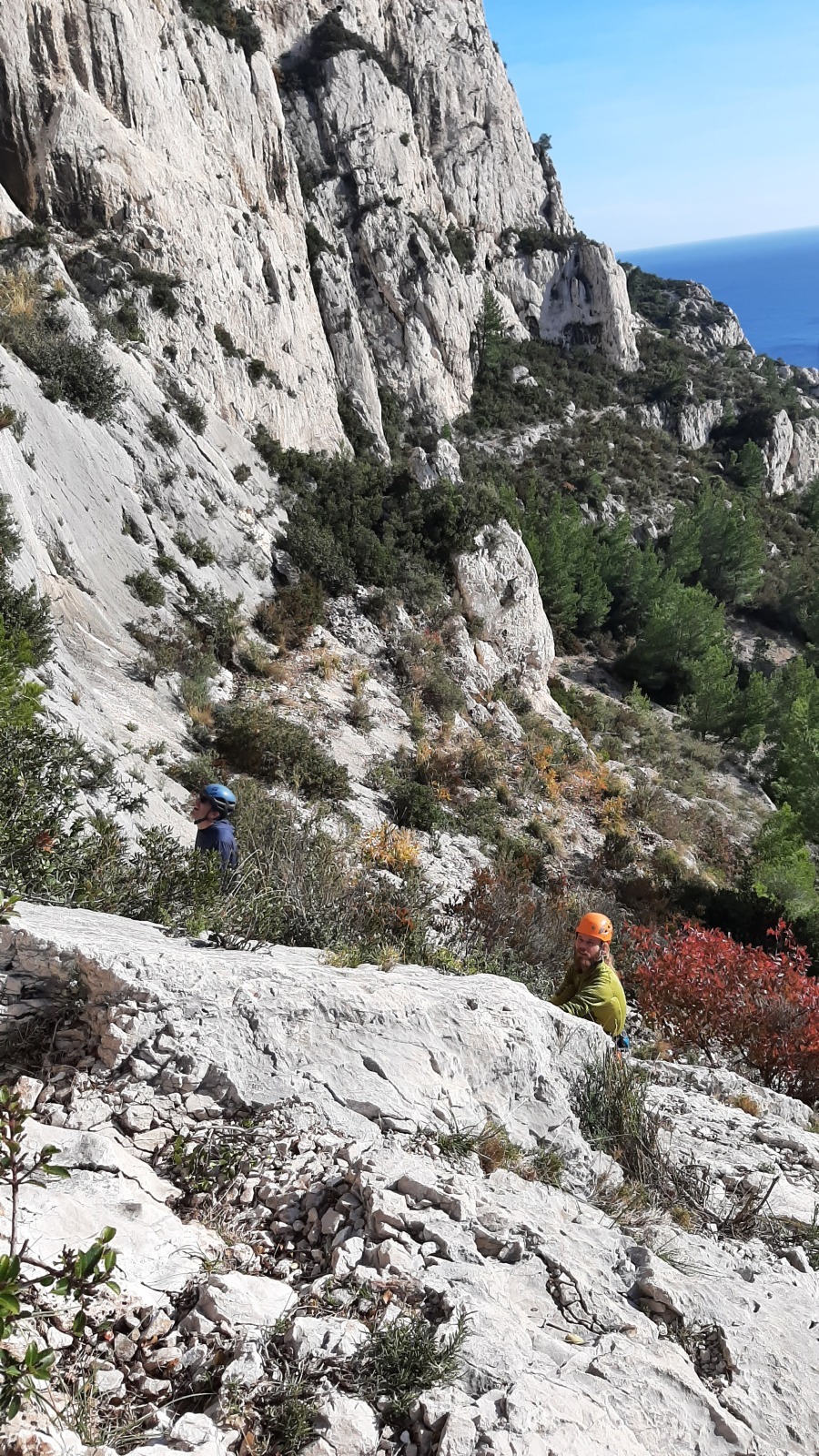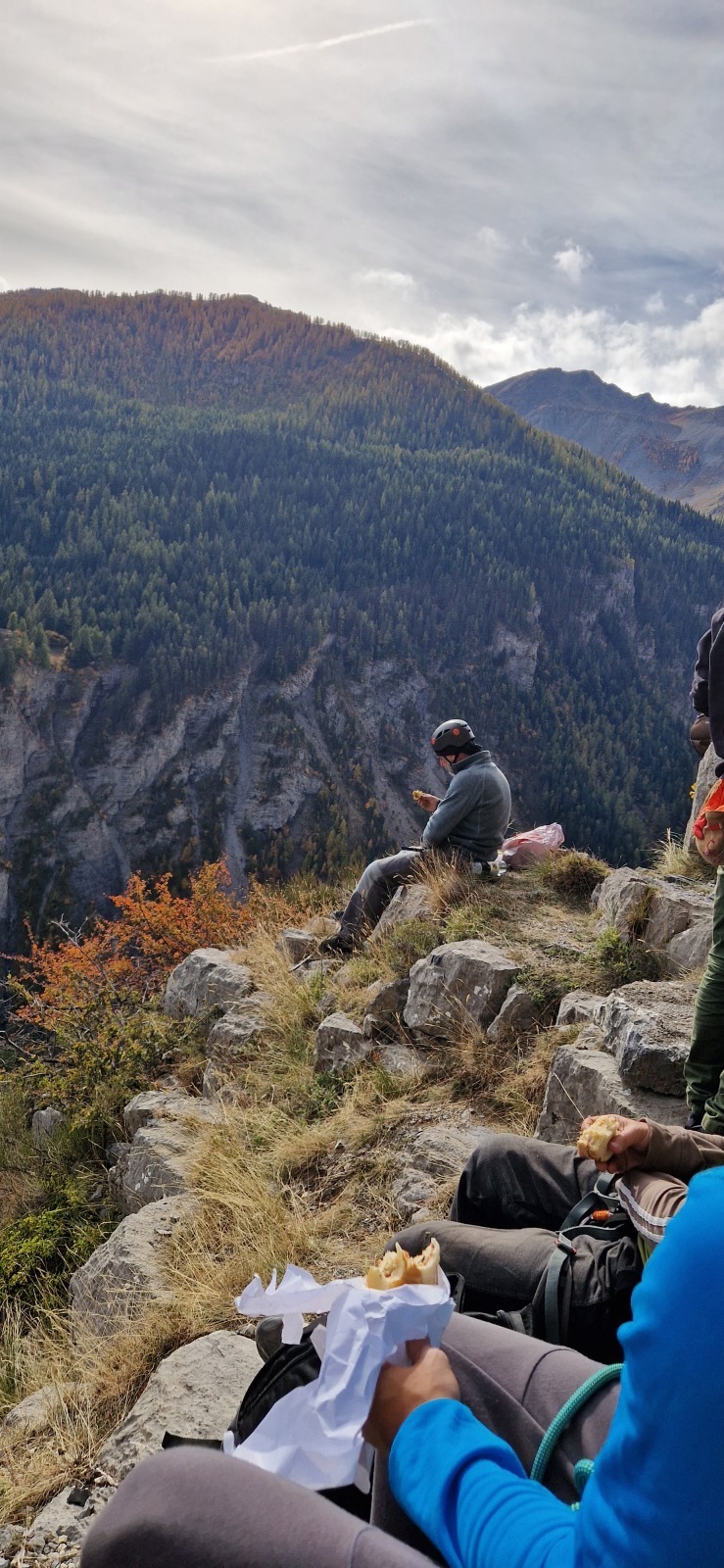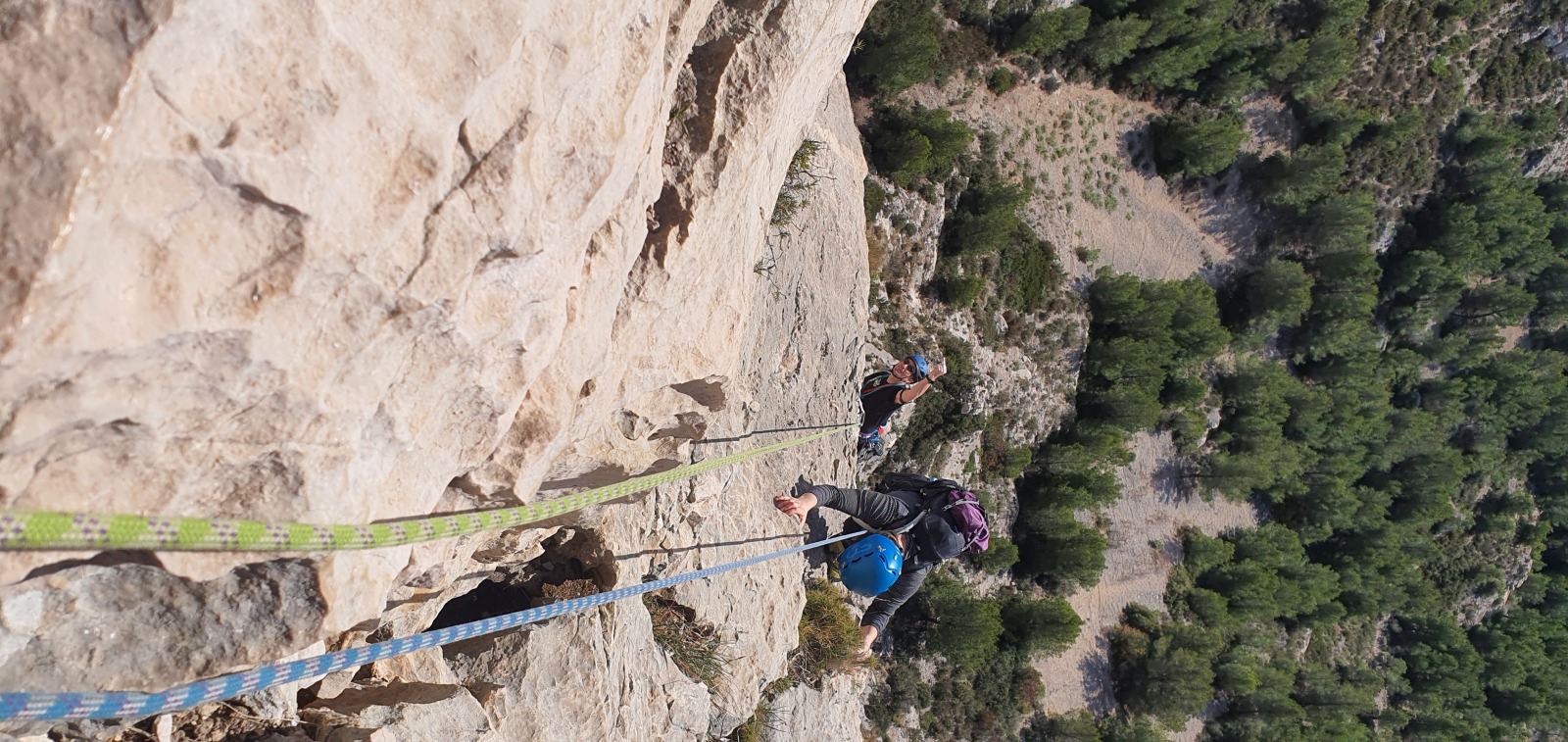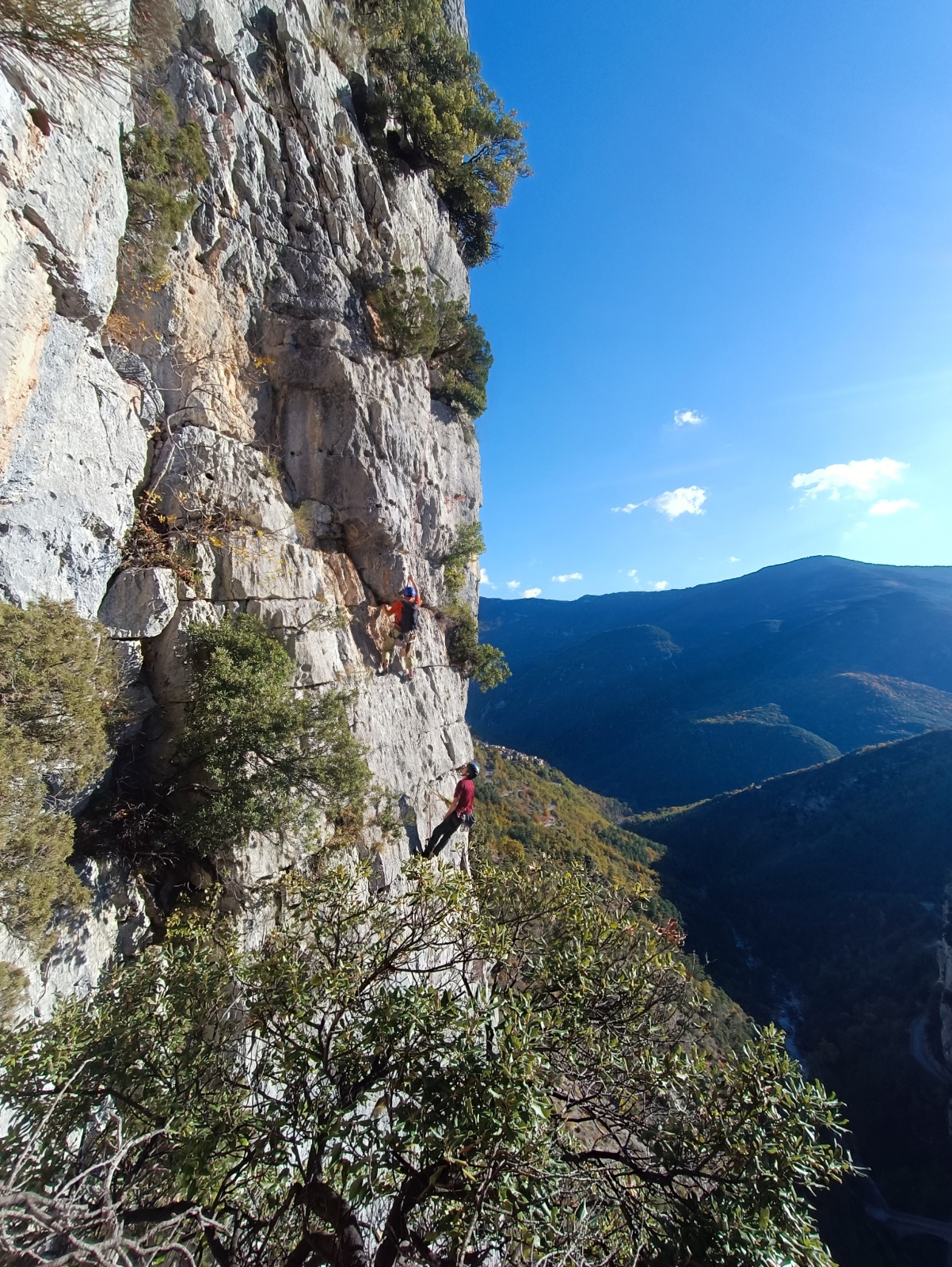 A notre gauche, Julien s’occupe de guide les cordées. Il enchaîne les deux premières longueurs (5c puis 6a) laissant la place à Roxane qui se perd un peu dans la longueur en 5c suivante malgré les indications claires « Vraiment à gauche ! » et oblige ses compagnons de cordée à traverser quelques buissons. Elle conserve le lead sur la longueur suivante et utilise ses compétences en TA pour improviser un relais mixte arbre/plaquette.