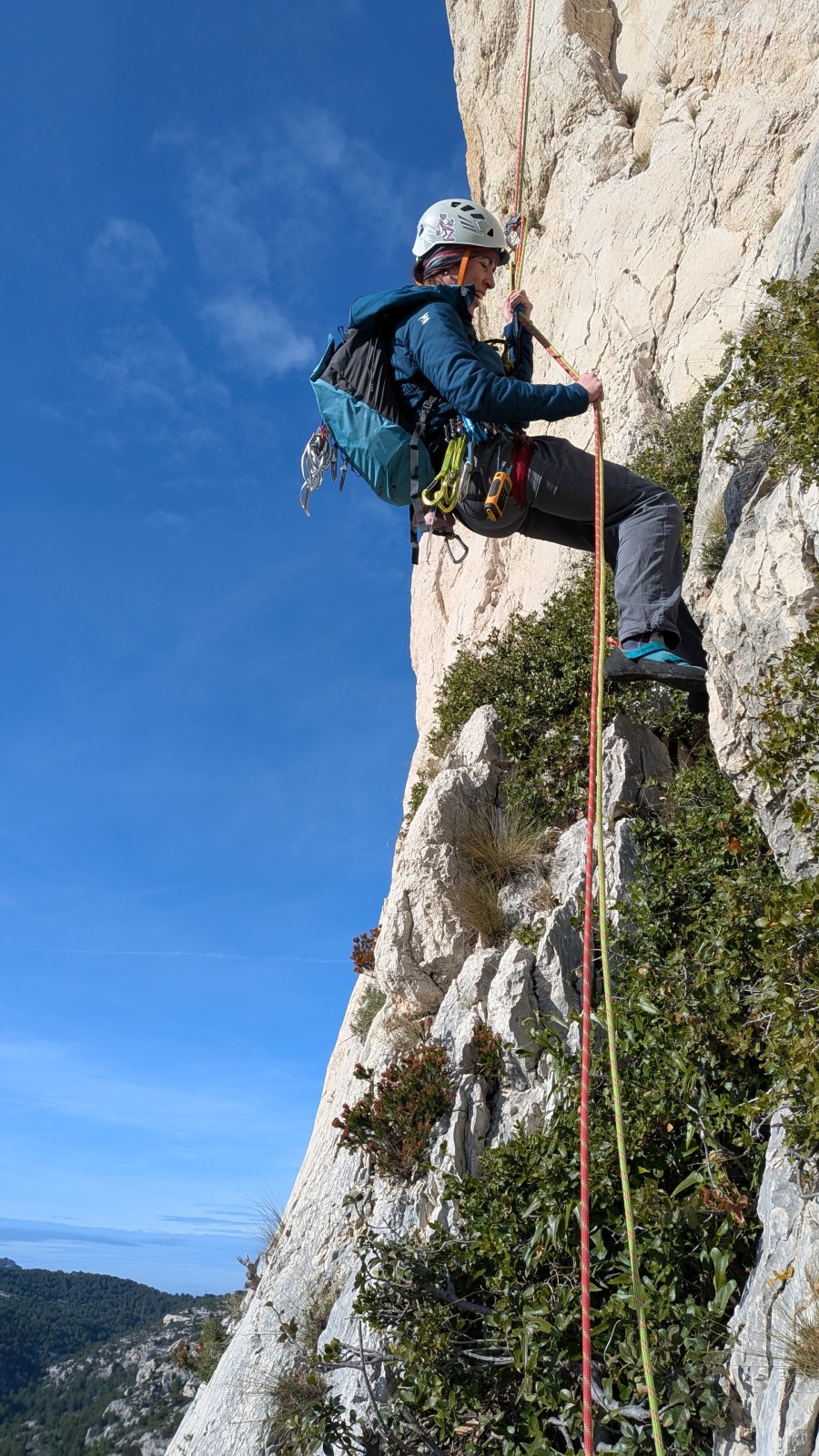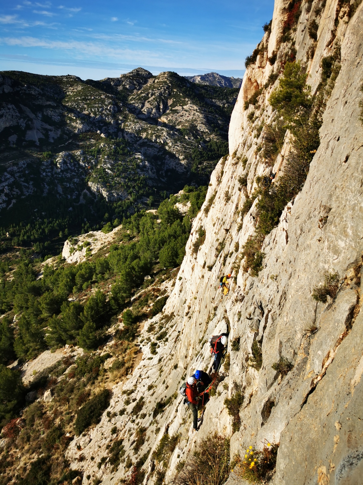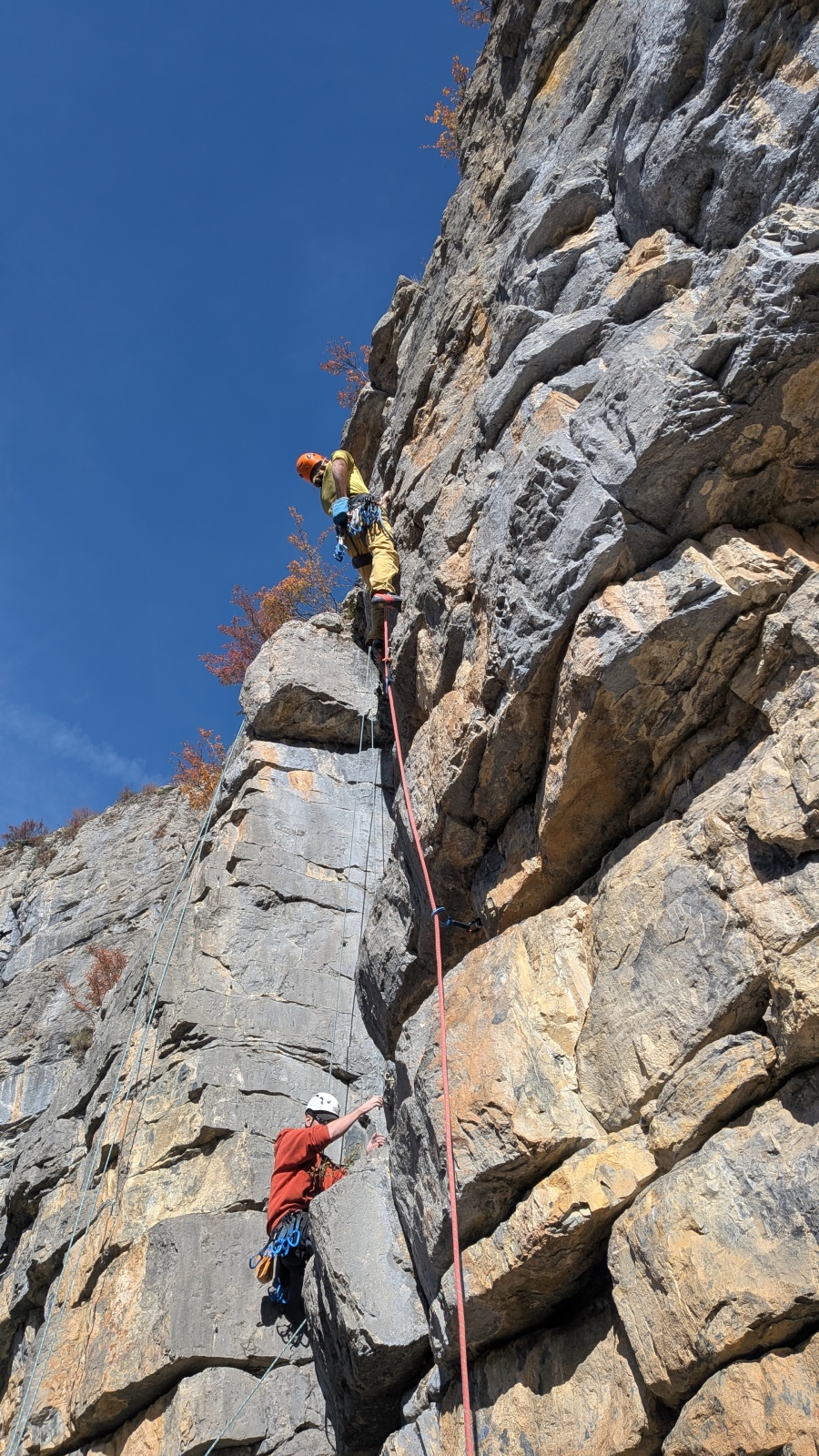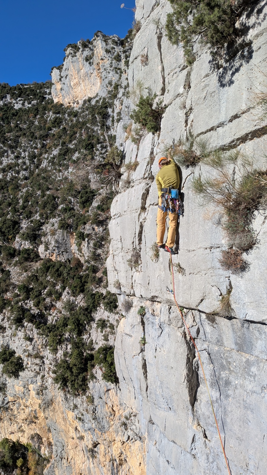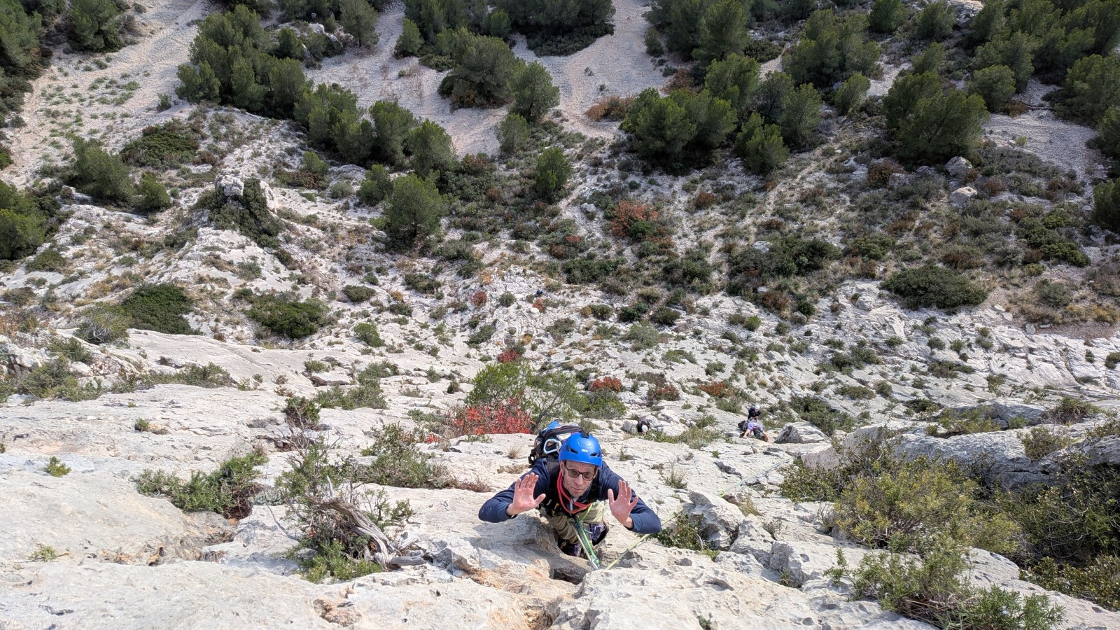 A notre gauche, Julien s’occupe de guide les cordées. Il enchaîne les deux premières longueurs (5c puis 6a) laissant la place à Roxane qui se perd un peu dans la longueur en 5c suivante malgré les indications claires « Vraiment à gauche ! » et oblige ses compagnons de cordée à traverser quelques buissons. Elle conserve le lead sur la longueur suivante et utilise ses compétences en TA pour improviser un relais mixte arbre/plaquette.