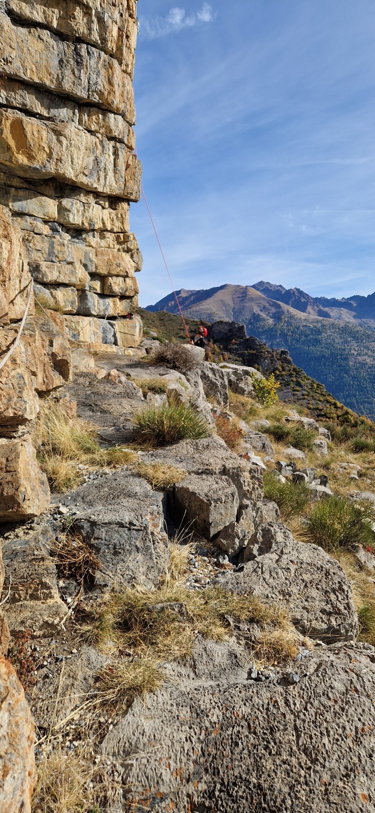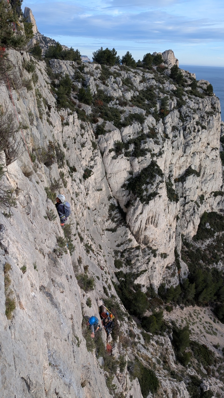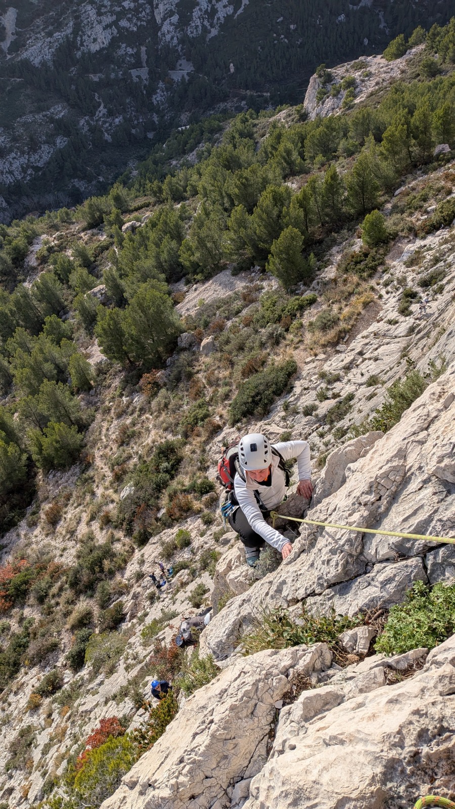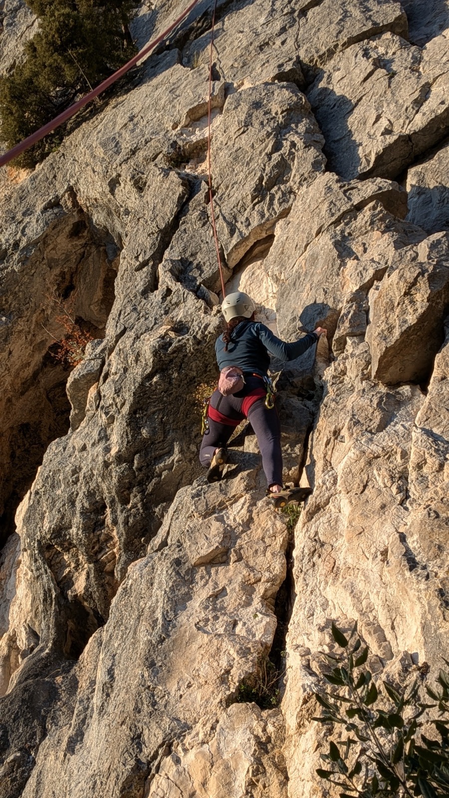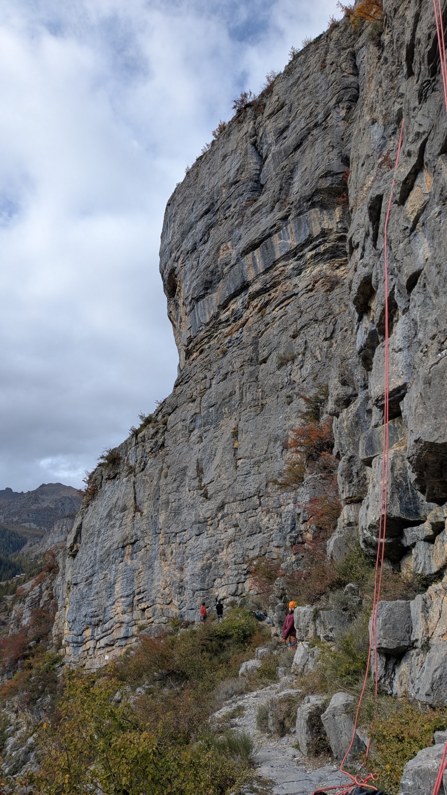 A notre gauche, Julien s’occupe de guide les cordées. Il enchaîne les deux premières longueurs (5c puis 6a) laissant la place à Roxane qui se perd un peu dans la longueur en 5c suivante malgré les indications claires « Vraiment à gauche ! » et oblige ses compagnons de cordée à traverser quelques buissons. Elle conserve le lead sur la longueur suivante et utilise ses compétences en TA pour improviser un relais mixte arbre/plaquette.