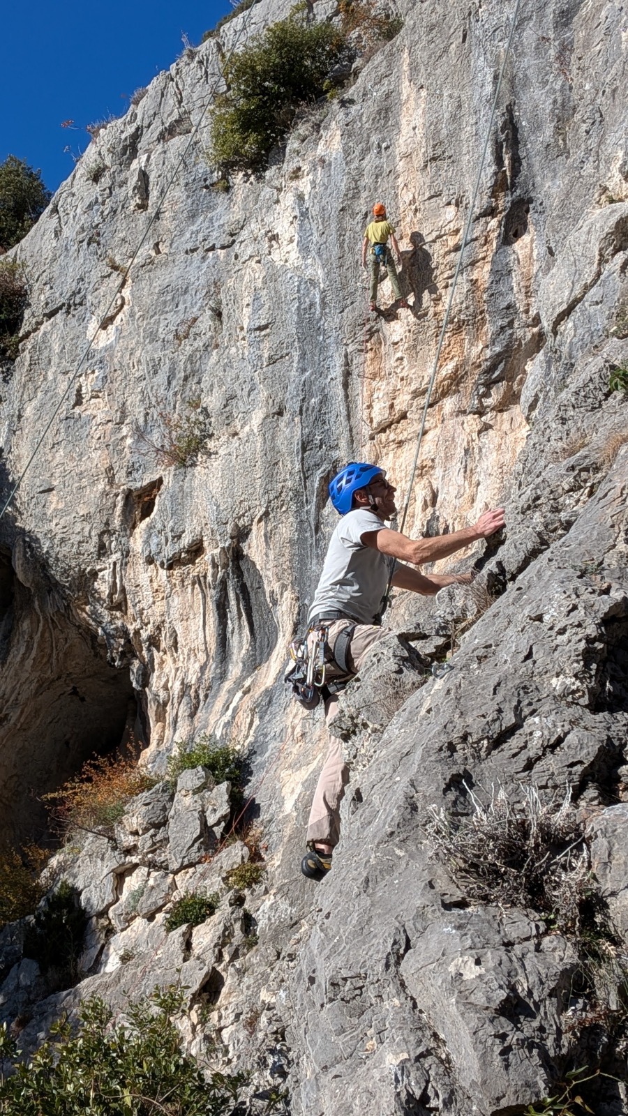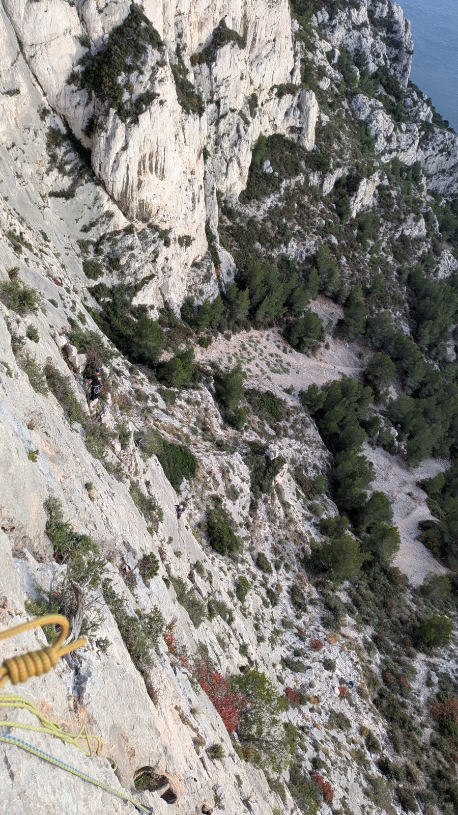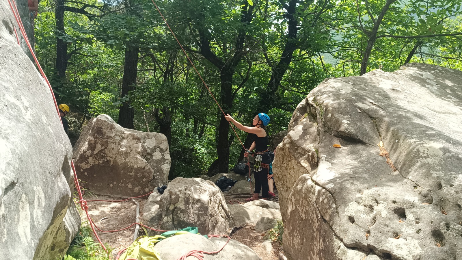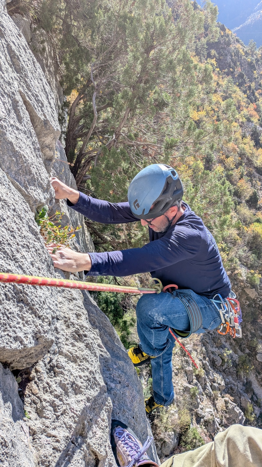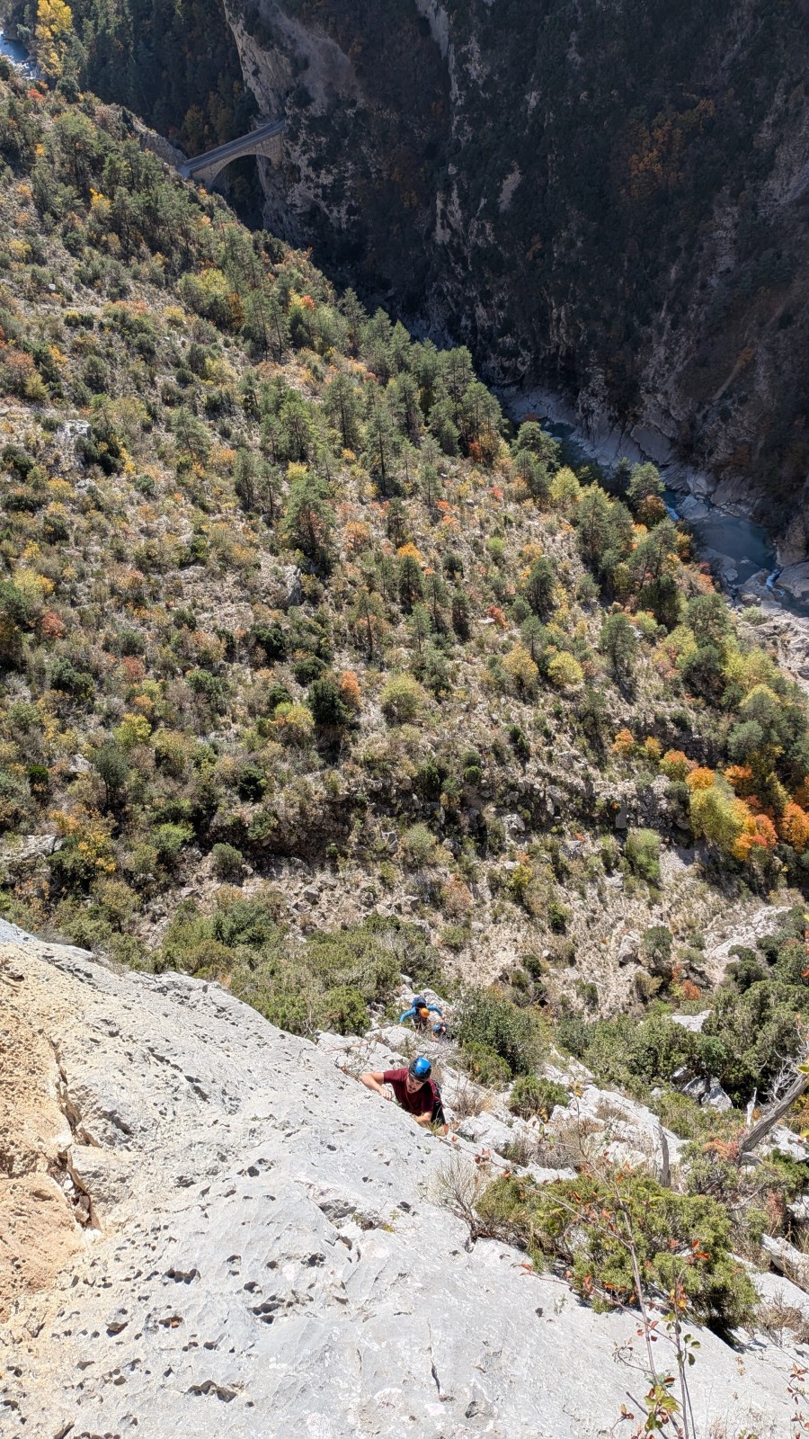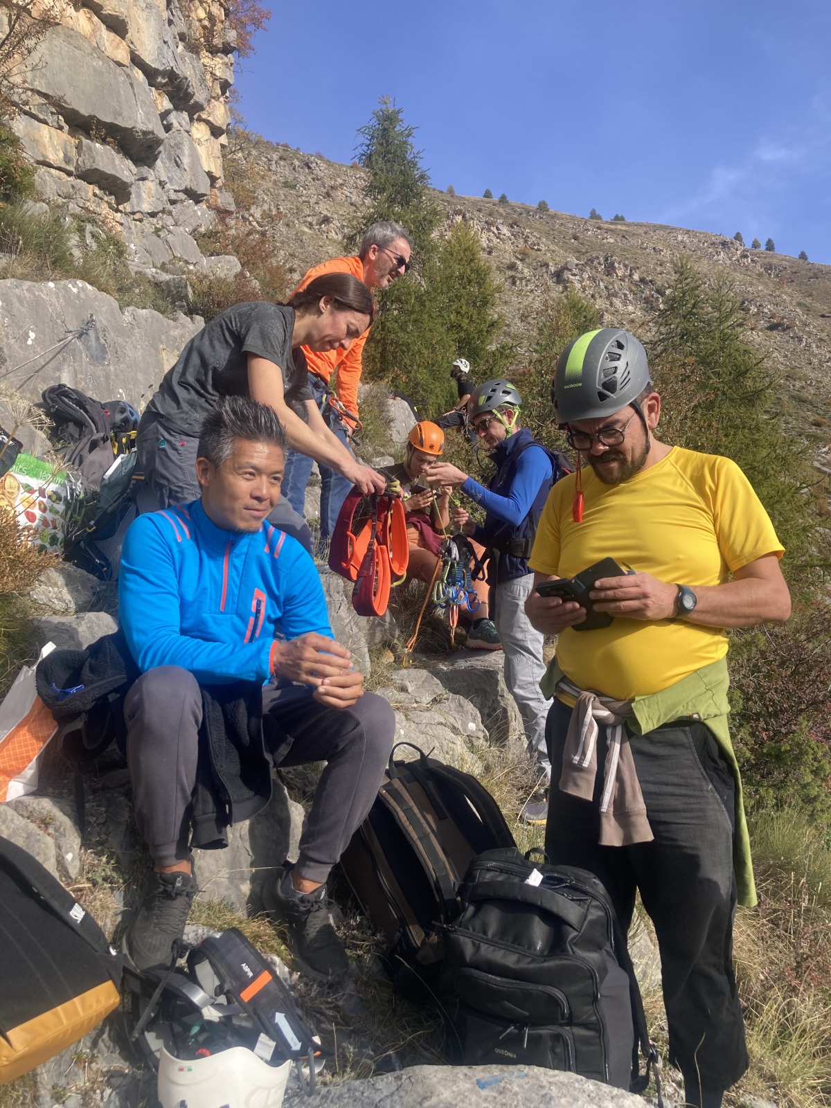 A notre gauche, Julien s’occupe de guide les cordées. Il enchaîne les deux premières longueurs (5c puis 6a) laissant la place à Roxane qui se perd un peu dans la longueur en 5c suivante malgré les indications claires « Vraiment à gauche ! » et oblige ses compagnons de cordée à traverser quelques buissons. Elle conserve le lead sur la longueur suivante et utilise ses compétences en TA pour improviser un relais mixte arbre/plaquette.