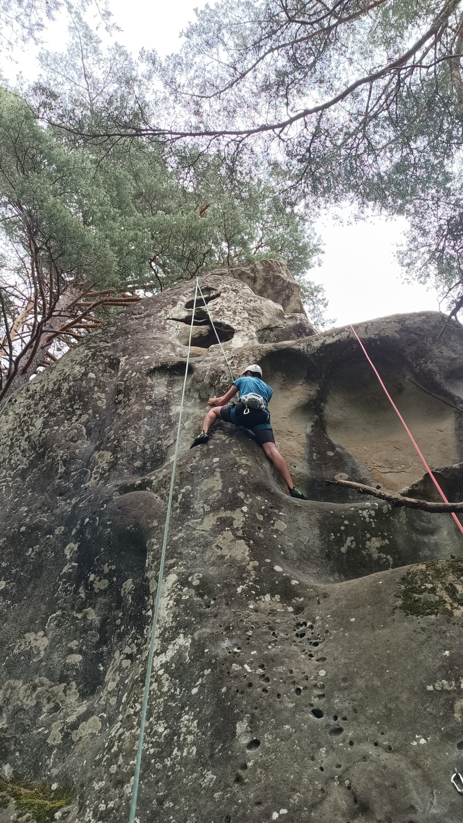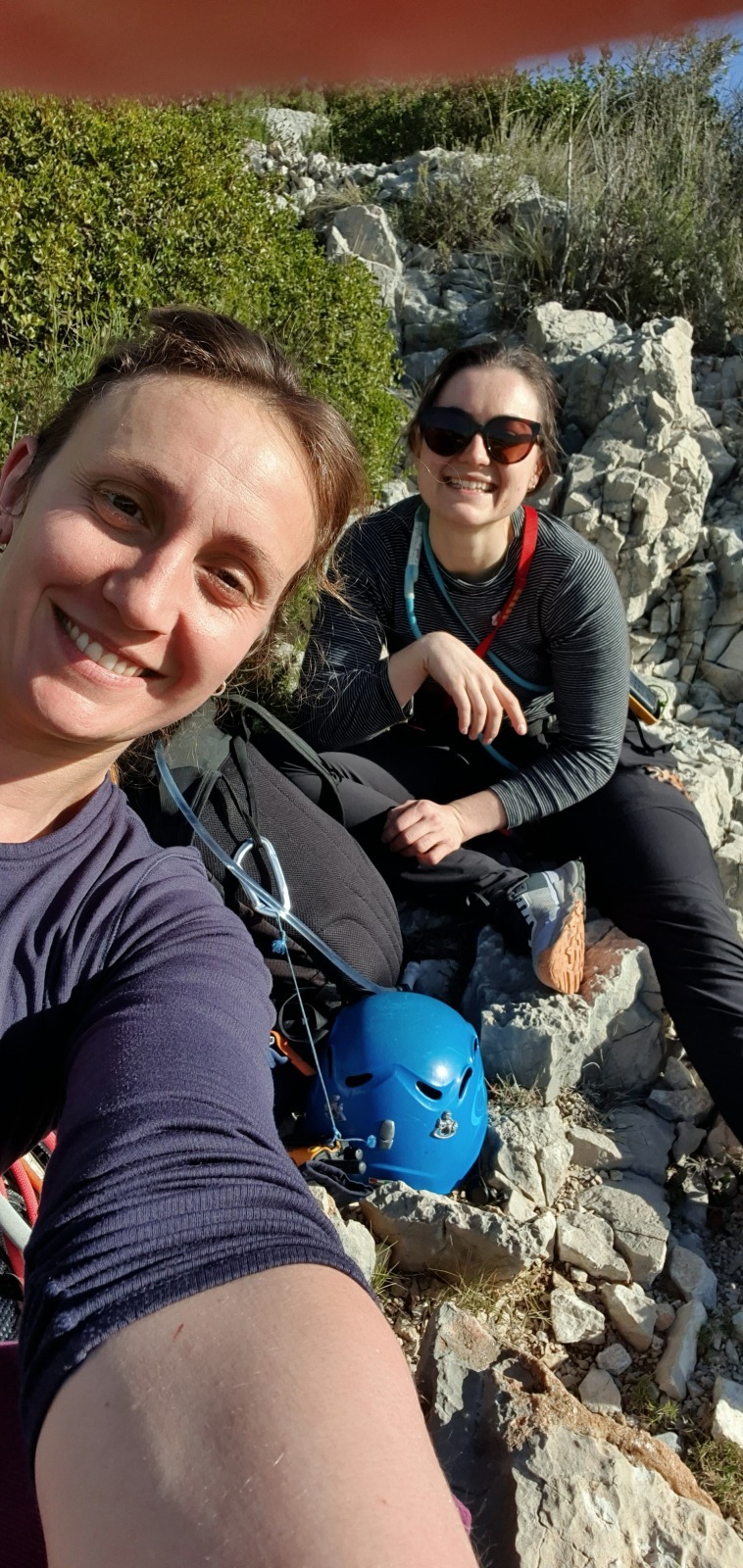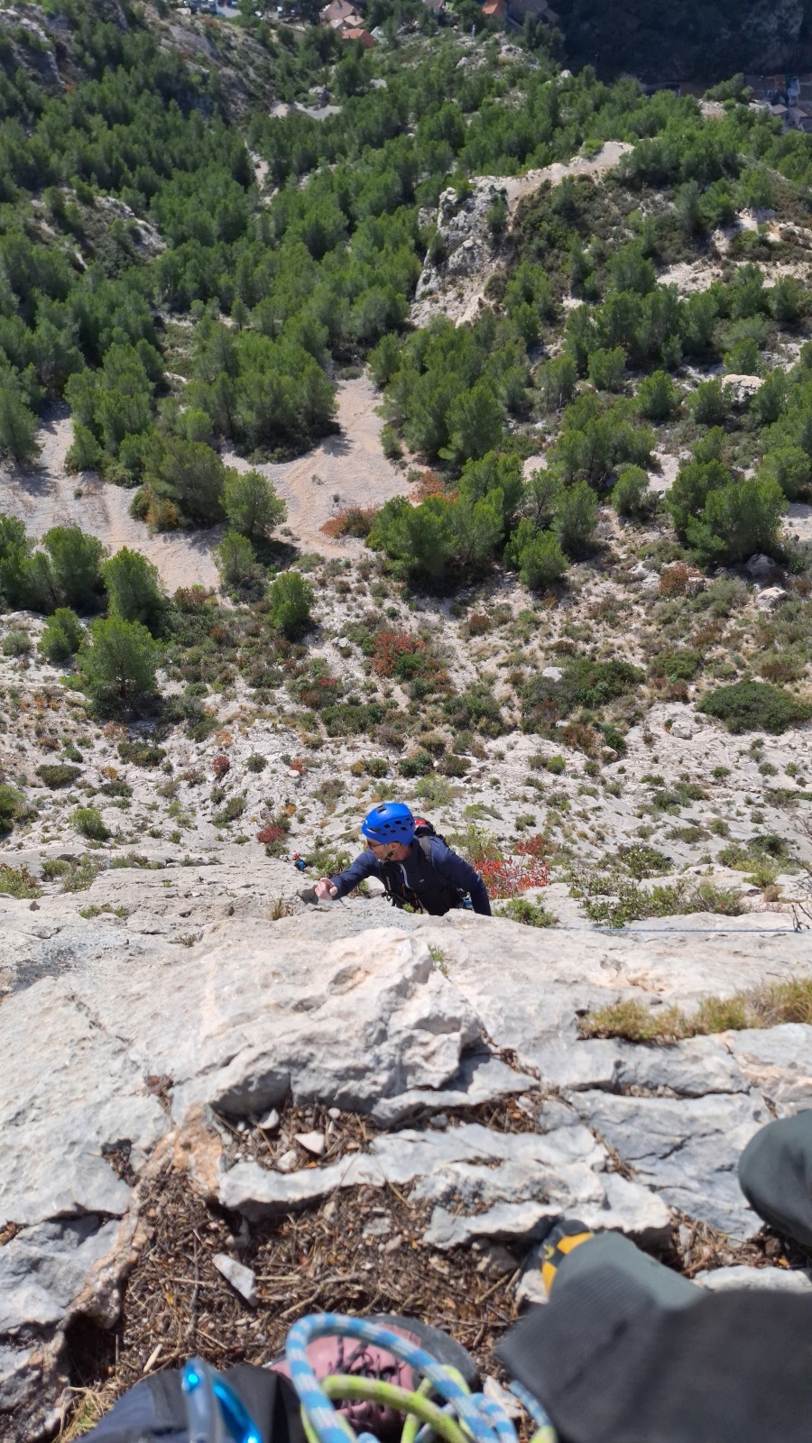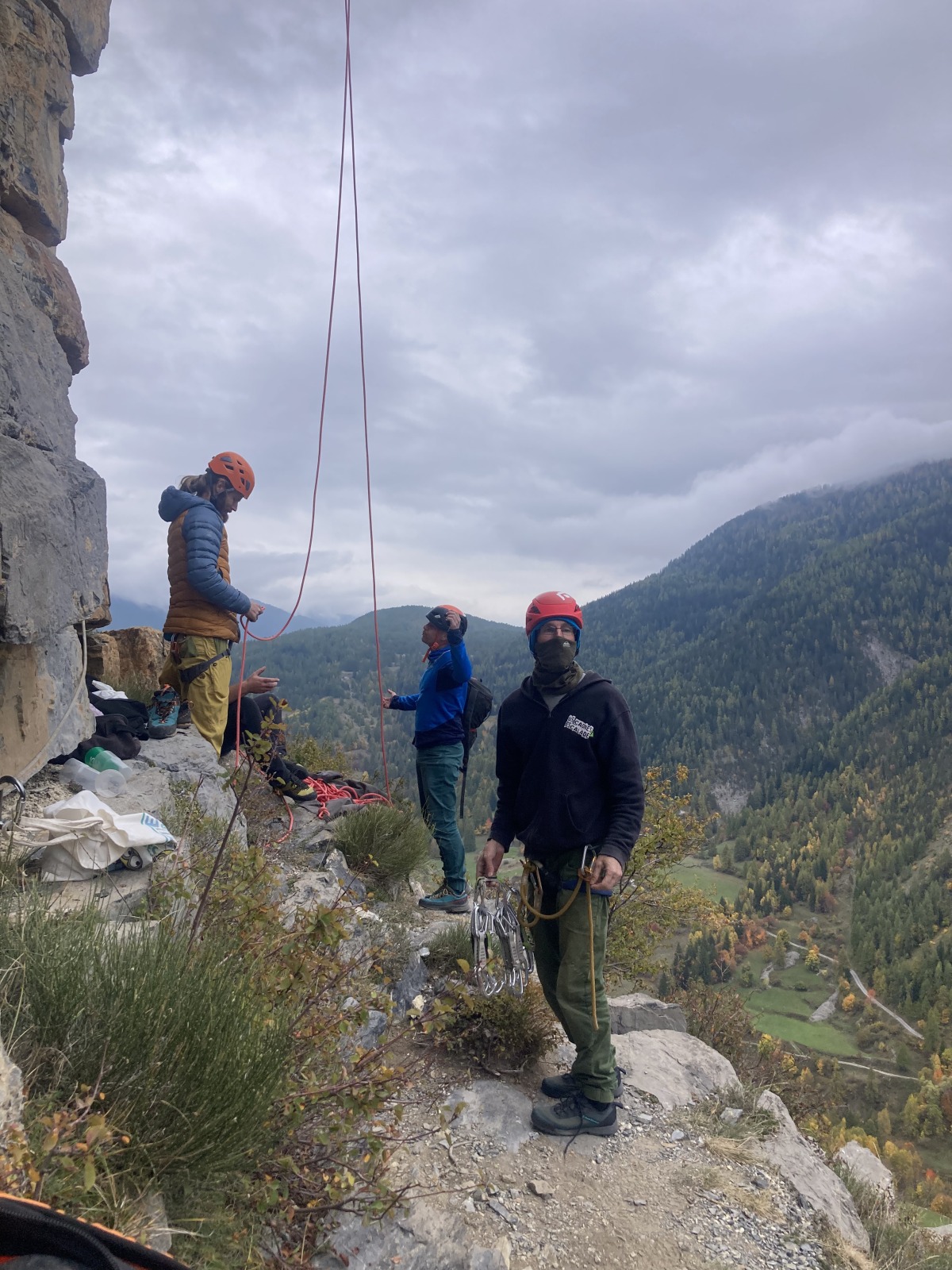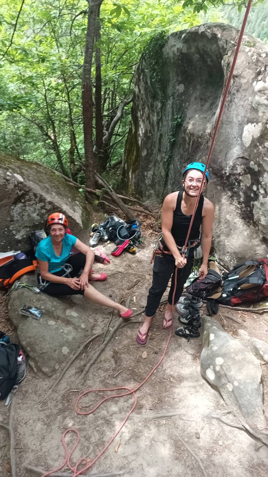 A notre gauche, Julien s’occupe de guide les cordées. Il enchaîne les deux premières longueurs (5c puis 6a) laissant la place à Roxane qui se perd un peu dans la longueur en 5c suivante malgré les indications claires « Vraiment à gauche ! » et oblige ses compagnons de cordée à traverser quelques buissons. Elle conserve le lead sur la longueur suivante et utilise ses compétences en TA pour improviser un relais mixte arbre/plaquette.