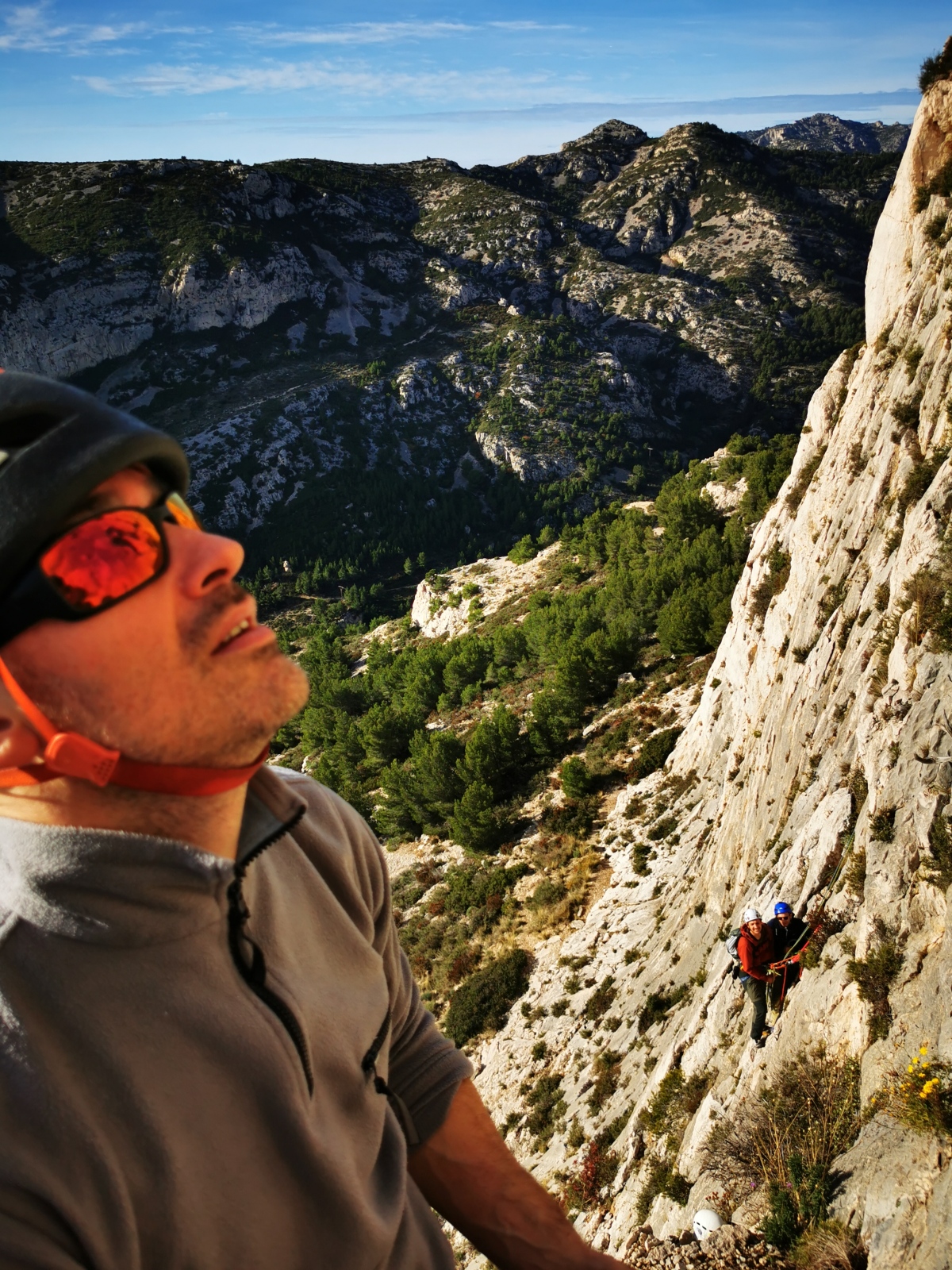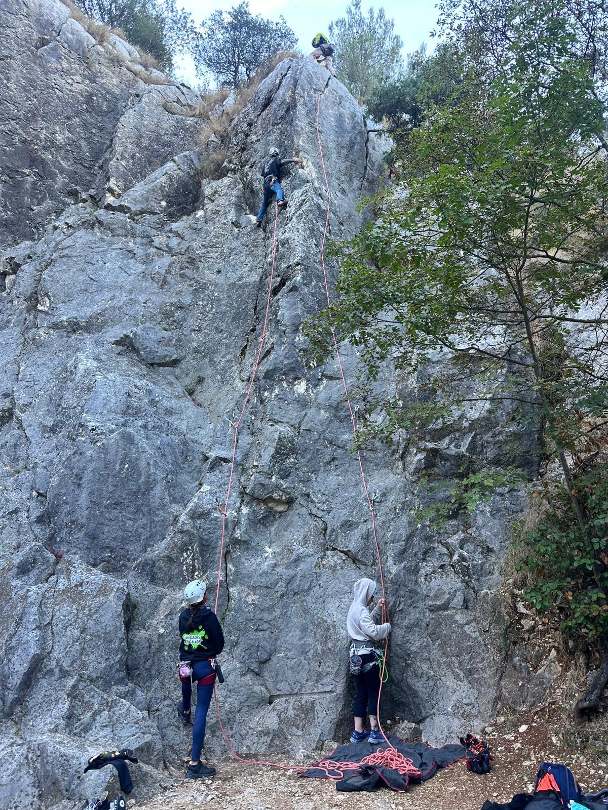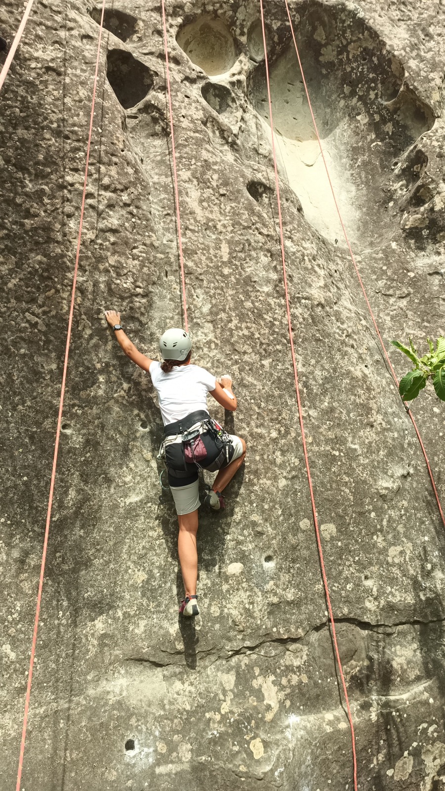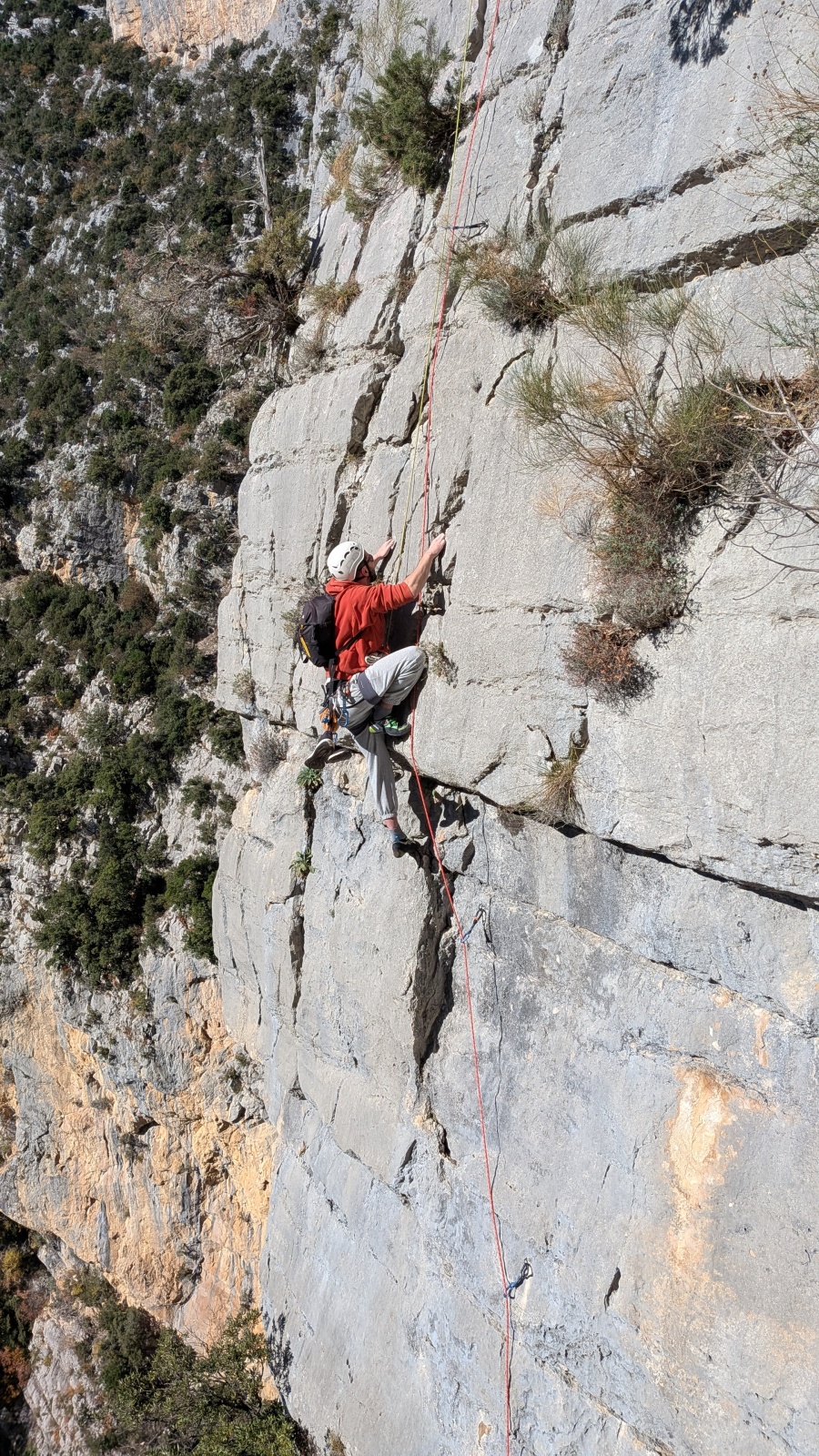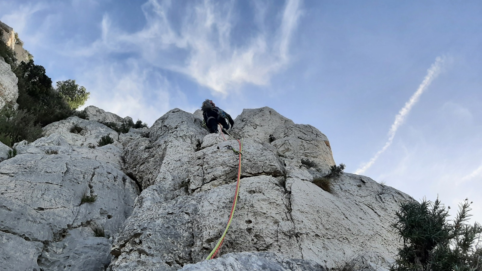 A notre gauche, Julien s’occupe de guide les cordées. Il enchaîne les deux premières longueurs (5c puis 6a) laissant la place à Roxane qui se perd un peu dans la longueur en 5c suivante malgré les indications claires « Vraiment à gauche ! » et oblige ses compagnons de cordée à traverser quelques buissons. Elle conserve le lead sur la longueur suivante et utilise ses compétences en TA pour improviser un relais mixte arbre/plaquette.