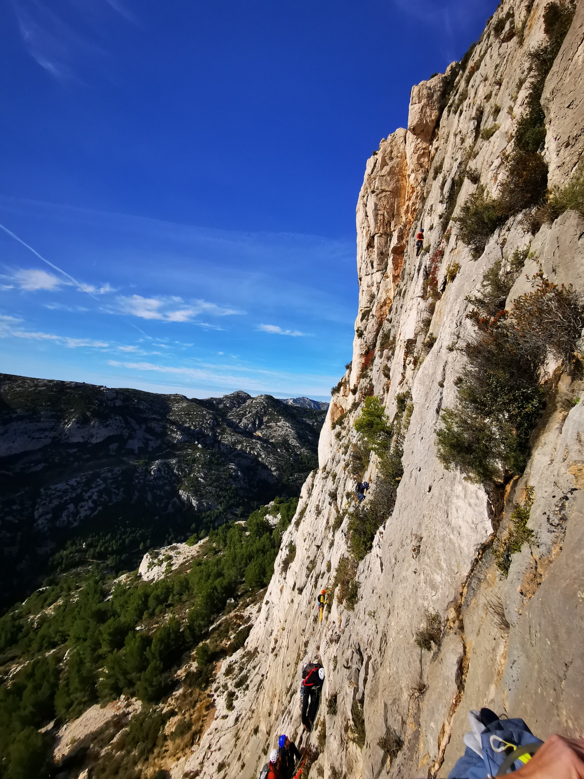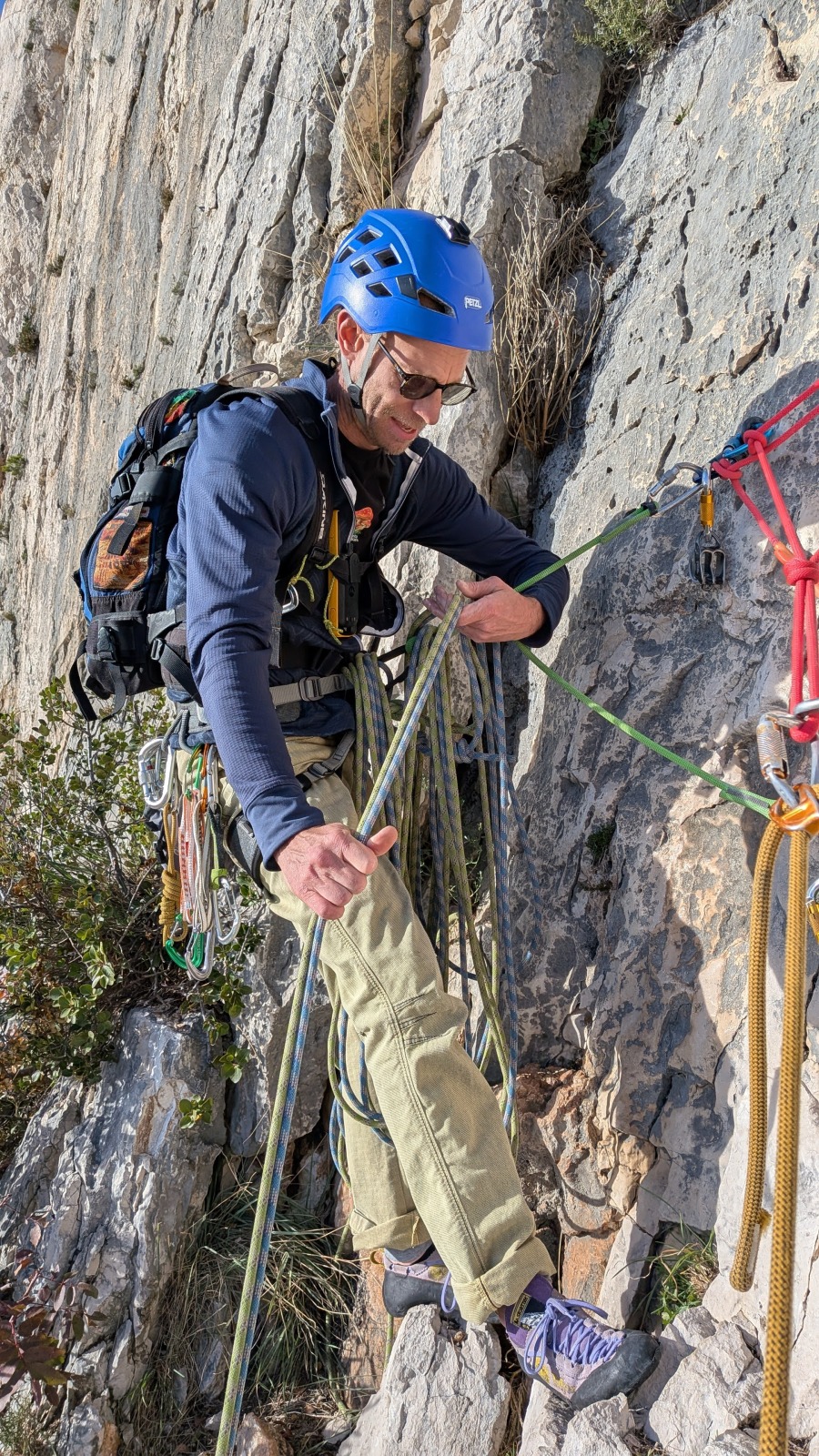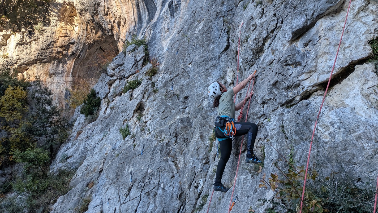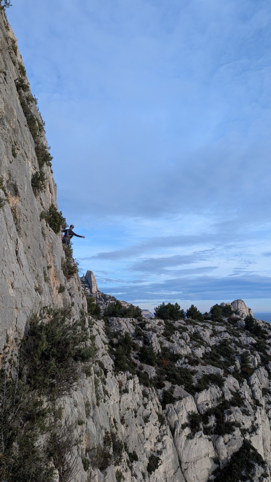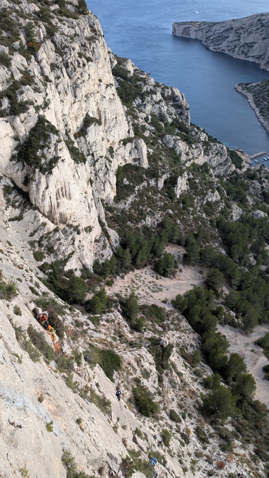 A notre gauche, Julien s’occupe de guide les cordées. Il enchaîne les deux premières longueurs (5c puis 6a) laissant la place à Roxane qui se perd un peu dans la longueur en 5c suivante malgré les indications claires « Vraiment à gauche ! » et oblige ses compagnons de cordée à traverser quelques buissons. Elle conserve le lead sur la longueur suivante et utilise ses compétences en TA pour improviser un relais mixte arbre/plaquette.