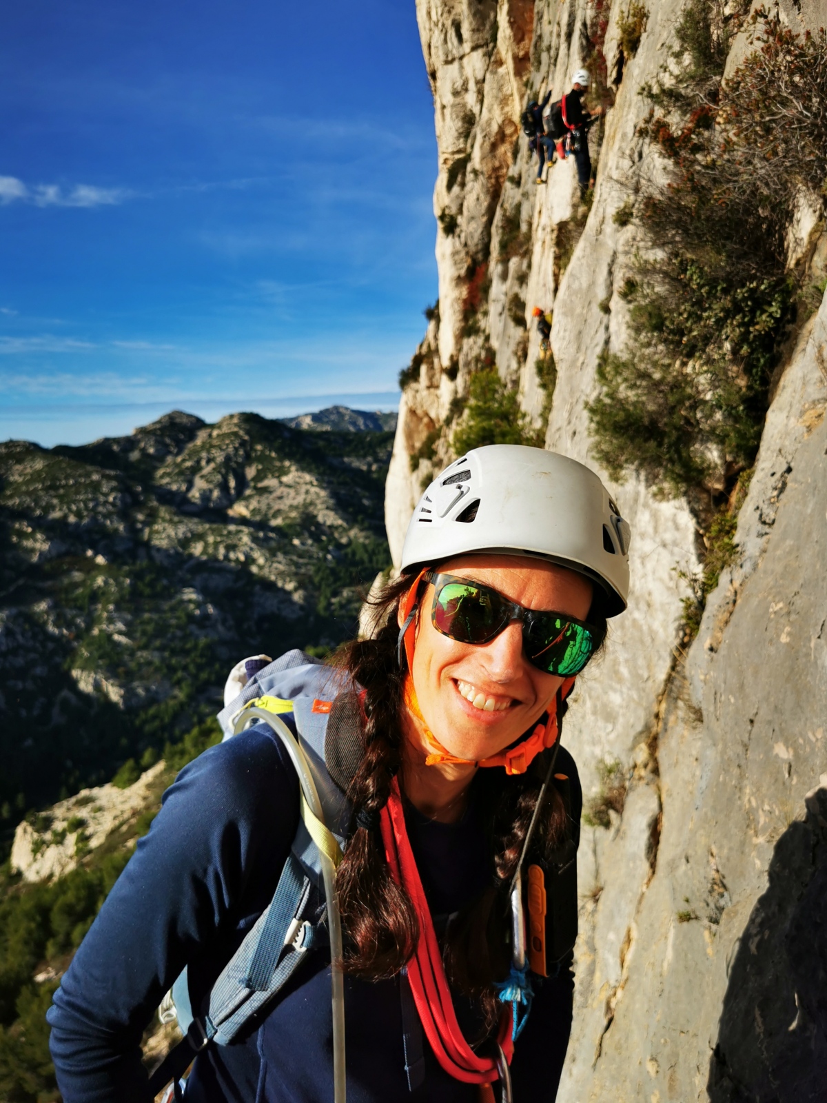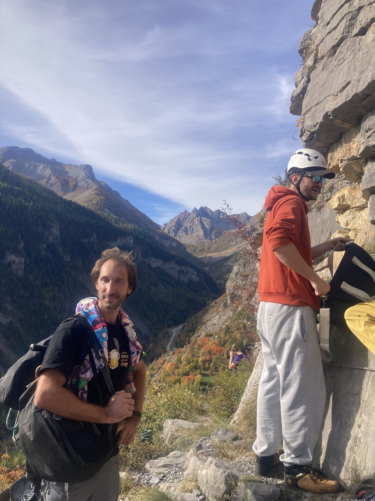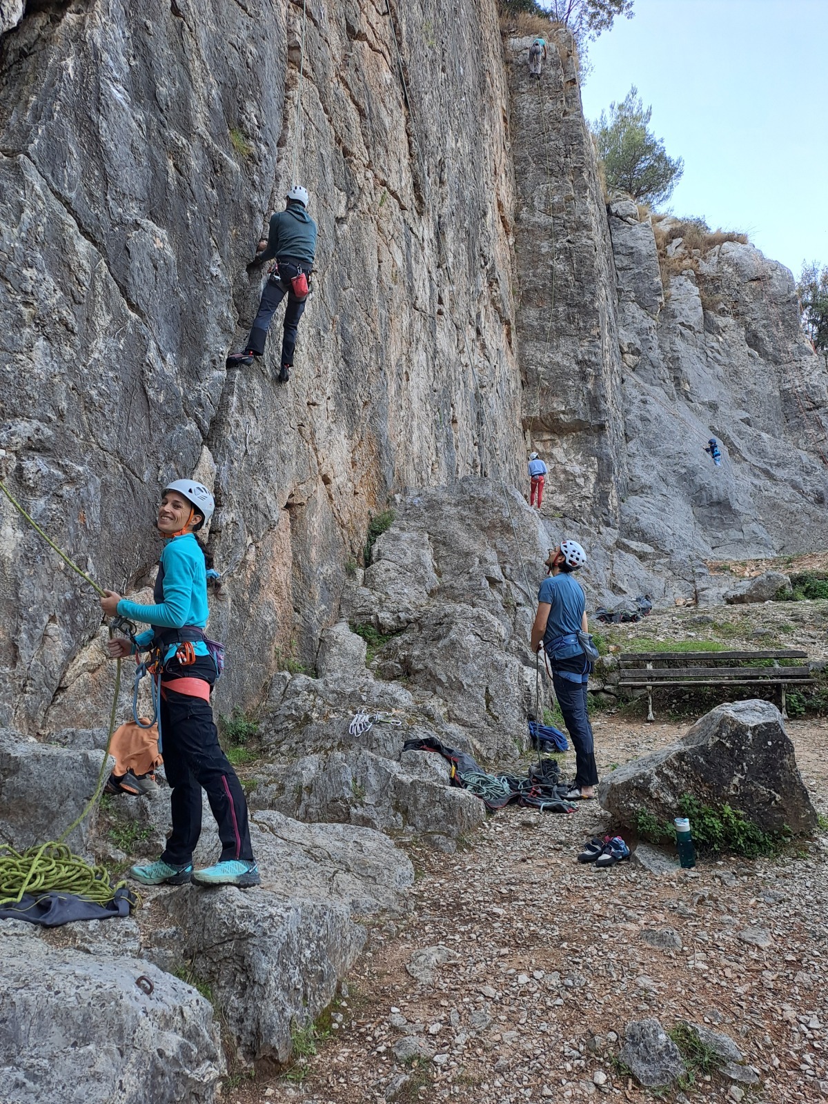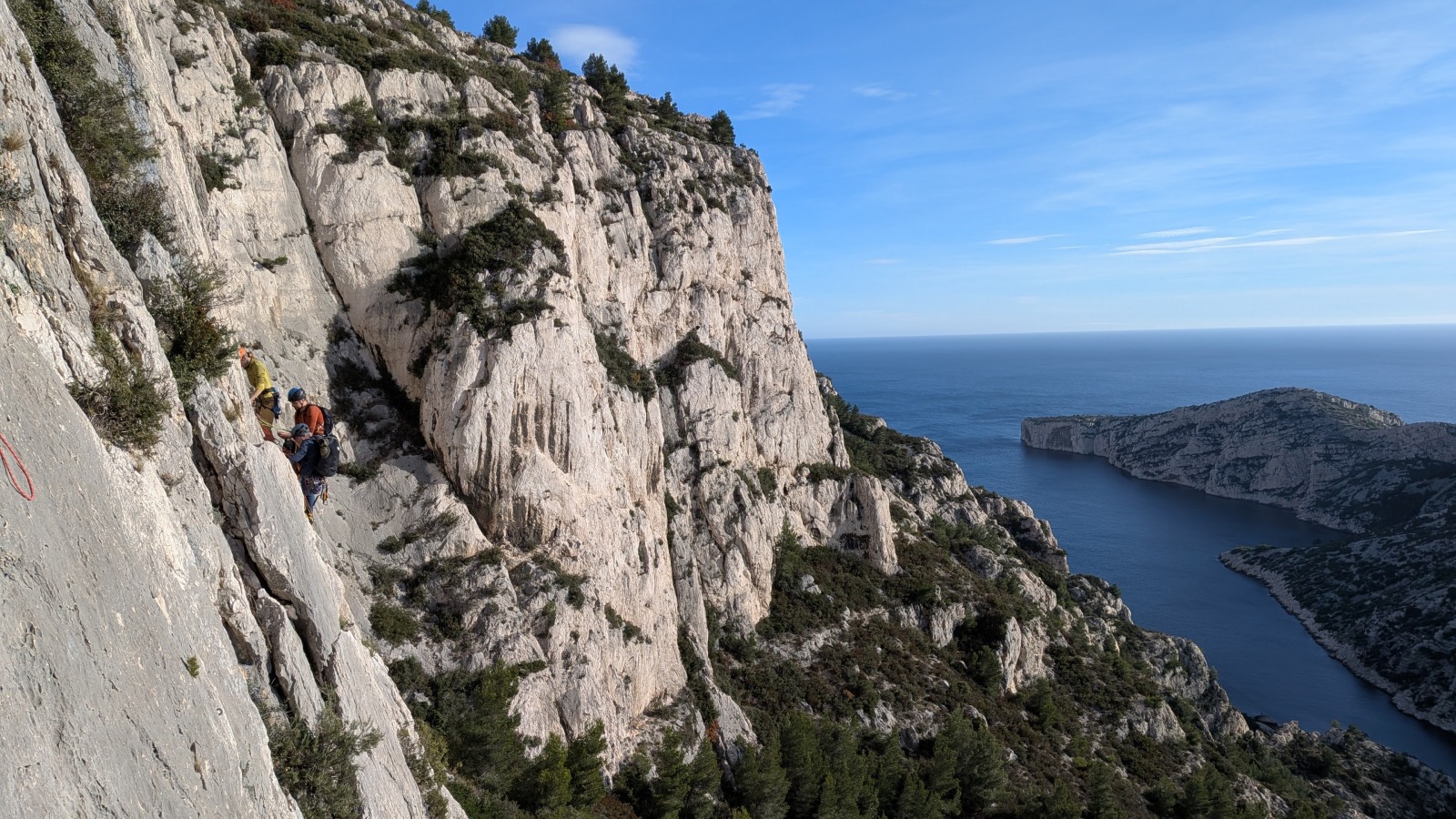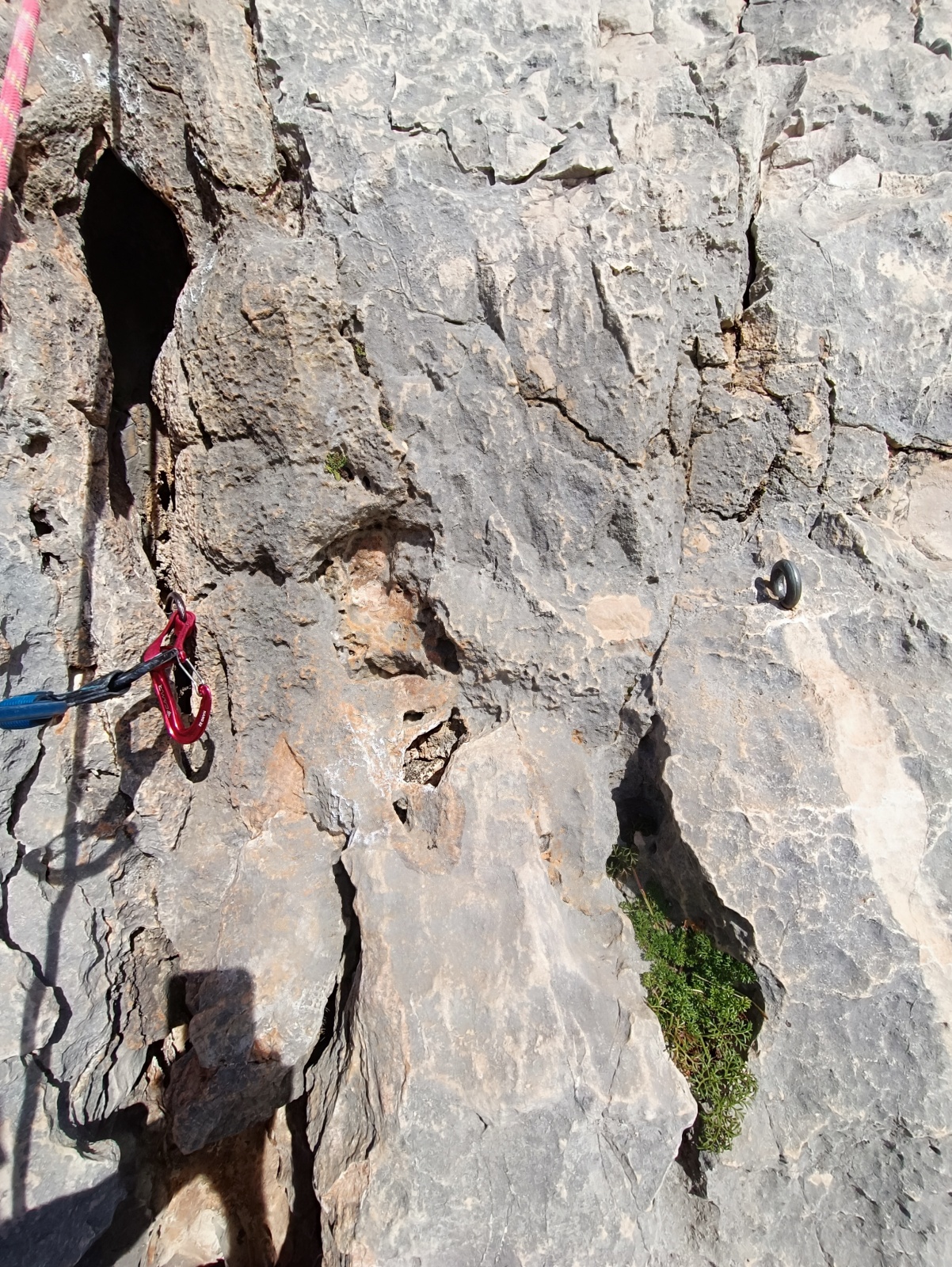 A notre gauche, Julien s’occupe de guide les cordées. Il enchaîne les deux premières longueurs (5c puis 6a) laissant la place à Roxane qui se perd un peu dans la longueur en 5c suivante malgré les indications claires « Vraiment à gauche ! » et oblige ses compagnons de cordée à traverser quelques buissons. Elle conserve le lead sur la longueur suivante et utilise ses compétences en TA pour improviser un relais mixte arbre/plaquette.