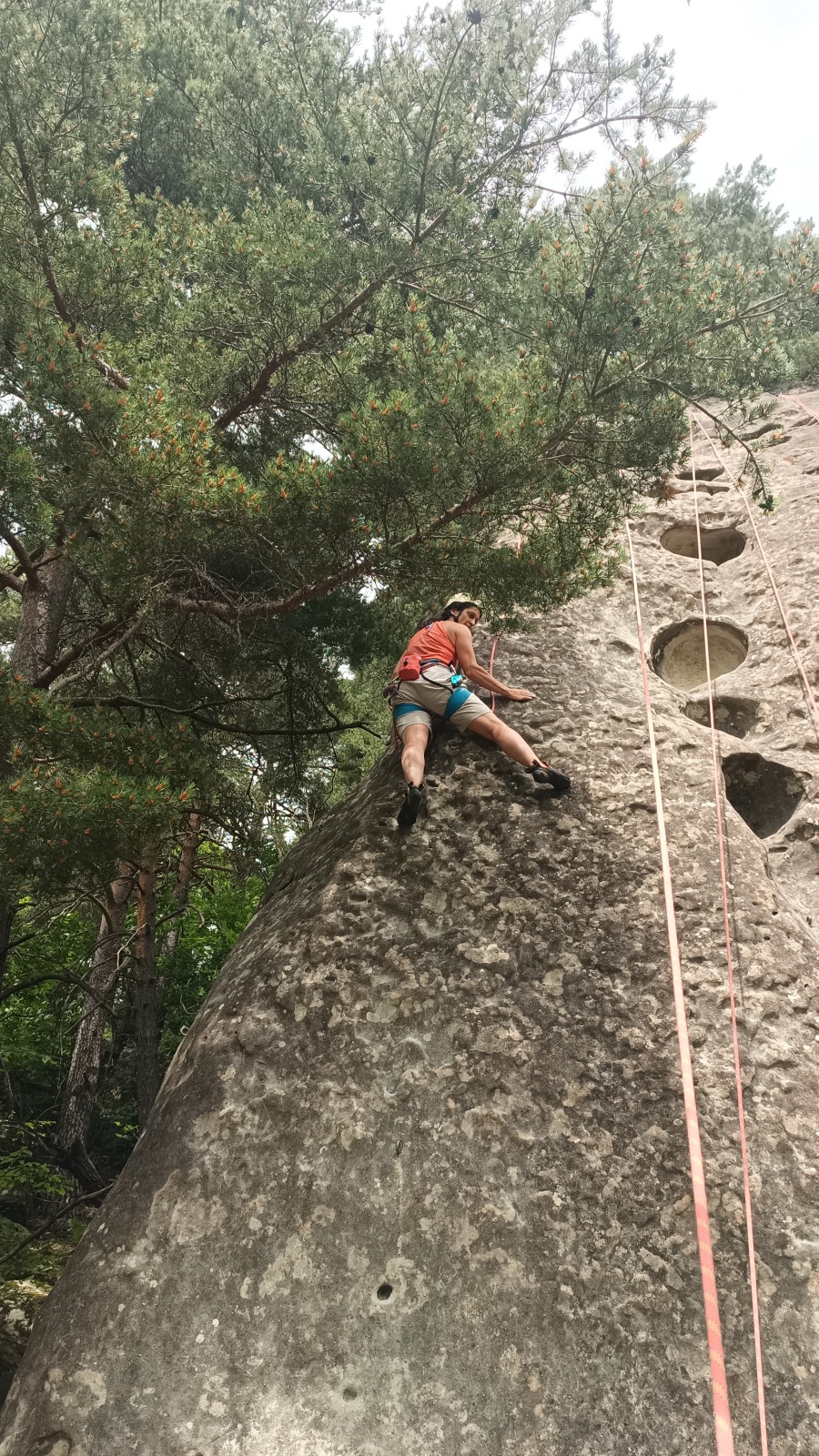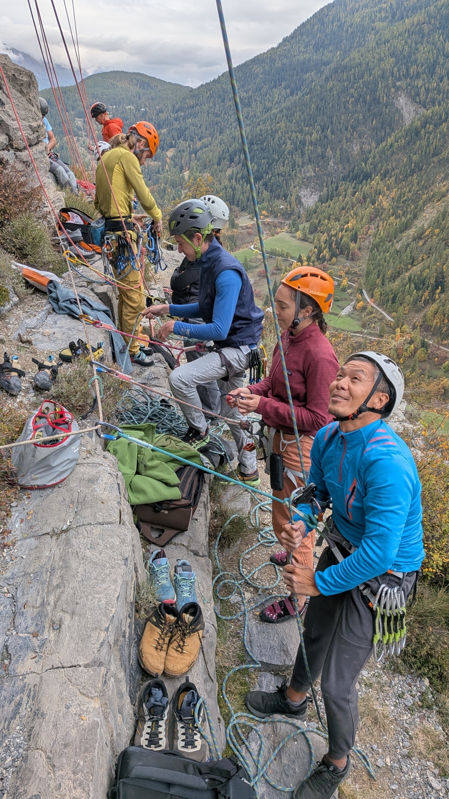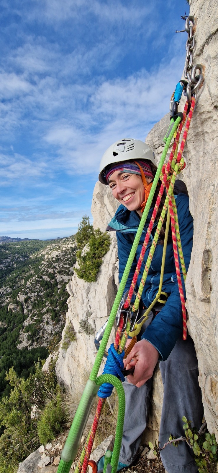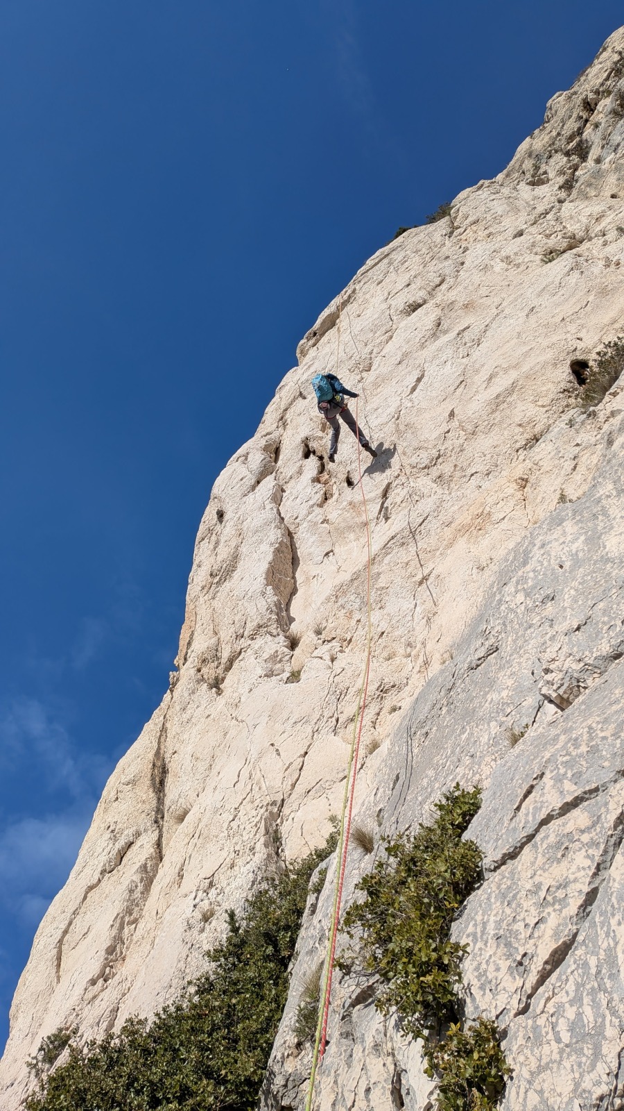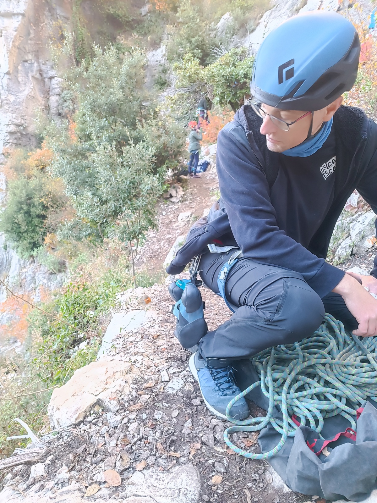 A notre gauche, Julien s’occupe de guide les cordées. Il enchaîne les deux premières longueurs (5c puis 6a) laissant la place à Roxane qui se perd un peu dans la longueur en 5c suivante malgré les indications claires « Vraiment à gauche ! » et oblige ses compagnons de cordée à traverser quelques buissons. Elle conserve le lead sur la longueur suivante et utilise ses compétences en TA pour improviser un relais mixte arbre/plaquette.