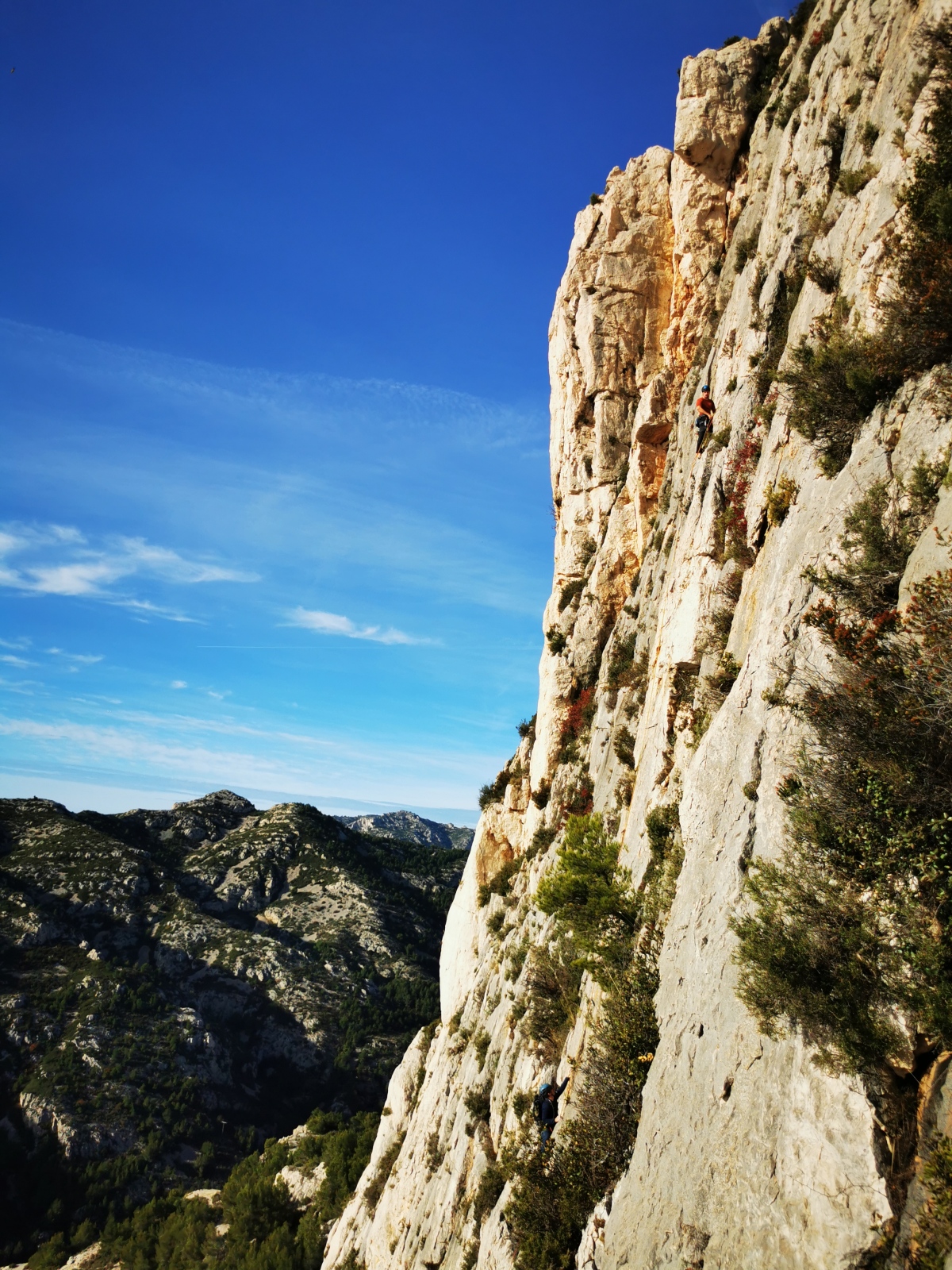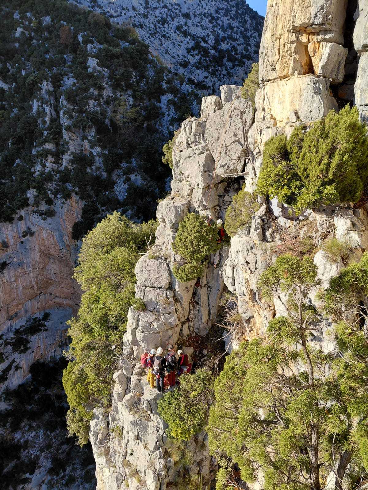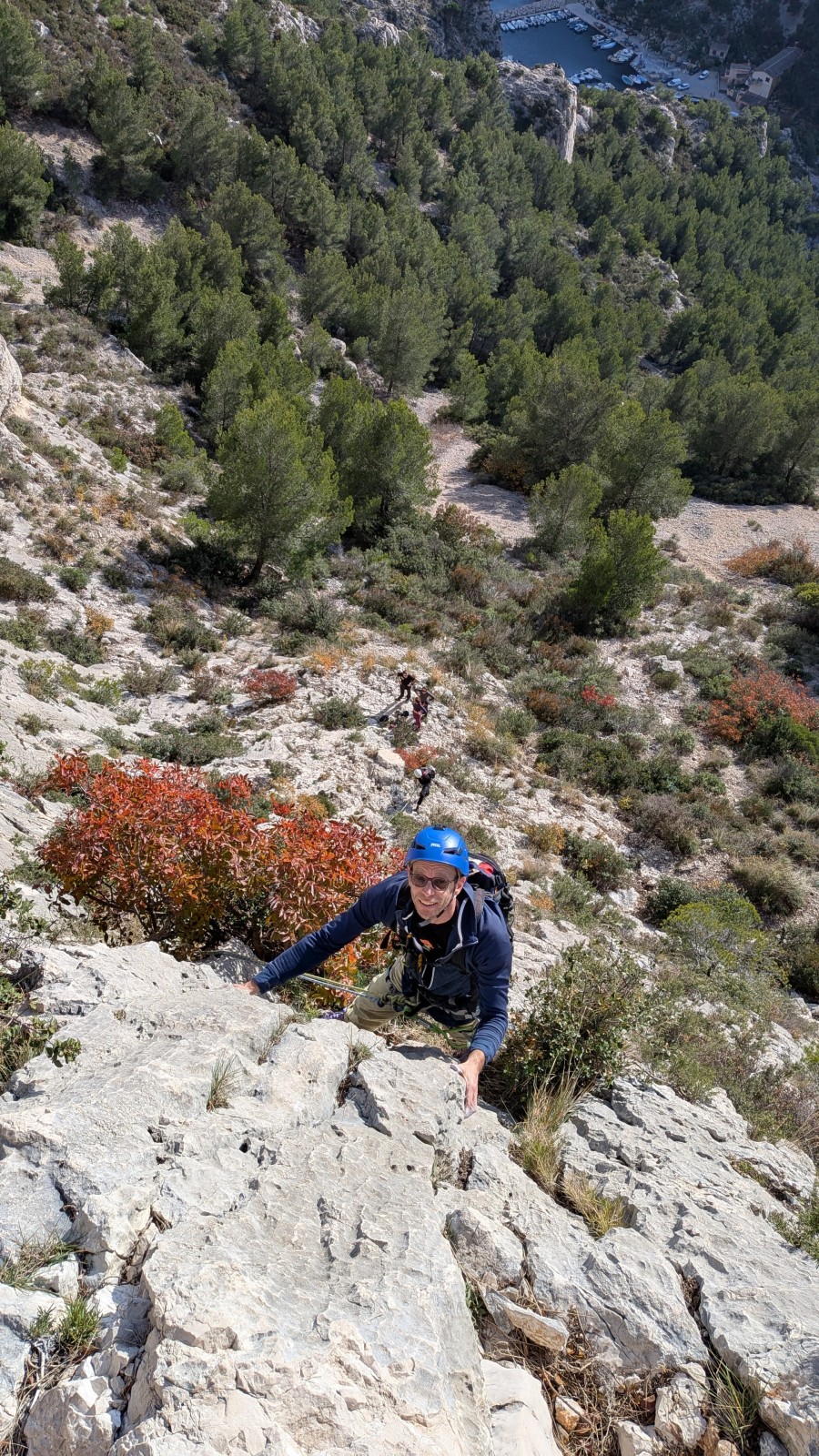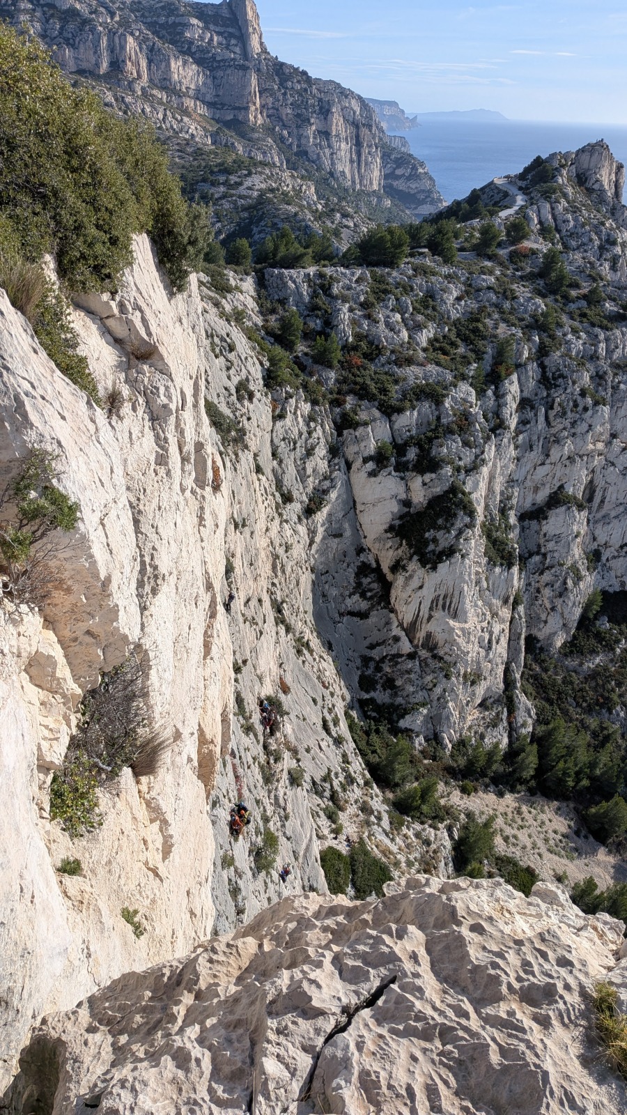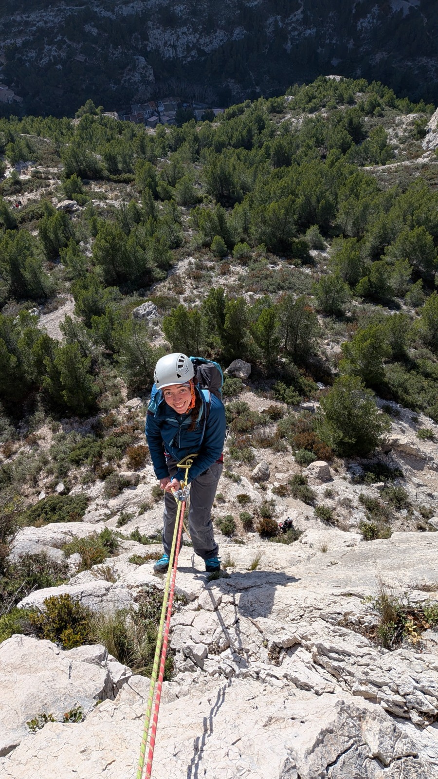 A notre gauche, Julien s’occupe de guide les cordées. Il enchaîne les deux premières longueurs (5c puis 6a) laissant la place à Roxane qui se perd un peu dans la longueur en 5c suivante malgré les indications claires « Vraiment à gauche ! » et oblige ses compagnons de cordée à traverser quelques buissons. Elle conserve le lead sur la longueur suivante et utilise ses compétences en TA pour improviser un relais mixte arbre/plaquette.