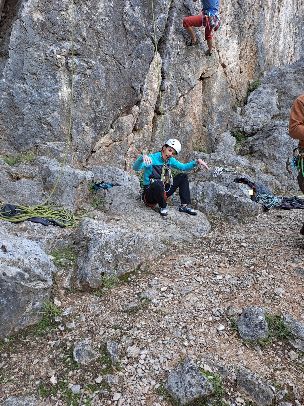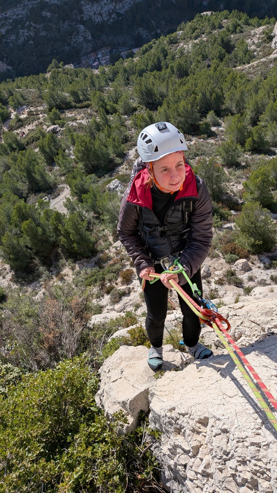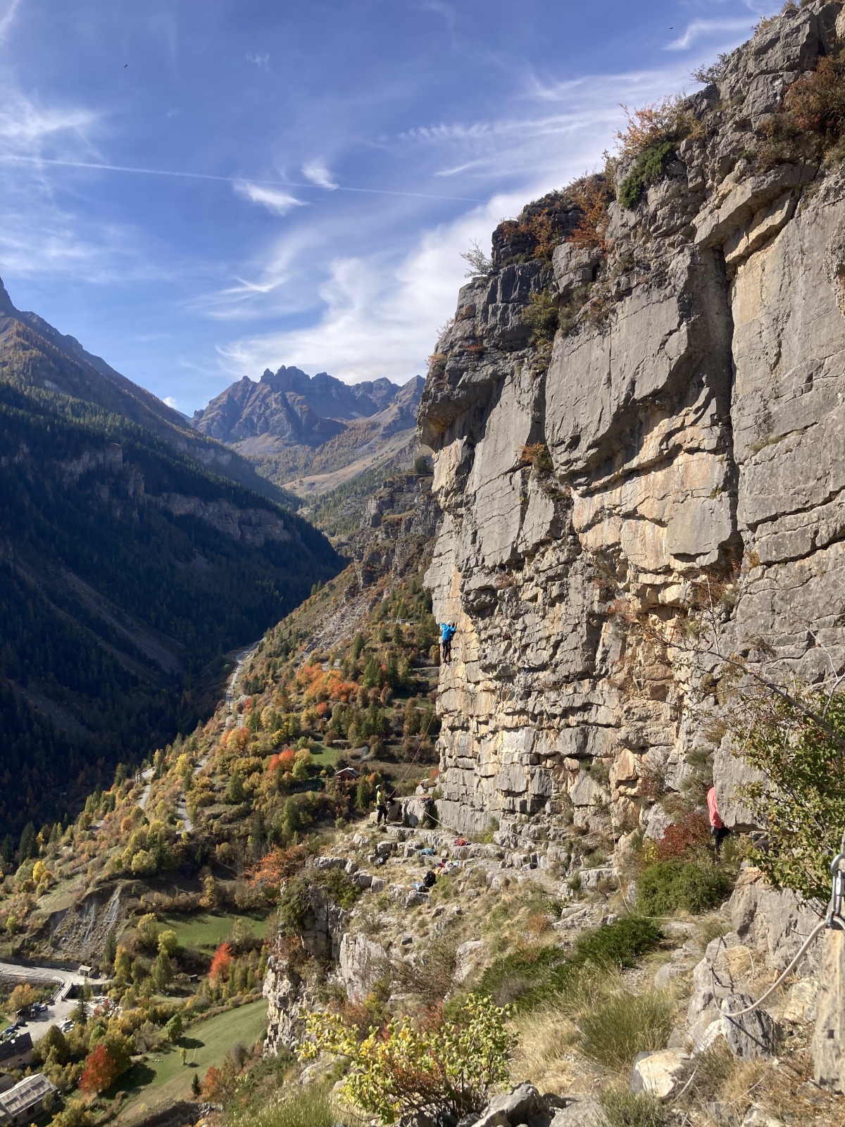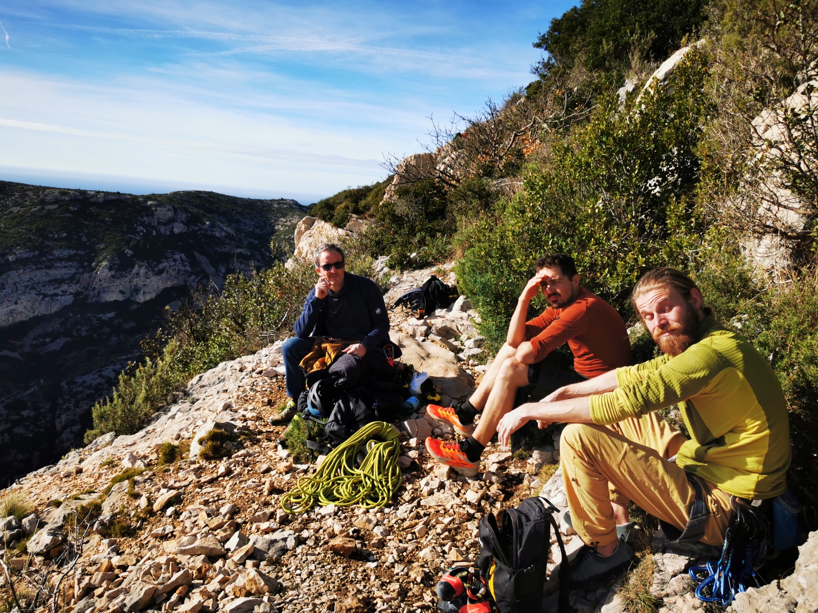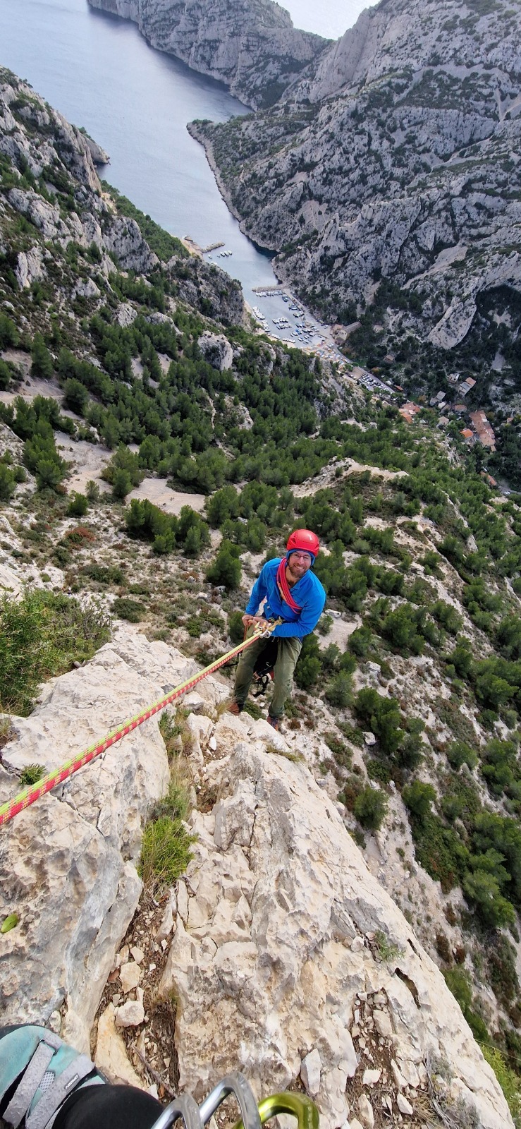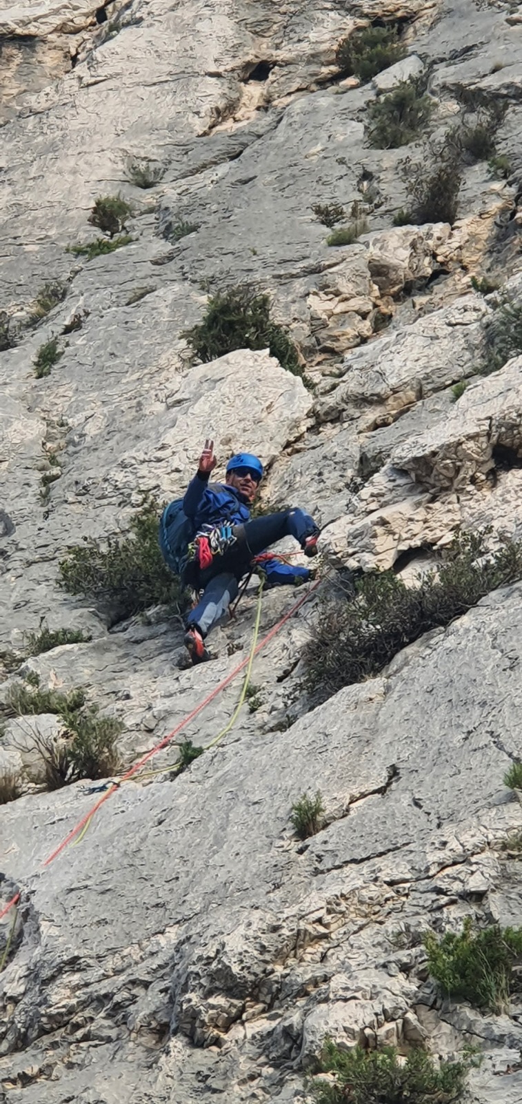 A notre gauche, Julien s’occupe de guide les cordées. Il enchaîne les deux premières longueurs (5c puis 6a) laissant la place à Roxane qui se perd un peu dans la longueur en 5c suivante malgré les indications claires « Vraiment à gauche ! » et oblige ses compagnons de cordée à traverser quelques buissons. Elle conserve le lead sur la longueur suivante et utilise ses compétences en TA pour improviser un relais mixte arbre/plaquette.