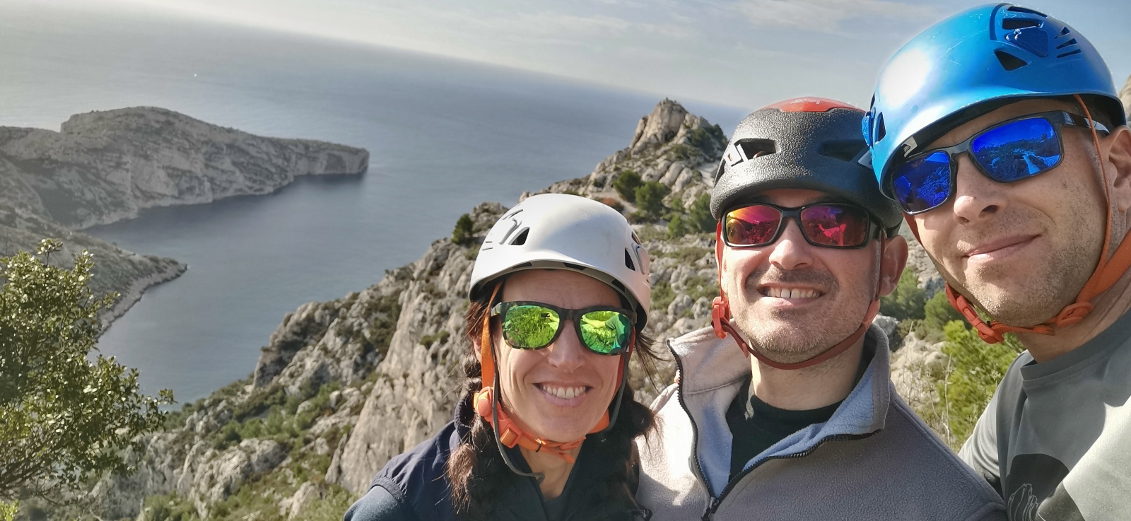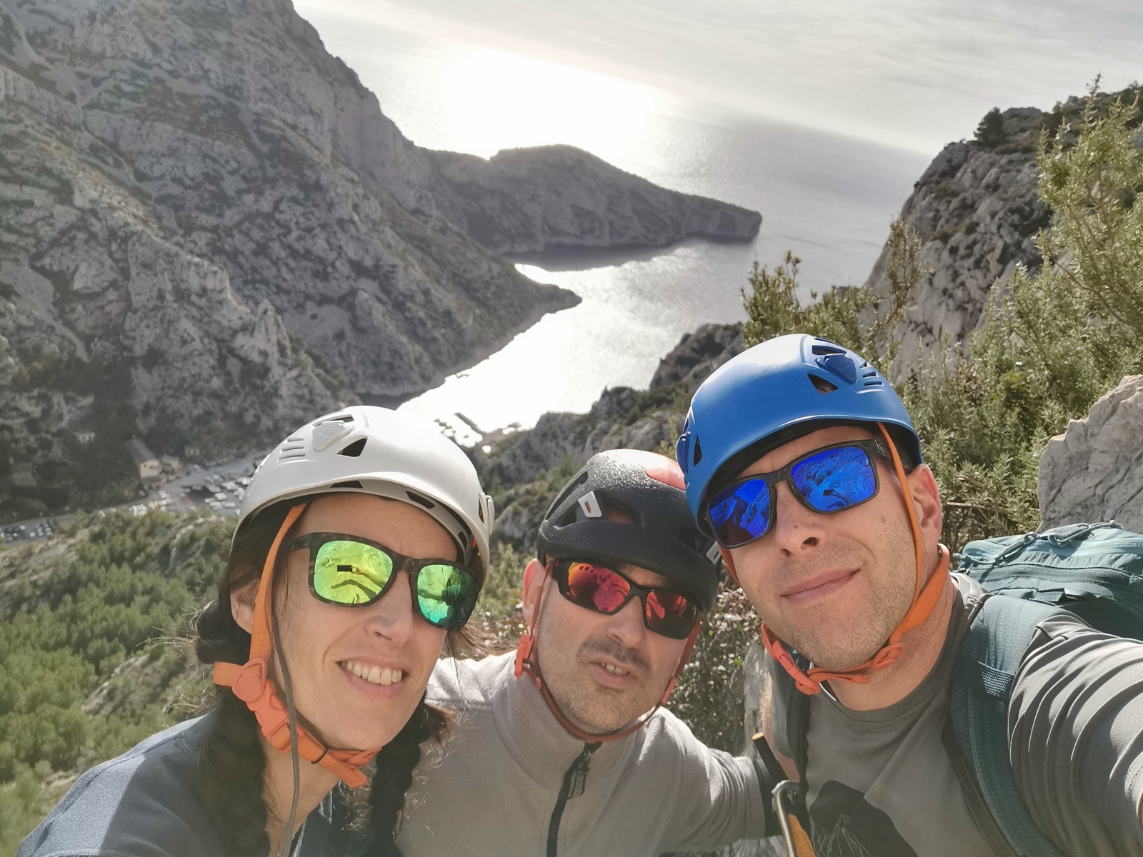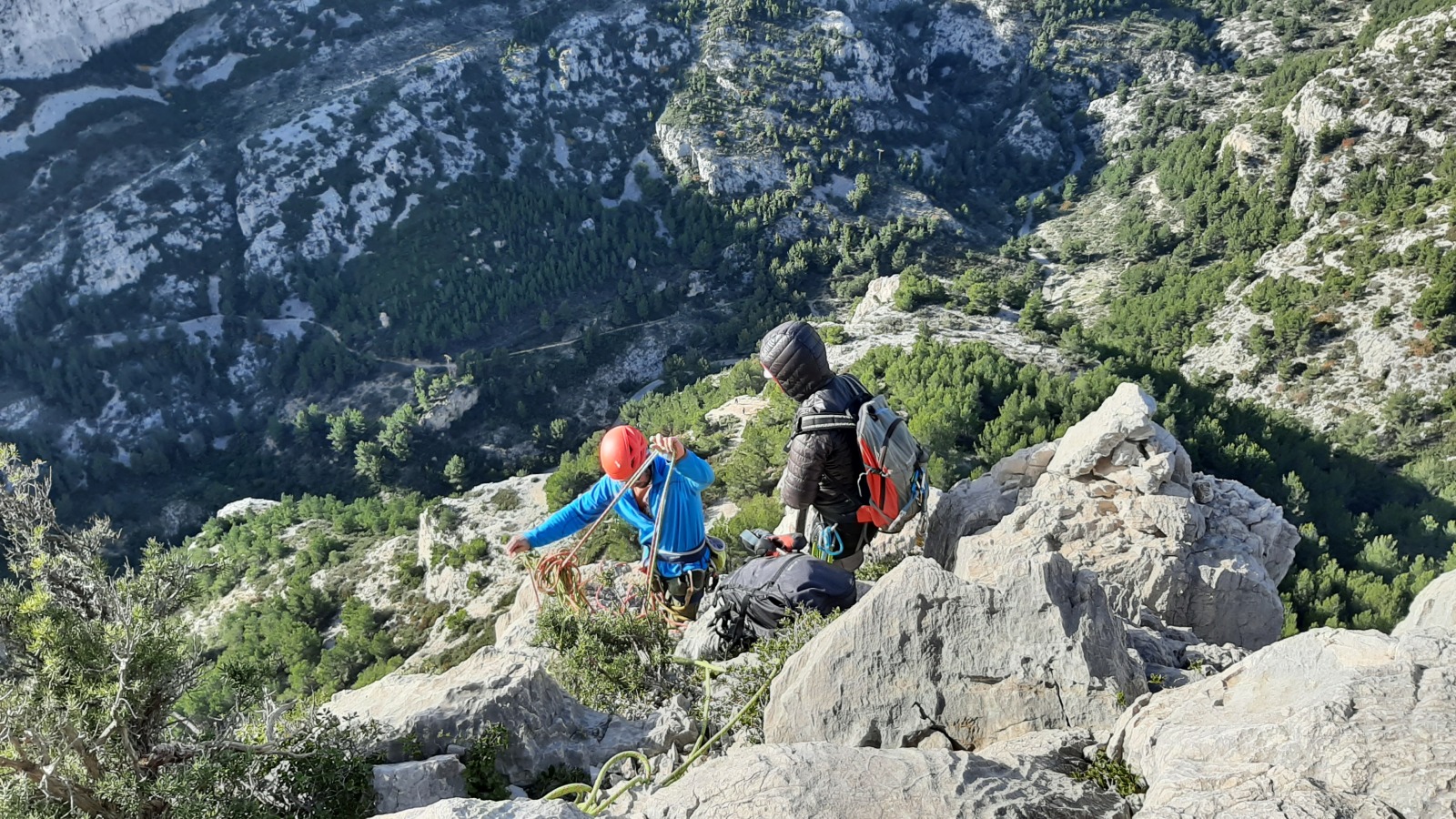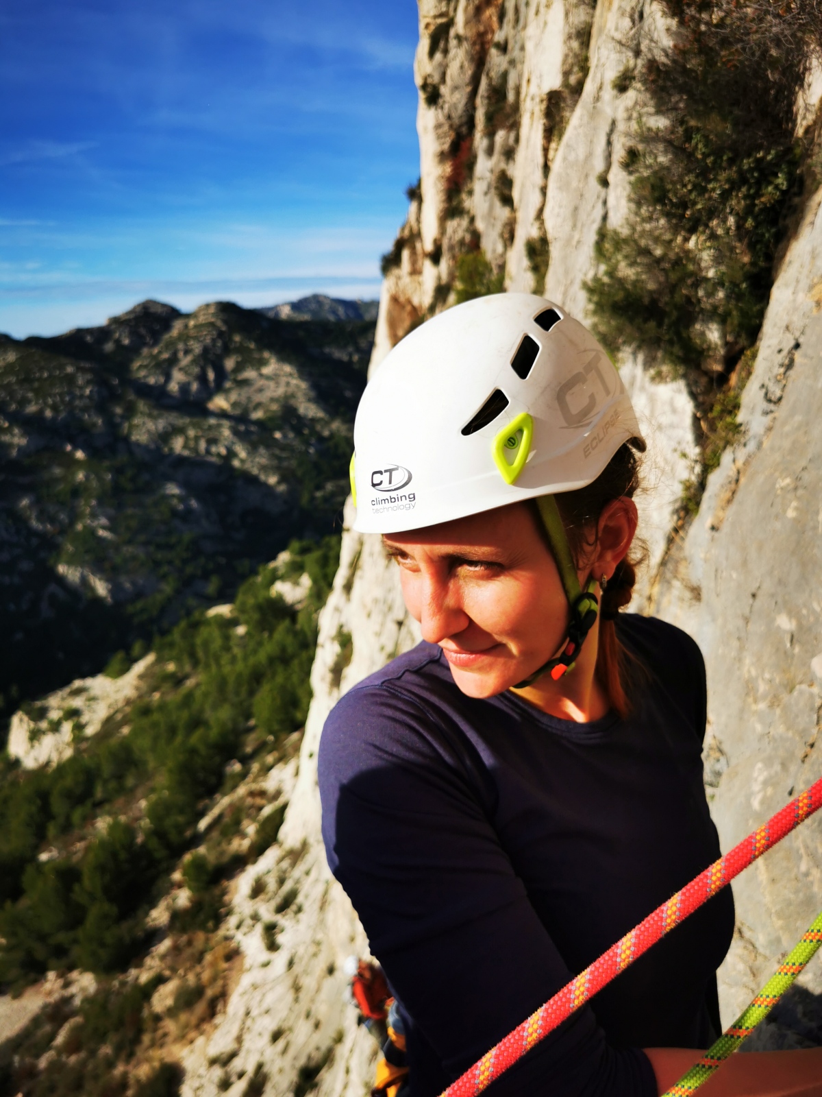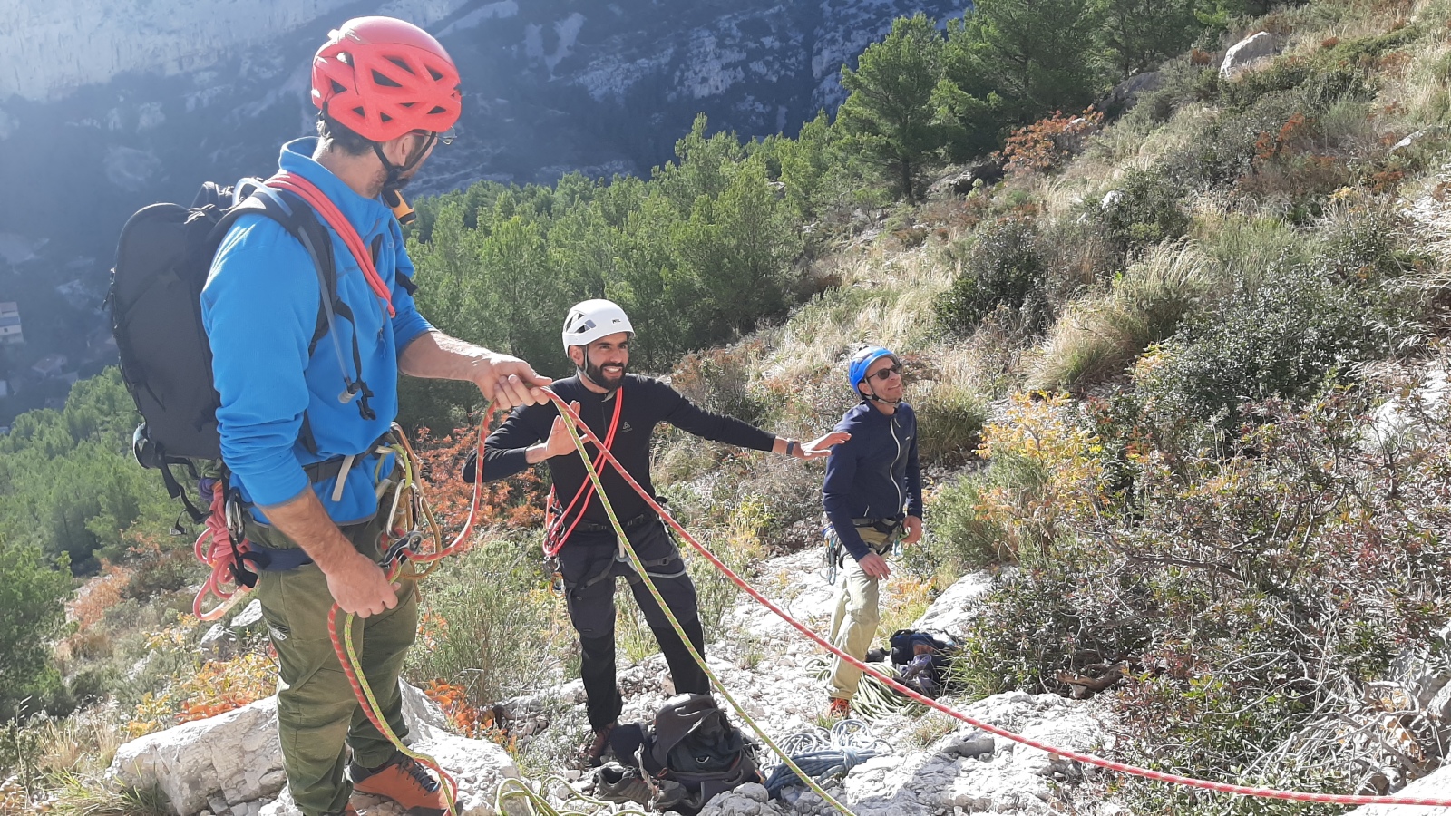 A notre gauche, Julien s’occupe de guide les cordées. Il enchaîne les deux premières longueurs (5c puis 6a) laissant la place à Roxane qui se perd un peu dans la longueur en 5c suivante malgré les indications claires « Vraiment à gauche ! » et oblige ses compagnons de cordée à traverser quelques buissons. Elle conserve le lead sur la longueur suivante et utilise ses compétences en TA pour improviser un relais mixte arbre/plaquette.