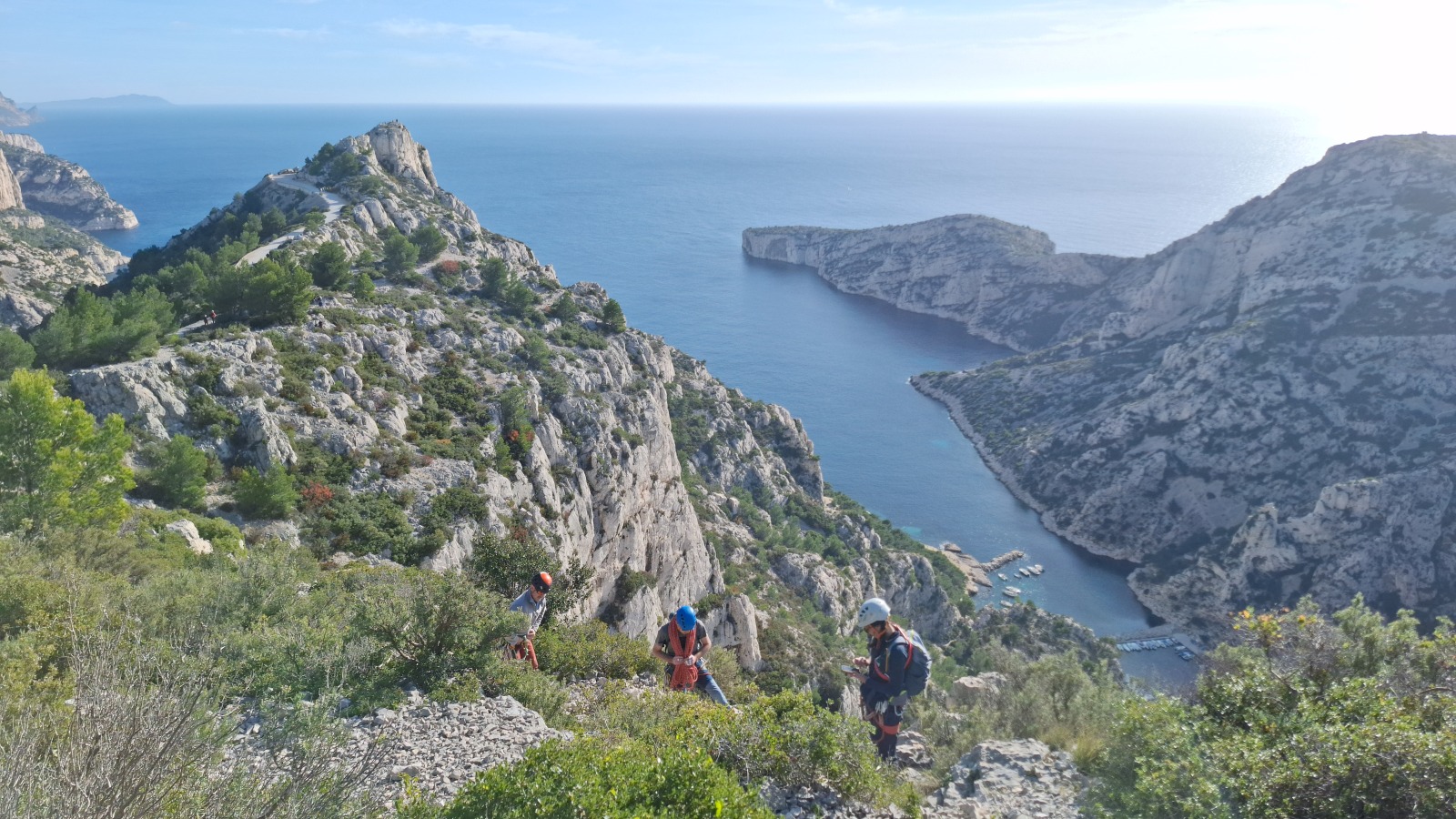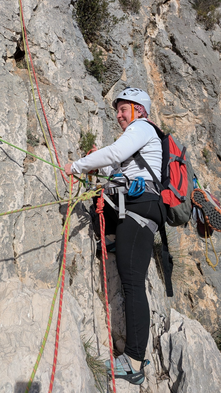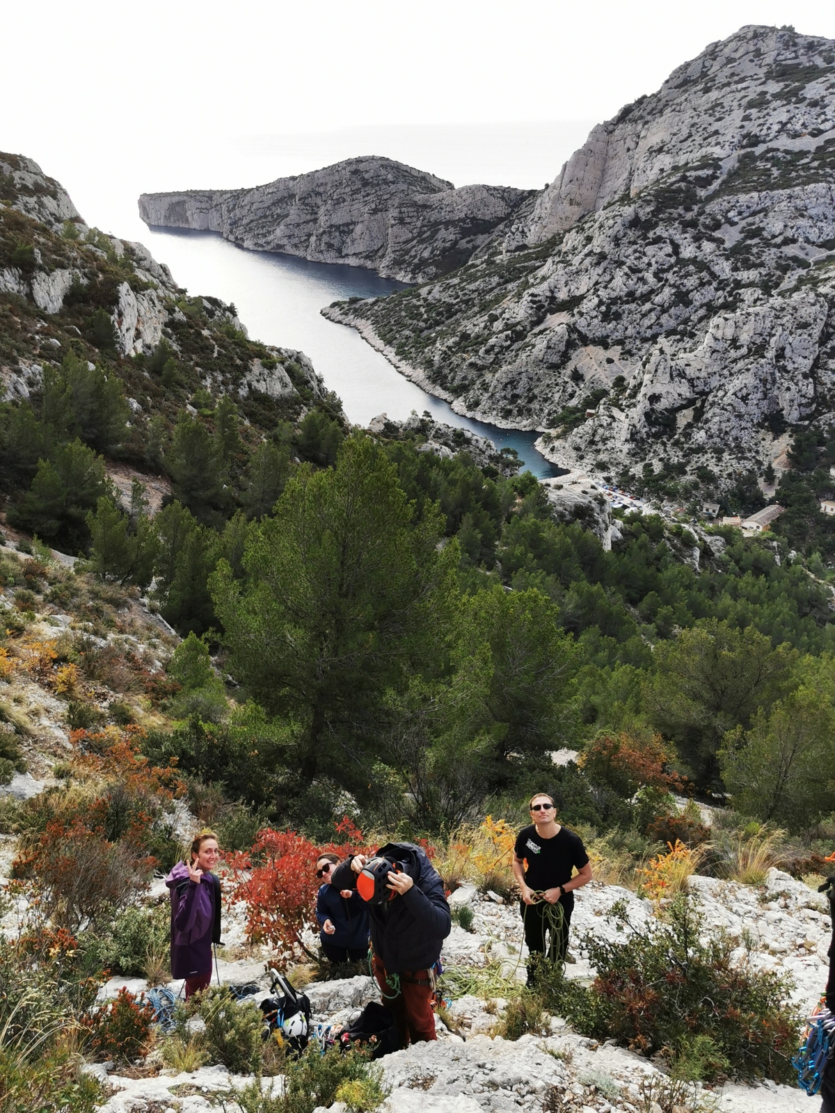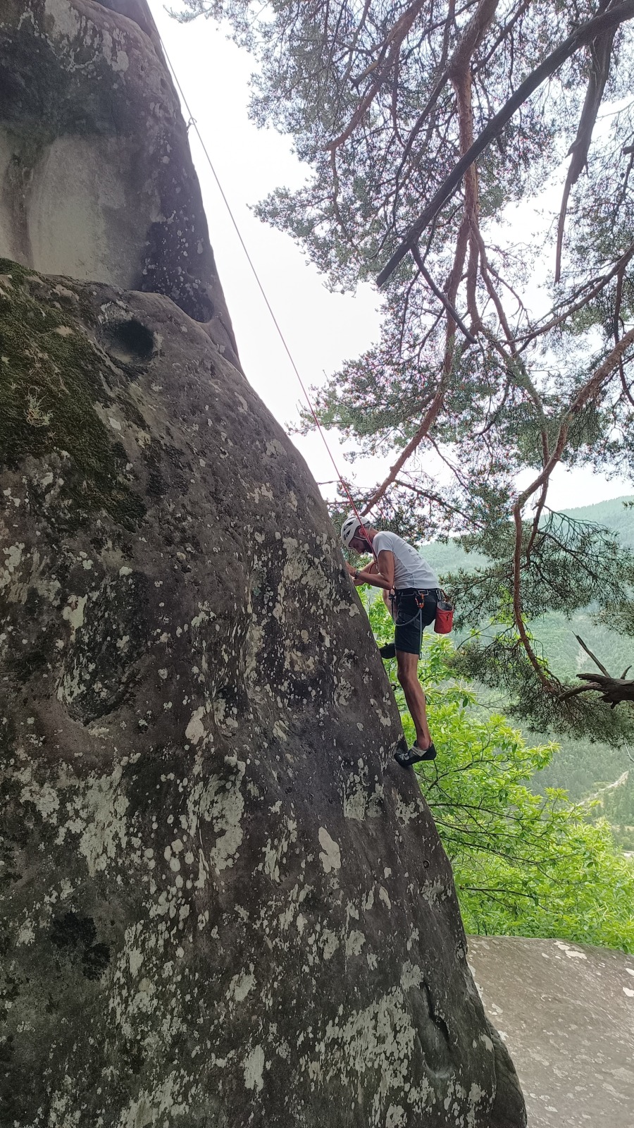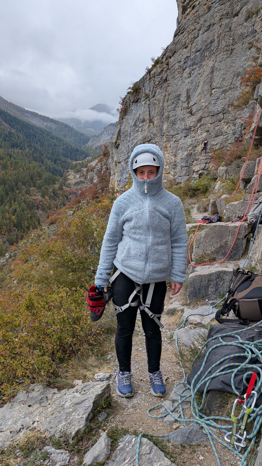 A notre gauche, Julien s’occupe de guide les cordées. Il enchaîne les deux premières longueurs (5c puis 6a) laissant la place à Roxane qui se perd un peu dans la longueur en 5c suivante malgré les indications claires « Vraiment à gauche ! » et oblige ses compagnons de cordée à traverser quelques buissons. Elle conserve le lead sur la longueur suivante et utilise ses compétences en TA pour improviser un relais mixte arbre/plaquette.