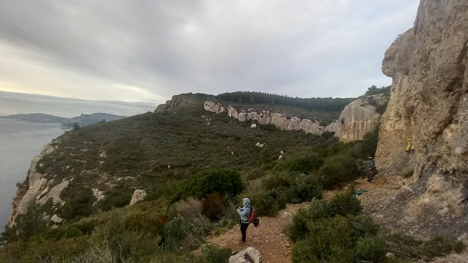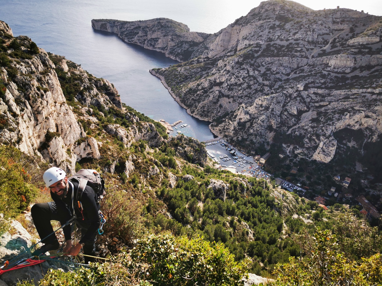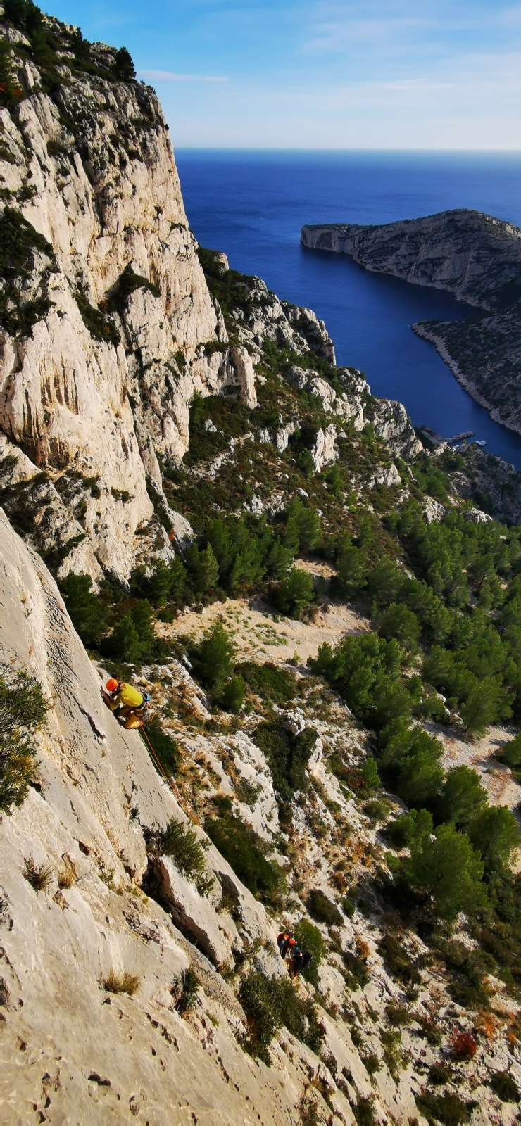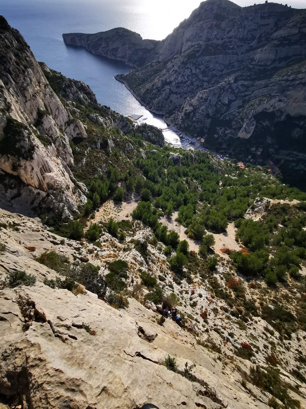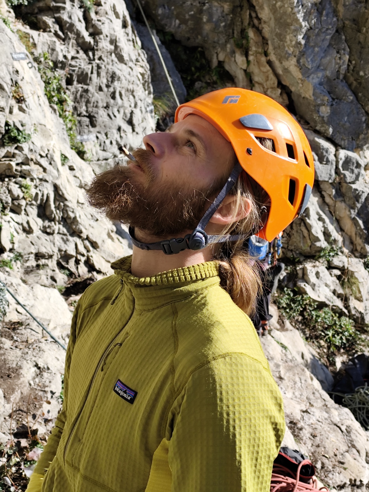 A notre gauche, Julien s’occupe de guide les cordées. Il enchaîne les deux premières longueurs (5c puis 6a) laissant la place à Roxane qui se perd un peu dans la longueur en 5c suivante malgré les indications claires « Vraiment à gauche ! » et oblige ses compagnons de cordée à traverser quelques buissons. Elle conserve le lead sur la longueur suivante et utilise ses compétences en TA pour improviser un relais mixte arbre/plaquette.