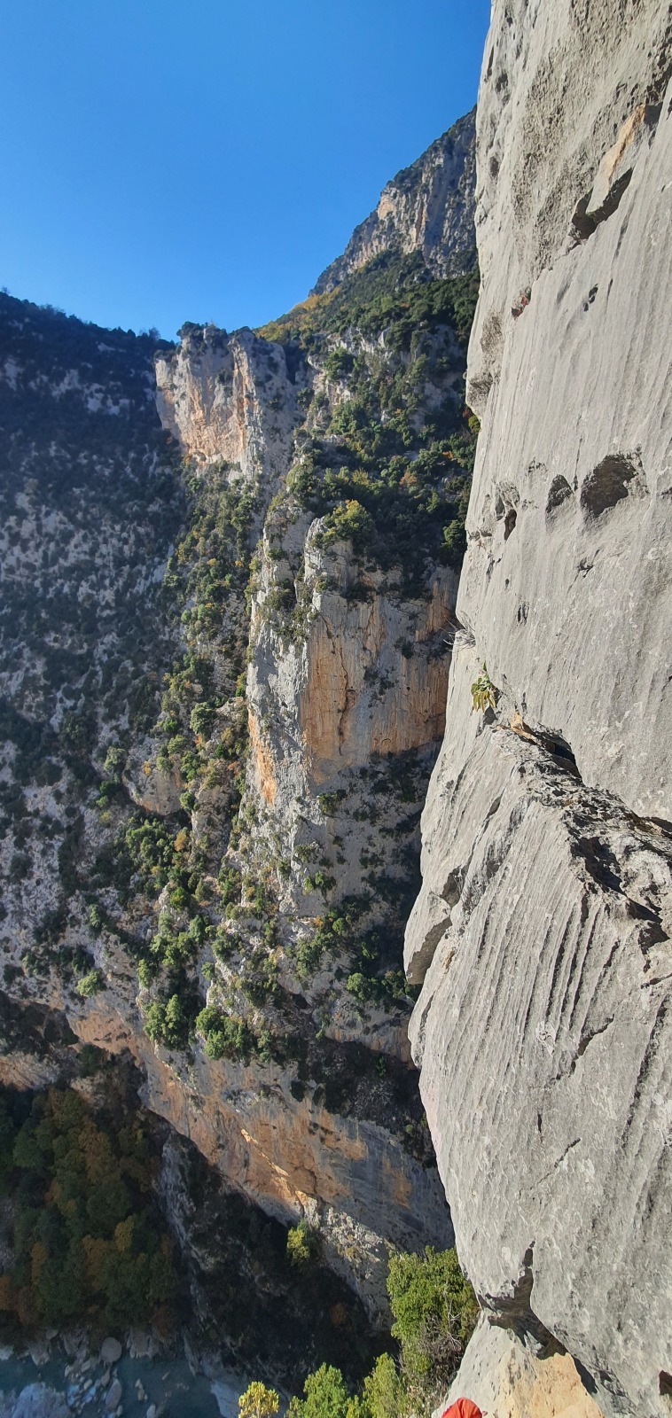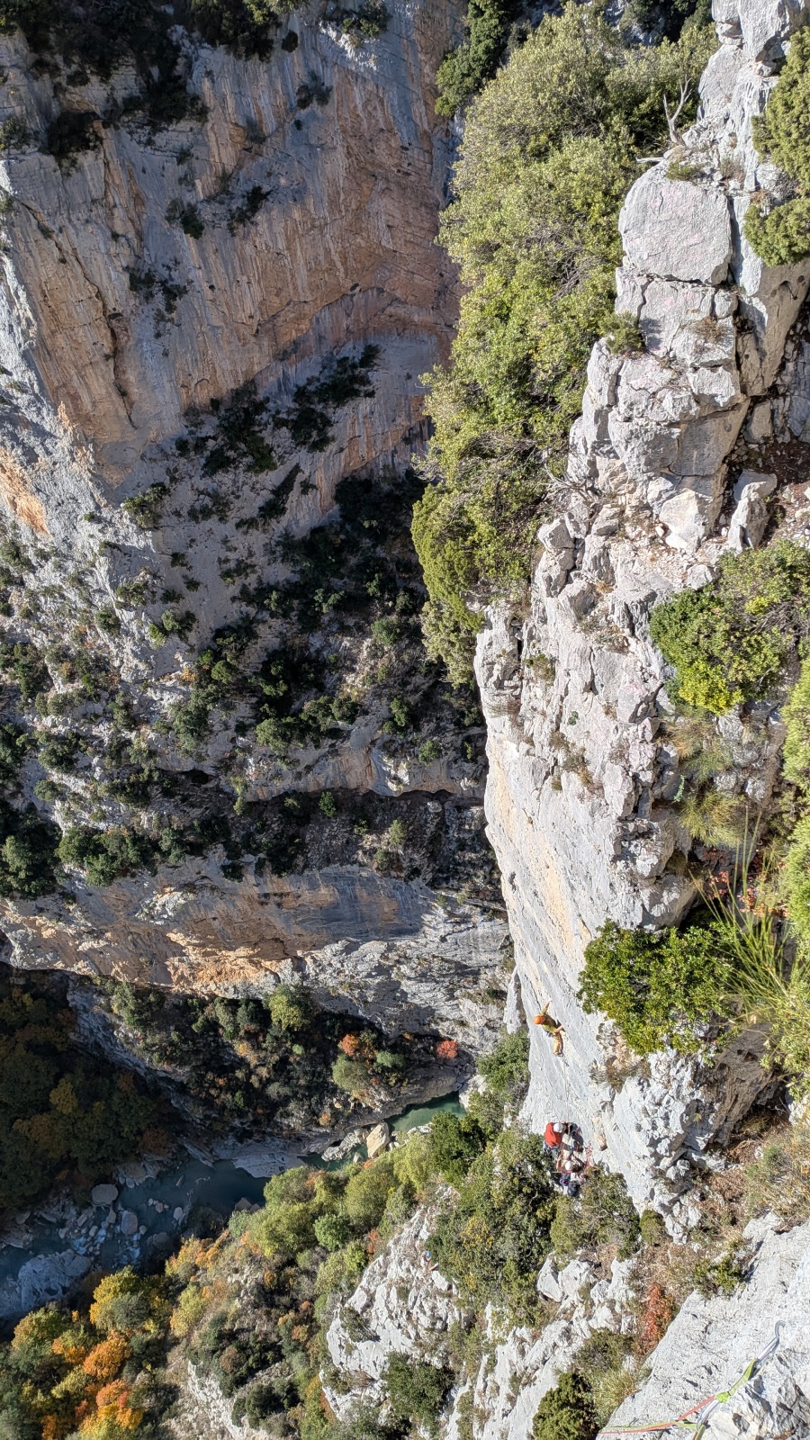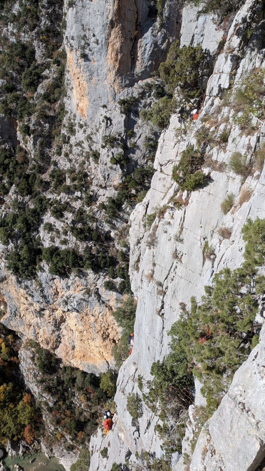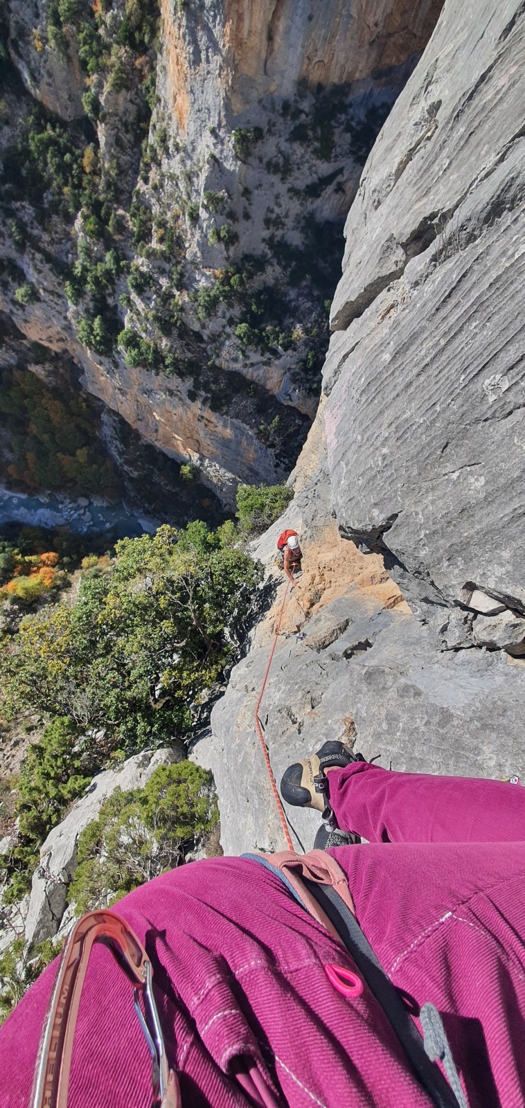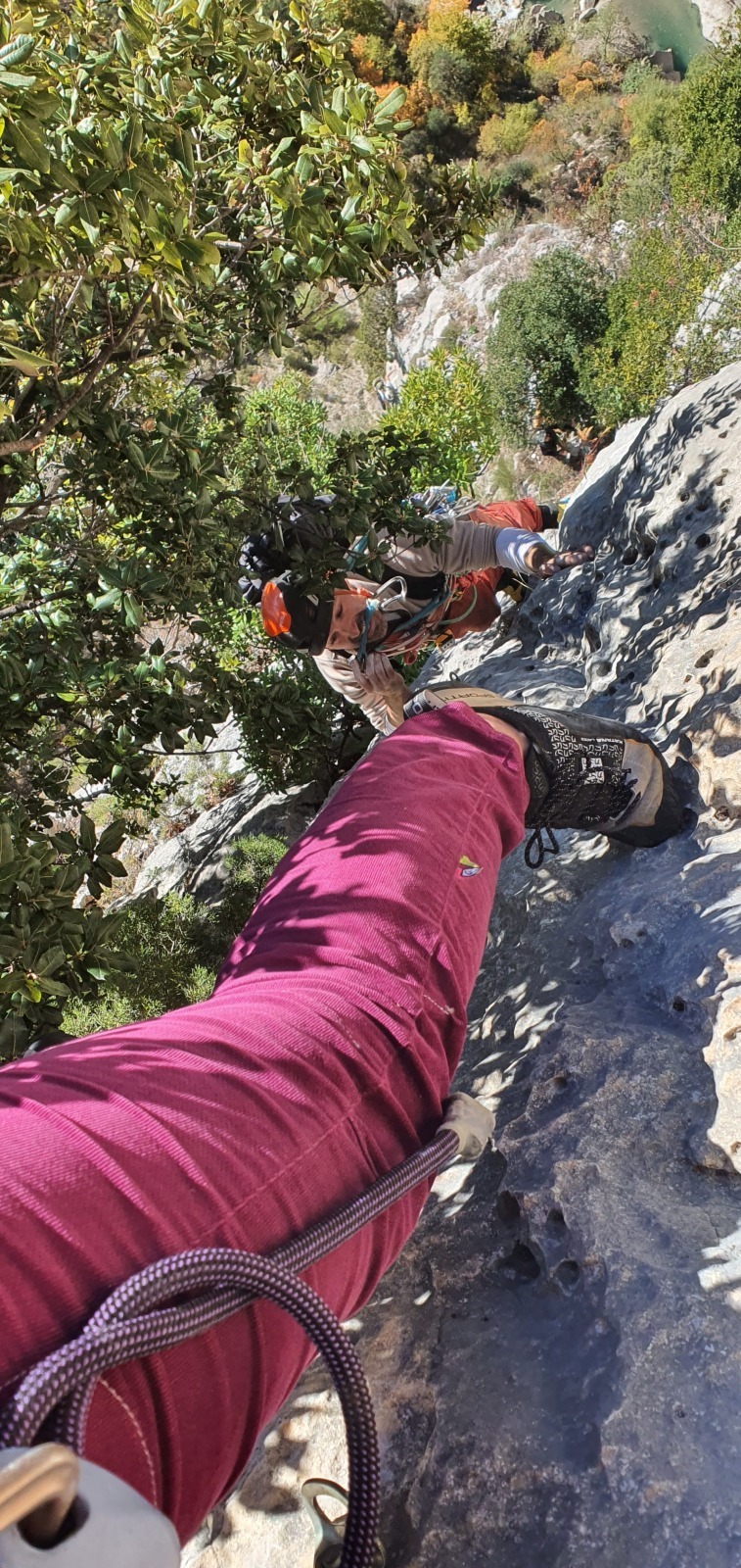 Je fais une courte pause au relais, de nouveau inconfortable, pour admirer Julien un peu en dessous de moi qui a repris la tête pour deux longueurs en 6a/6a+ très bien équipées. Je le vois couiner dans le 6a+ à gouttes d’eau mais il s’en sort très bien. Au dessus de moi, une longueur en 4 avec des arbres. J’avance donc et me retouve à aller jusqu’au relais suivant, tout juste en bout de corde. Mes seconds puisent encore un peu dans leurs réserves dans ce 6a+ physique alors que dans la cordée de derrière, Matthieu H qui a pris la tête depuis la L4 les observe galérer avec la goutte au front…