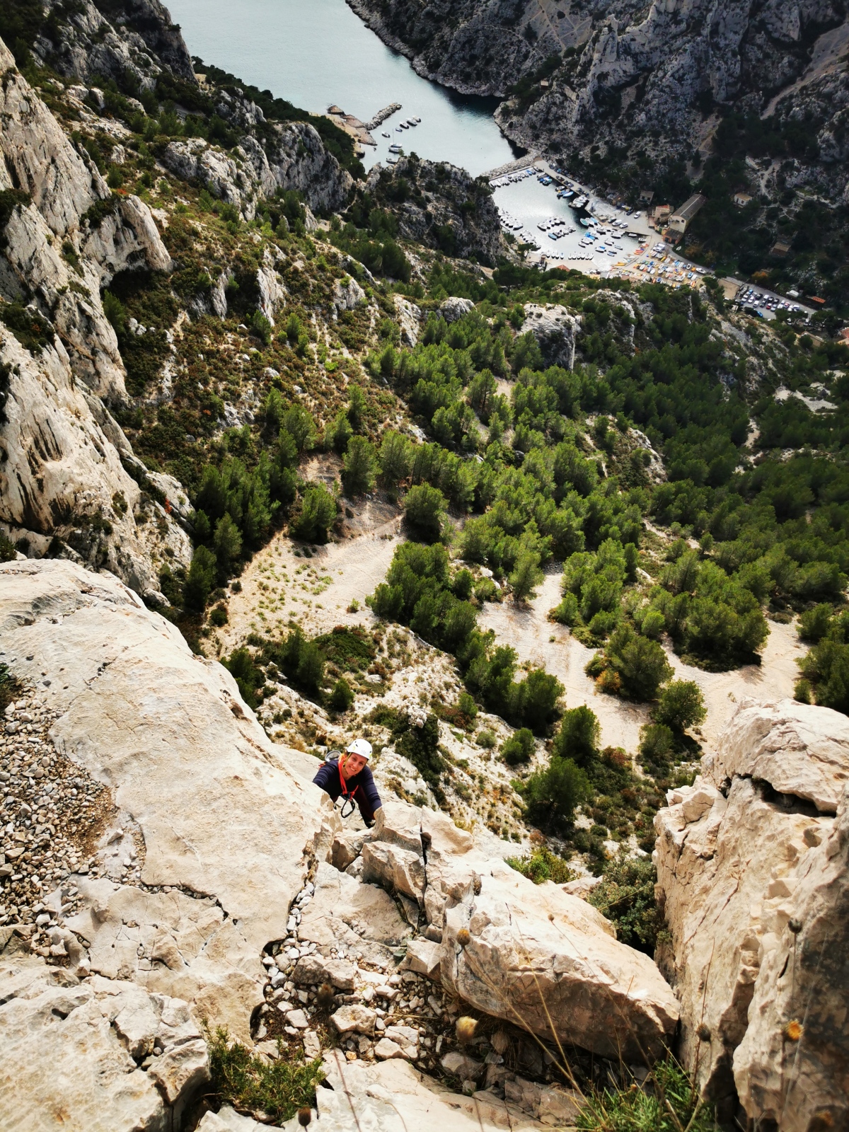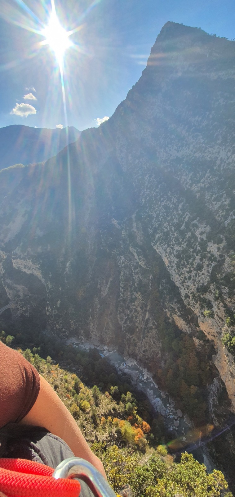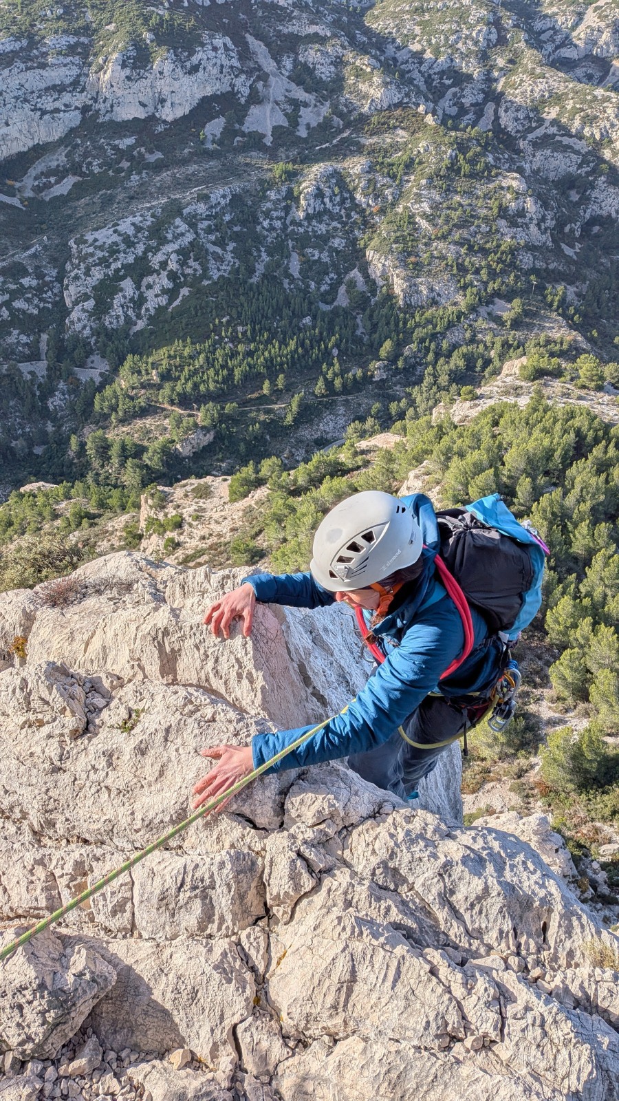 A partir de là, tout déroule bien. De notre côté, je cède la place à Laura qui, après deux premières longueurs qui ne mettent pas vraiment en confiance, trouve le courage de passer devant pour 4 longueurs en 5c, 5b, 5c et 5c. L’escalade est assez engagée mais elle s’en sort à merveille. Les longueurs sont belles, le caillou est plutôt sain si on oublie la longueur en 5b en gradins. Thibaud, qui est arrivé les bras déjà explosés après la L2, apprend à gérer son stress qui augmente avec la hauteur. Lui qui a largement la marge dans ce genre de cotations se retrouve à serrer les prises bien au delà du raisonnable, venant puiser dans ses réserves d’énergie un peu trop rapidement. Il prend sa première chute en second et se retrouve les fesses dans le vide à 150m de haut !