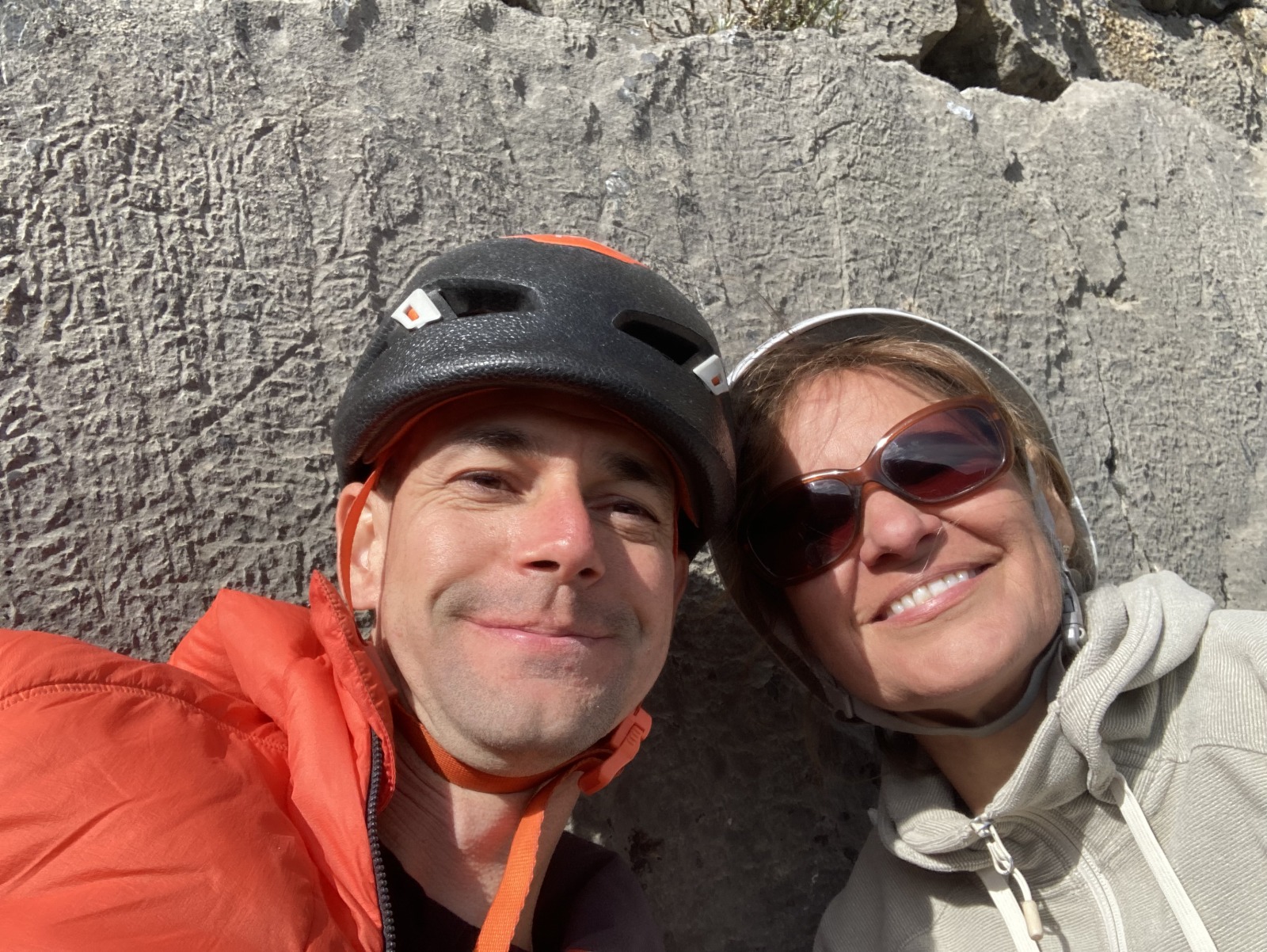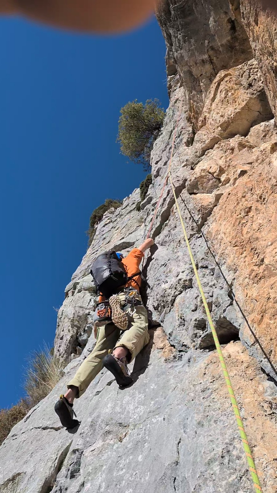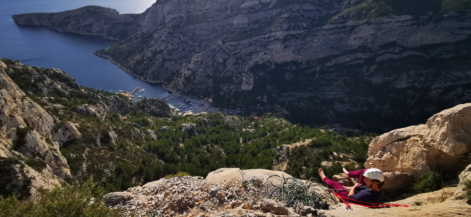 A partir de là, tout déroule bien. De notre côté, je cède la place à Laura qui, après deux premières longueurs qui ne mettent pas vraiment en confiance, trouve le courage de passer devant pour 4 longueurs en 5c, 5b, 5c et 5c. L’escalade est assez engagée mais elle s’en sort à merveille. Les longueurs sont belles, le caillou est plutôt sain si on oublie la longueur en 5b en gradins. Thibaud, qui est arrivé les bras déjà explosés après la L2, apprend à gérer son stress qui augmente avec la hauteur. Lui qui a largement la marge dans ce genre de cotations se retrouve à serrer les prises bien au delà du raisonnable, venant puiser dans ses réserves d’énergie un peu trop rapidement. Il prend sa première chute en second et se retrouve les fesses dans le vide à 150m de haut !