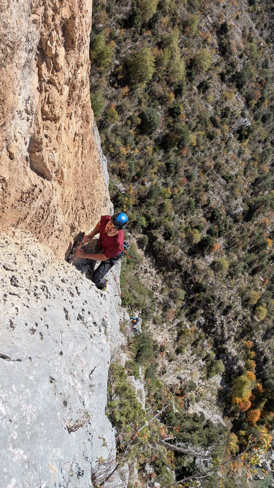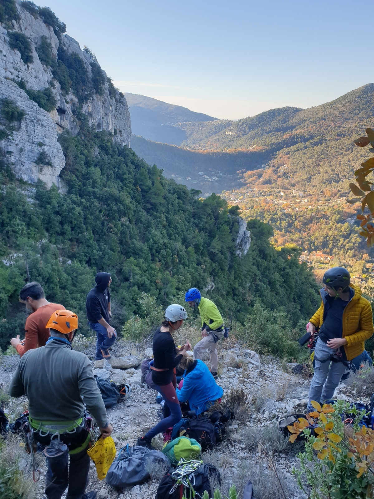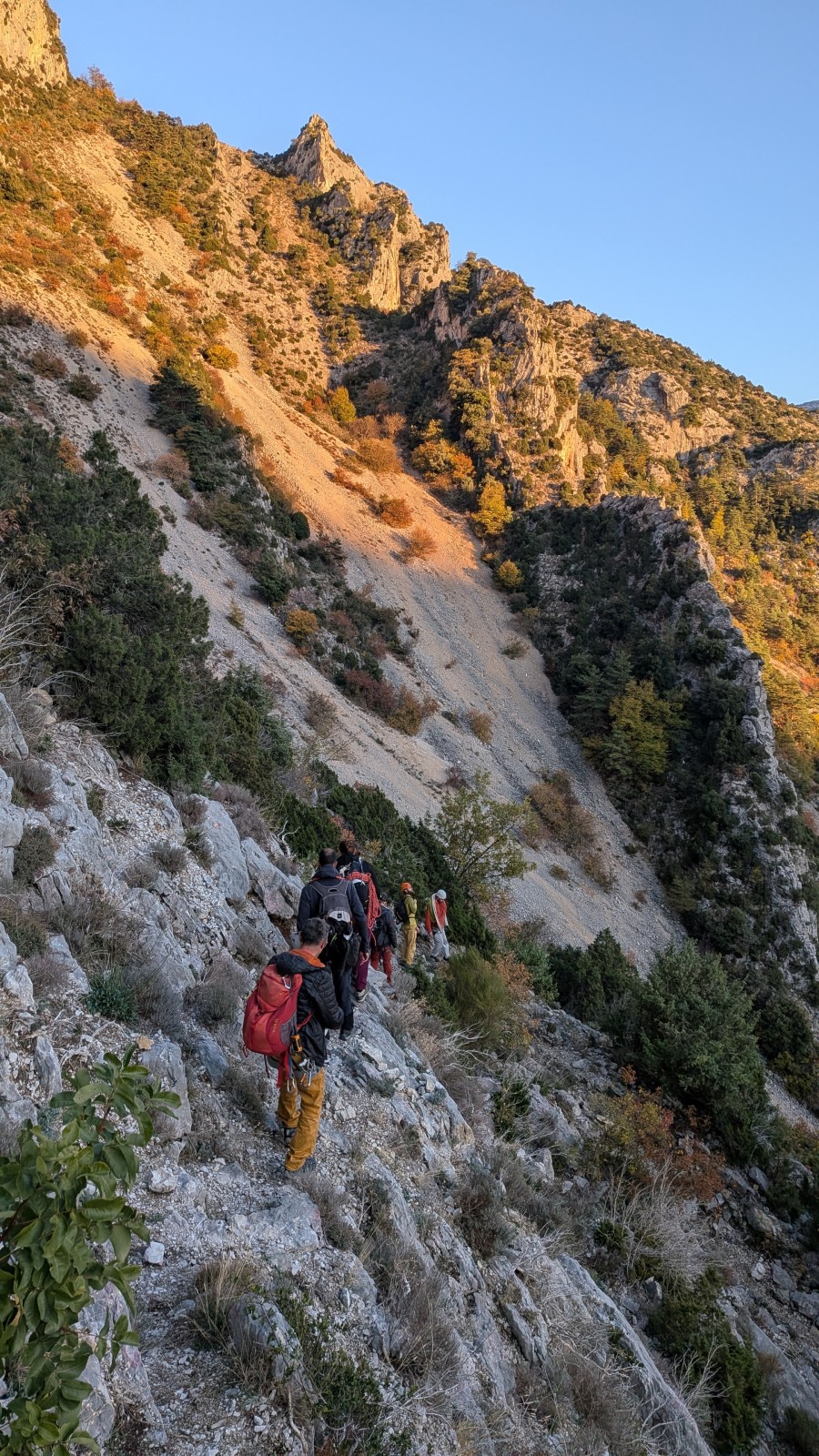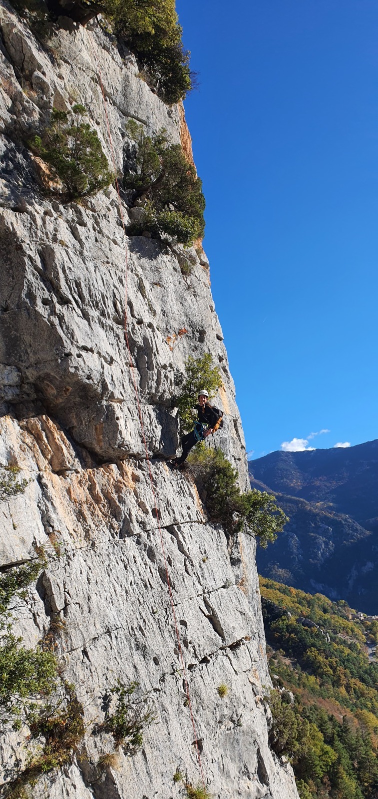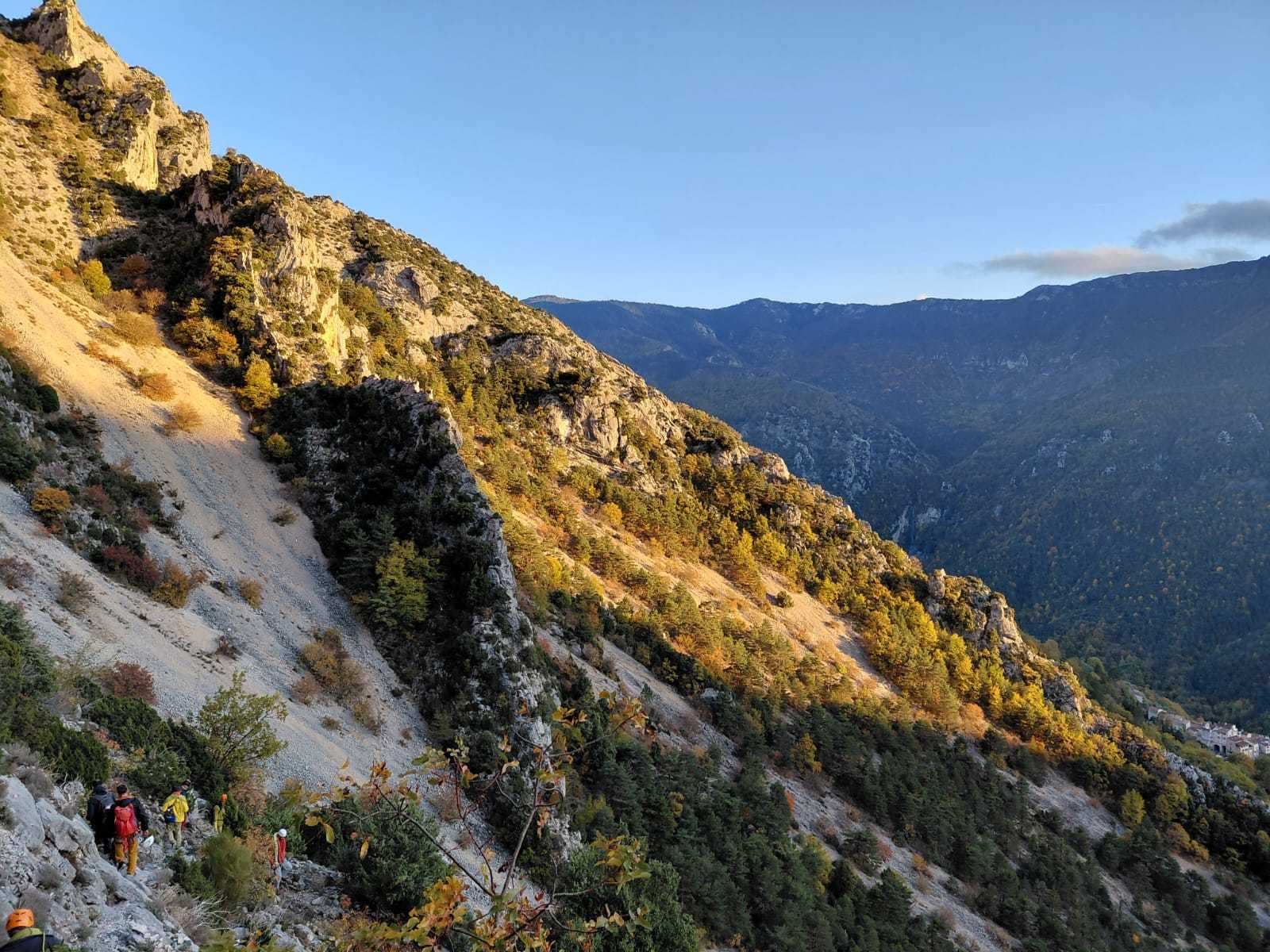 Derrière nous, Jean-Luc a pris la tête depuis le relais peu confortable du 6a+ et choisit de faire le 4c et le 5c en une fois, ce qui l’oblige à faire le dernier relais juste sous le sommet, n’ayant pas assez de corde pour atteindre le fameux chêne ! Finalement, il est 16h15 lorsque le dernier grimpeur atteint le sommet. Le soleil est encore là mais passe derrière les sommets, faisant du même coup chuter la température de quelques degrés. Matos rangé, on attaque la marche retour qui commence par grimper raide pour retrouver le magnifique chemin de rando qui nous ramène au village. On profite des couleurs de l’automne et les frotales n’auront été utiles que pour aller explorer la grotte obscure et observer ses 2 chauve-souris sur le chemin du retour.