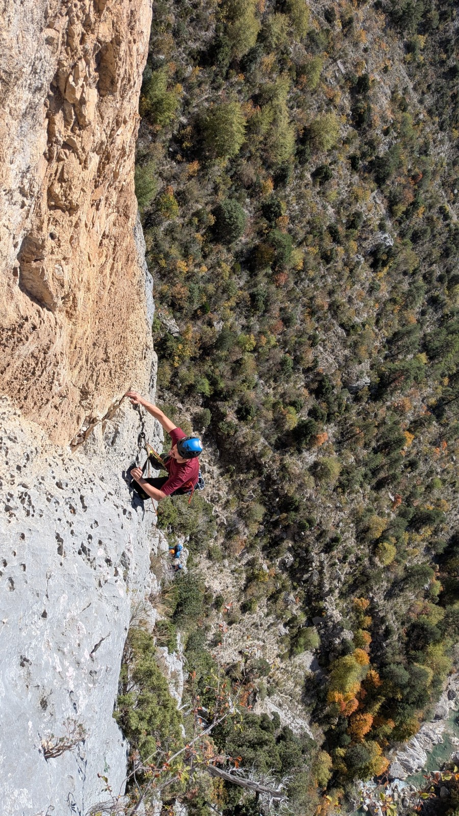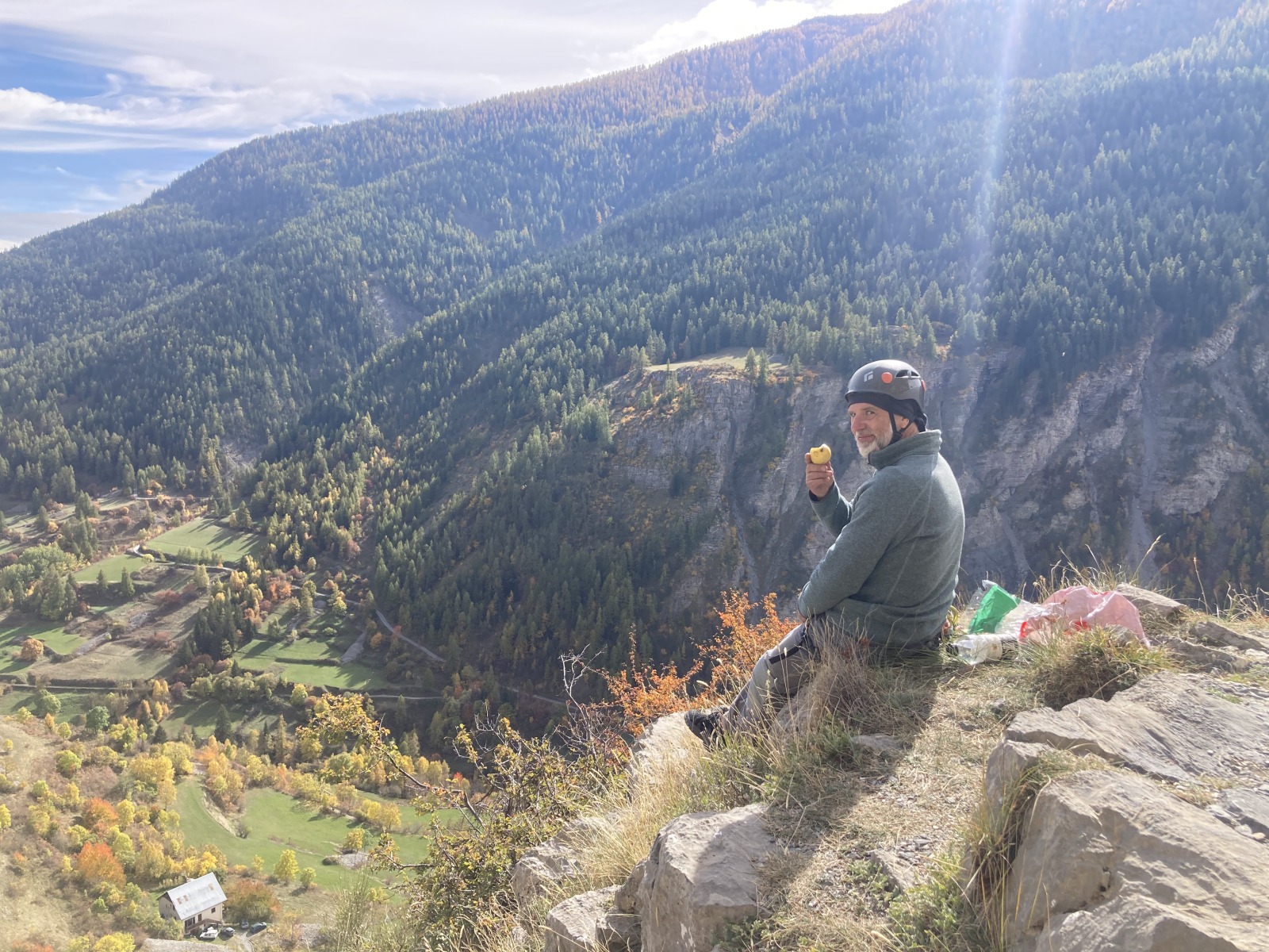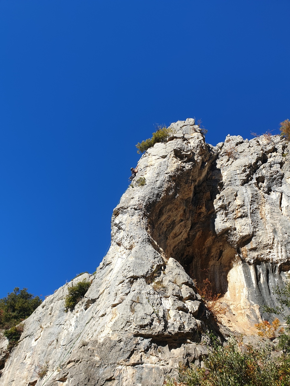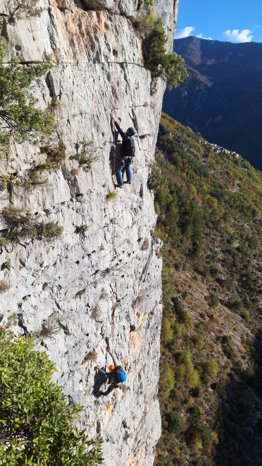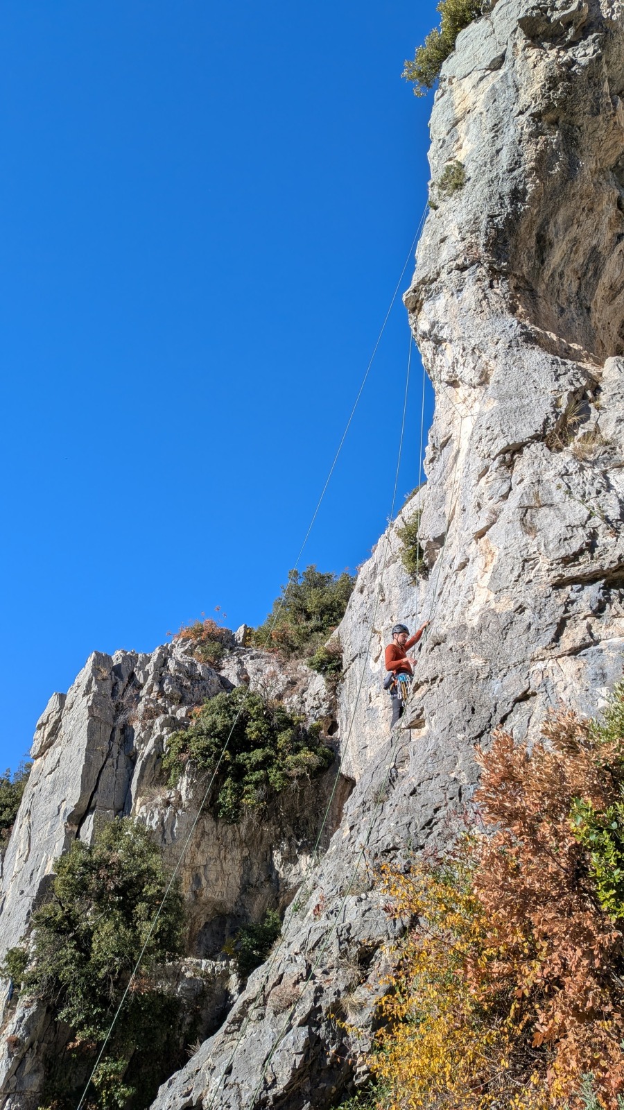 Derrière nous, Jean-Luc a pris la tête depuis le relais peu confortable du 6a+ et choisit de faire le 4c et le 5c en une fois, ce qui l’oblige à faire le dernier relais juste sous le sommet, n’ayant pas assez de corde pour atteindre le fameux chêne ! Finalement, il est 16h15 lorsque le dernier grimpeur atteint le sommet. Le soleil est encore là mais passe derrière les sommets, faisant du même coup chuter la température de quelques degrés. Matos rangé, on attaque la marche retour qui commence par grimper raide pour retrouver le magnifique chemin de rando qui nous ramène au village. On profite des couleurs de l’automne et les frotales n’auront été utiles que pour aller explorer la grotte obscure et observer ses 2 chauve-souris sur le chemin du retour.