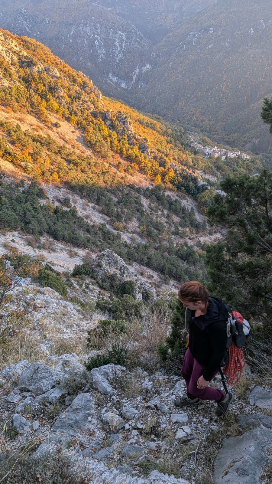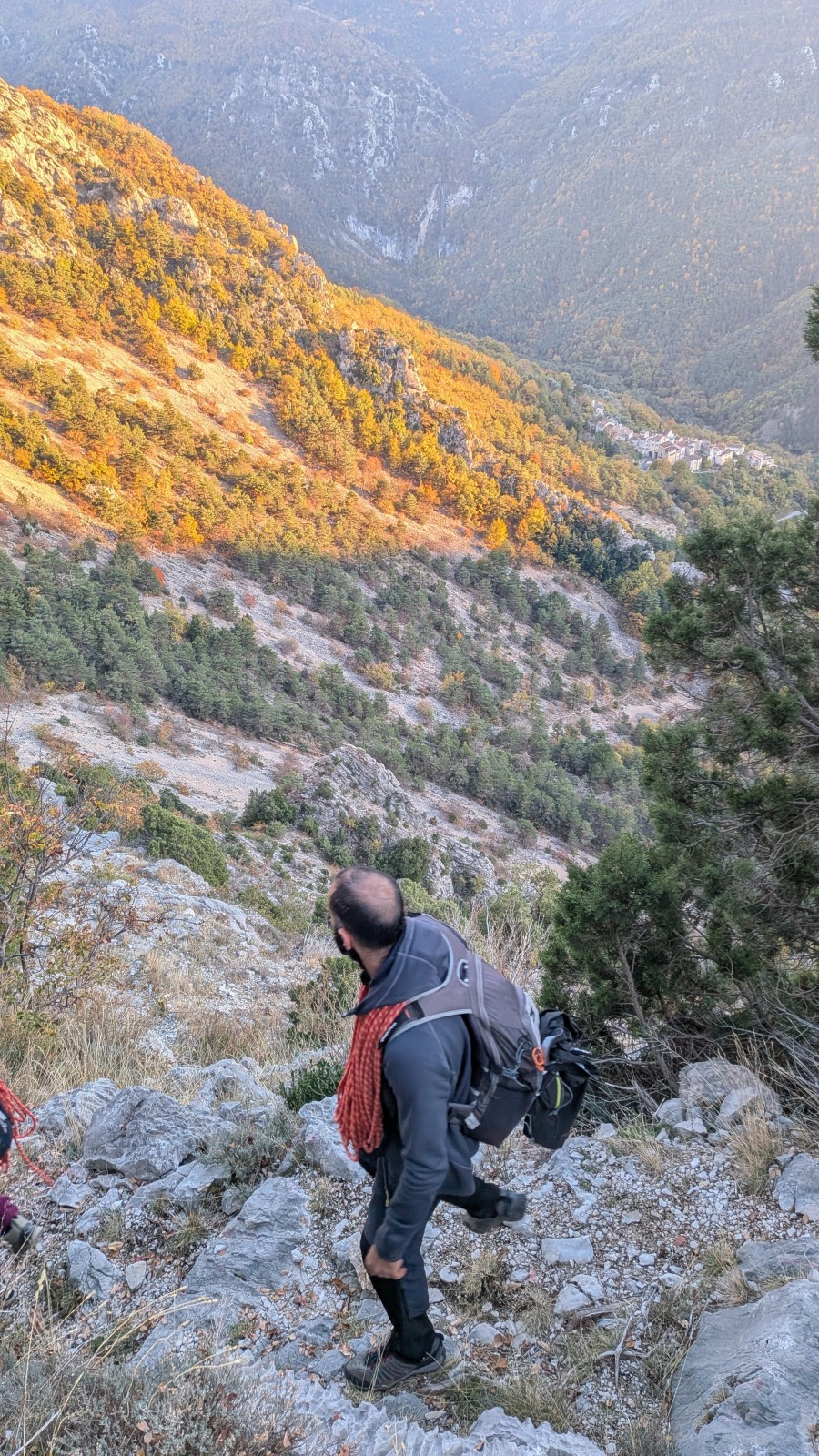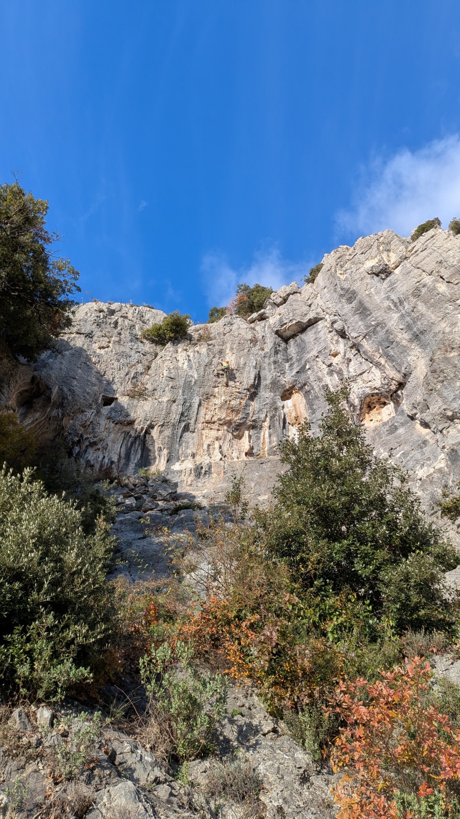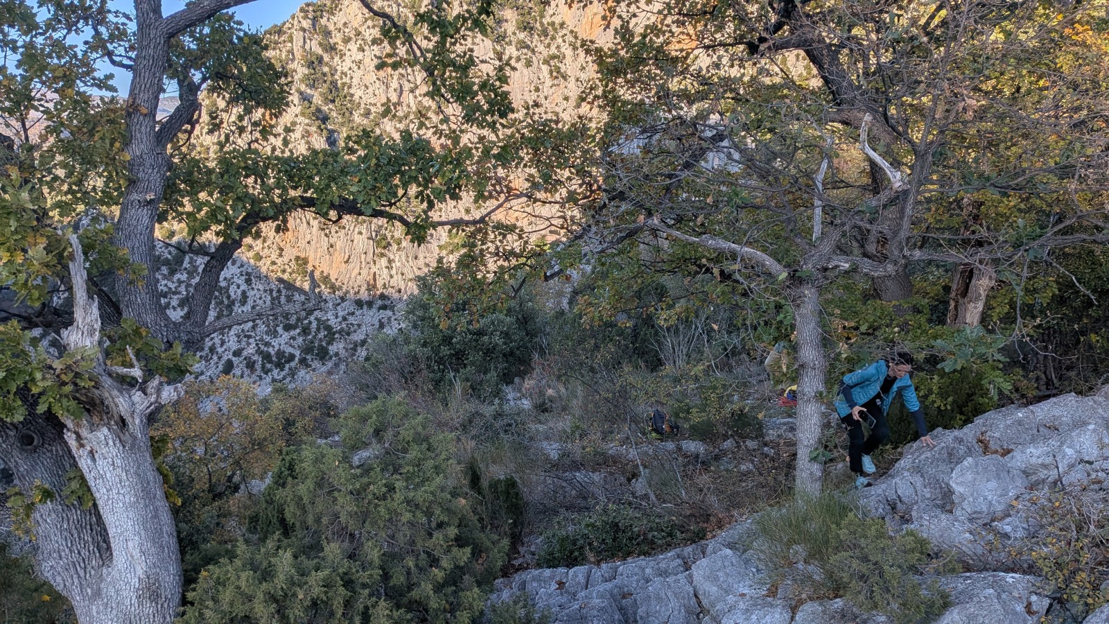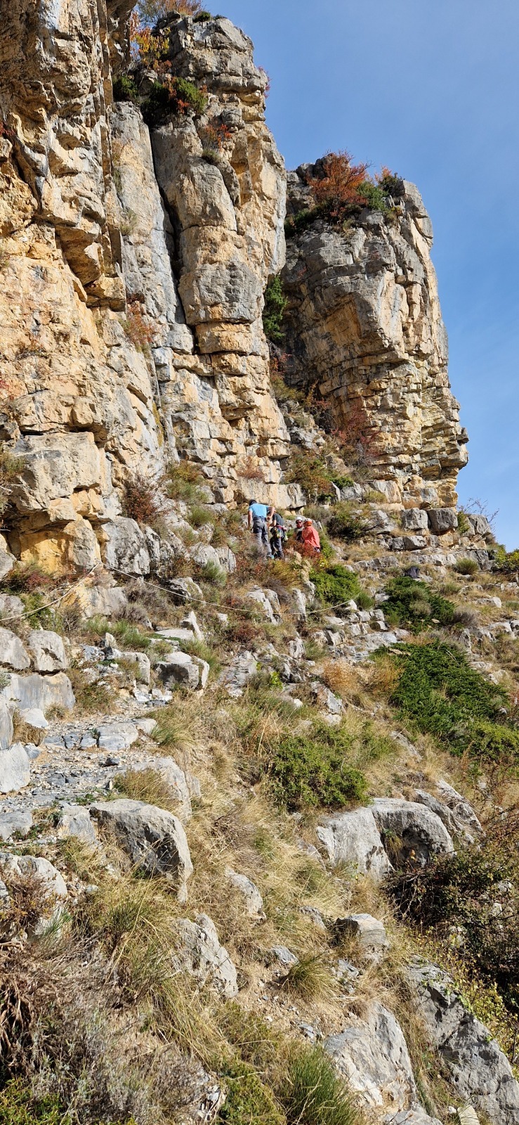 Derrière nous, Jean-Luc a pris la tête depuis le relais peu confortable du 6a+ et choisit de faire le 4c et le 5c en une fois, ce qui l’oblige à faire le dernier relais juste sous le sommet, n’ayant pas assez de corde pour atteindre le fameux chêne ! Finalement, il est 16h15 lorsque le dernier grimpeur atteint le sommet. Le soleil est encore là mais passe derrière les sommets, faisant du même coup chuter la température de quelques degrés. Matos rangé, on attaque la marche retour qui commence par grimper raide pour retrouver le magnifique chemin de rando qui nous ramène au village. On profite des couleurs de l’automne et les frotales n’auront été utiles que pour aller explorer la grotte obscure et observer ses 2 chauve-souris sur le chemin du retour.