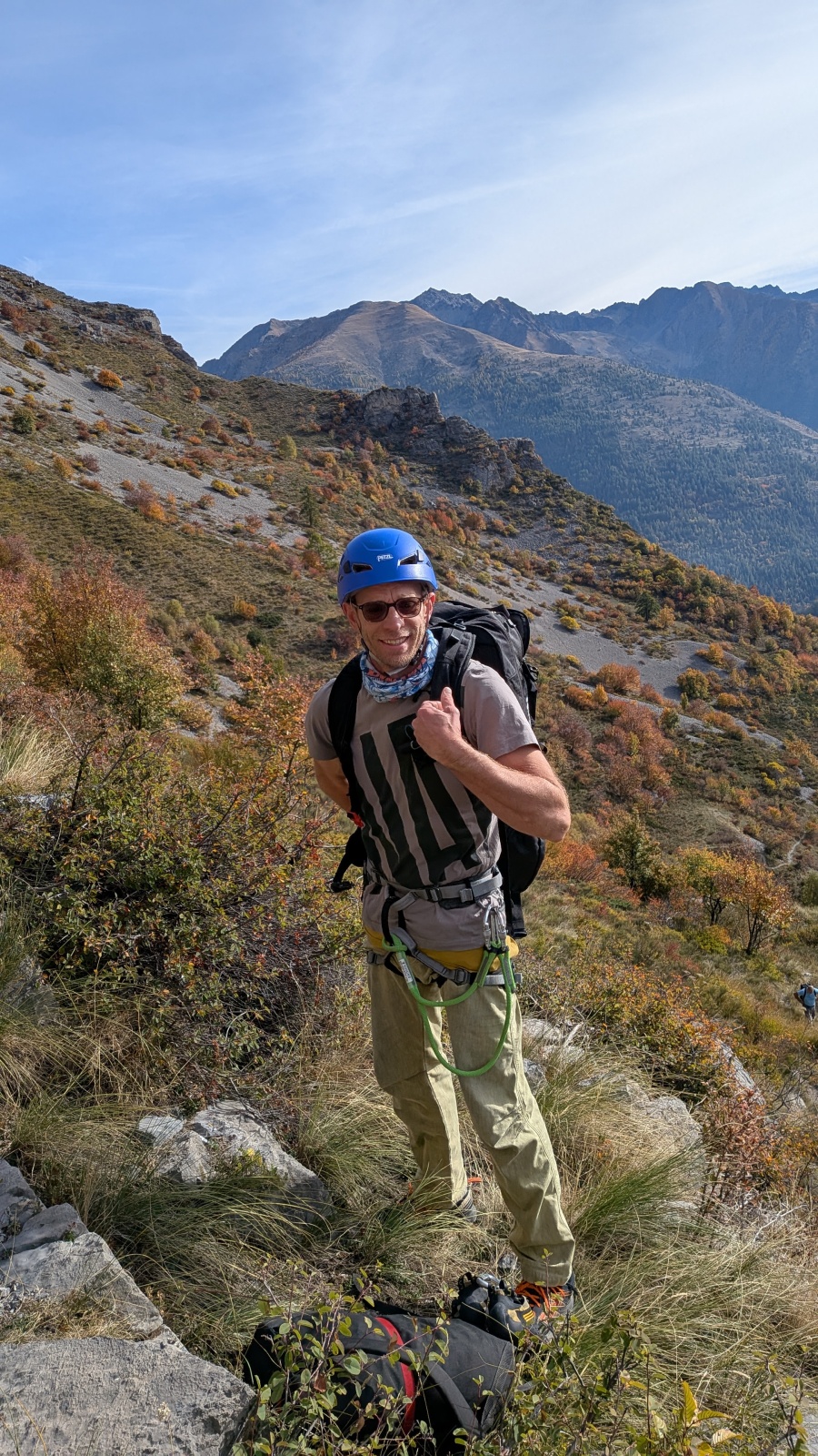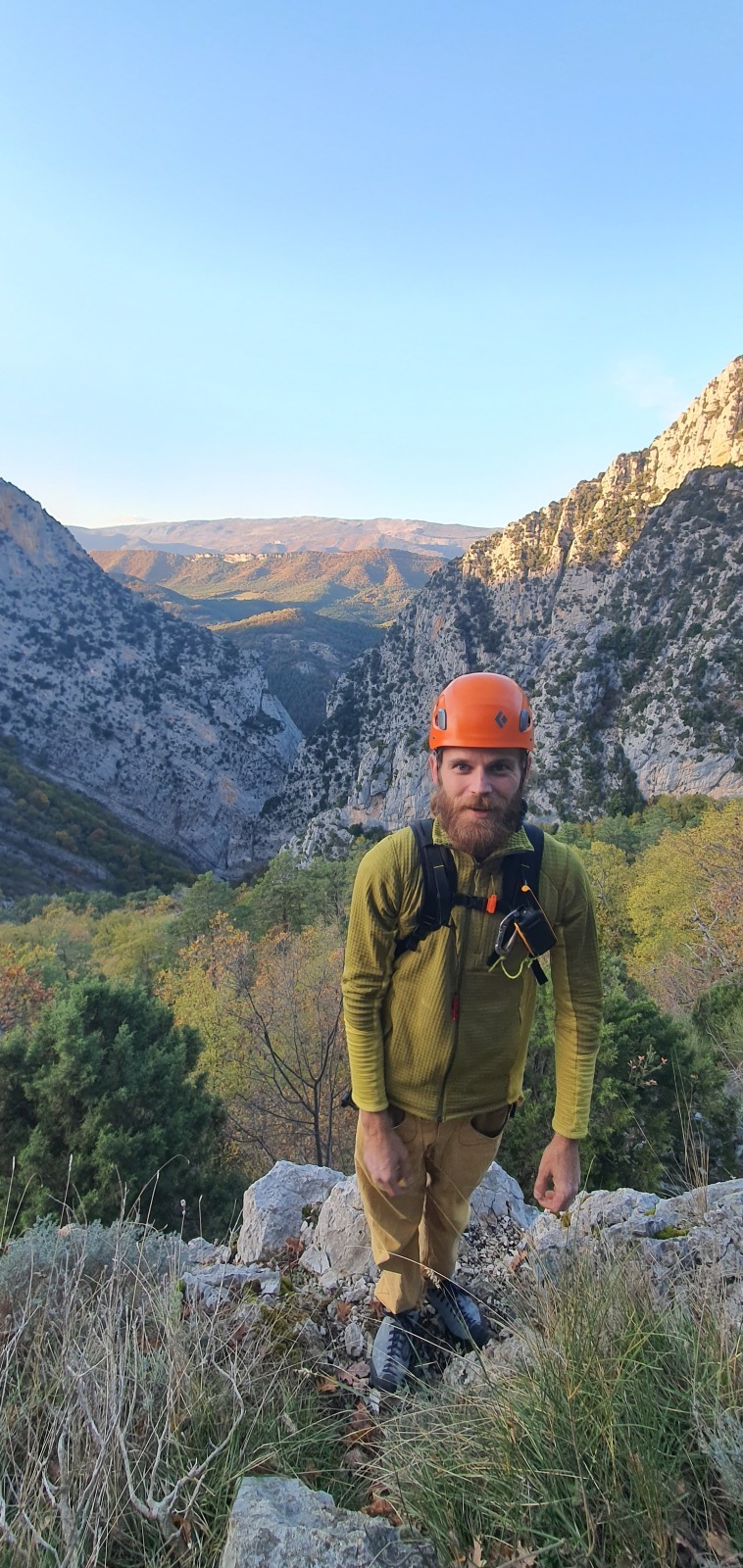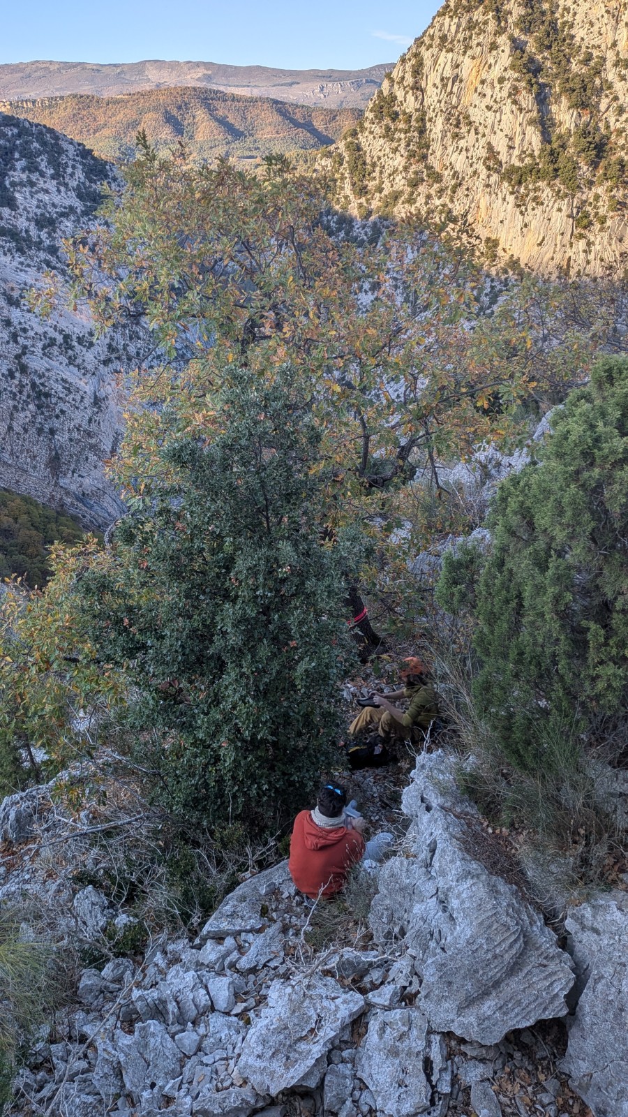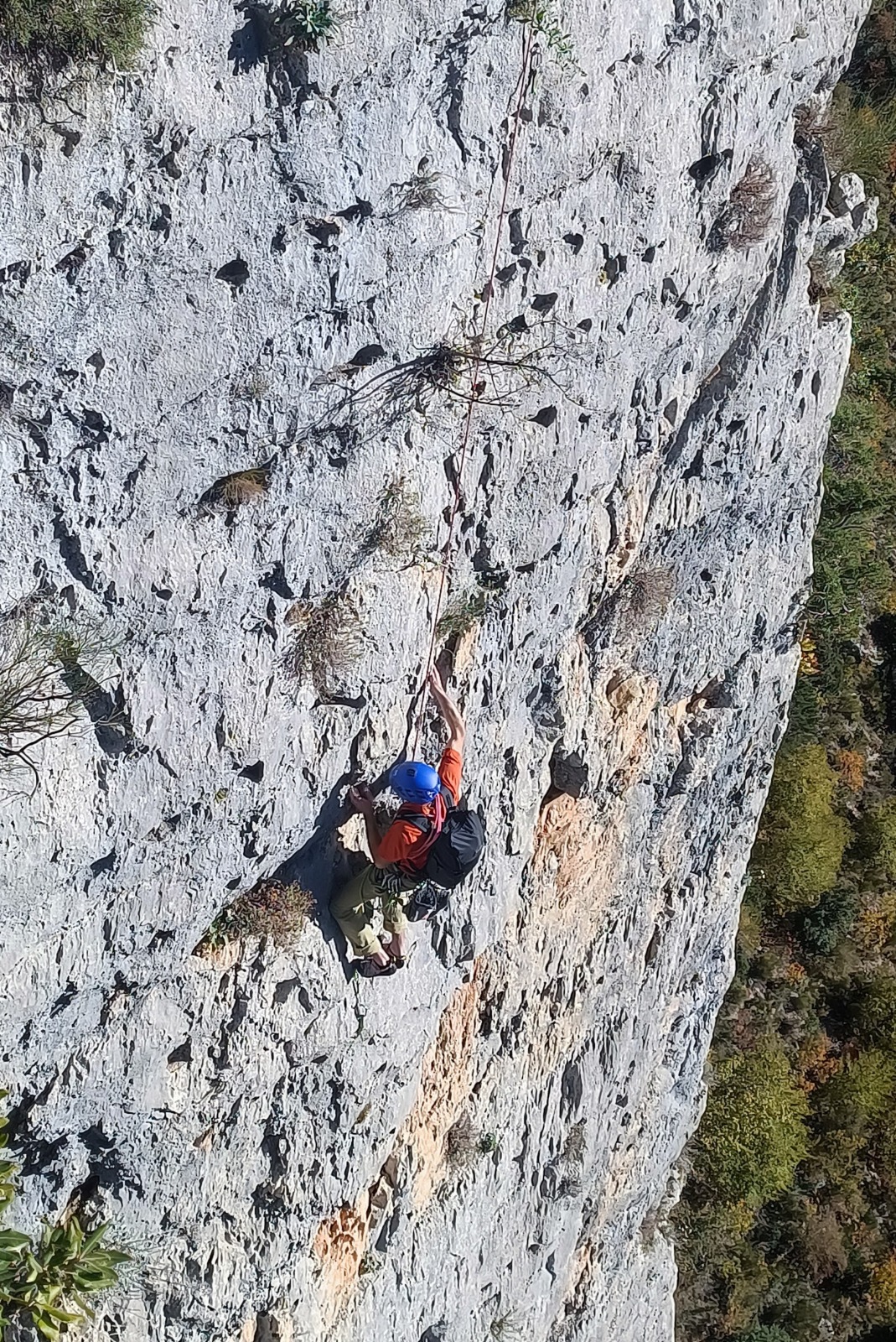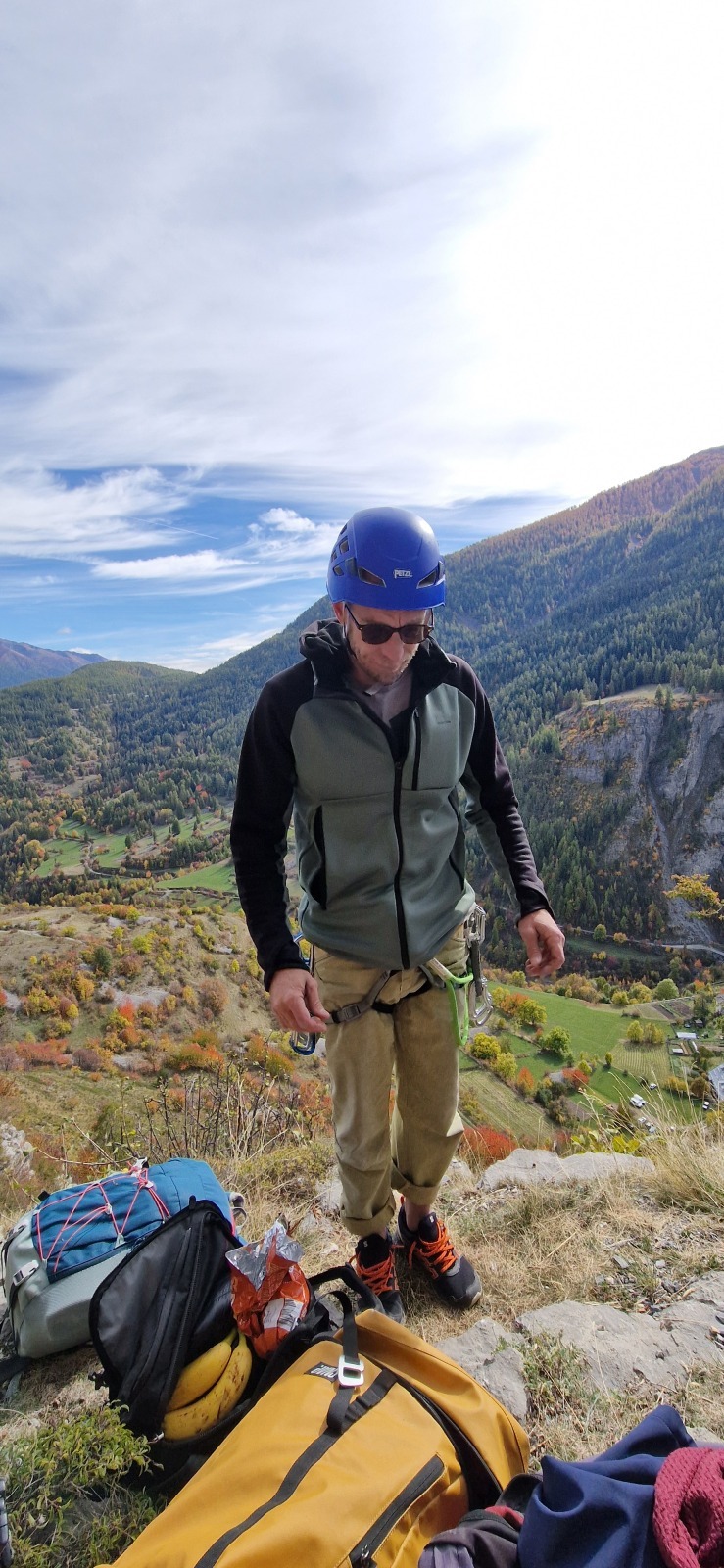 Derrière nous, Jean-Luc a pris la tête depuis le relais peu confortable du 6a+ et choisit de faire le 4c et le 5c en une fois, ce qui l’oblige à faire le dernier relais juste sous le sommet, n’ayant pas assez de corde pour atteindre le fameux chêne ! Finalement, il est 16h15 lorsque le dernier grimpeur atteint le sommet. Le soleil est encore là mais passe derrière les sommets, faisant du même coup chuter la température de quelques degrés. Matos rangé, on attaque la marche retour qui commence par grimper raide pour retrouver le magnifique chemin de rando qui nous ramène au village. On profite des couleurs de l’automne et les frotales n’auront été utiles que pour aller explorer la grotte obscure et observer ses 2 chauve-souris sur le chemin du retour.