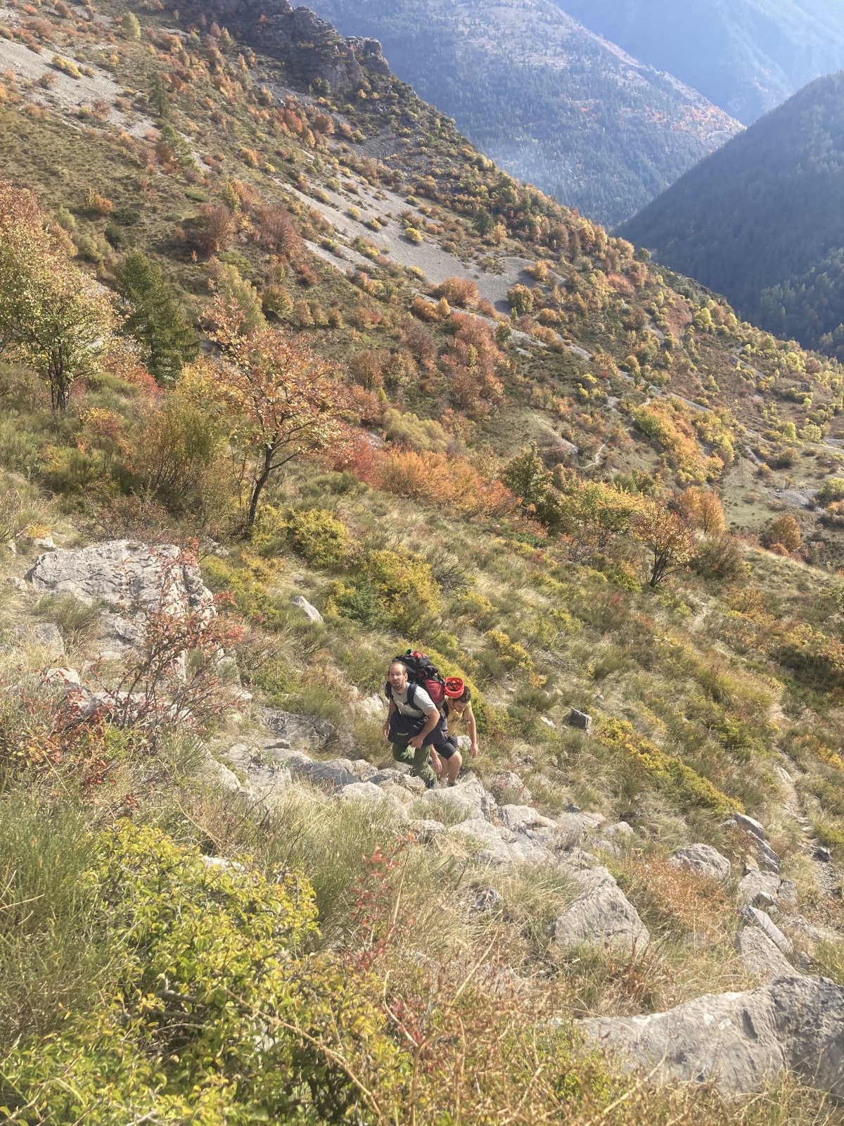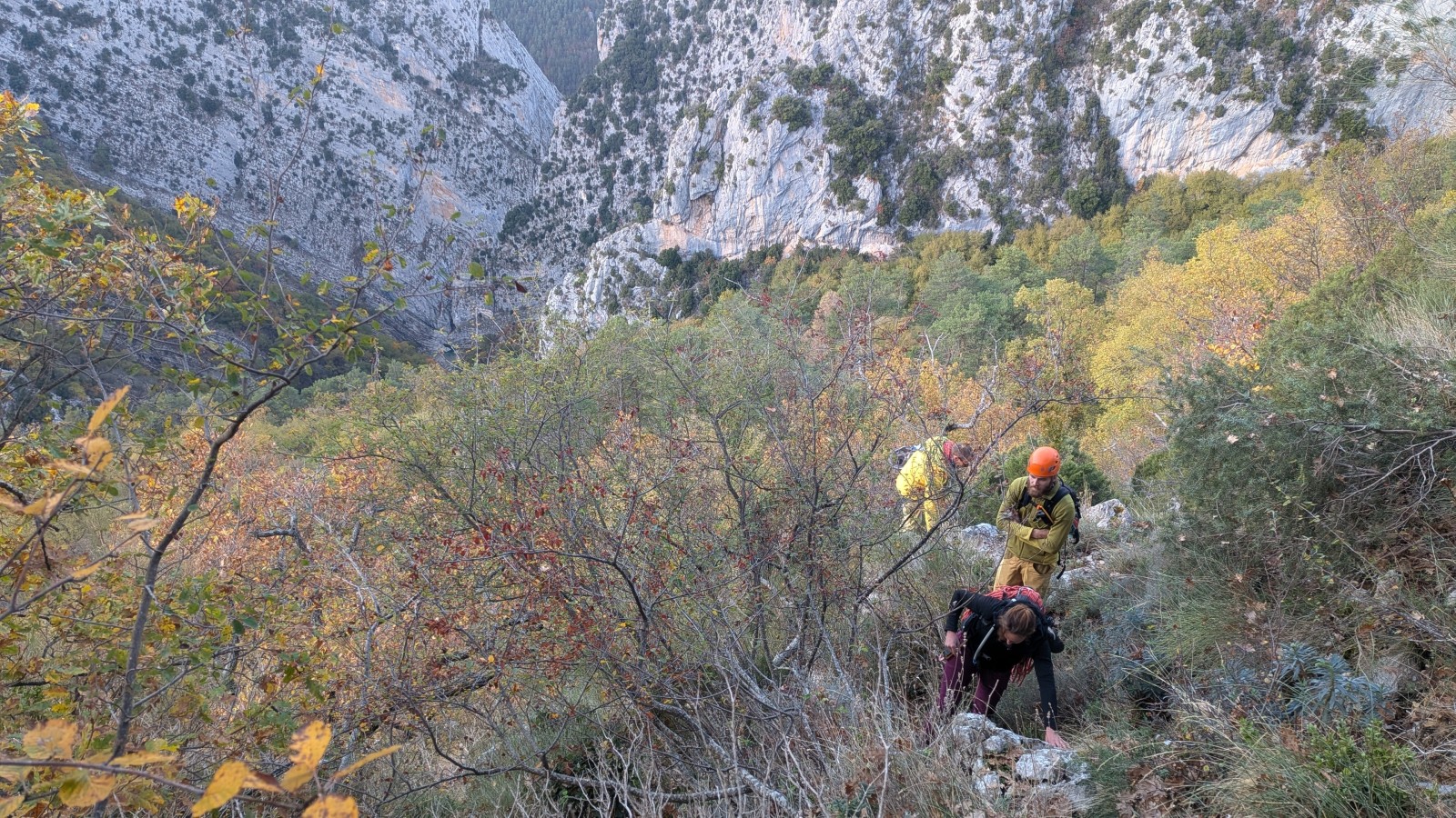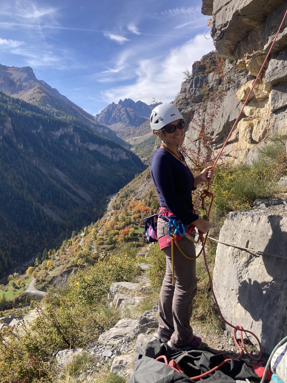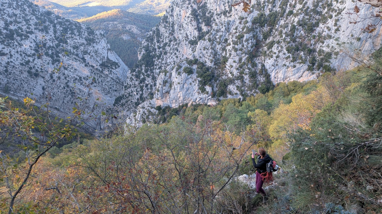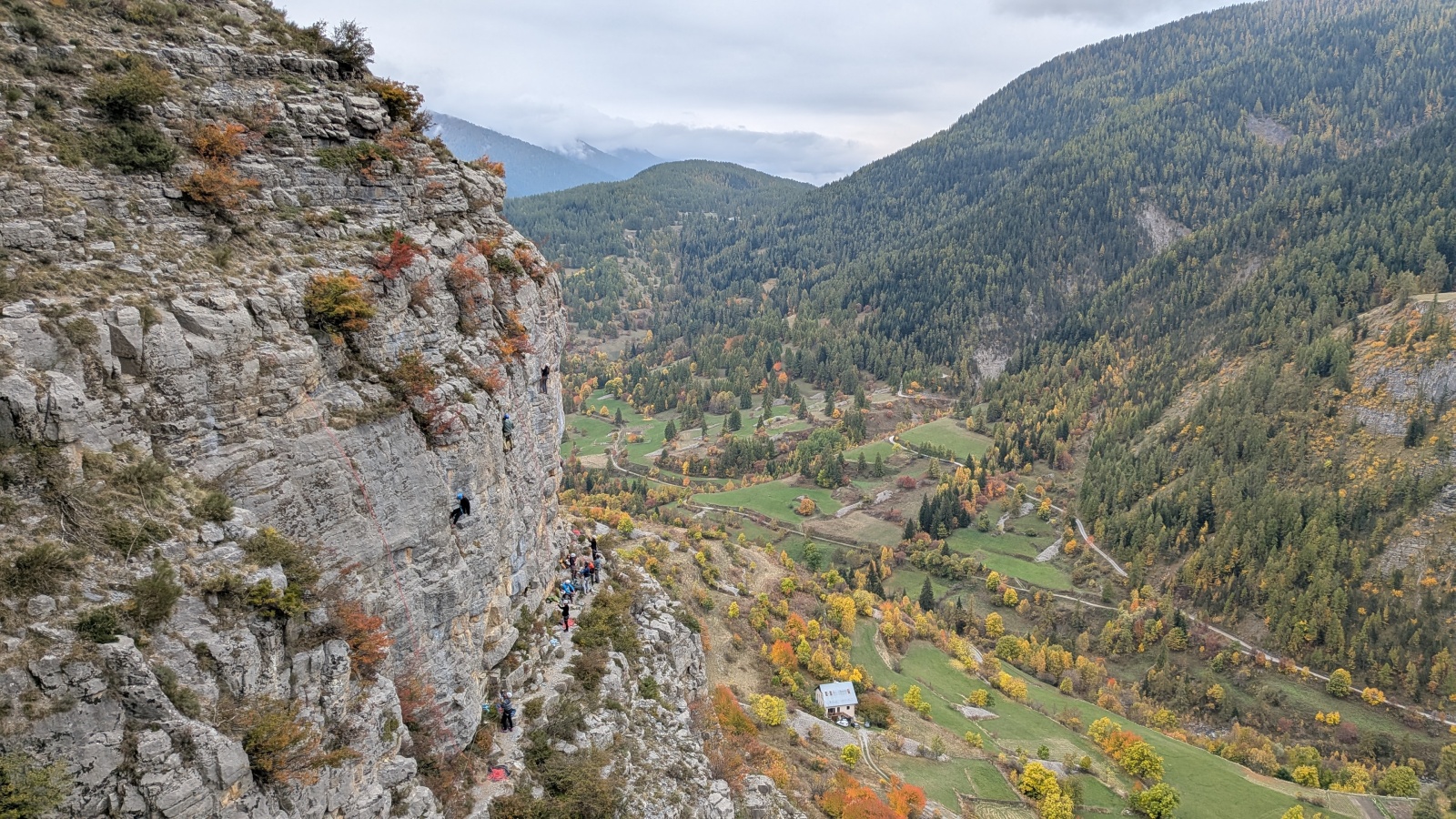 Derrière nous, Jean-Luc a pris la tête depuis le relais peu confortable du 6a+ et choisit de faire le 4c et le 5c en une fois, ce qui l’oblige à faire le dernier relais juste sous le sommet, n’ayant pas assez de corde pour atteindre le fameux chêne ! Finalement, il est 16h15 lorsque le dernier grimpeur atteint le sommet. Le soleil est encore là mais passe derrière les sommets, faisant du même coup chuter la température de quelques degrés. Matos rangé, on attaque la marche retour qui commence par grimper raide pour retrouver le magnifique chemin de rando qui nous ramène au village. On profite des couleurs de l’automne et les frotales n’auront été utiles que pour aller explorer la grotte obscure et observer ses 2 chauve-souris sur le chemin du retour.