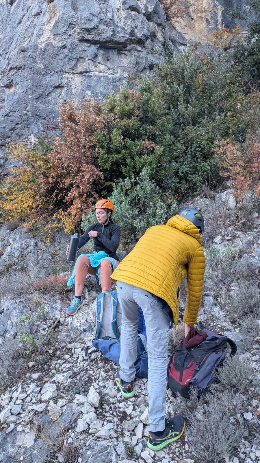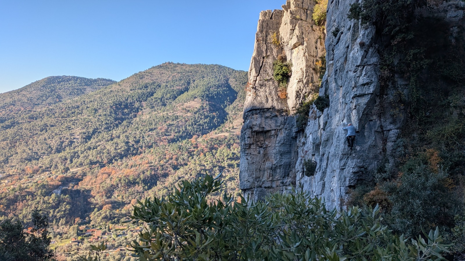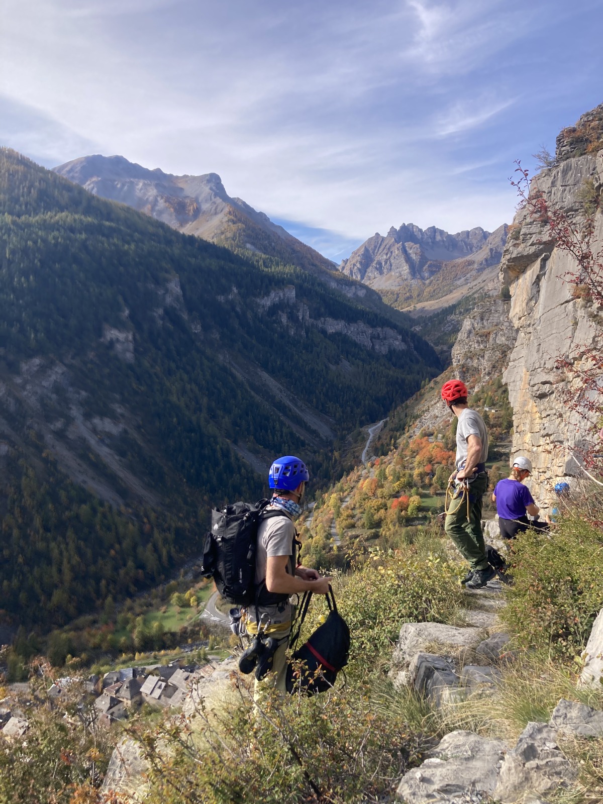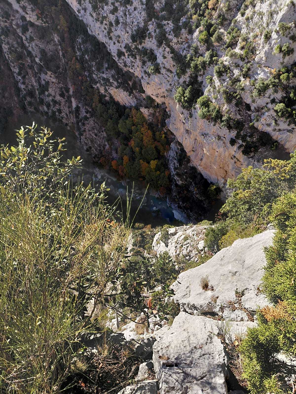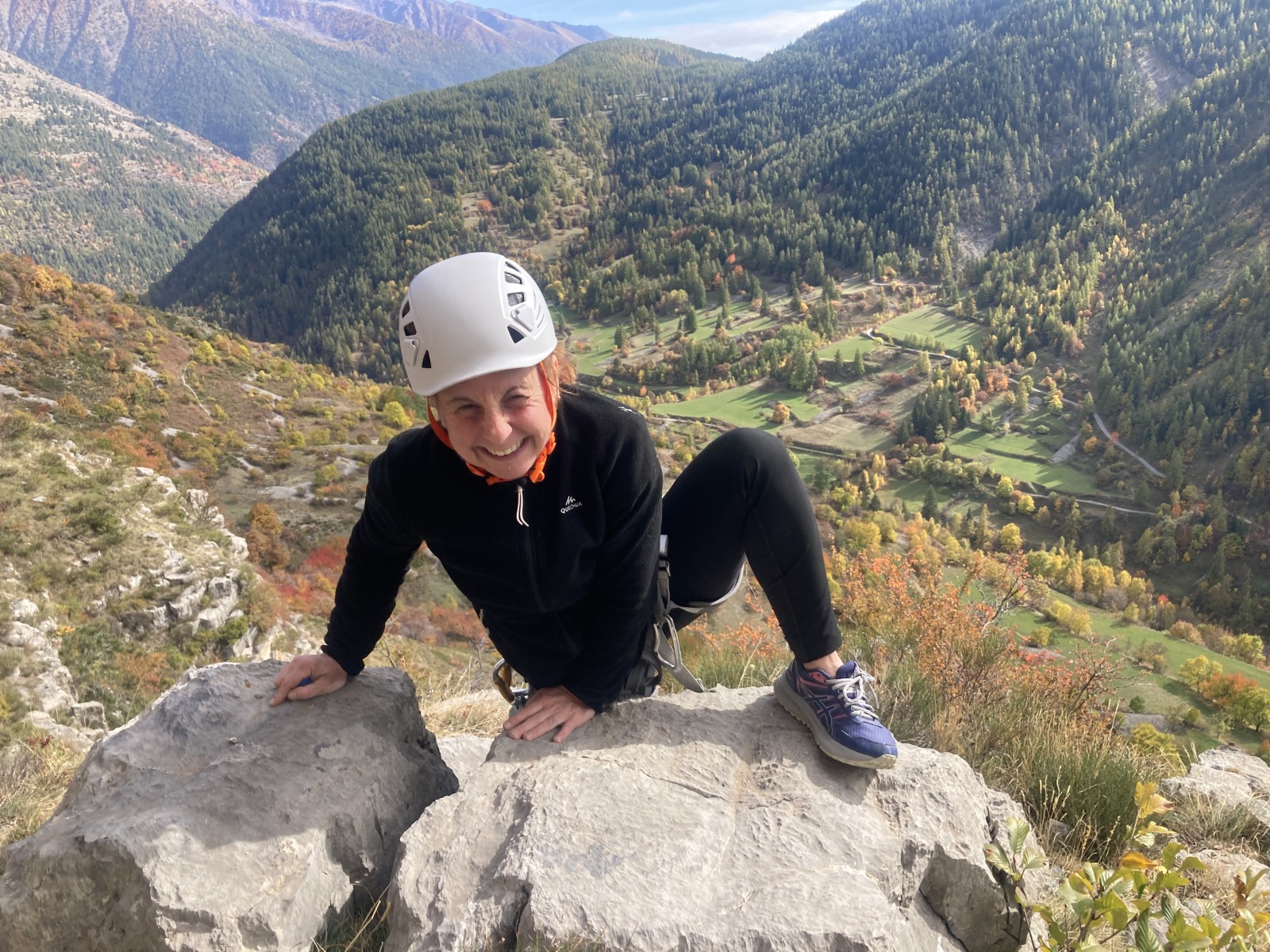 Derrière nous, Jean-Luc a pris la tête depuis le relais peu confortable du 6a+ et choisit de faire le 4c et le 5c en une fois, ce qui l’oblige à faire le dernier relais juste sous le sommet, n’ayant pas assez de corde pour atteindre le fameux chêne ! Finalement, il est 16h15 lorsque le dernier grimpeur atteint le sommet. Le soleil est encore là mais passe derrière les sommets, faisant du même coup chuter la température de quelques degrés. Matos rangé, on attaque la marche retour qui commence par grimper raide pour retrouver le magnifique chemin de rando qui nous ramène au village. On profite des couleurs de l’automne et les frotales n’auront été utiles que pour aller explorer la grotte obscure et observer ses 2 chauve-souris sur le chemin du retour.