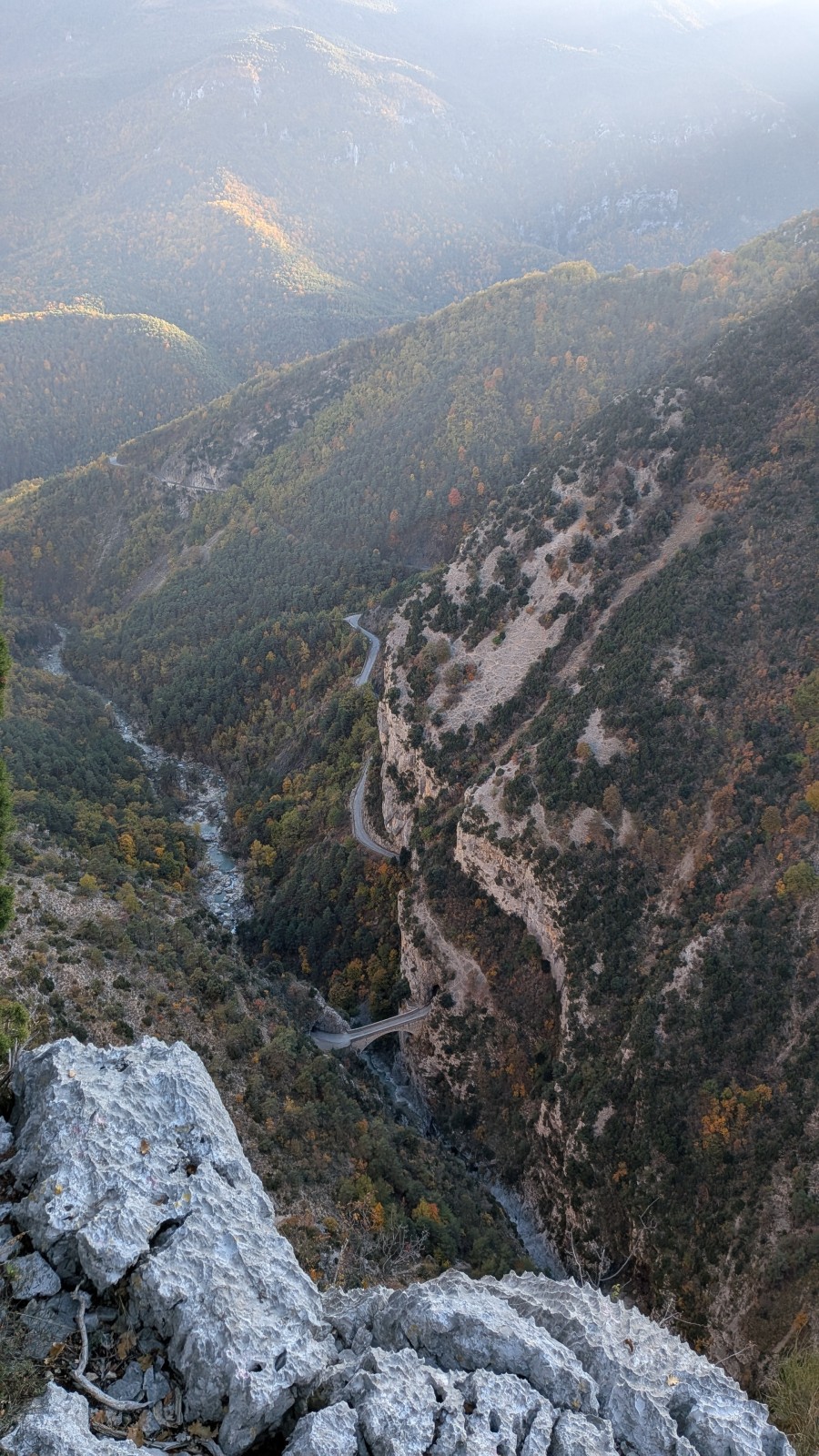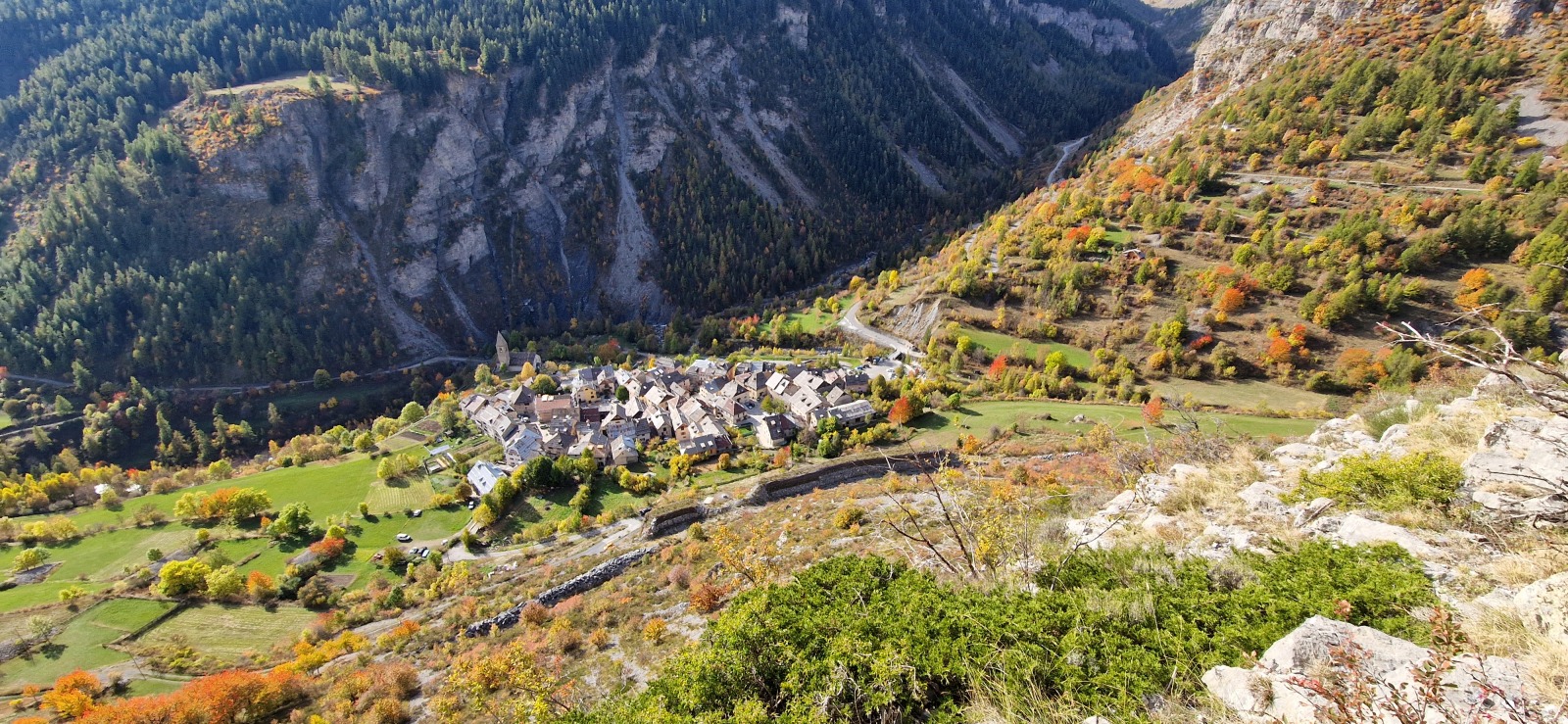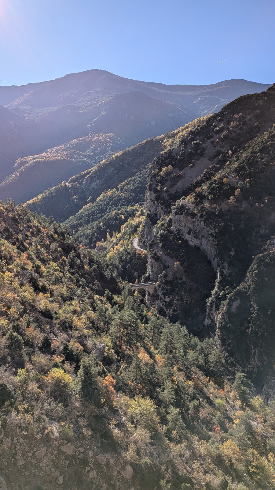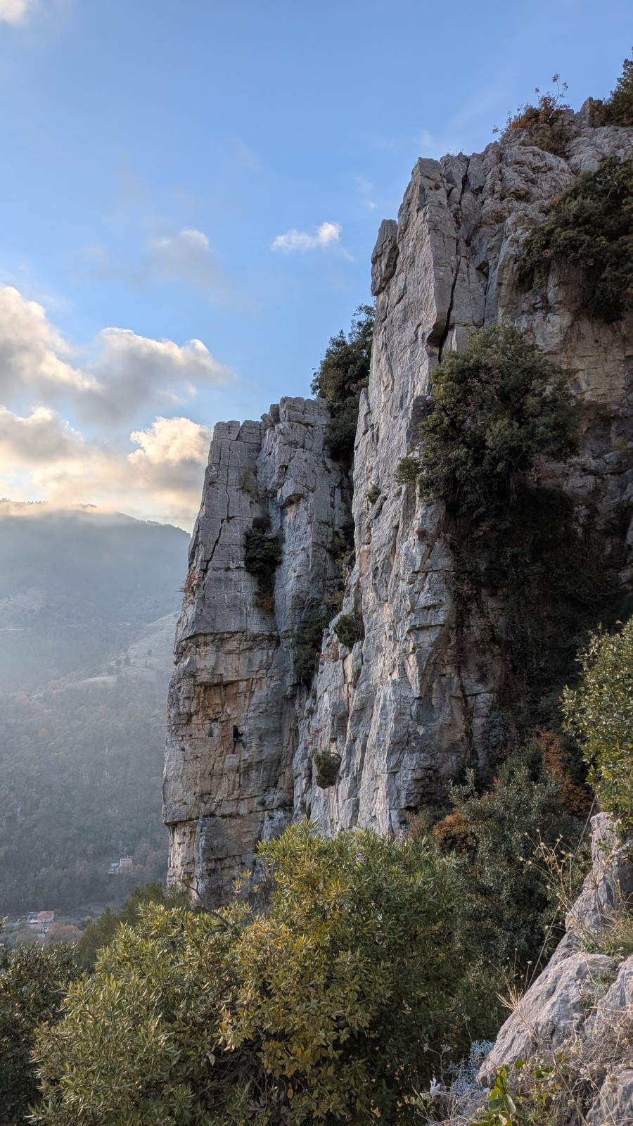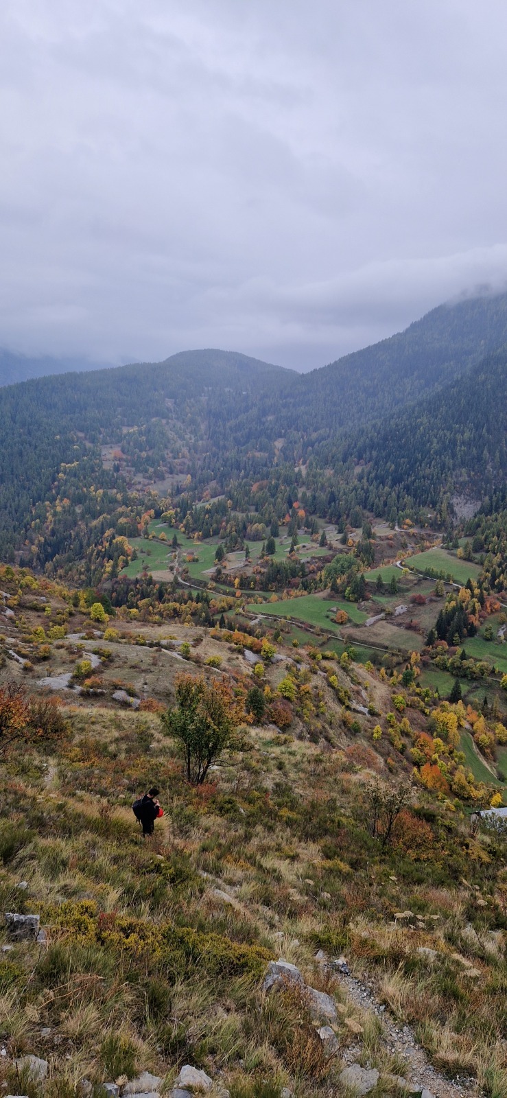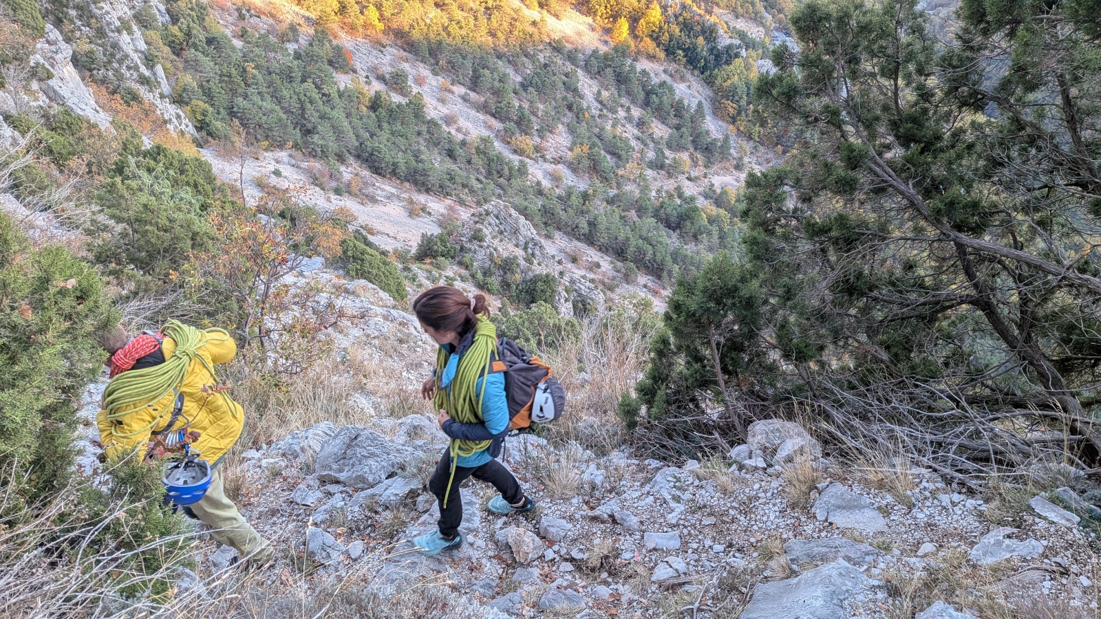 Derrière nous, Jean-Luc a pris la tête depuis le relais peu confortable du 6a+ et choisit de faire le 4c et le 5c en une fois, ce qui l’oblige à faire le dernier relais juste sous le sommet, n’ayant pas assez de corde pour atteindre le fameux chêne ! Finalement, il est 16h15 lorsque le dernier grimpeur atteint le sommet. Le soleil est encore là mais passe derrière les sommets, faisant du même coup chuter la température de quelques degrés. Matos rangé, on attaque la marche retour qui commence par grimper raide pour retrouver le magnifique chemin de rando qui nous ramène au village. On profite des couleurs de l’automne et les frotales n’auront été utiles que pour aller explorer la grotte obscure et observer ses 2 chauve-souris sur le chemin du retour.
