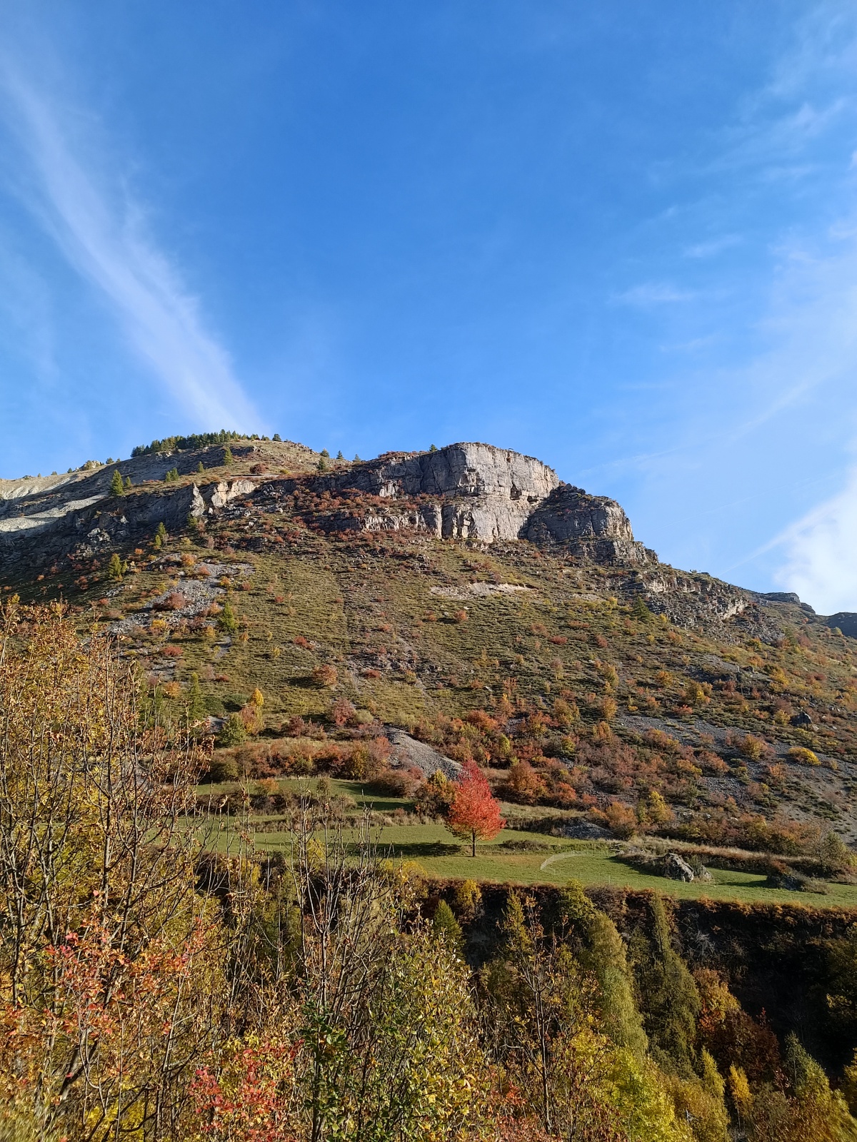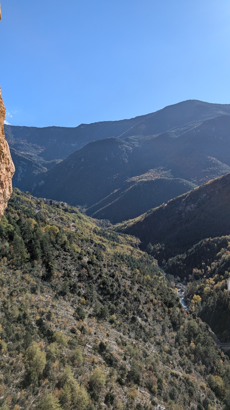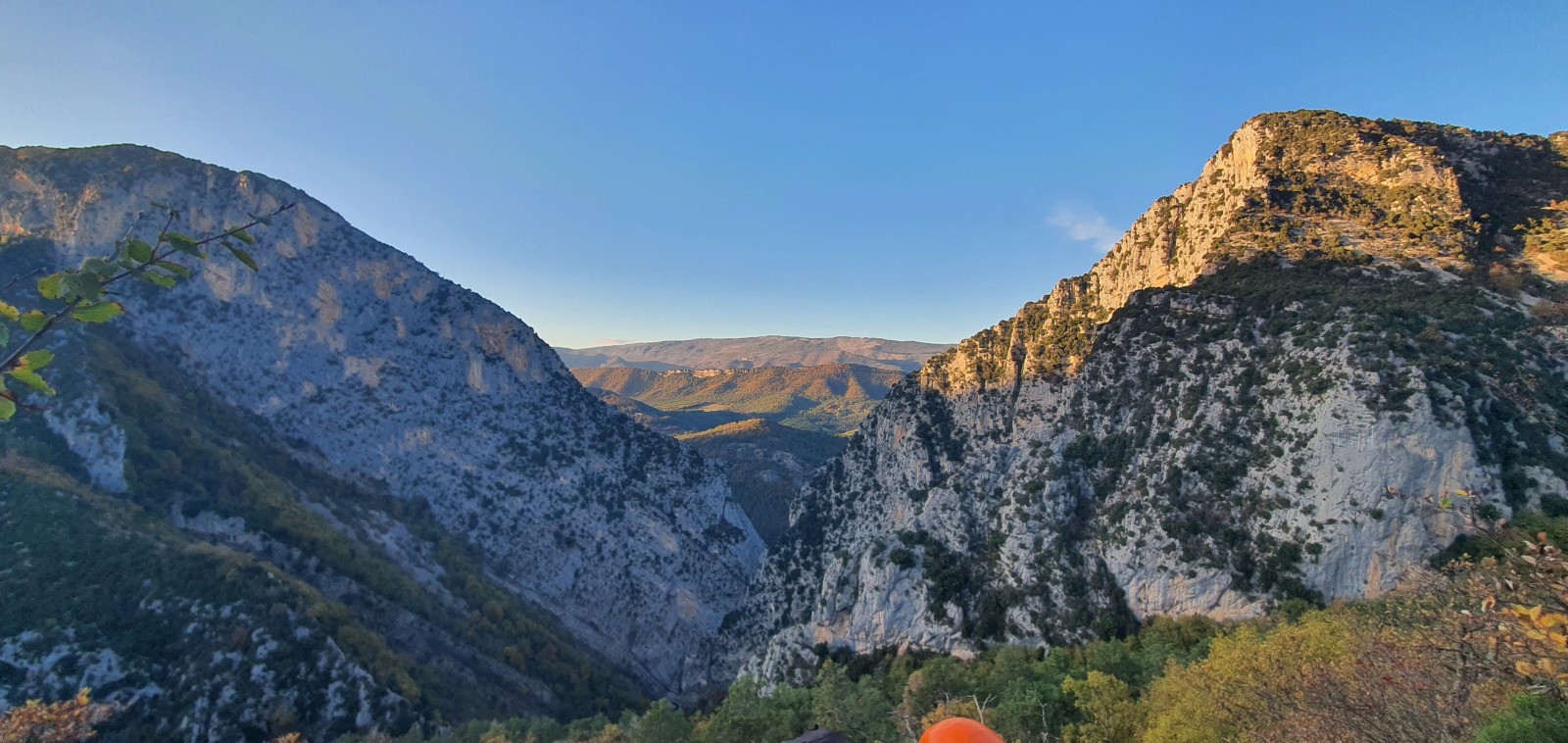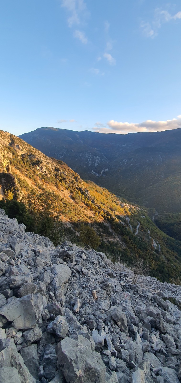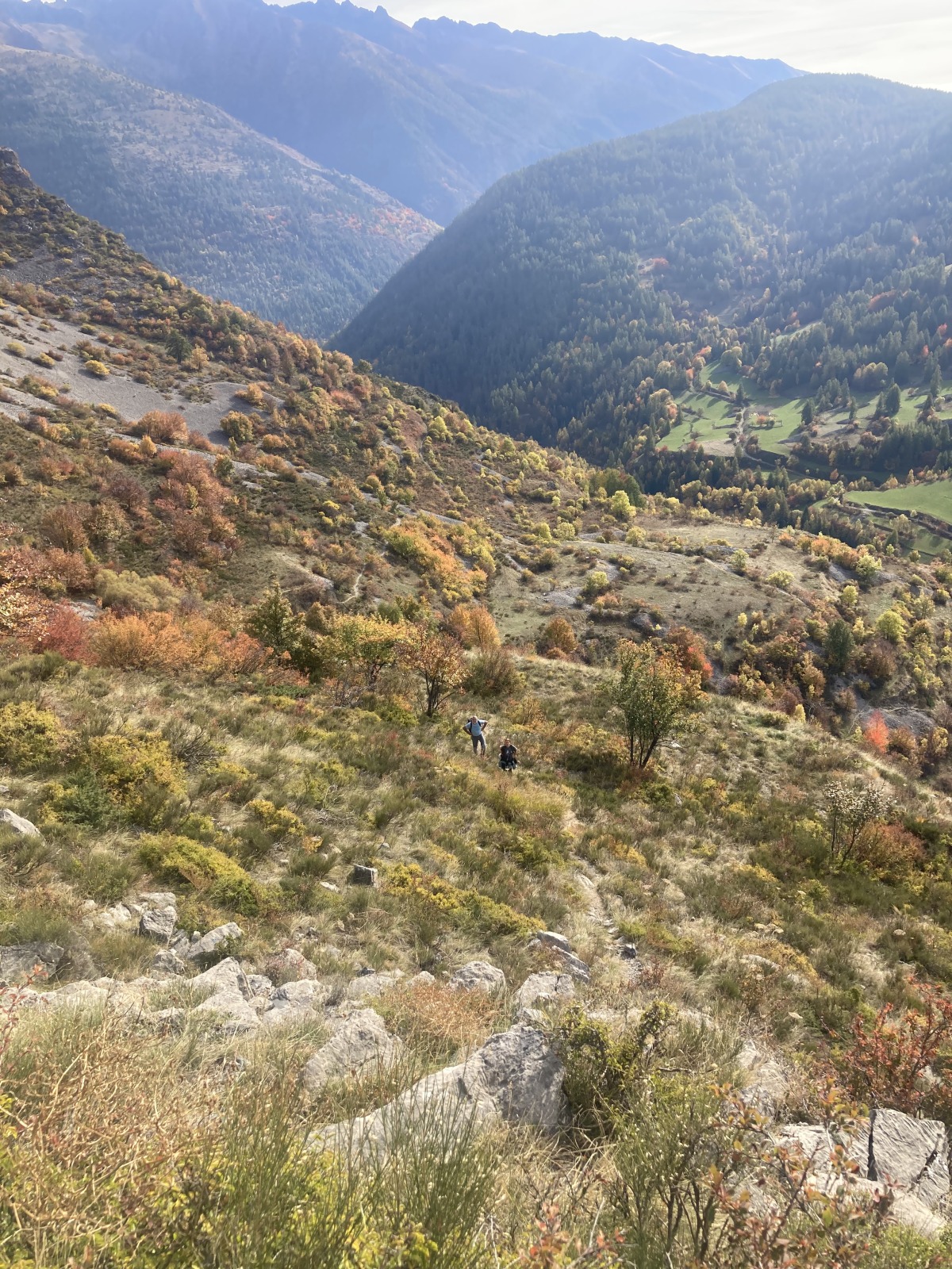 Derrière nous, Jean-Luc a pris la tête depuis le relais peu confortable du 6a+ et choisit de faire le 4c et le 5c en une fois, ce qui l’oblige à faire le dernier relais juste sous le sommet, n’ayant pas assez de corde pour atteindre le fameux chêne ! Finalement, il est 16h15 lorsque le dernier grimpeur atteint le sommet. Le soleil est encore là mais passe derrière les sommets, faisant du même coup chuter la température de quelques degrés. Matos rangé, on attaque la marche retour qui commence par grimper raide pour retrouver le magnifique chemin de rando qui nous ramène au village. On profite des couleurs de l’automne et les frotales n’auront été utiles que pour aller explorer la grotte obscure et observer ses 2 chauve-souris sur le chemin du retour.