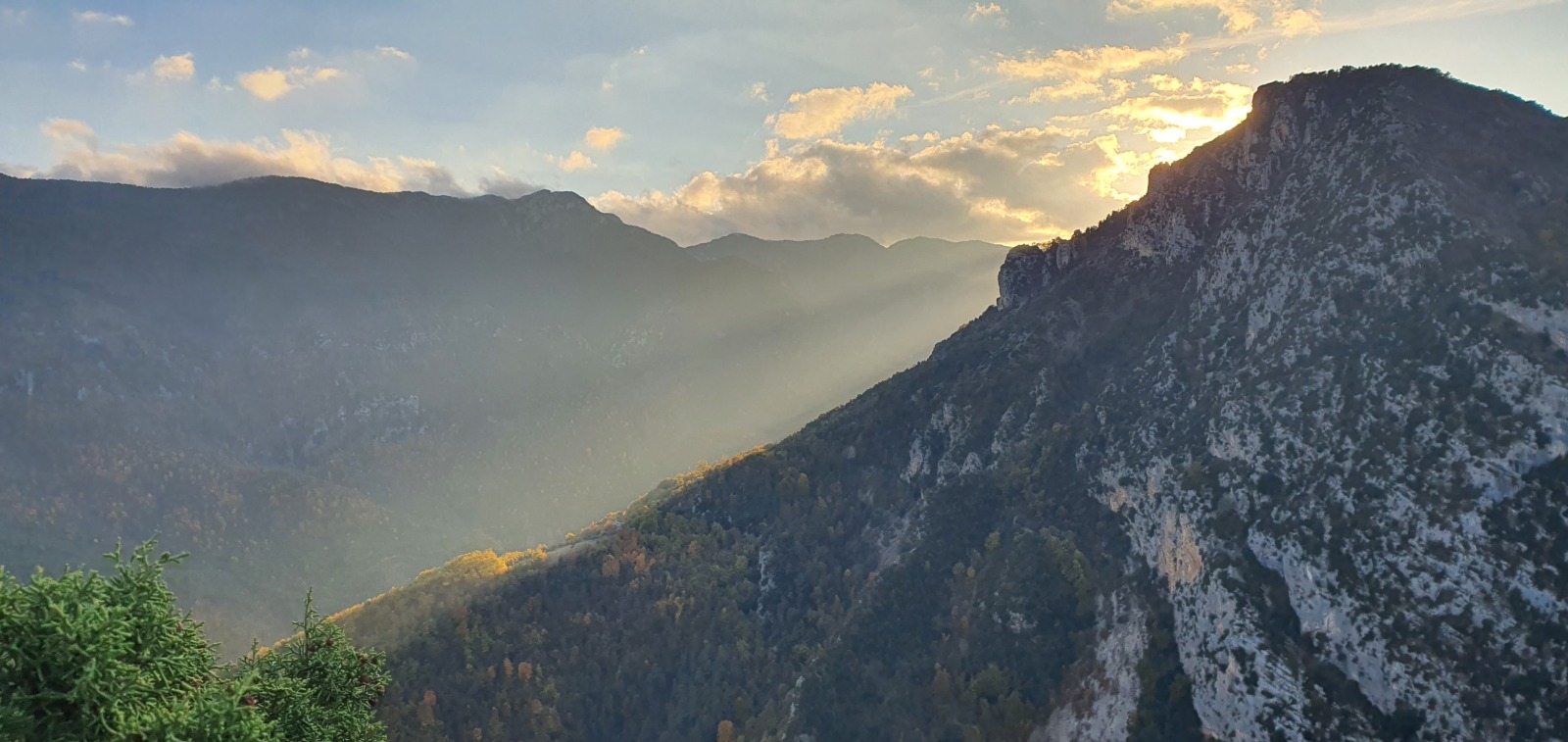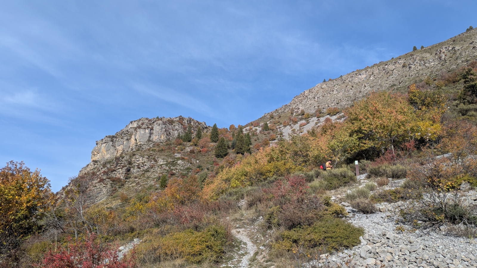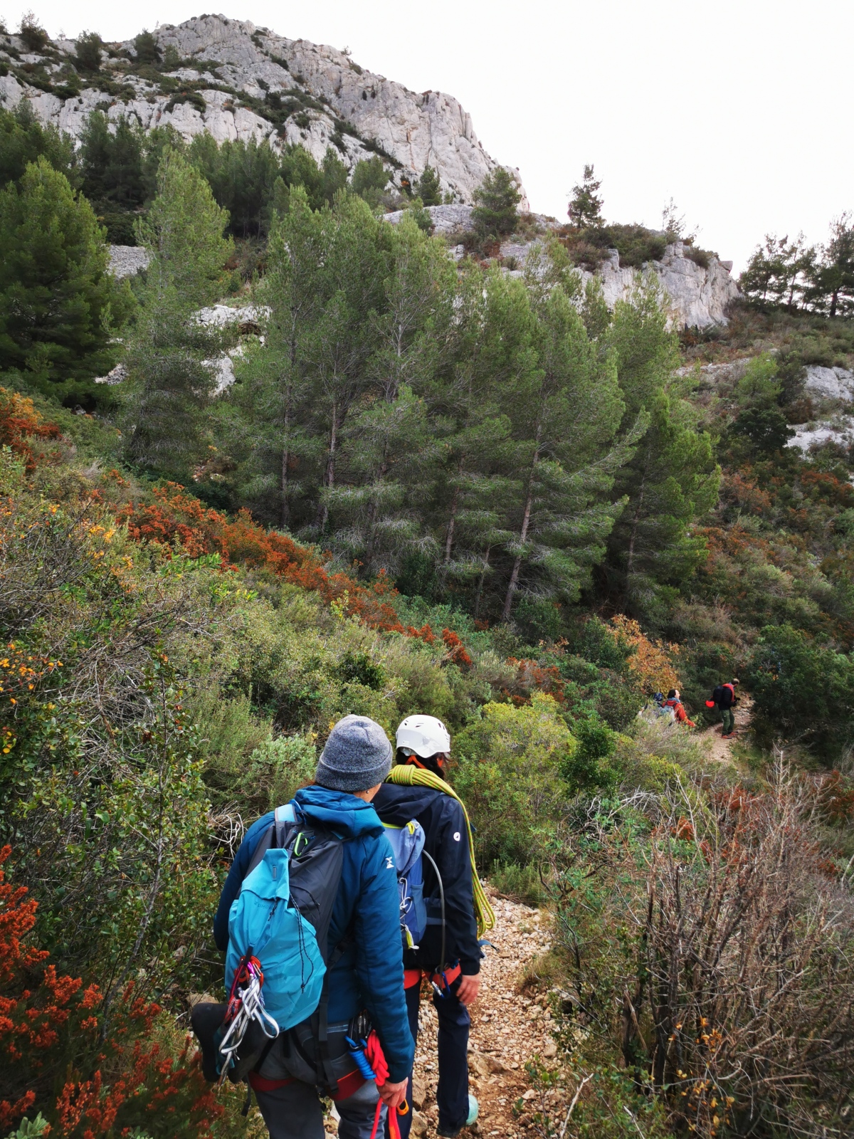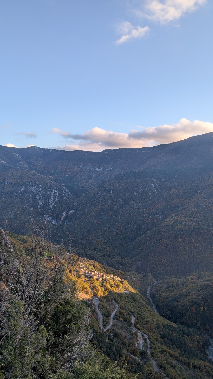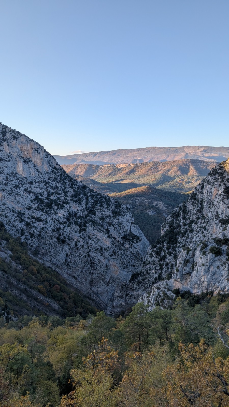 Derrière nous, Jean-Luc a pris la tête depuis le relais peu confortable du 6a+ et choisit de faire le 4c et le 5c en une fois, ce qui l’oblige à faire le dernier relais juste sous le sommet, n’ayant pas assez de corde pour atteindre le fameux chêne ! Finalement, il est 16h15 lorsque le dernier grimpeur atteint le sommet. Le soleil est encore là mais passe derrière les sommets, faisant du même coup chuter la température de quelques degrés. Matos rangé, on attaque la marche retour qui commence par grimper raide pour retrouver le magnifique chemin de rando qui nous ramène au village. On profite des couleurs de l’automne et les frotales n’auront été utiles que pour aller explorer la grotte obscure et observer ses 2 chauve-souris sur le chemin du retour.