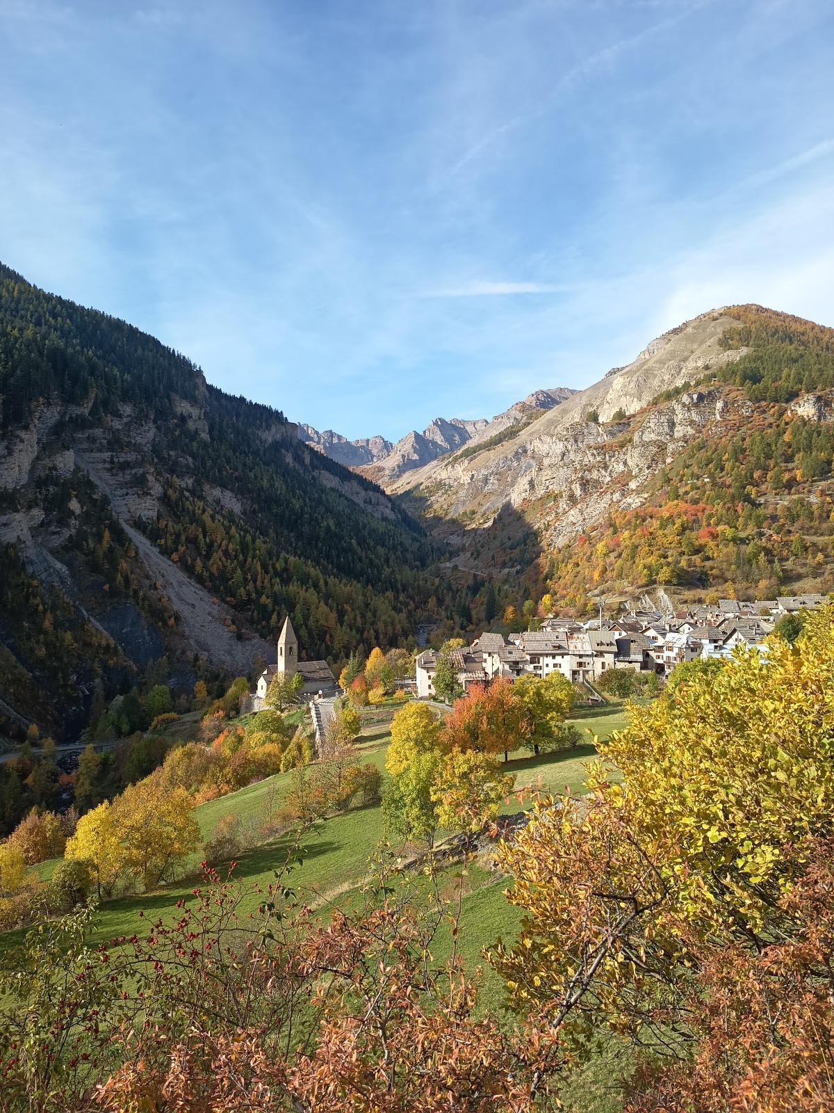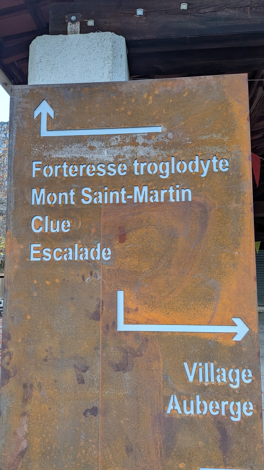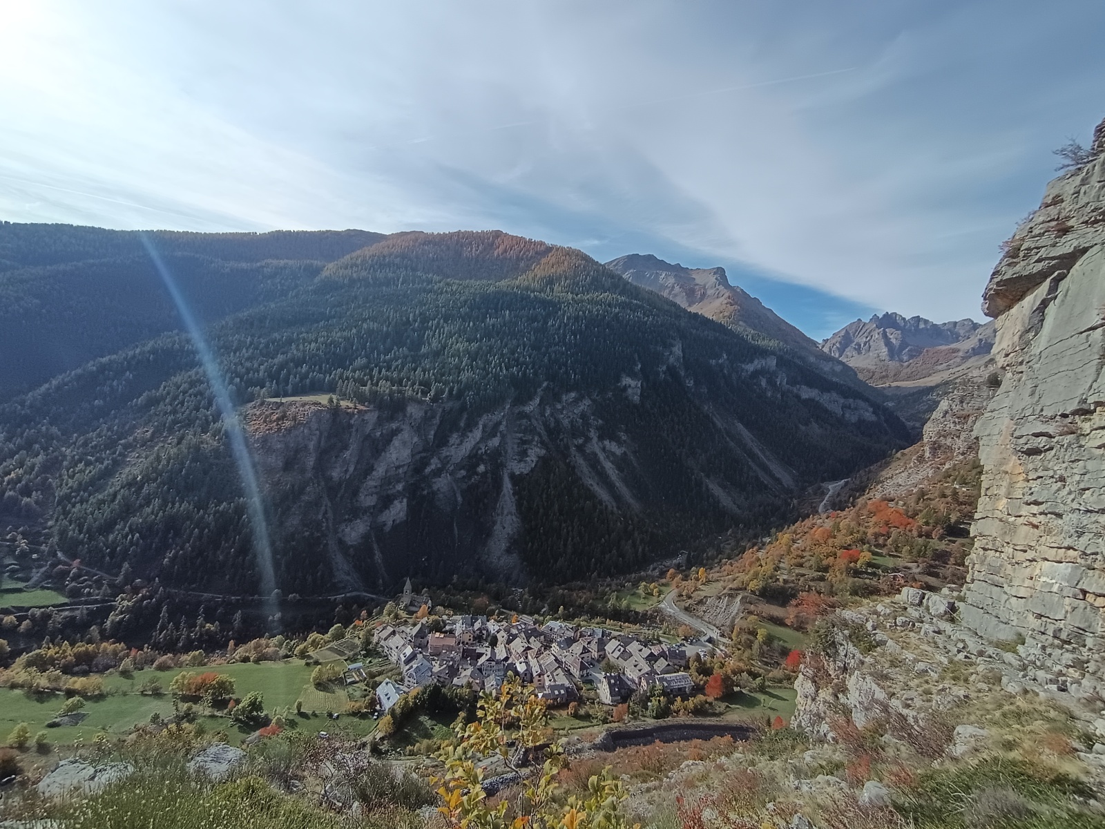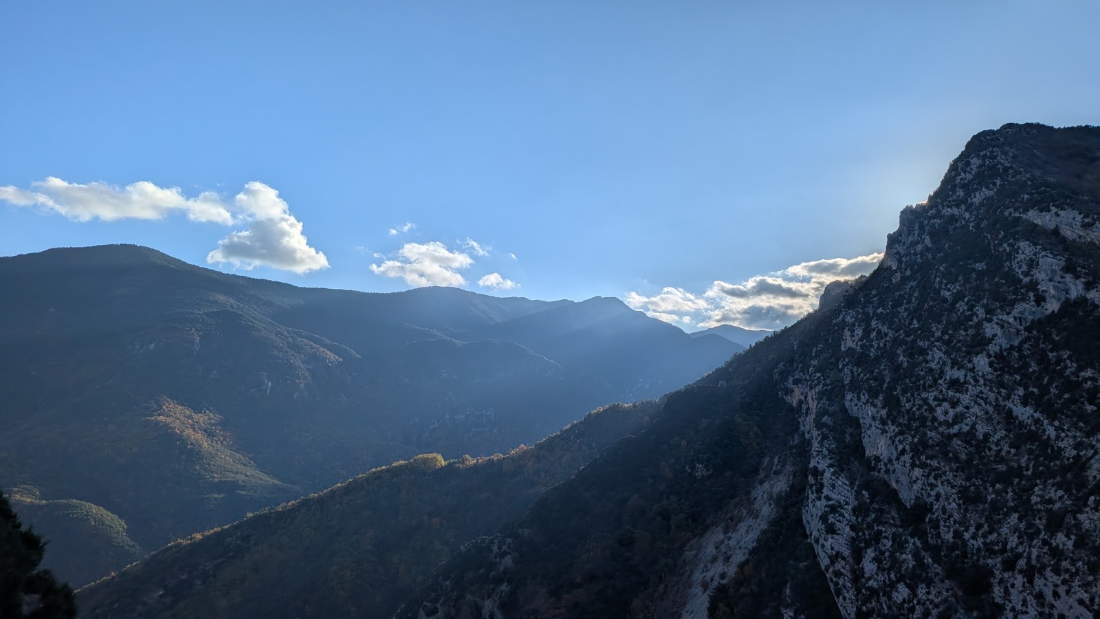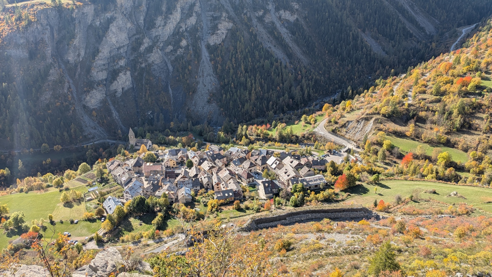 Derrière nous, Jean-Luc a pris la tête depuis le relais peu confortable du 6a+ et choisit de faire le 4c et le 5c en une fois, ce qui l’oblige à faire le dernier relais juste sous le sommet, n’ayant pas assez de corde pour atteindre le fameux chêne ! Finalement, il est 16h15 lorsque le dernier grimpeur atteint le sommet. Le soleil est encore là mais passe derrière les sommets, faisant du même coup chuter la température de quelques degrés. Matos rangé, on attaque la marche retour qui commence par grimper raide pour retrouver le magnifique chemin de rando qui nous ramène au village. On profite des couleurs de l’automne et les frotales n’auront été utiles que pour aller explorer la grotte obscure et observer ses 2 chauve-souris sur le chemin du retour.
