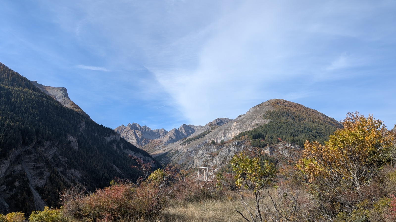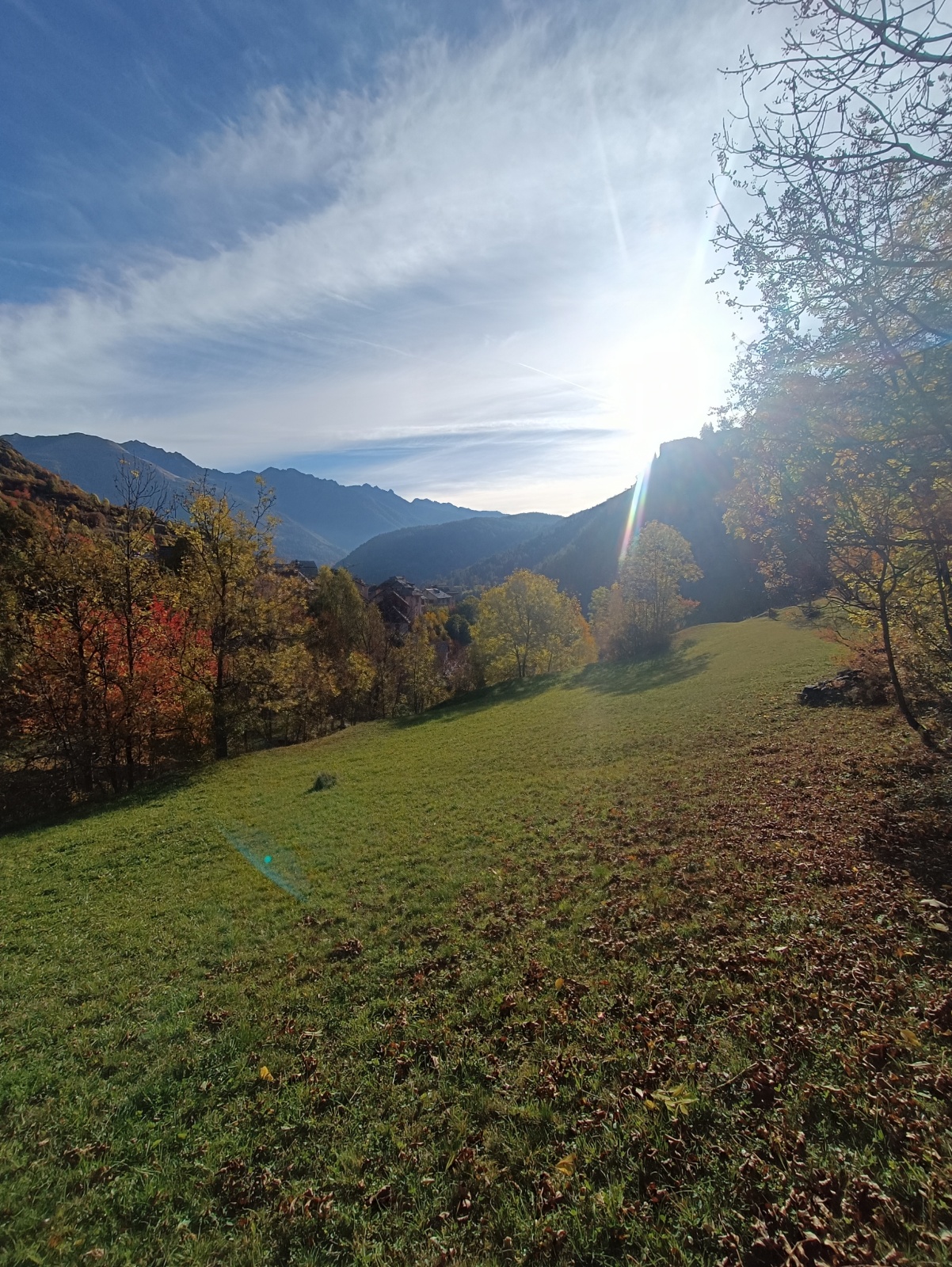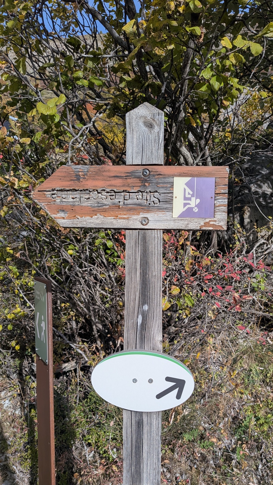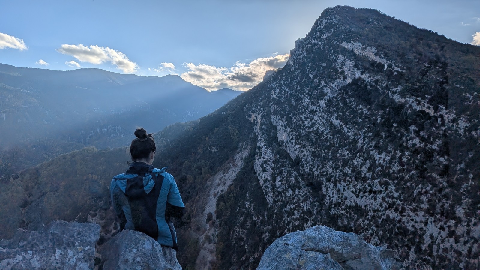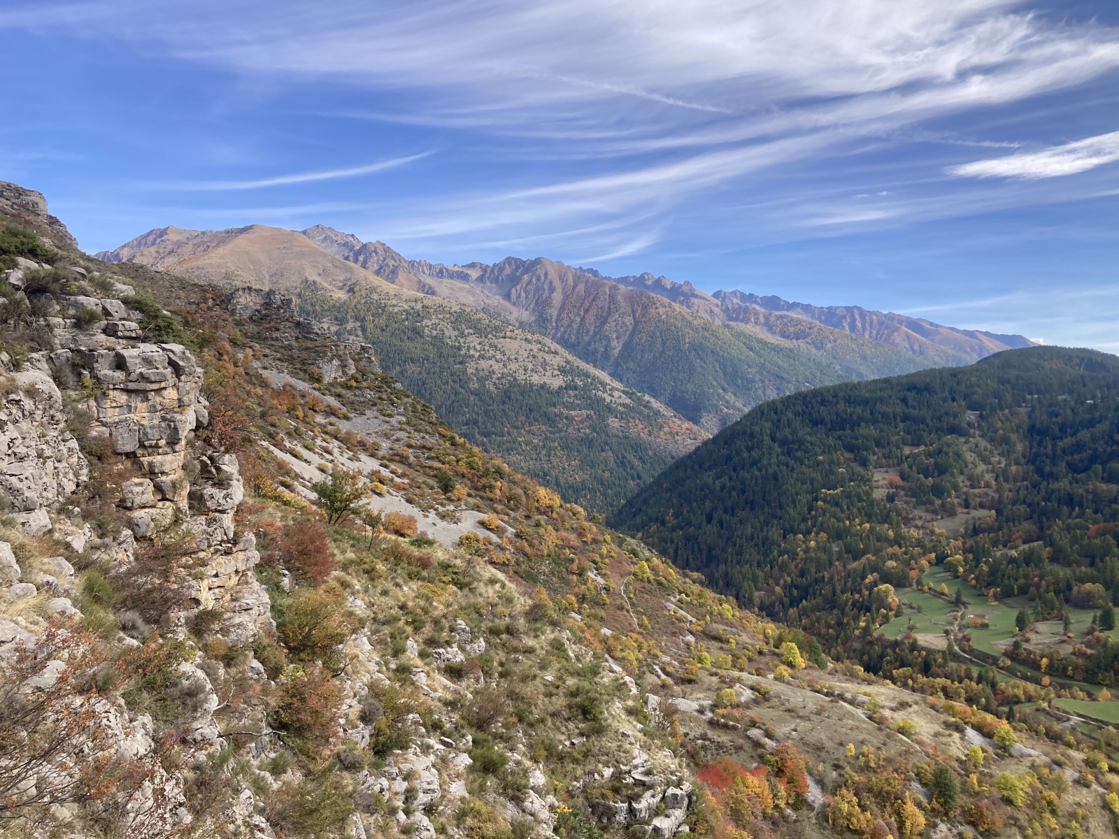 Derrière nous, Jean-Luc a pris la tête depuis le relais peu confortable du 6a+ et choisit de faire le 4c et le 5c en une fois, ce qui l’oblige à faire le dernier relais juste sous le sommet, n’ayant pas assez de corde pour atteindre le fameux chêne ! Finalement, il est 16h15 lorsque le dernier grimpeur atteint le sommet. Le soleil est encore là mais passe derrière les sommets, faisant du même coup chuter la température de quelques degrés. Matos rangé, on attaque la marche retour qui commence par grimper raide pour retrouver le magnifique chemin de rando qui nous ramène au village. On profite des couleurs de l’automne et les frotales n’auront été utiles que pour aller explorer la grotte obscure et observer ses 2 chauve-souris sur le chemin du retour.