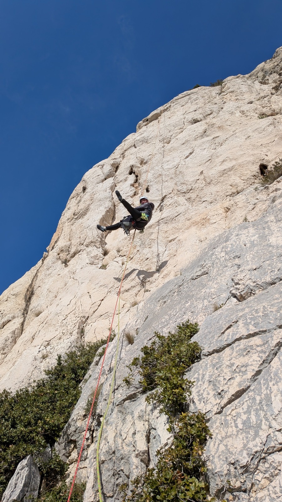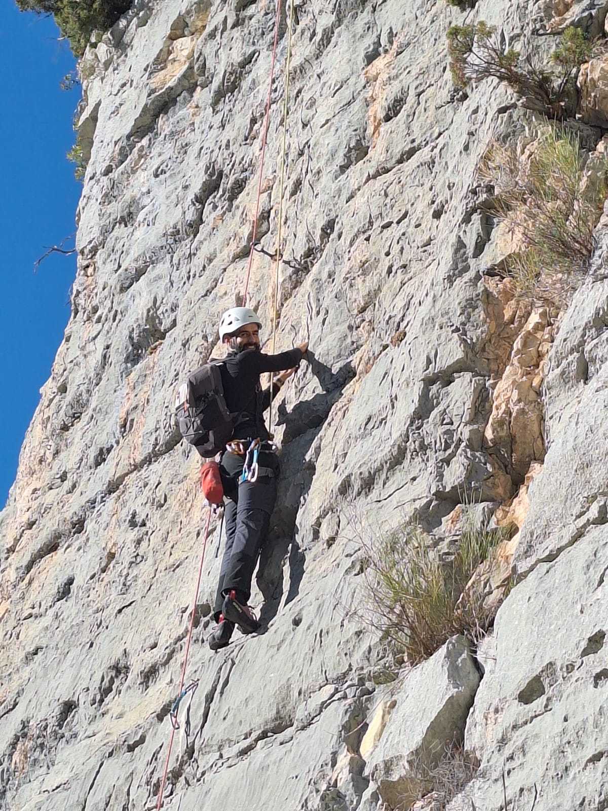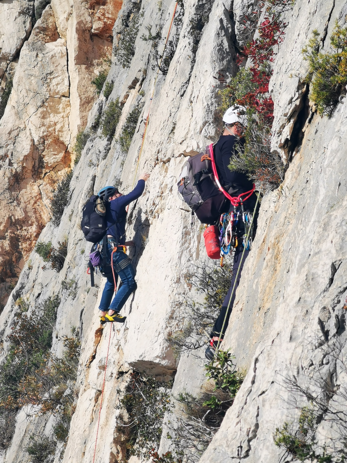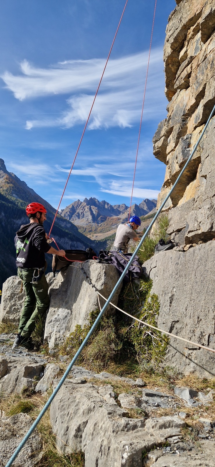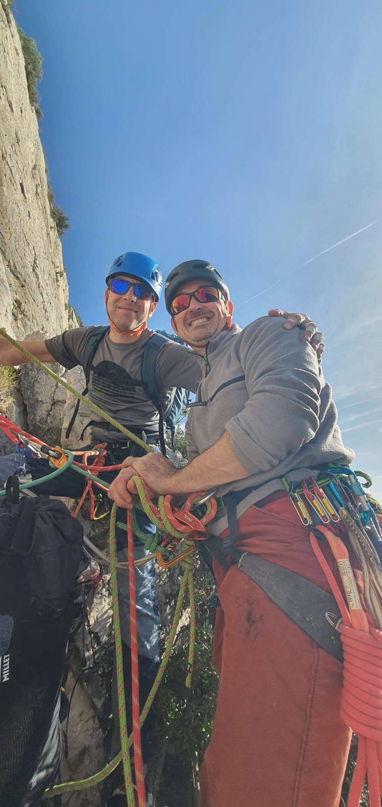 Les deux voies suivent des lignes parallèles après une première longueur commune. Elles proposent environ 200m d’escalade en 8 ou 9 longueurs en 6a+ max mais soutenues dans le 5c/6a. Un beau morceau d’escalade pour les participants au cycle qui ont travaillé dur pour en arriver là !