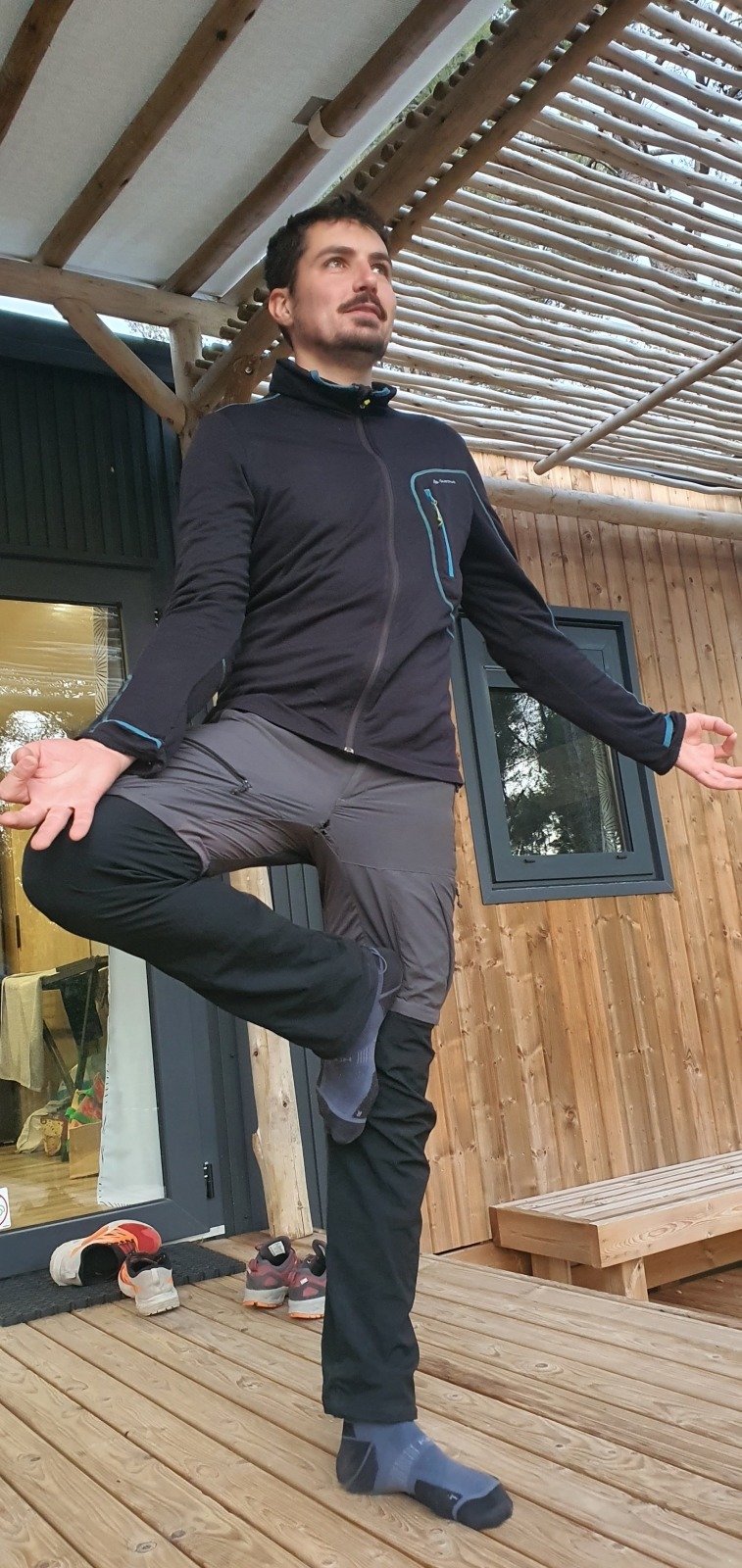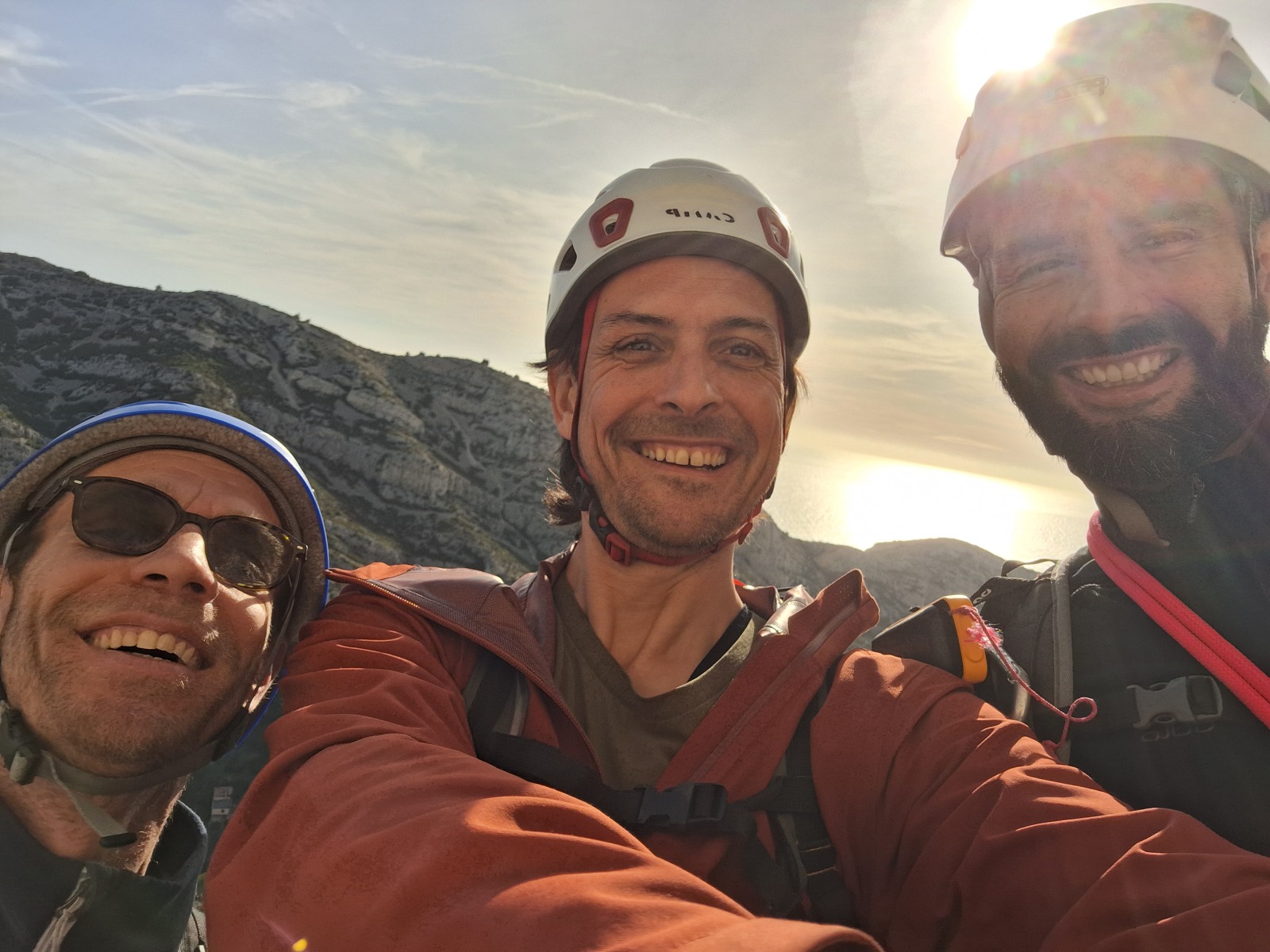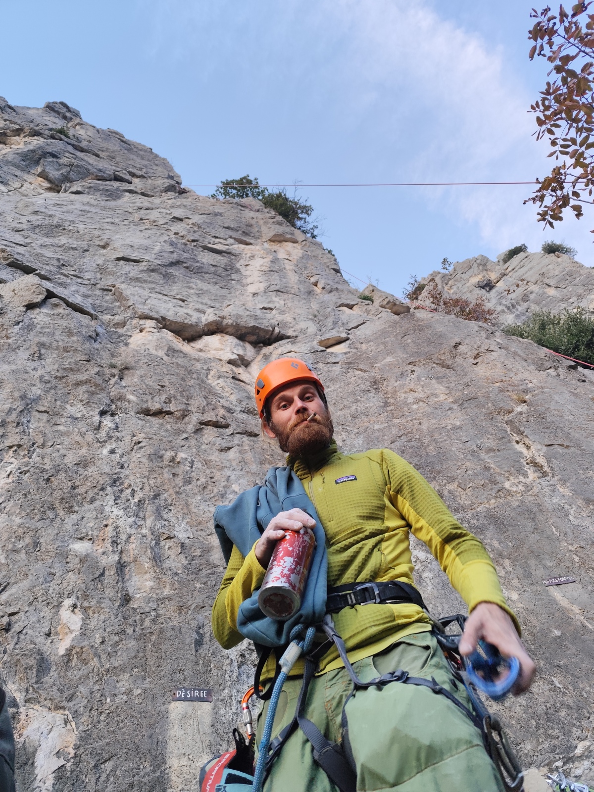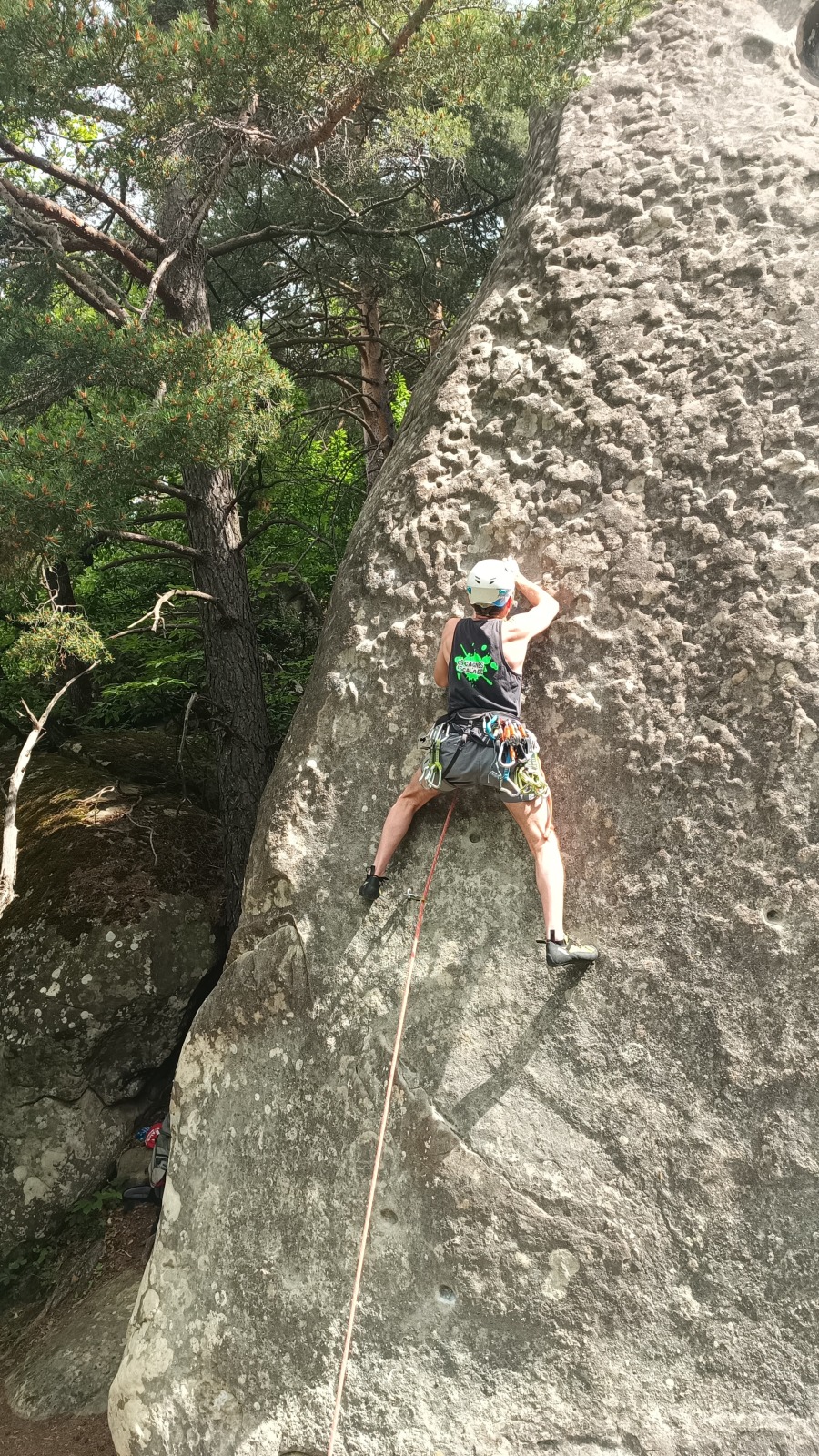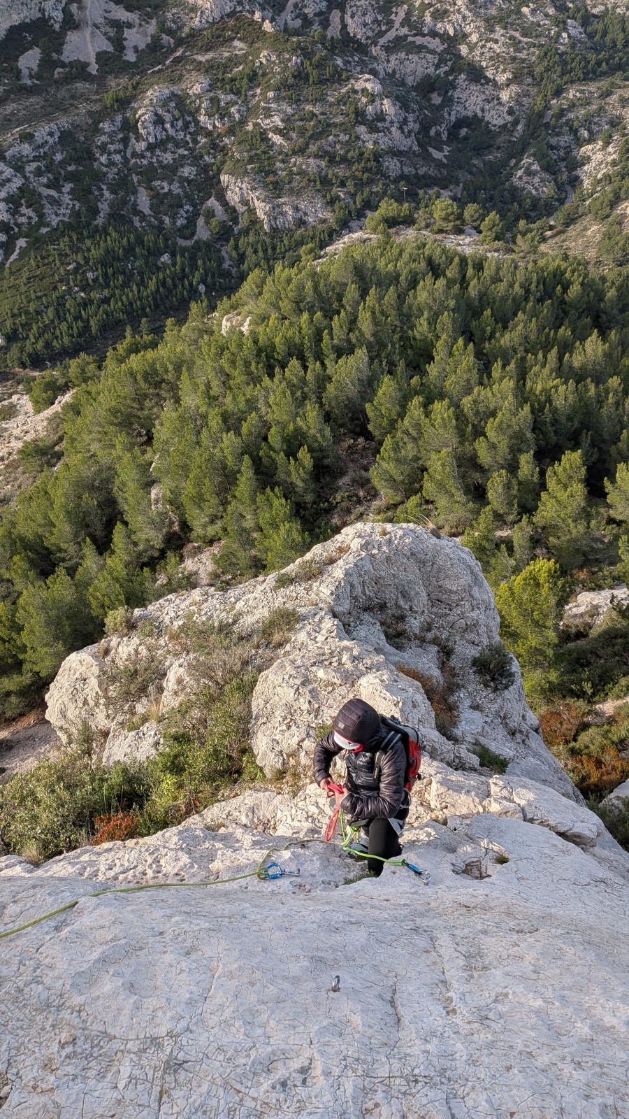 Lorsque Thibaud et Laura arrivent à mon relais, ils ne me rendent que 4 dégaines ! Le reste est resté à la demande de Matthieu avec diverses pédales sur la voie. Il me reste encore 25m d’escalade en 5c… Tant pis, je vais engager un peu. Il est 15h tout pile quand j’arrive au sommet pour faire mon dernier relais sur un gros chêne.