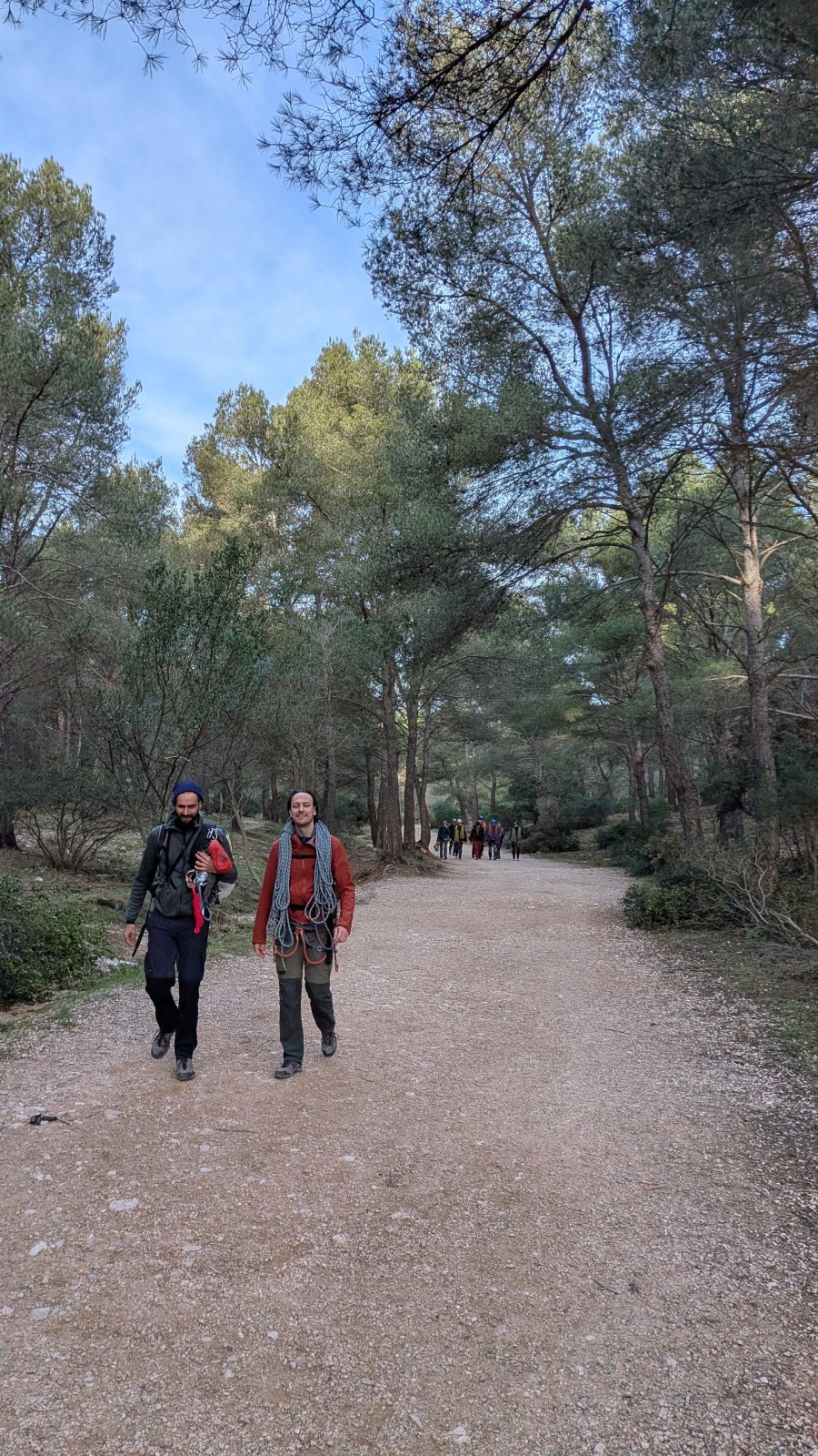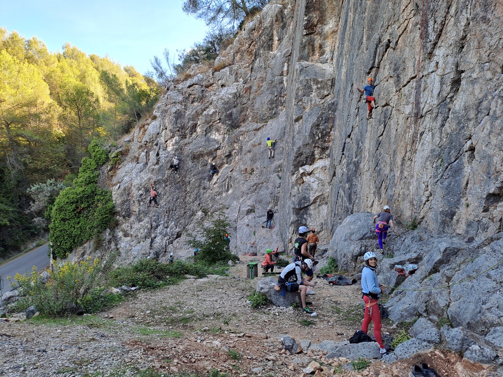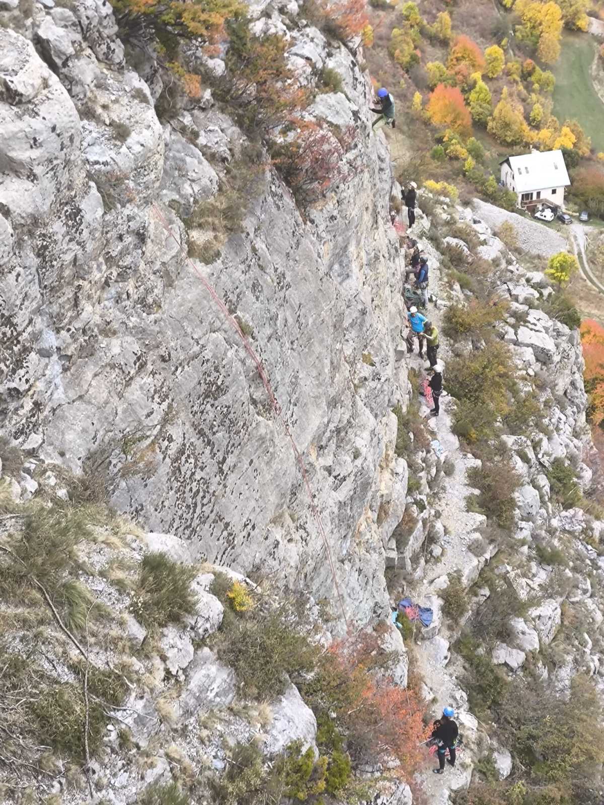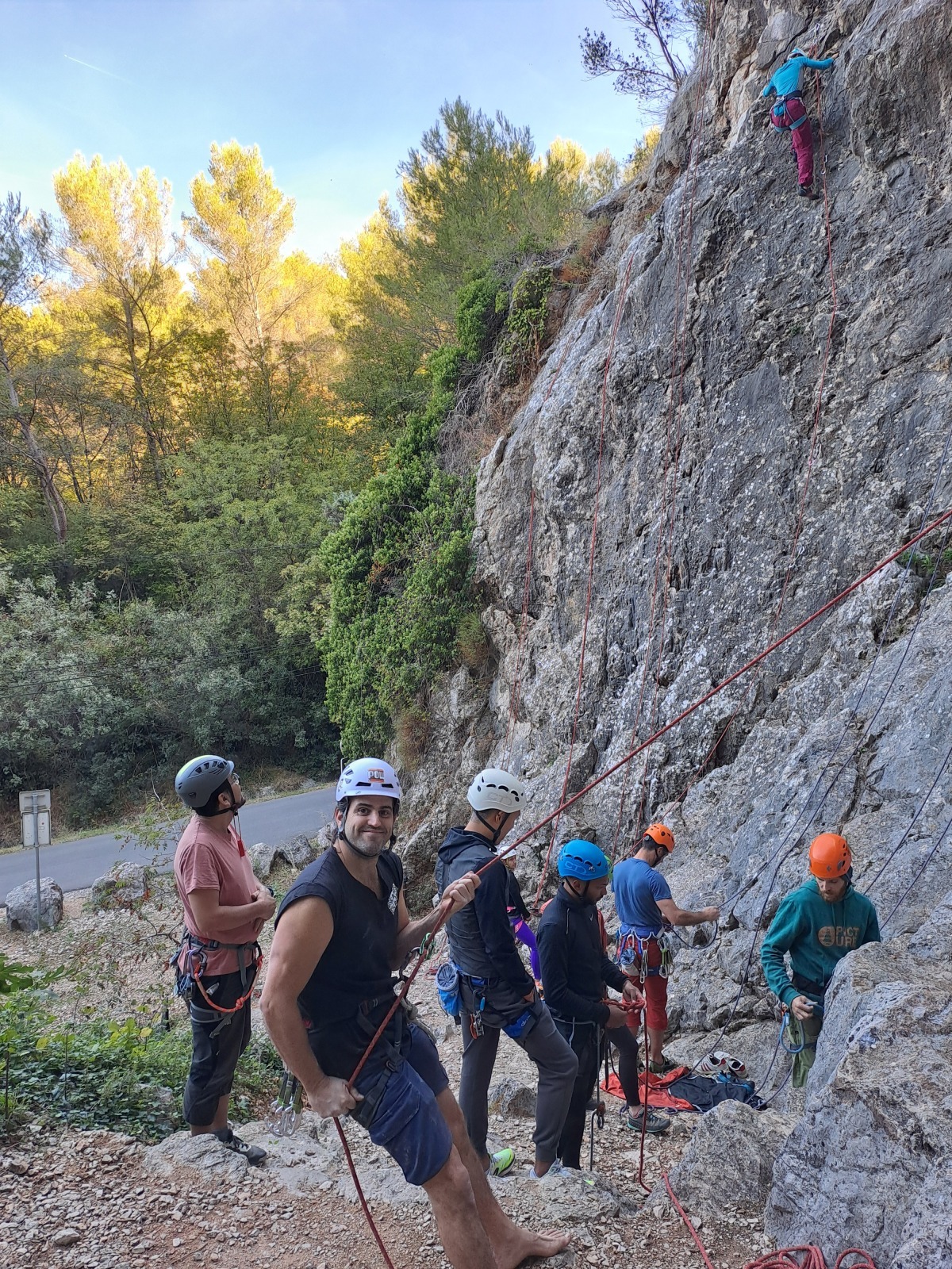 Nous sommes donc 12 sur le parking d’Aiglun à 9h, sans trop de retard malgré un réveil râté de JP. Ju a récupéré le matos la veille et s’occupe de la distribution. Maintenant, la plupart des grimpeurs ont leur matos à quelques détails près, hormis Mattieu L. qui s’est incrusté depuis le cycle élargi, profitant de l’absence de certains. Pour lui, c’est une grande première, et quelle première !